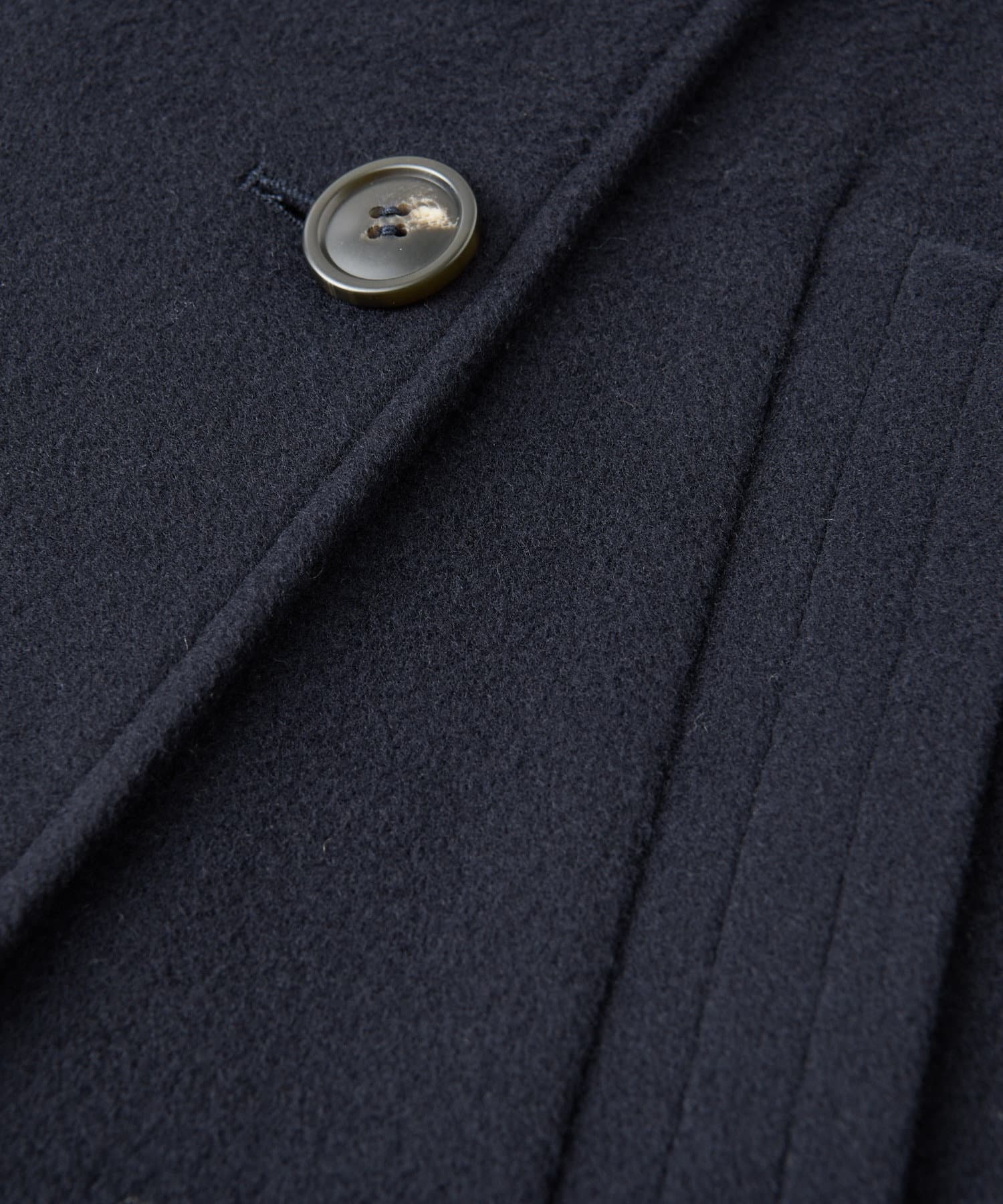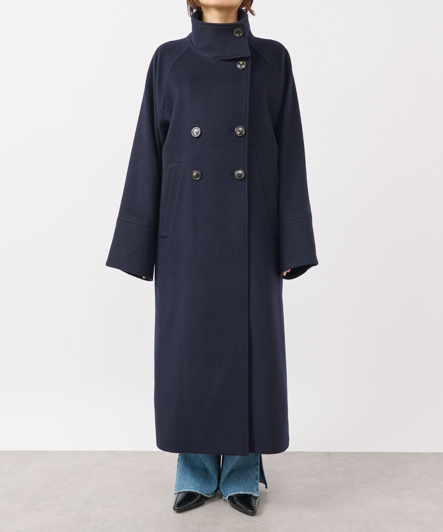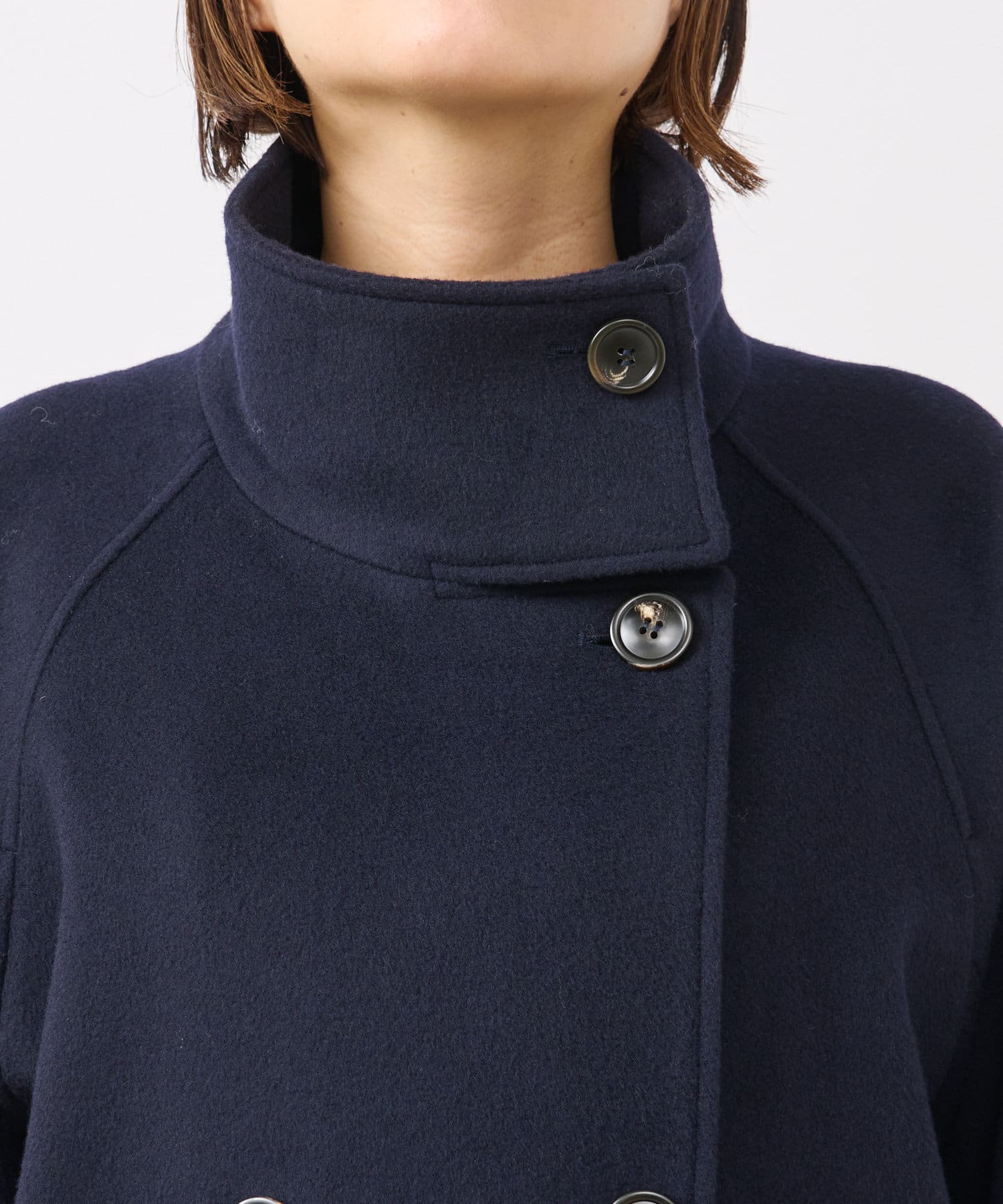 スタンドネックと言っても長すぎないため、着る人を選ばず、タートルネックなどのインナーとのレイヤードも可能。
