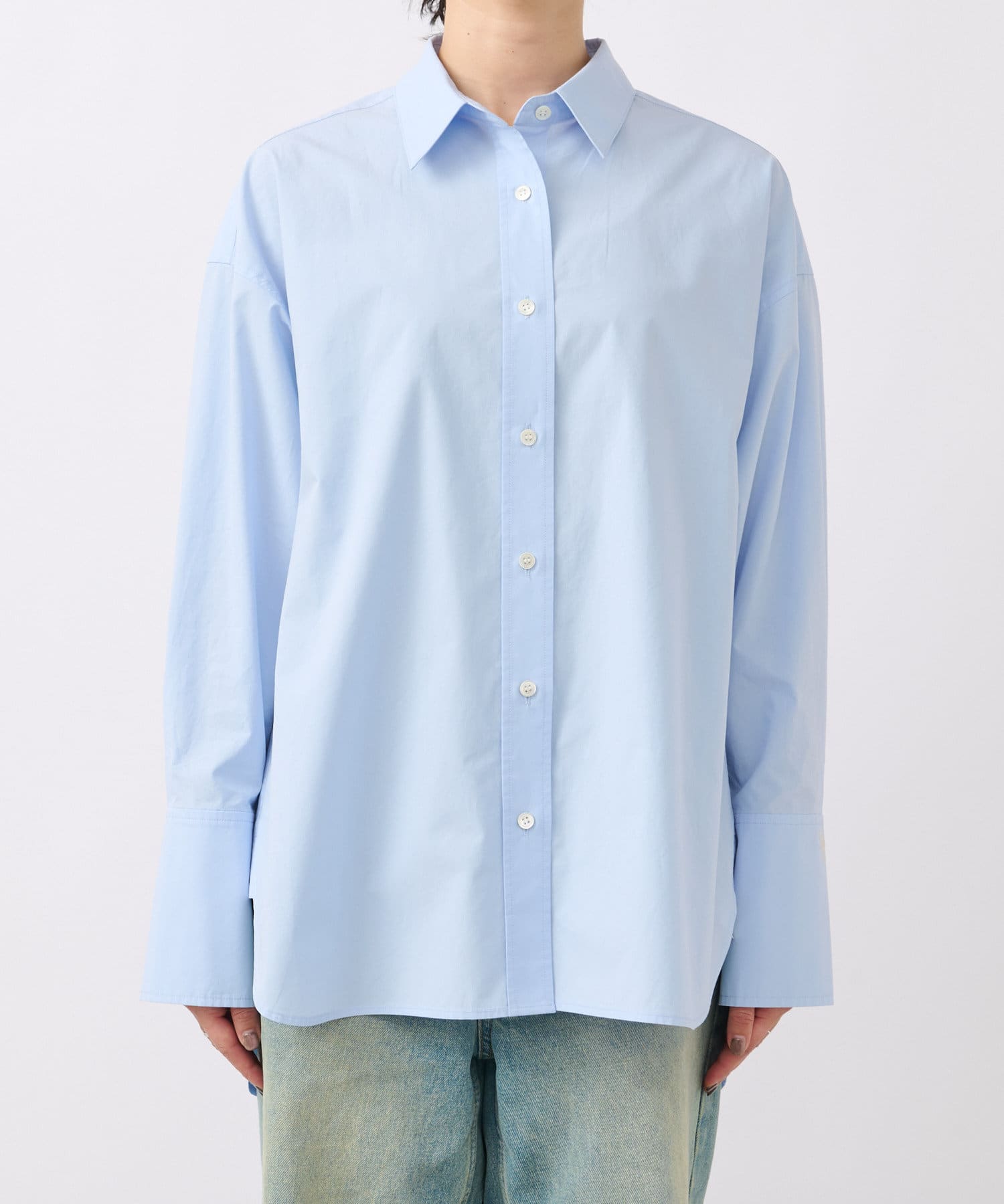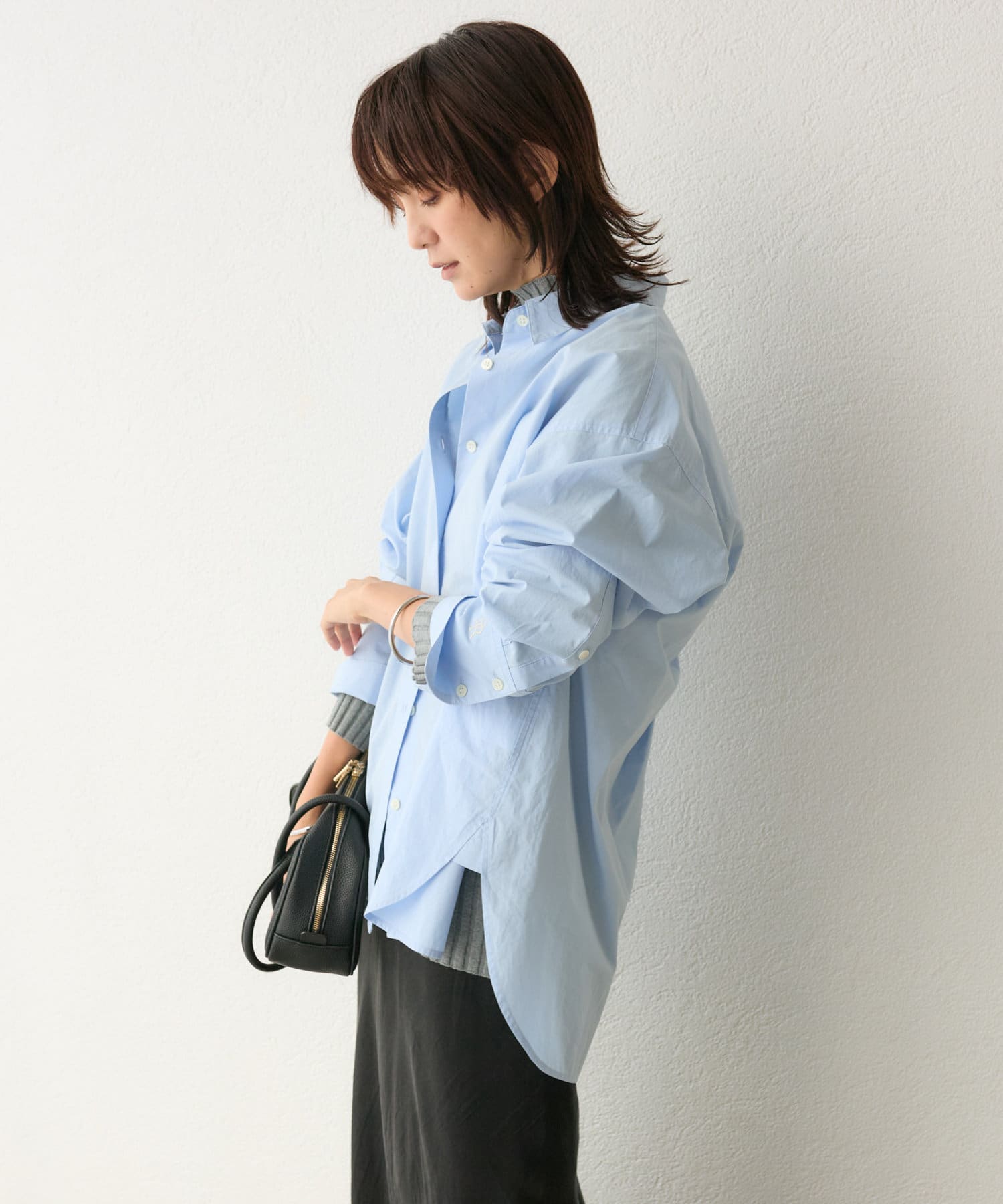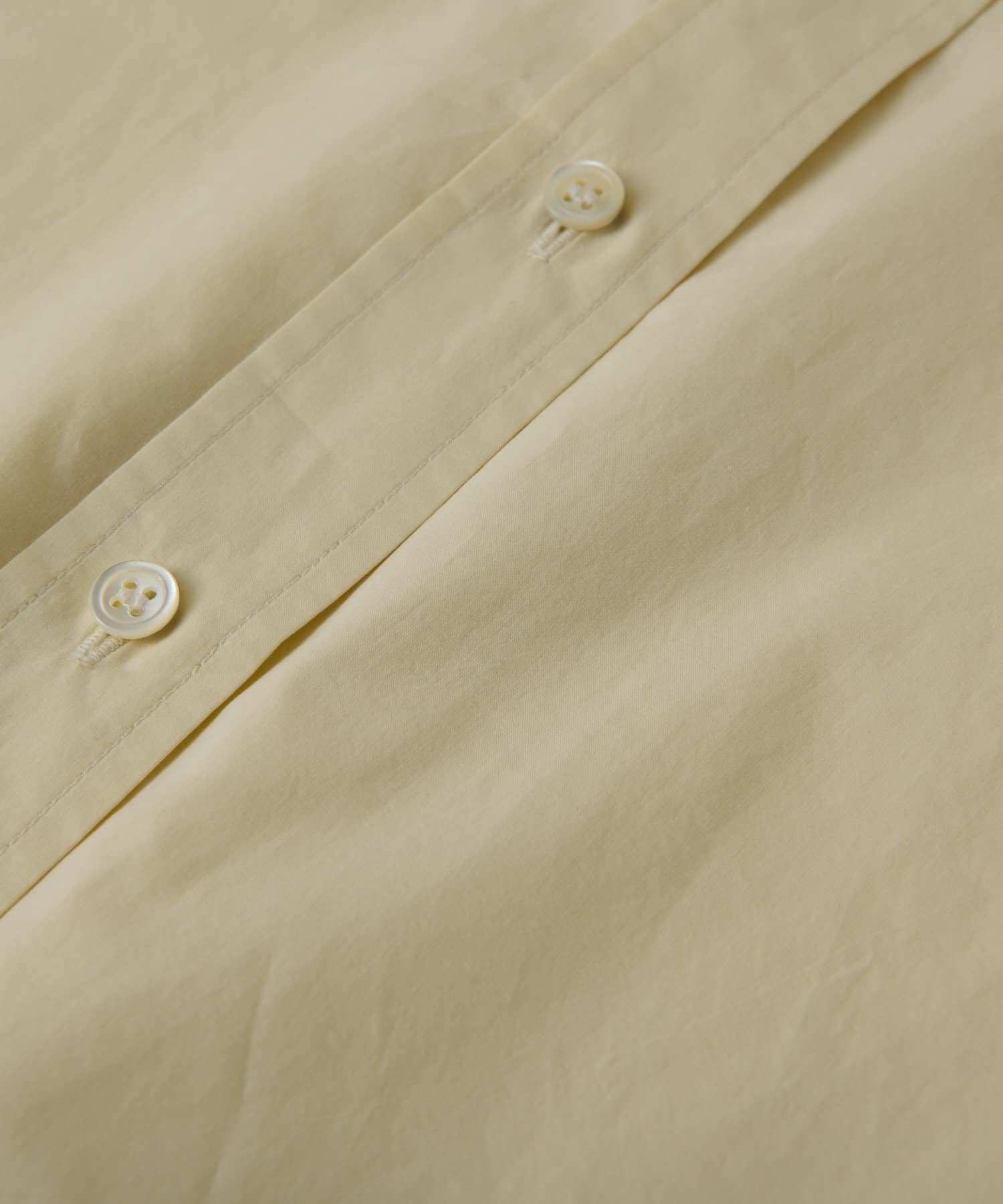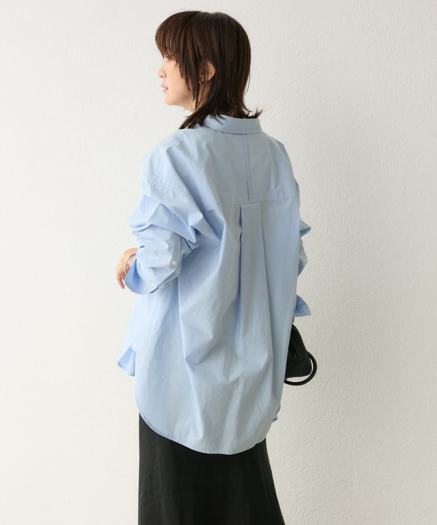 シンプルなオーバーシルエットのシャツで、パリッとしすぎないように洗いをかけてカジュアルな風合いになっております。