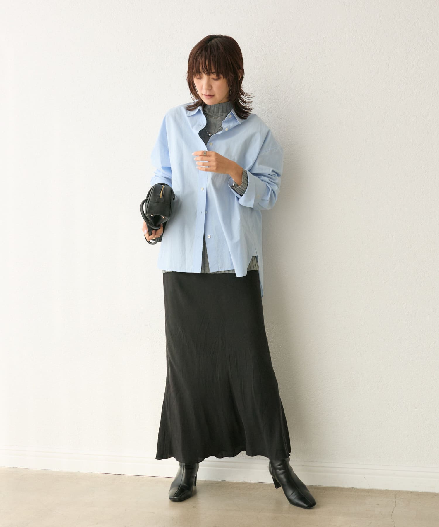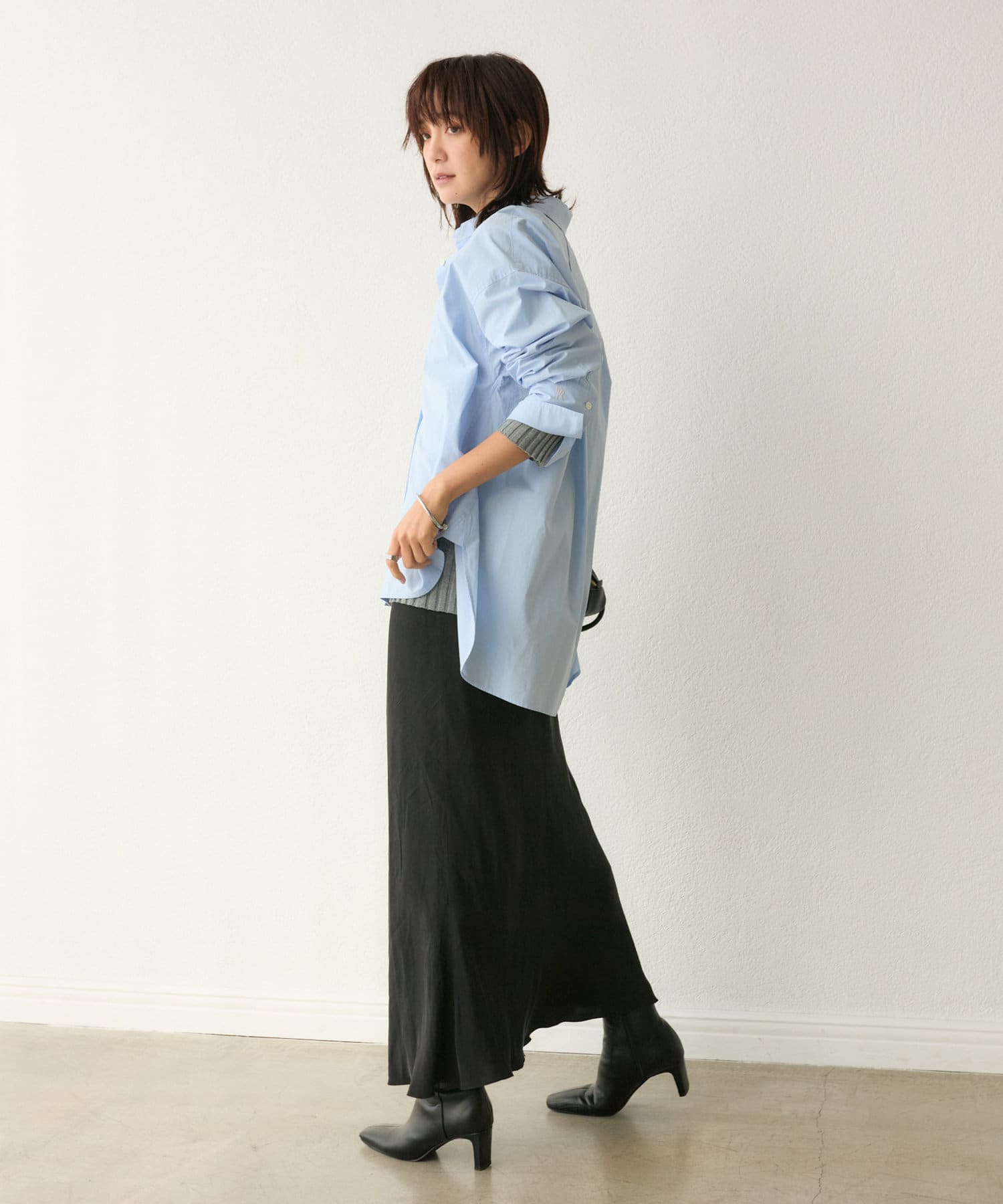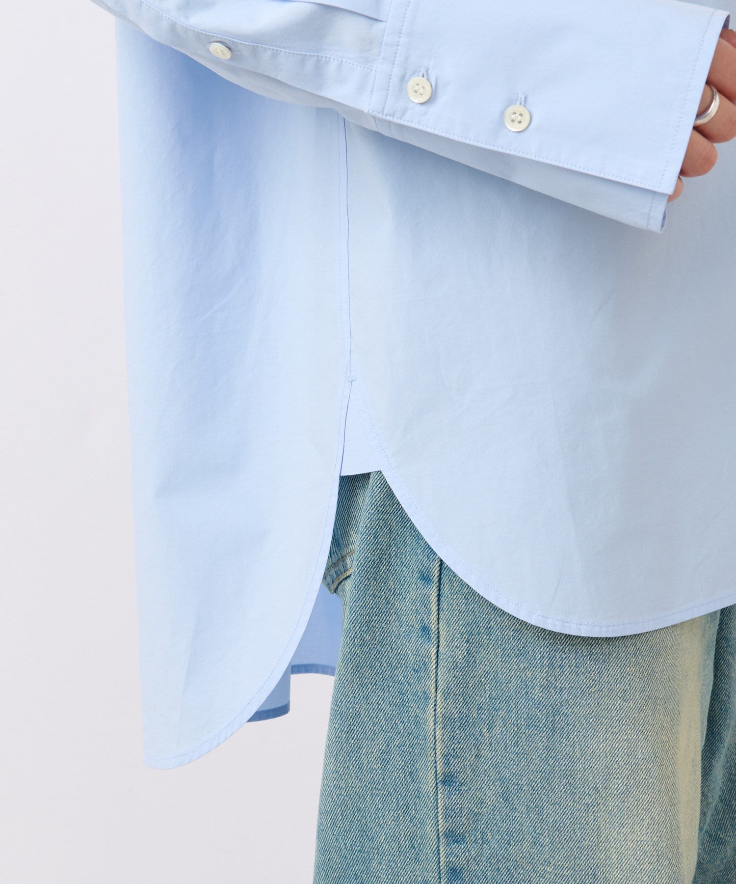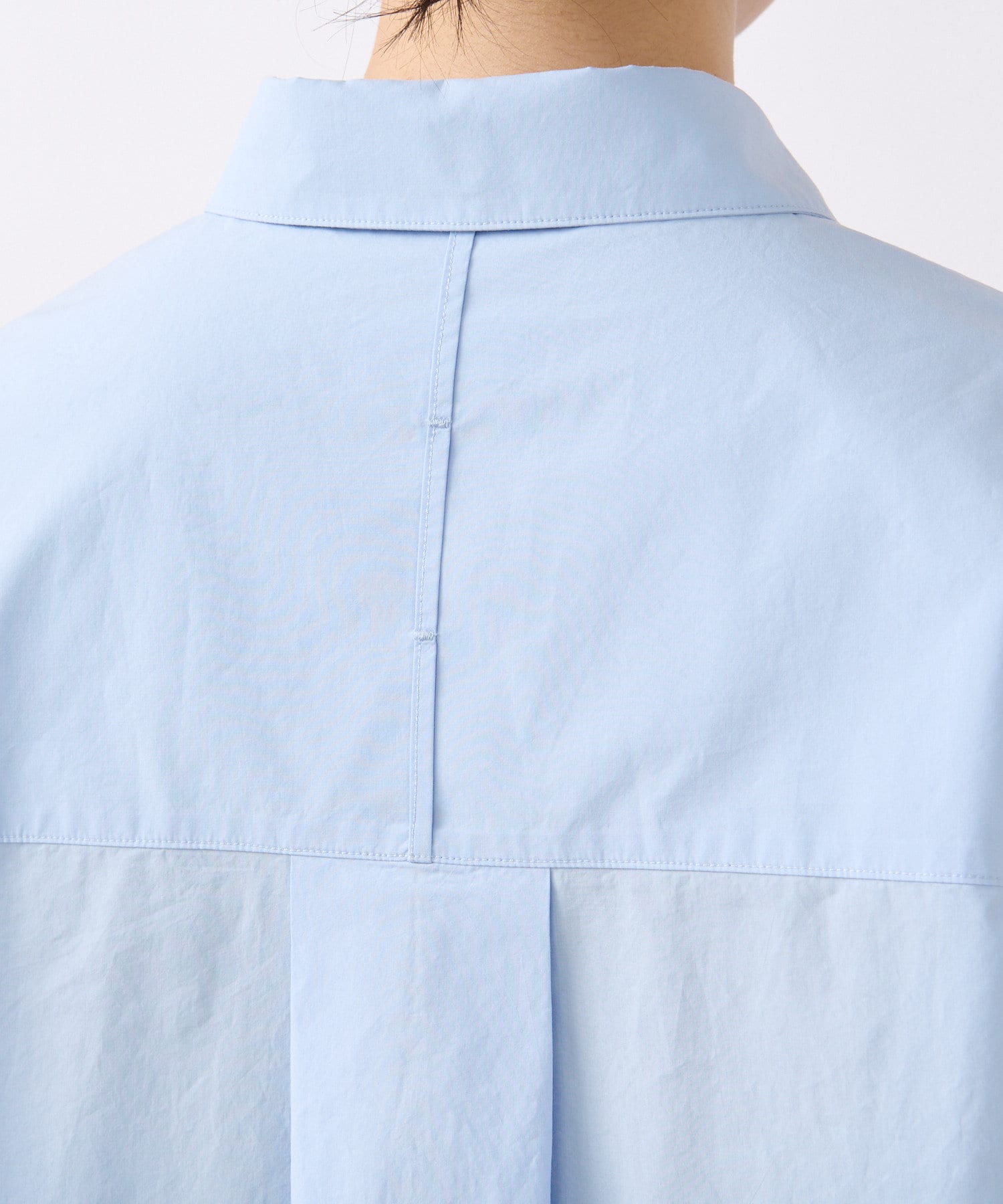 シンプルなオーバーシルエットのシャツで、パリッとしすぎないように洗いをかけてカジュアルな風合いになっております。