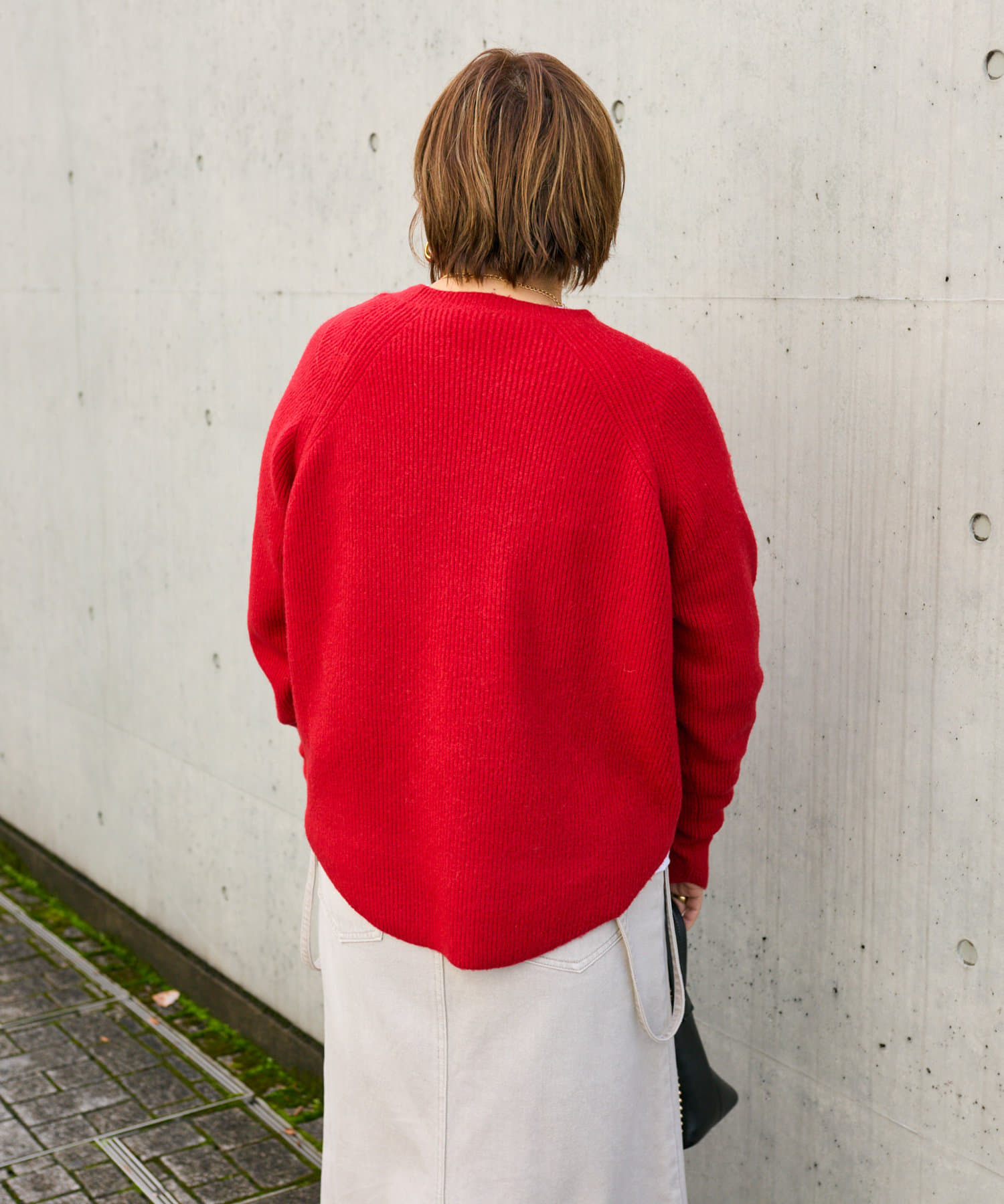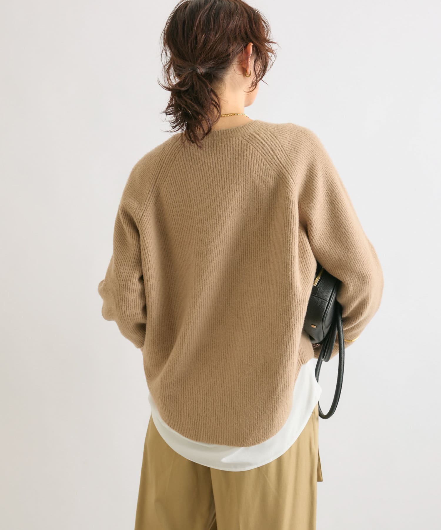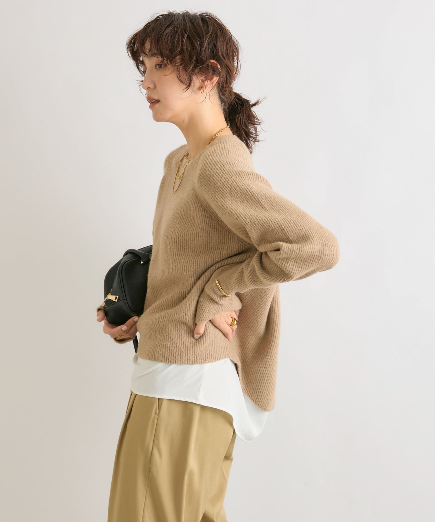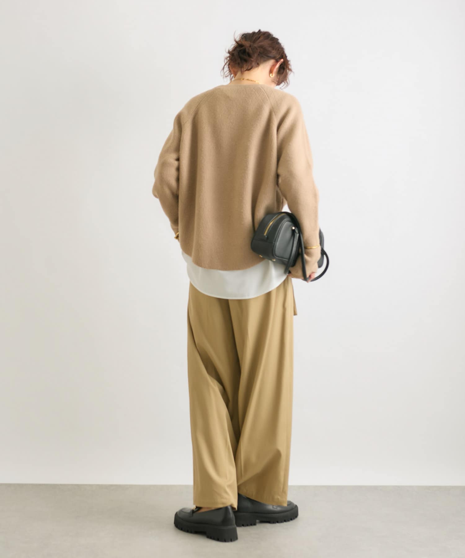 アームウォーマー風の長めの袖と、ヒップ回りをカバーするやや長めの後ろ着丈で着るだけで決まるデザイン。