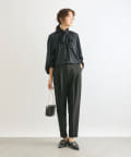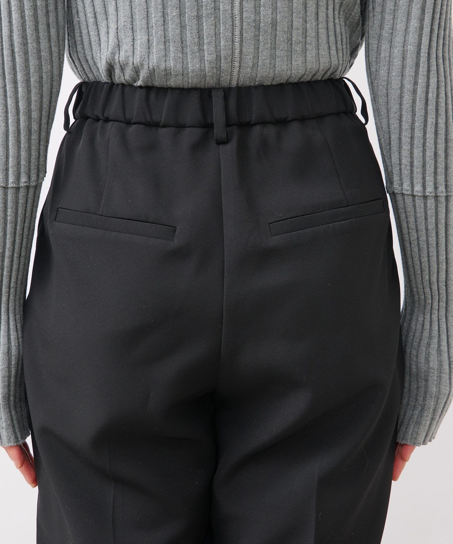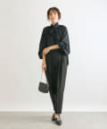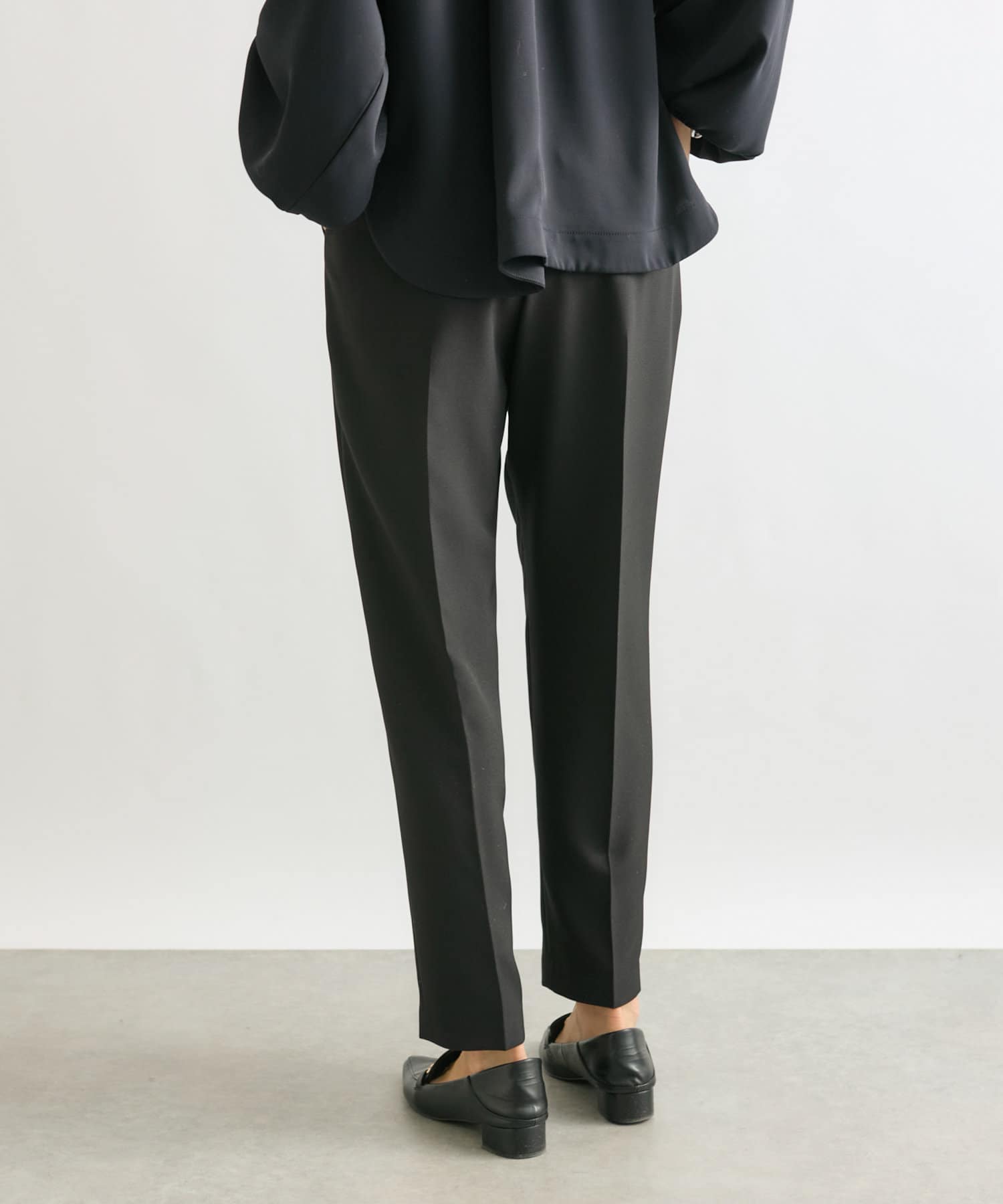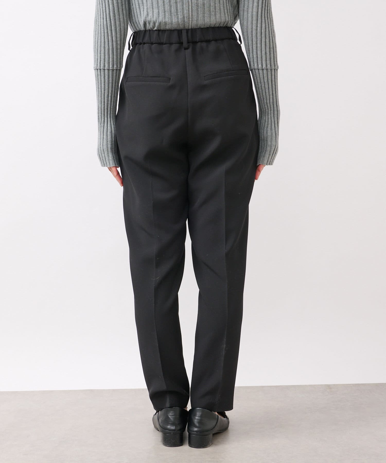 ウエストは後ろゴム仕様、タック入りで腰回りもゆとりがあるシルエットながらもすっきり細見え効果は抜群。