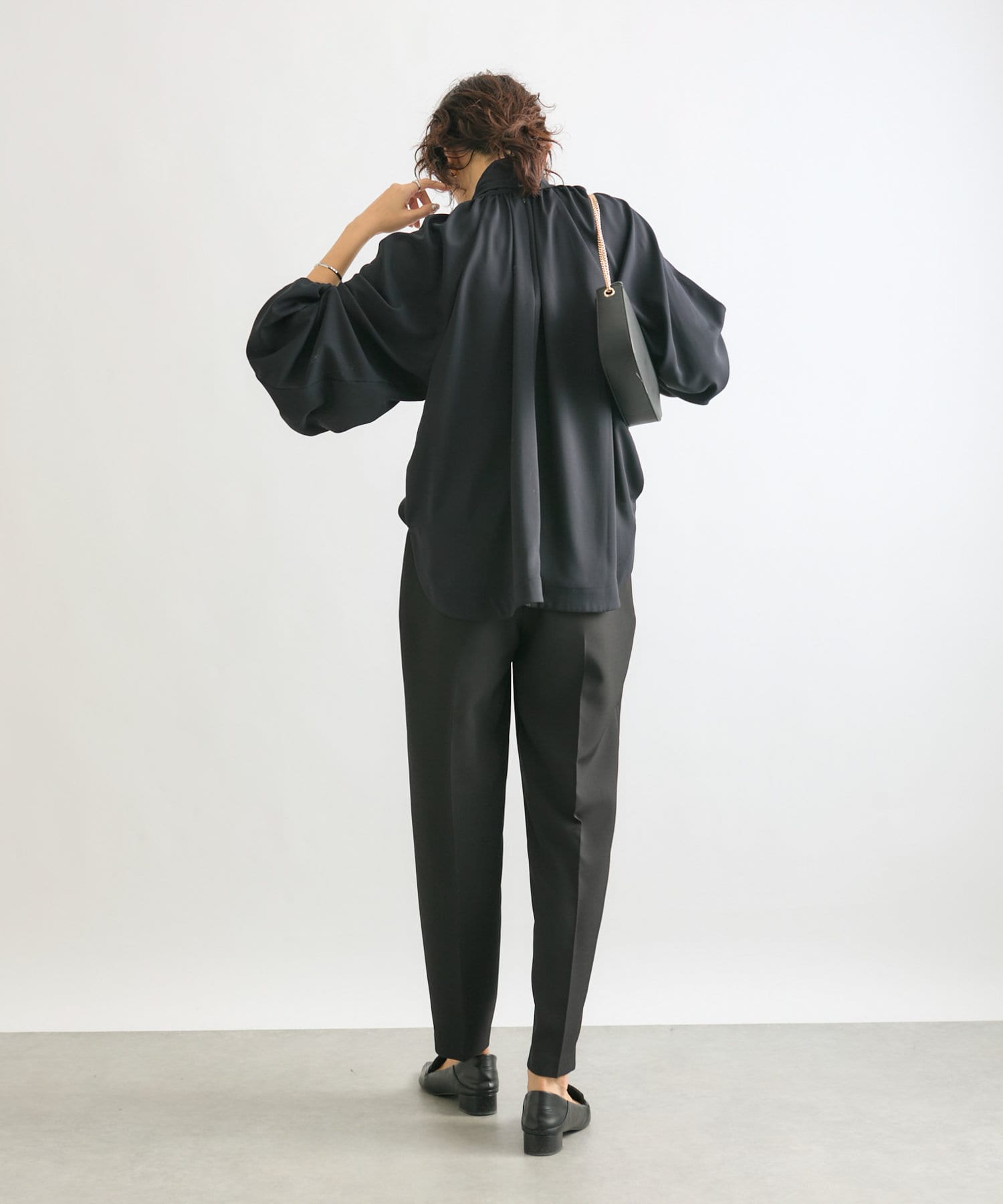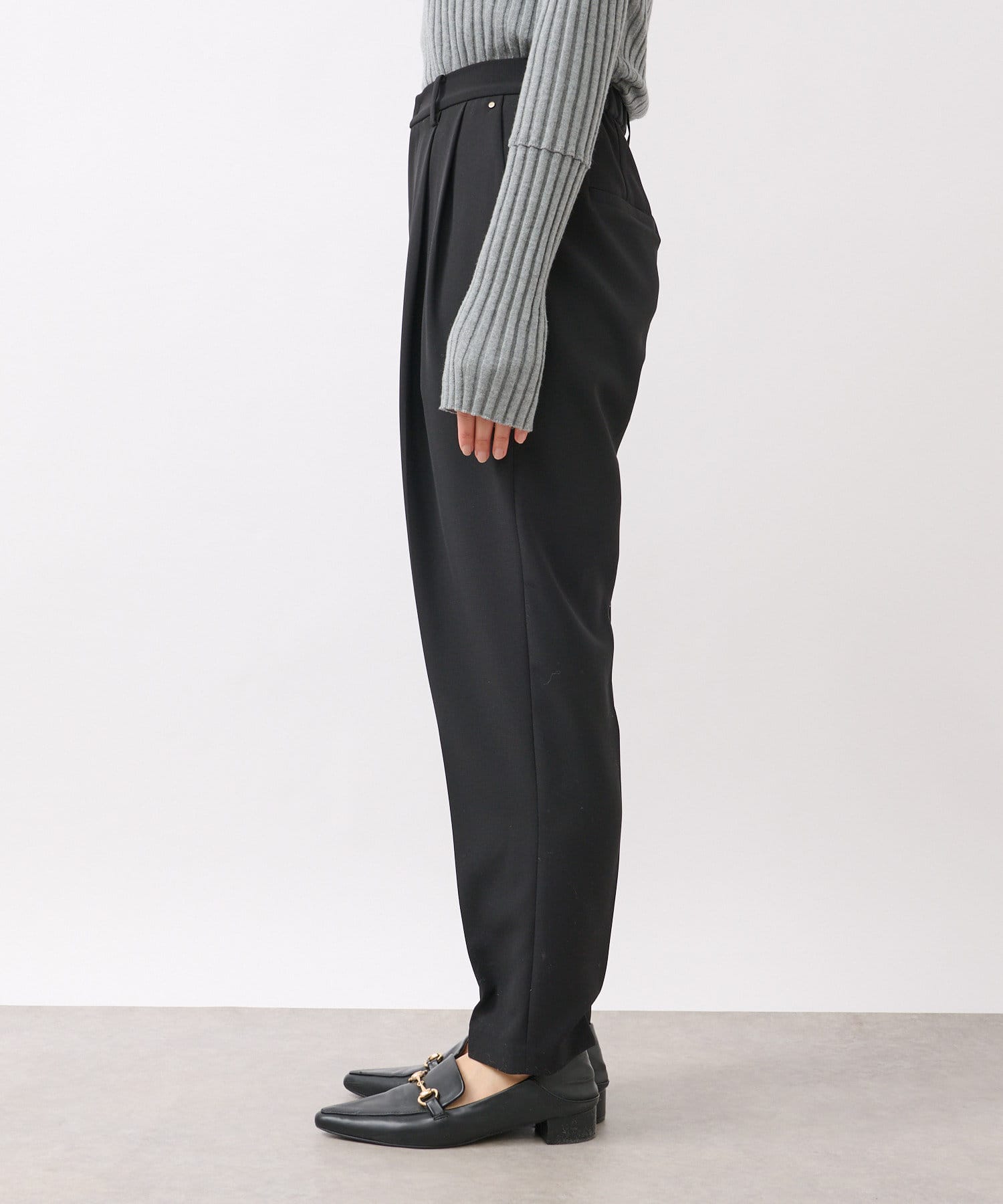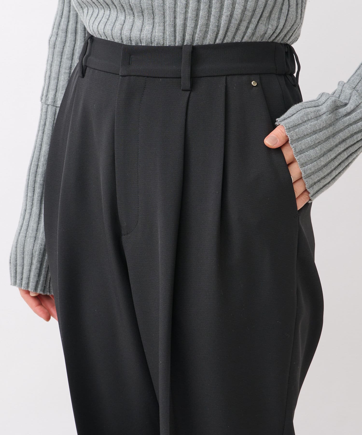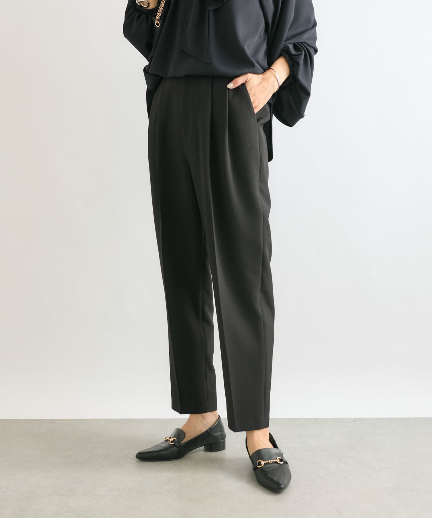 ウエストは後ろゴム仕様、タック入りで腰回りもゆとりがあるシルエットながらもすっきり細見え効果は抜群。