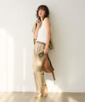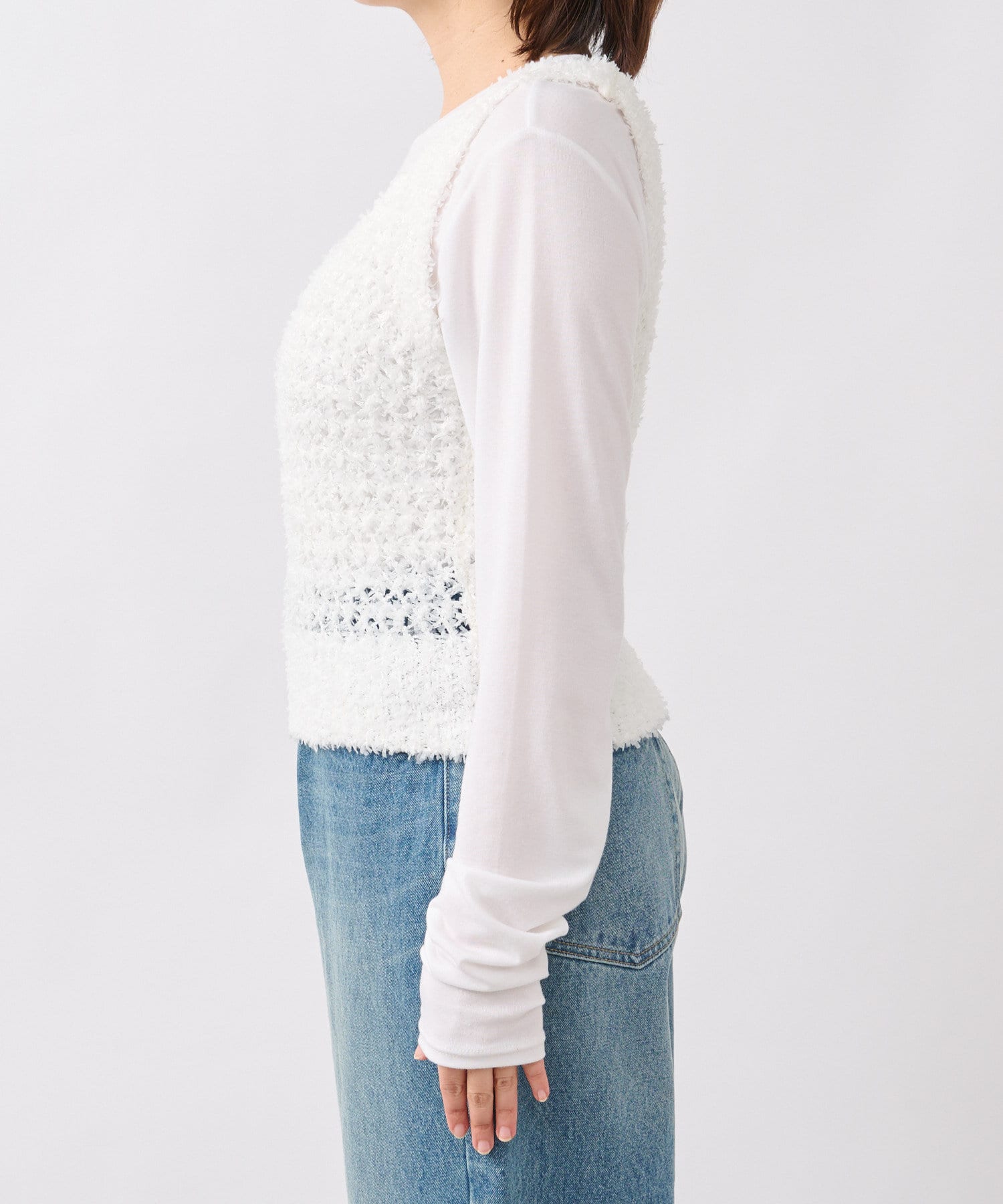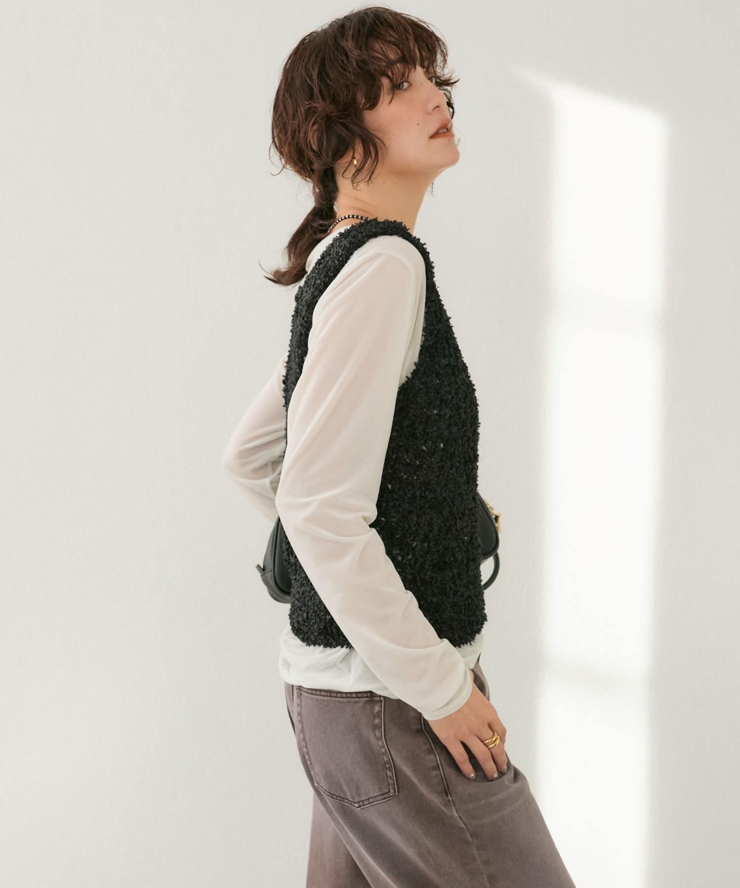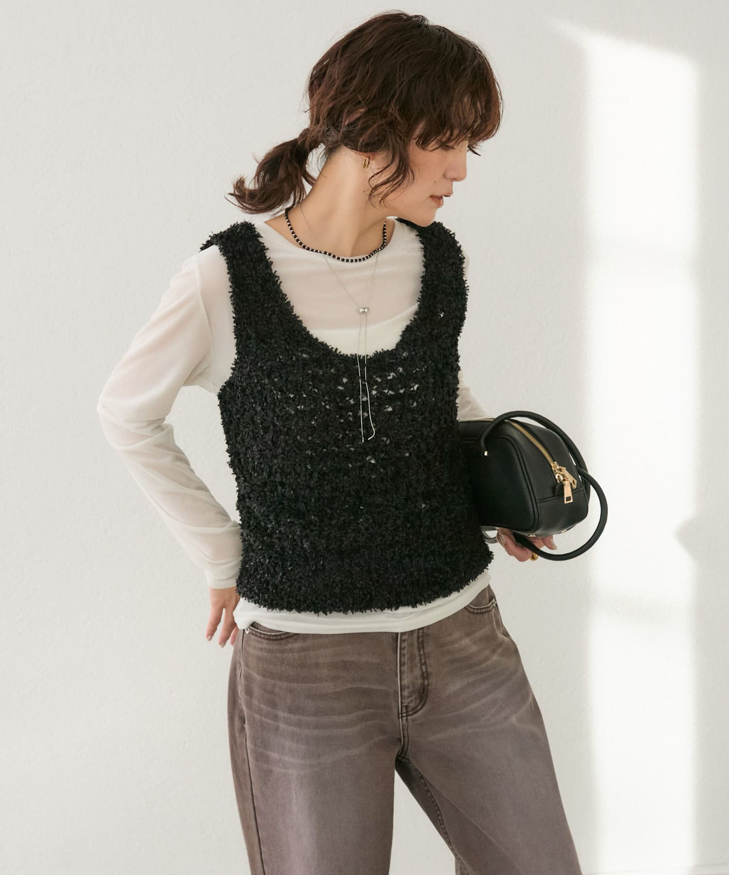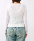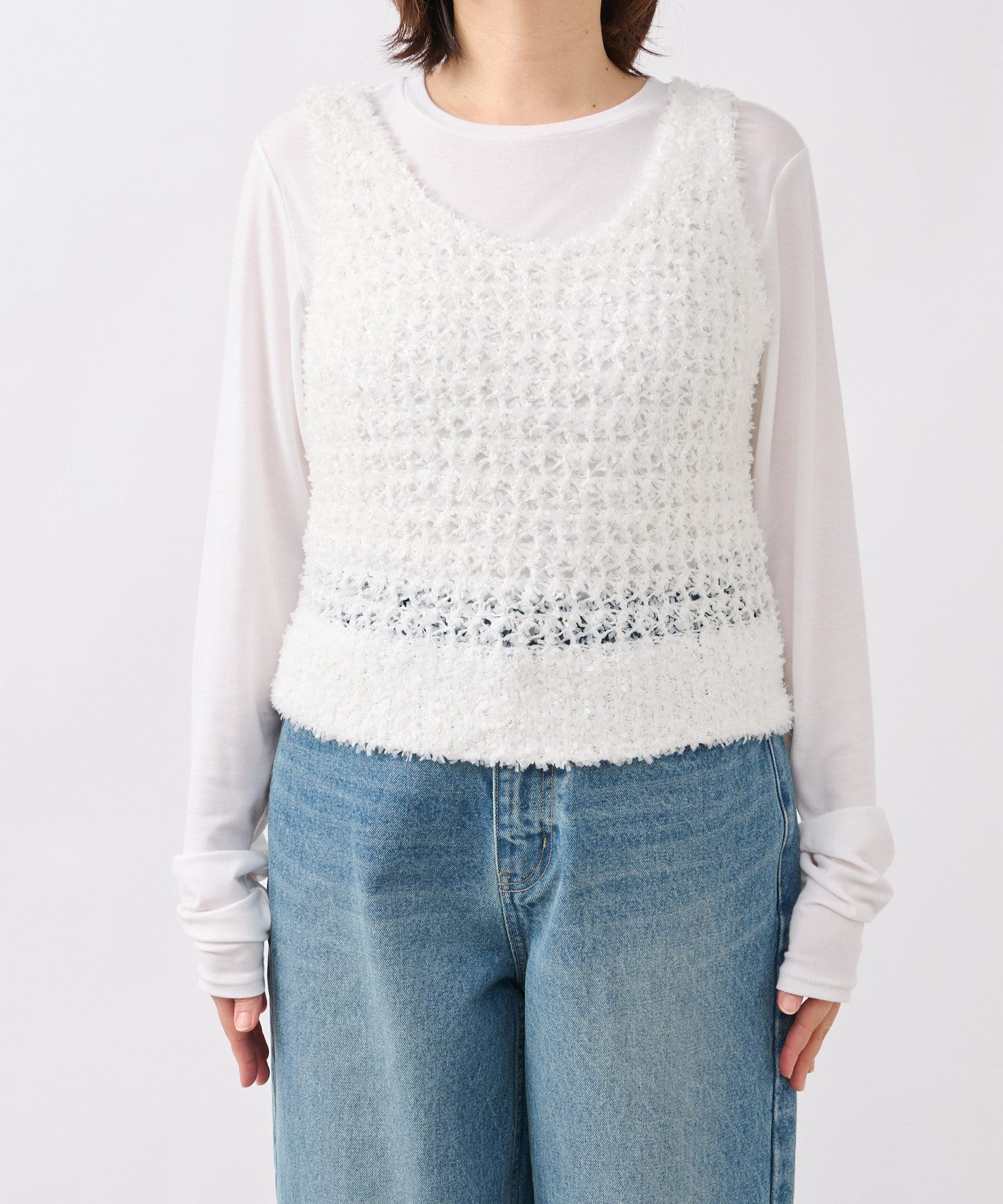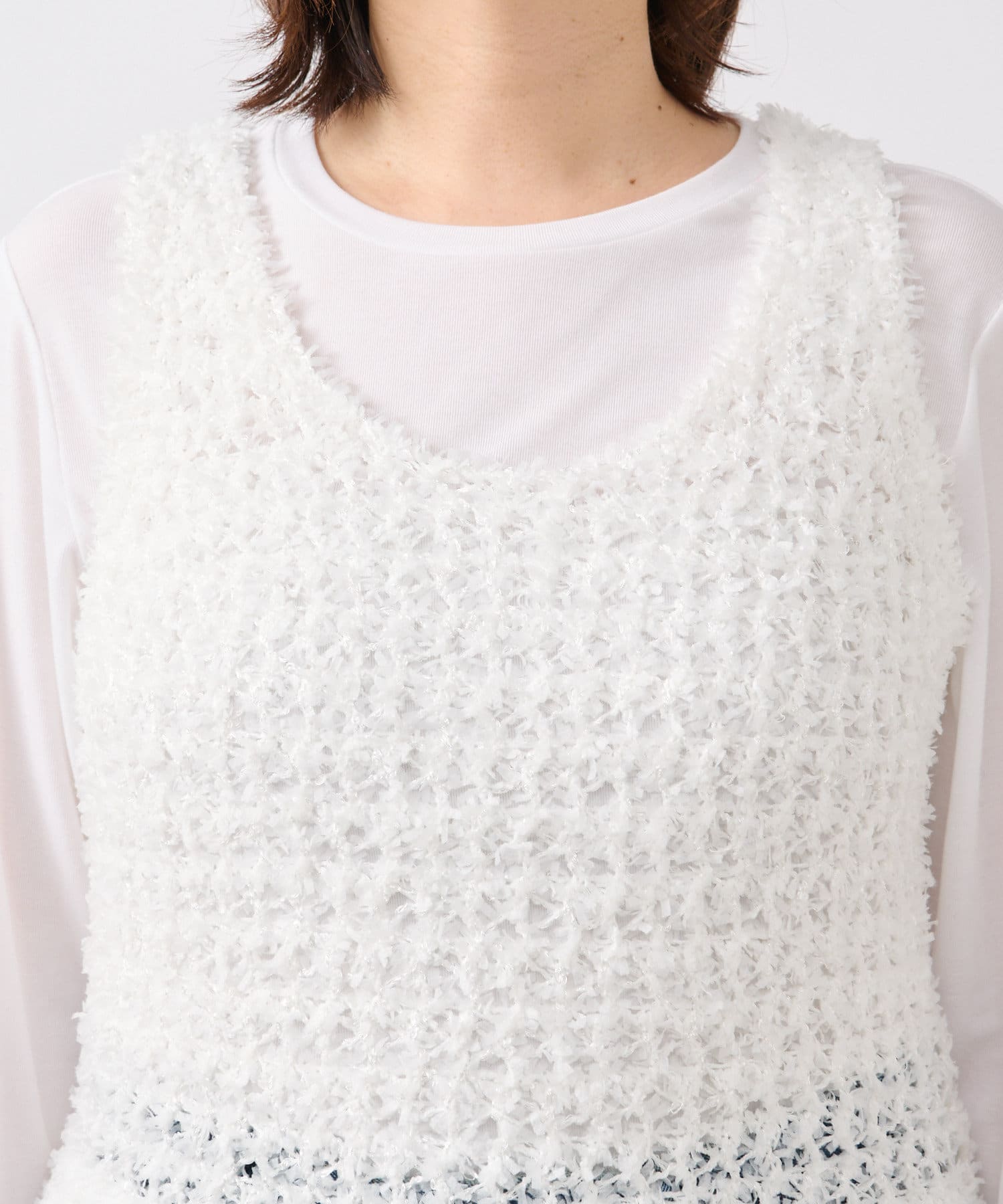 光沢のあるリリヤーンとテープヤーンを使った、キャッチーでトレンド感のある編地で作ったニットビスチェ。