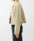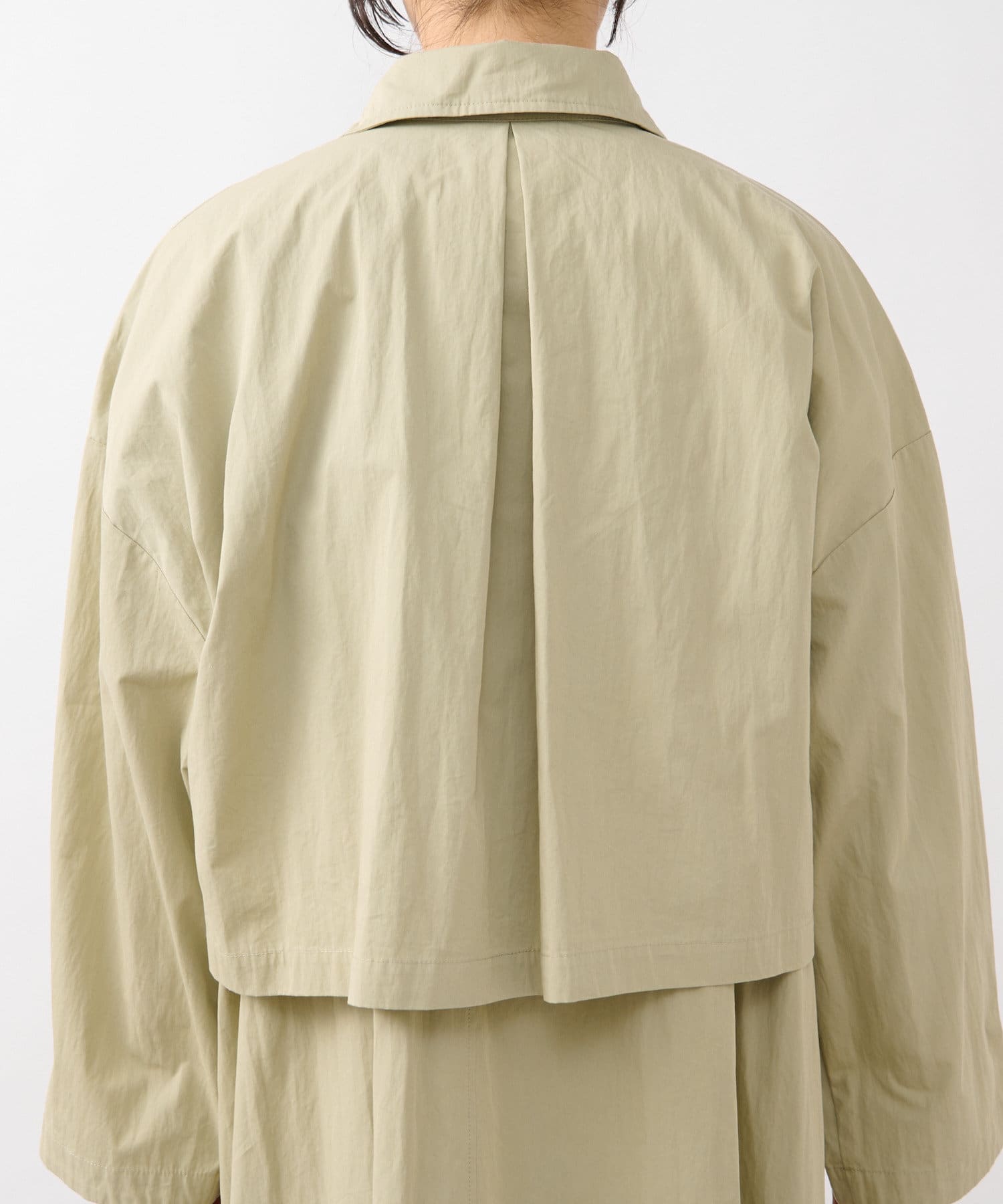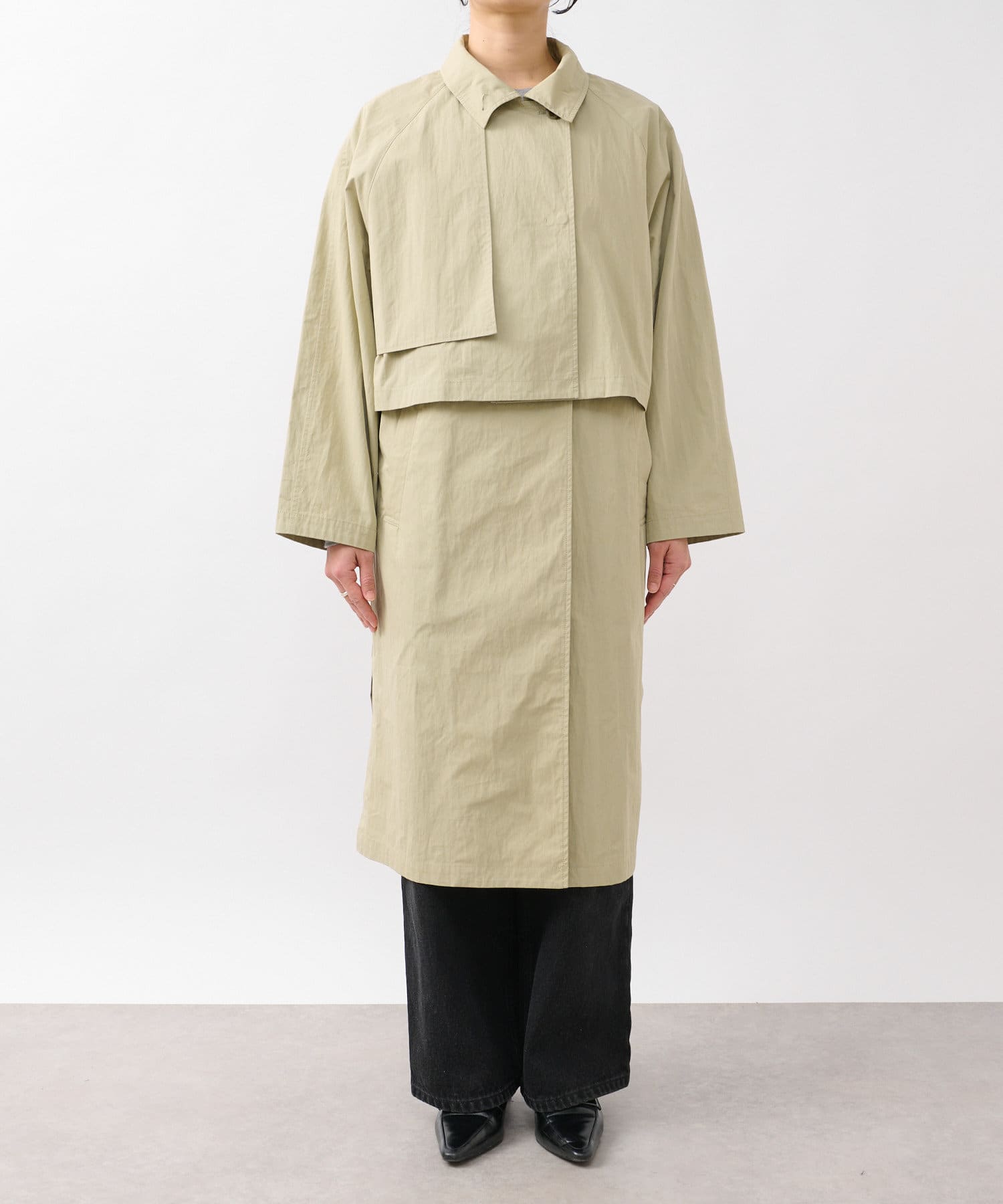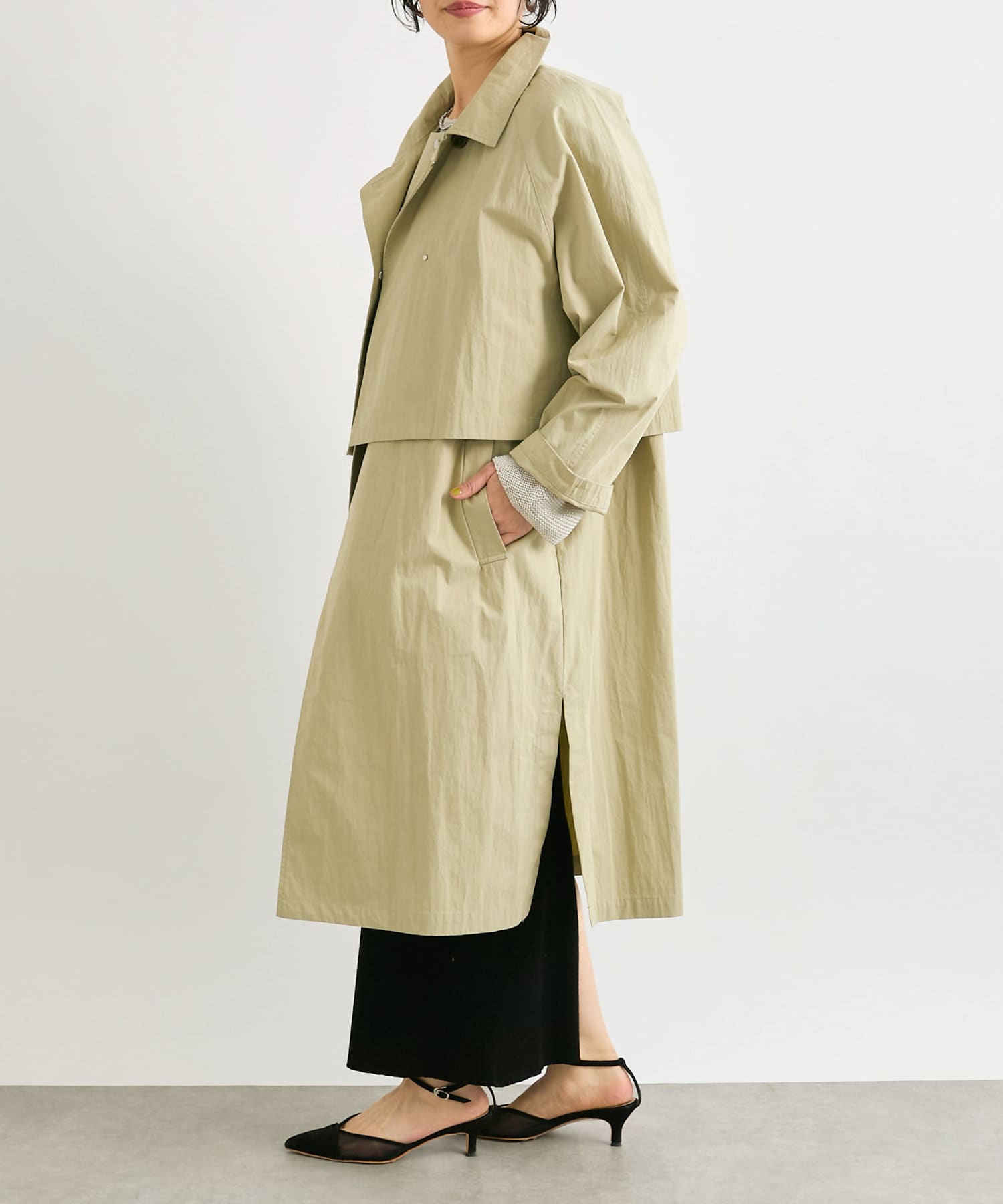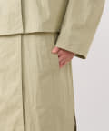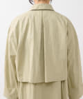 ショート丈のジャケットとロング丈のジレがセットになっており、組み合わせると一枚のトレンチコートのように着用できます。