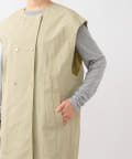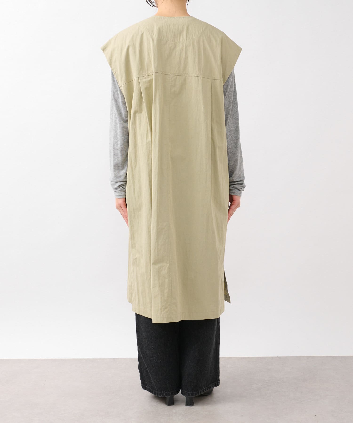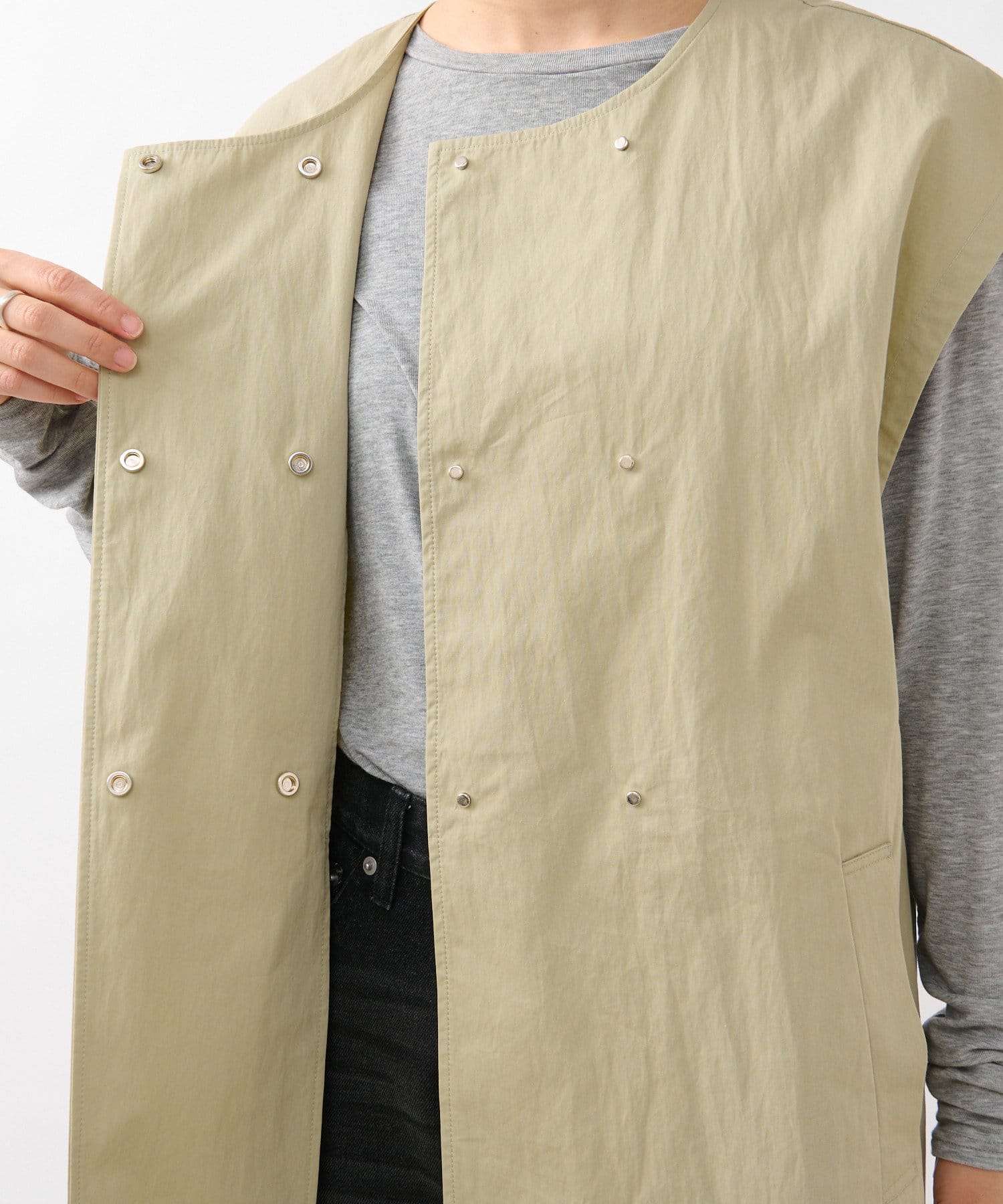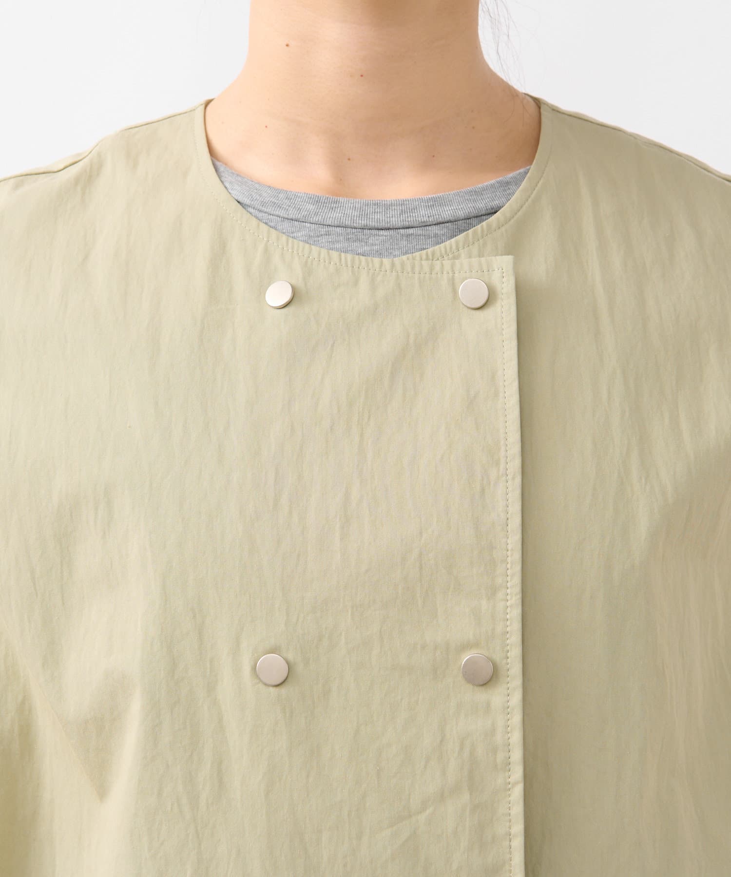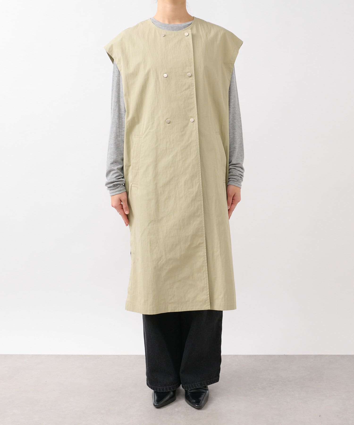 ショート丈のジャケットとロング丈のジレがセットになっており、組み合わせると一枚のトレンチコートのように着用できます。