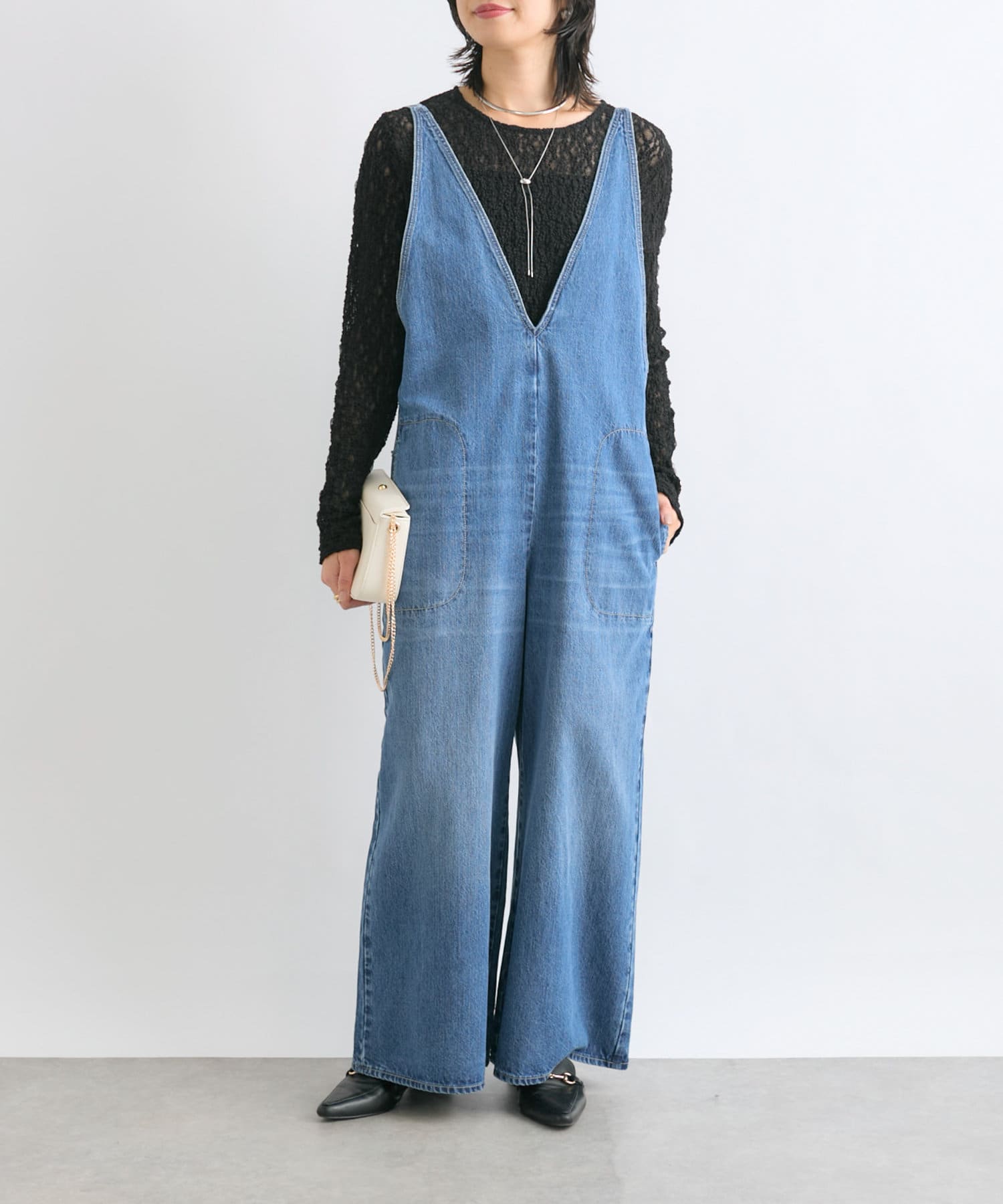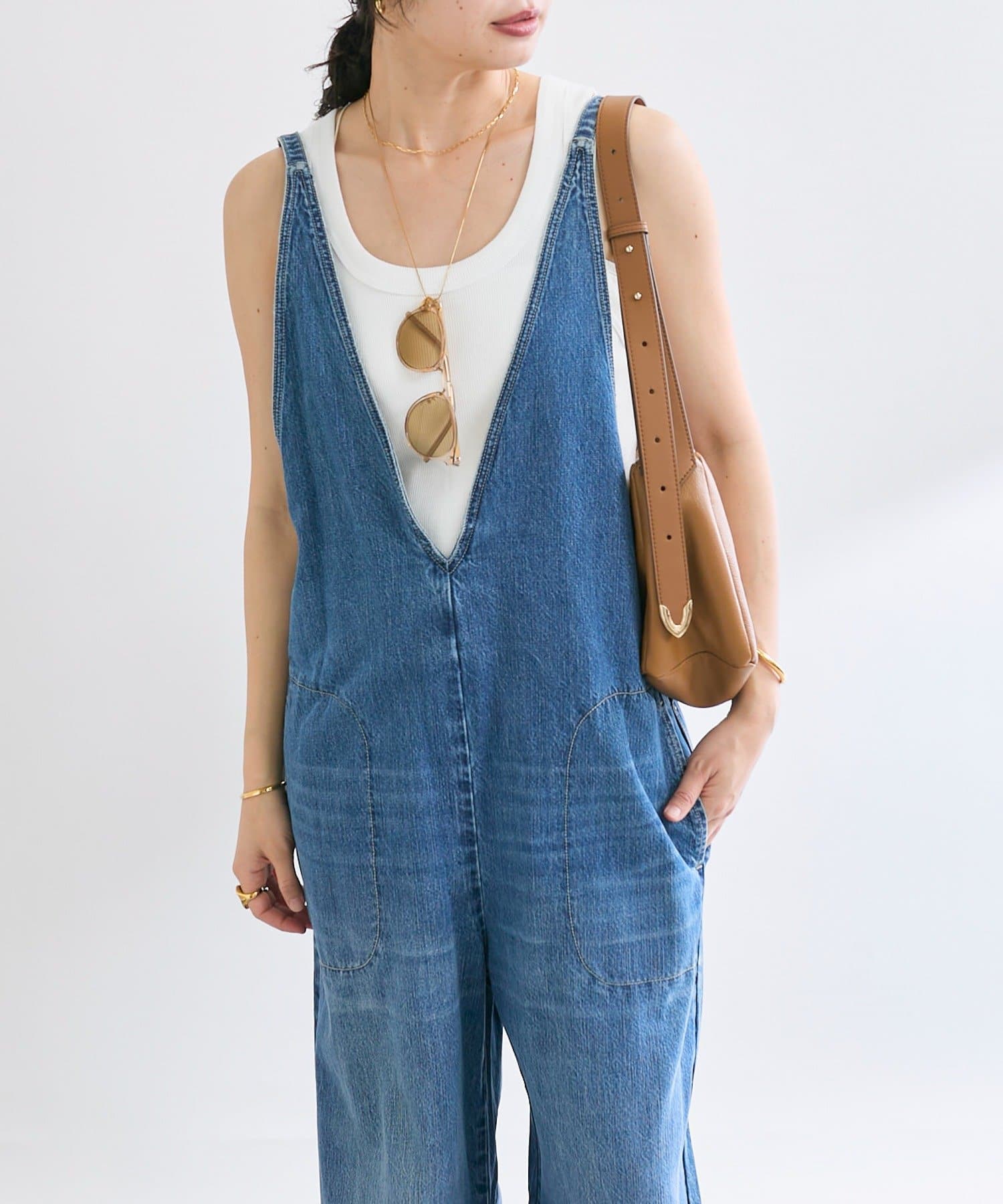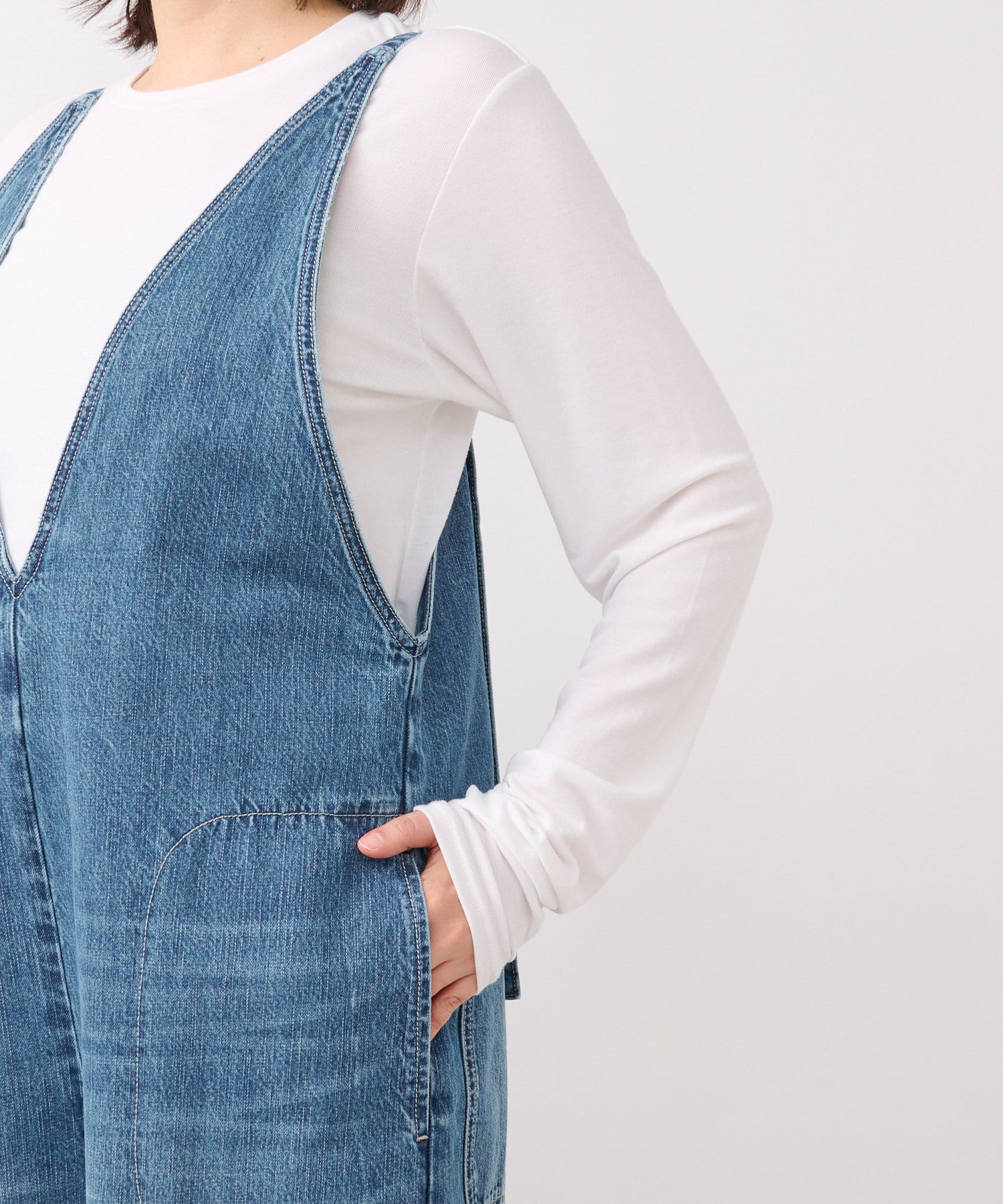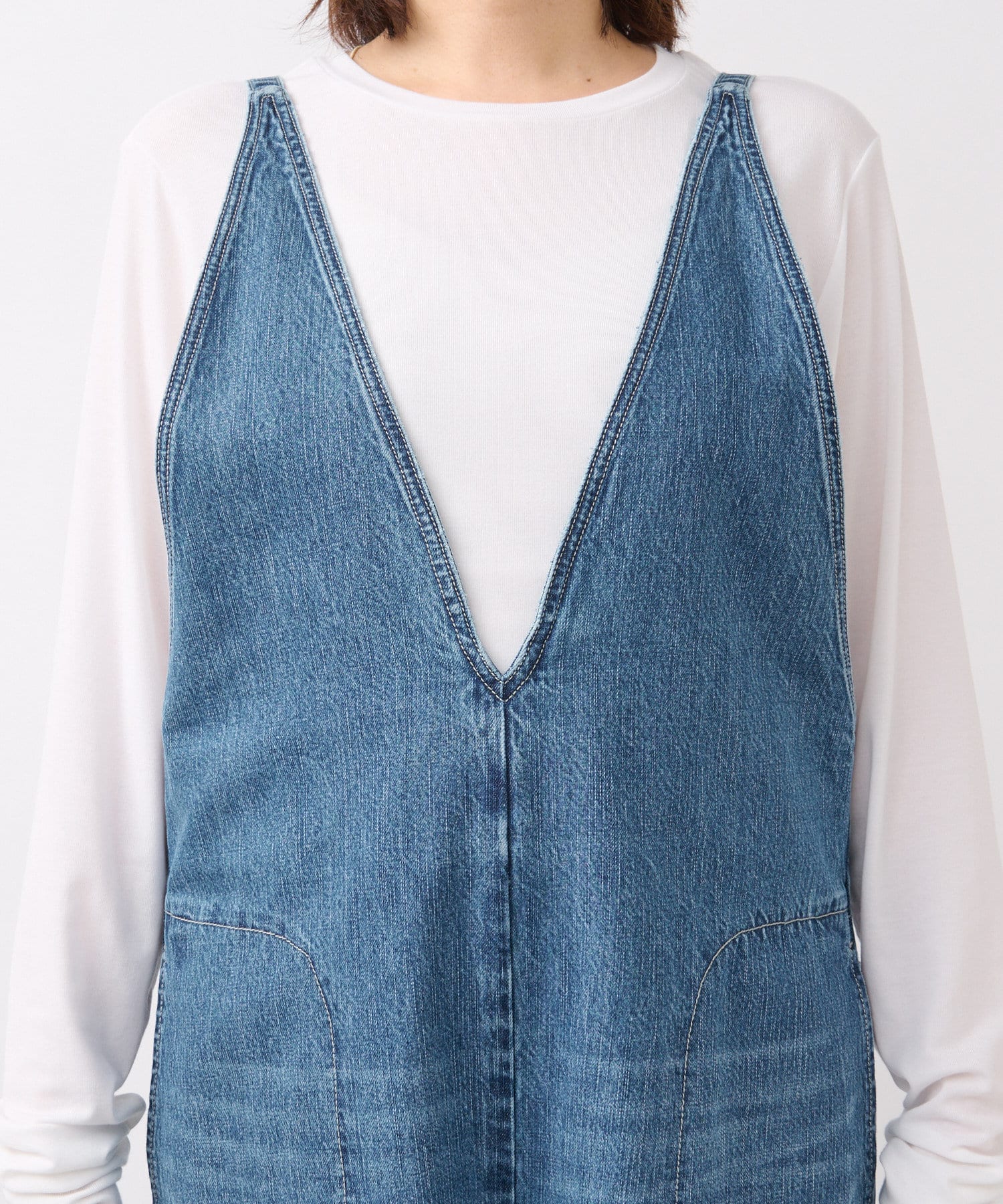 深く切れ込んだプランジネックがポイントのデニムサロペット。