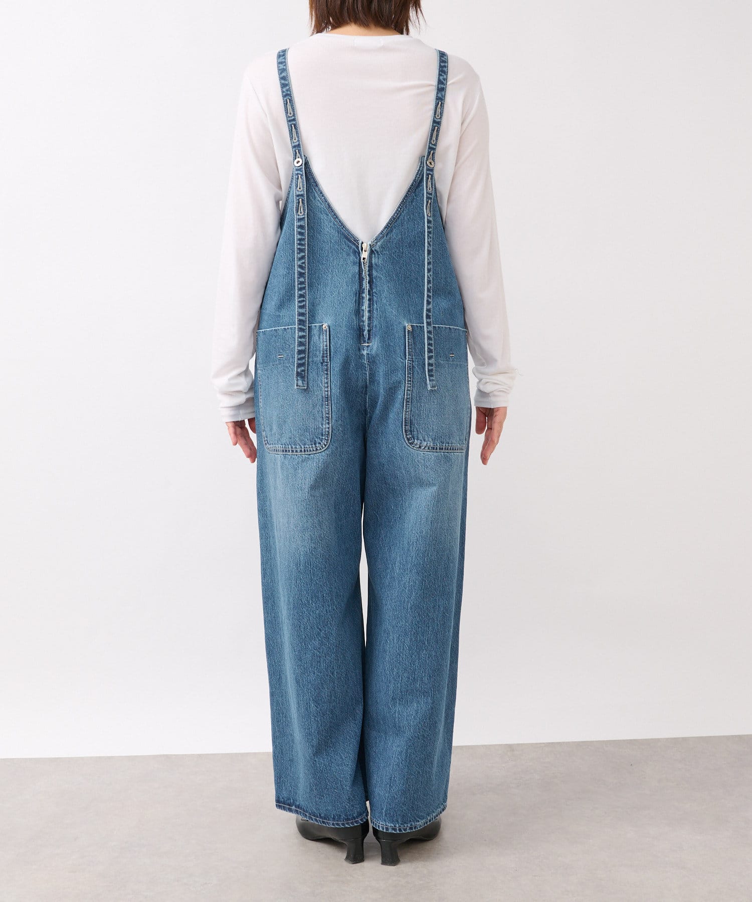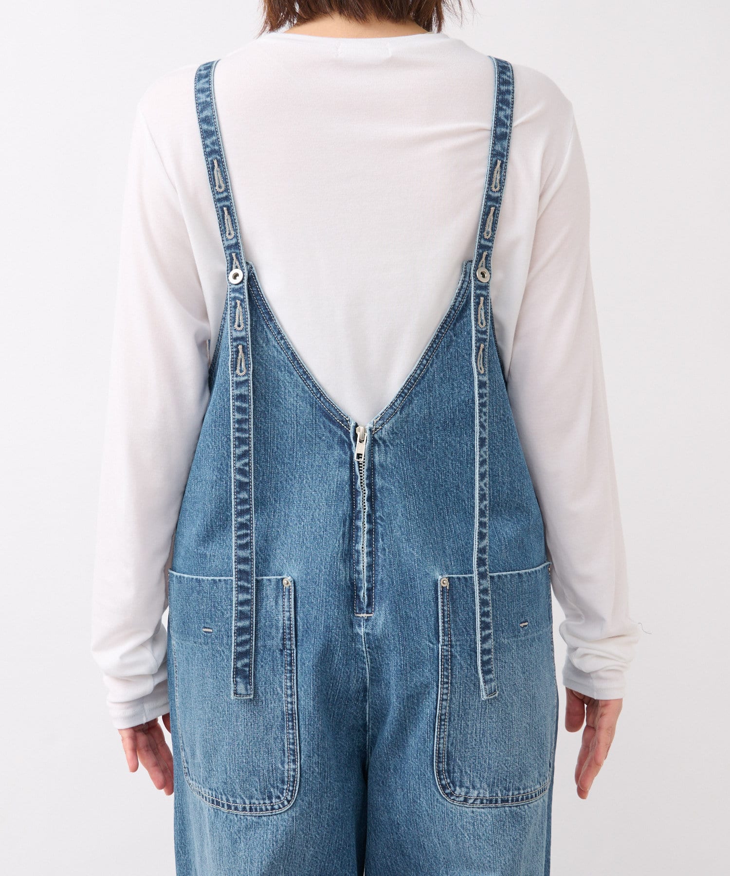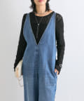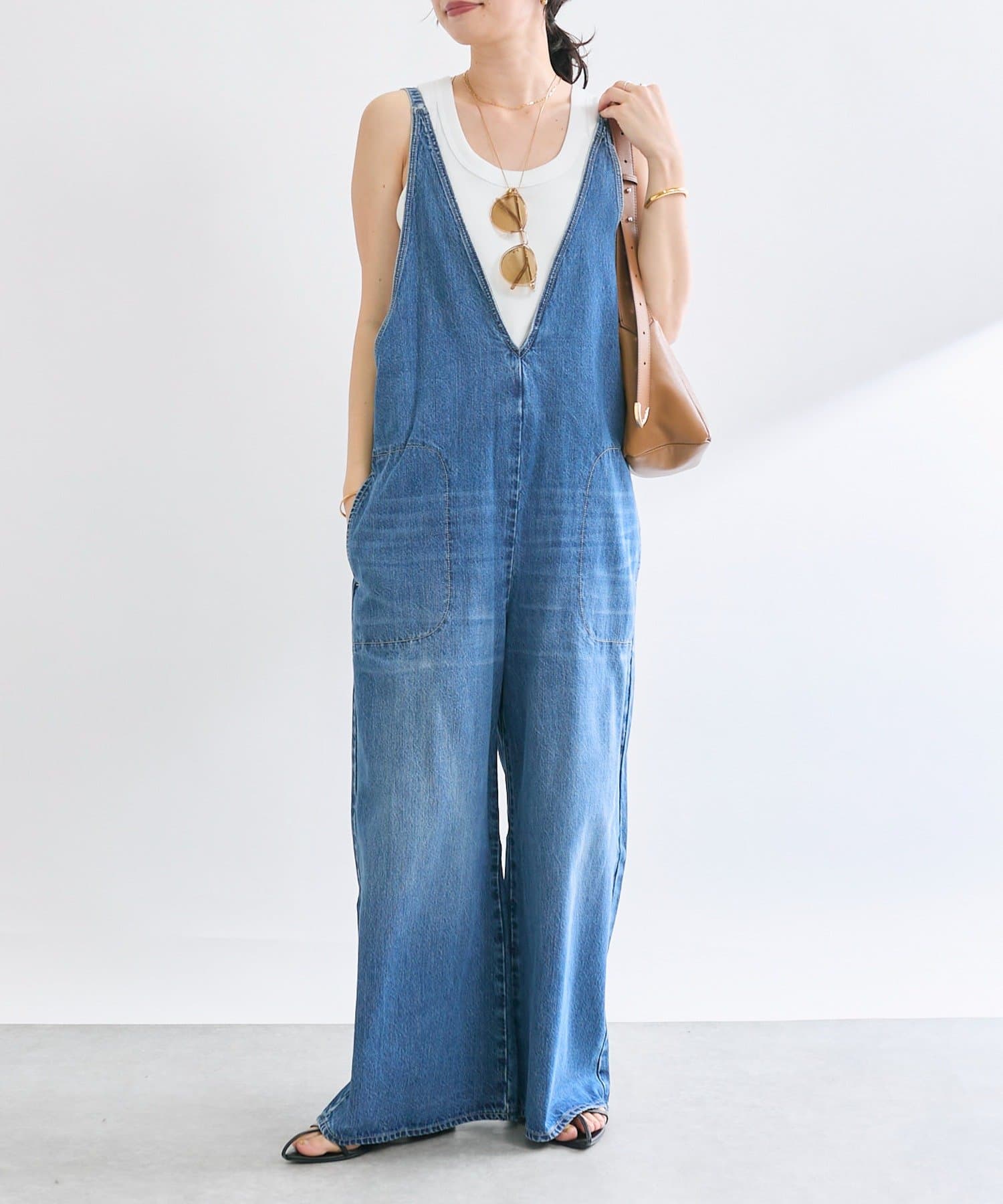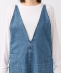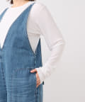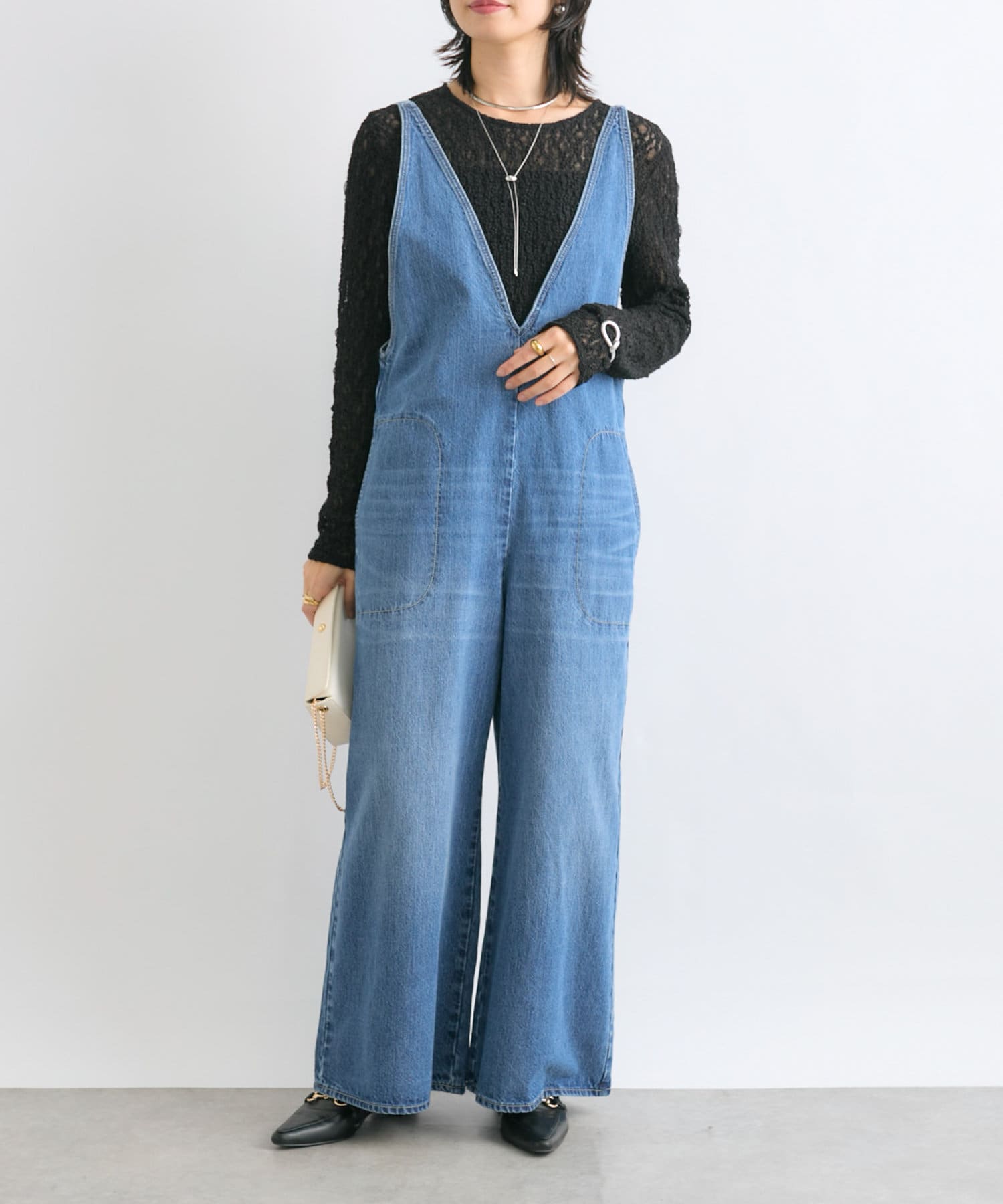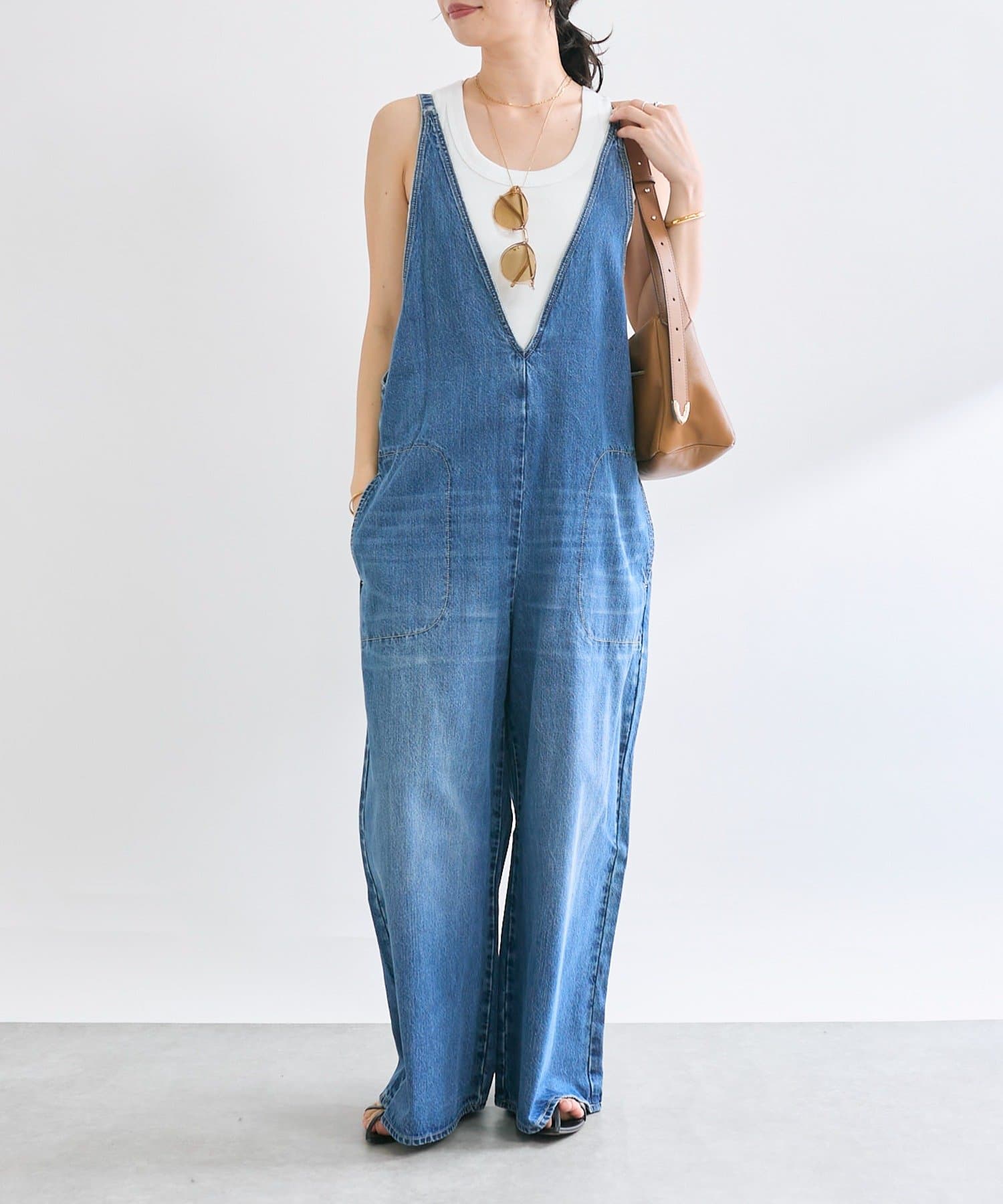 深く切れ込んだプランジネックがポイントのデニムサロペット。