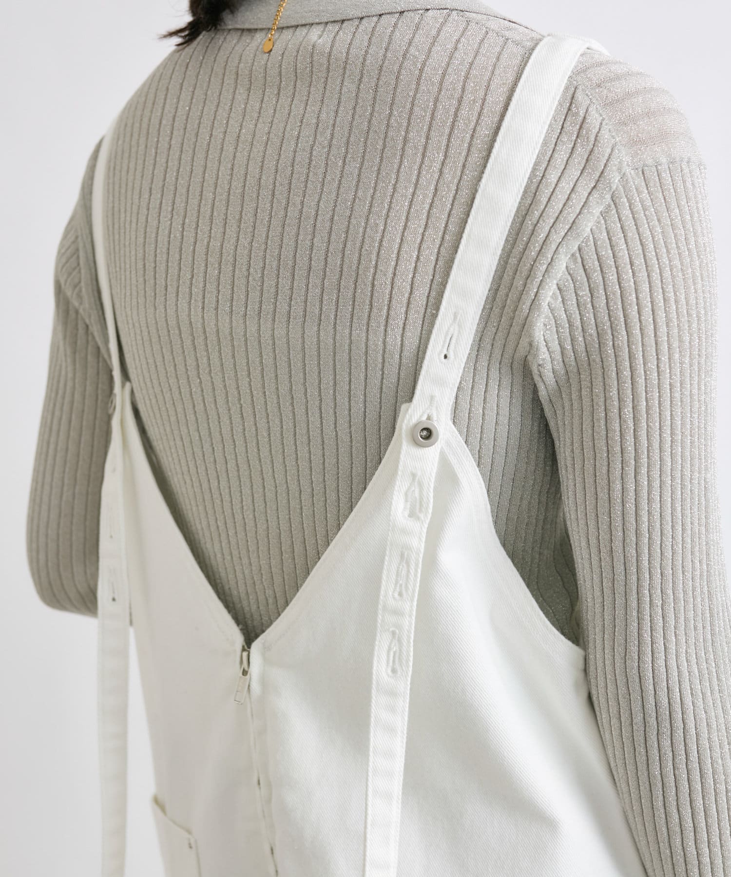 ストラップにはボタンホールを5つ施しており着丈のアレンジが可能に。細目にデザインしたストラップもデザインポイントです。