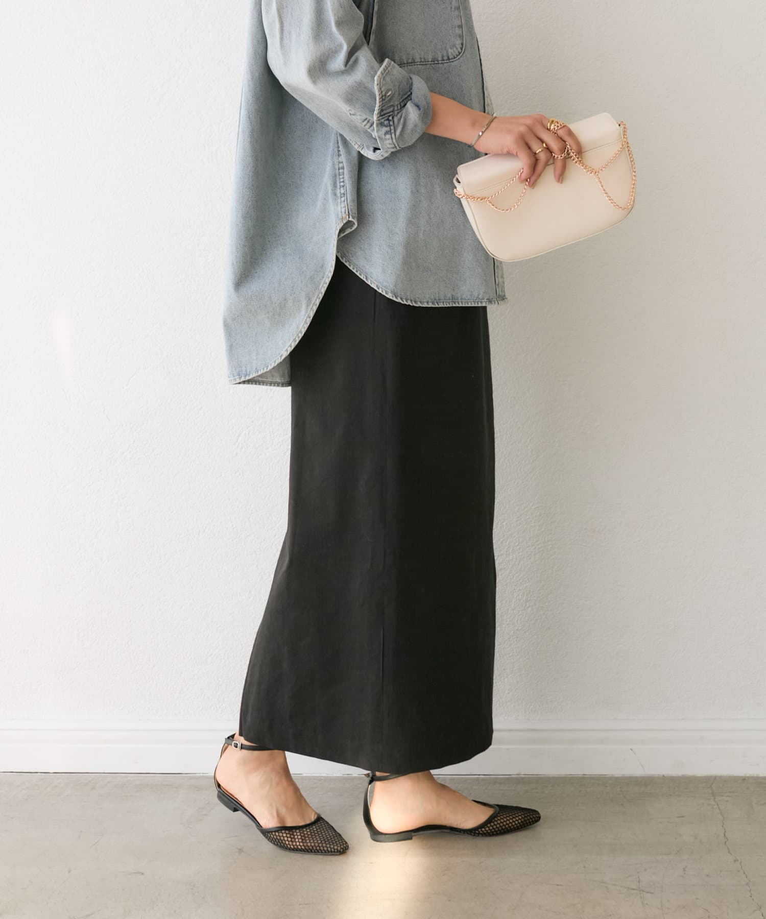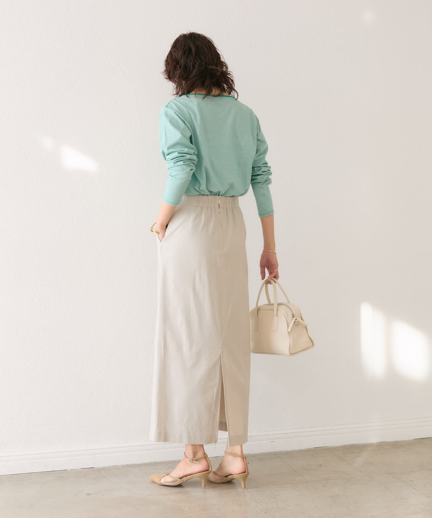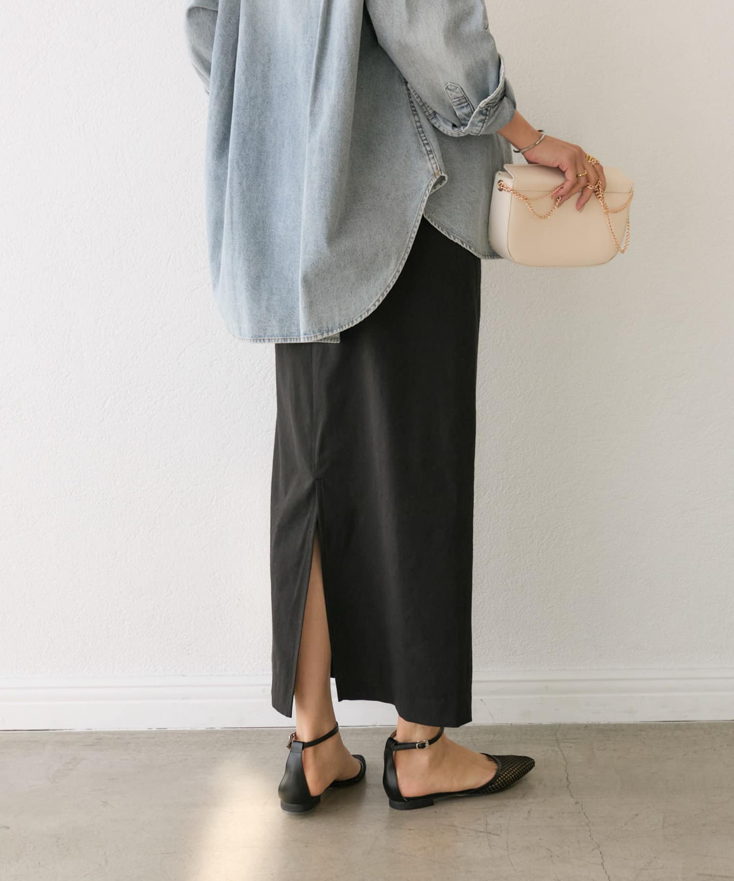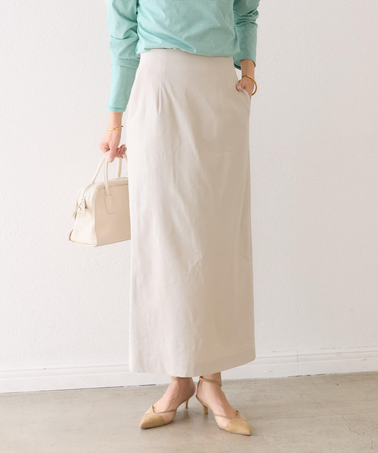 ナチュラルな表情感とカジュアルさが特徴的なストレッチ素材を使用したIラインスカート。