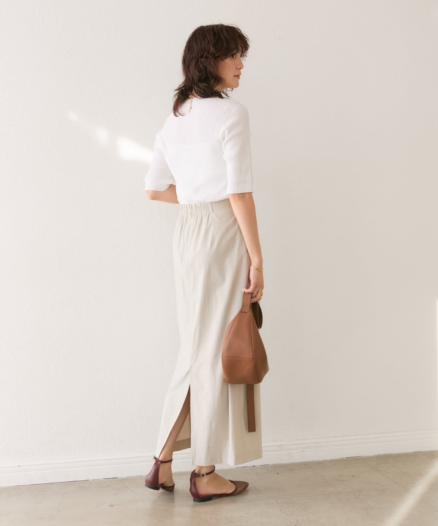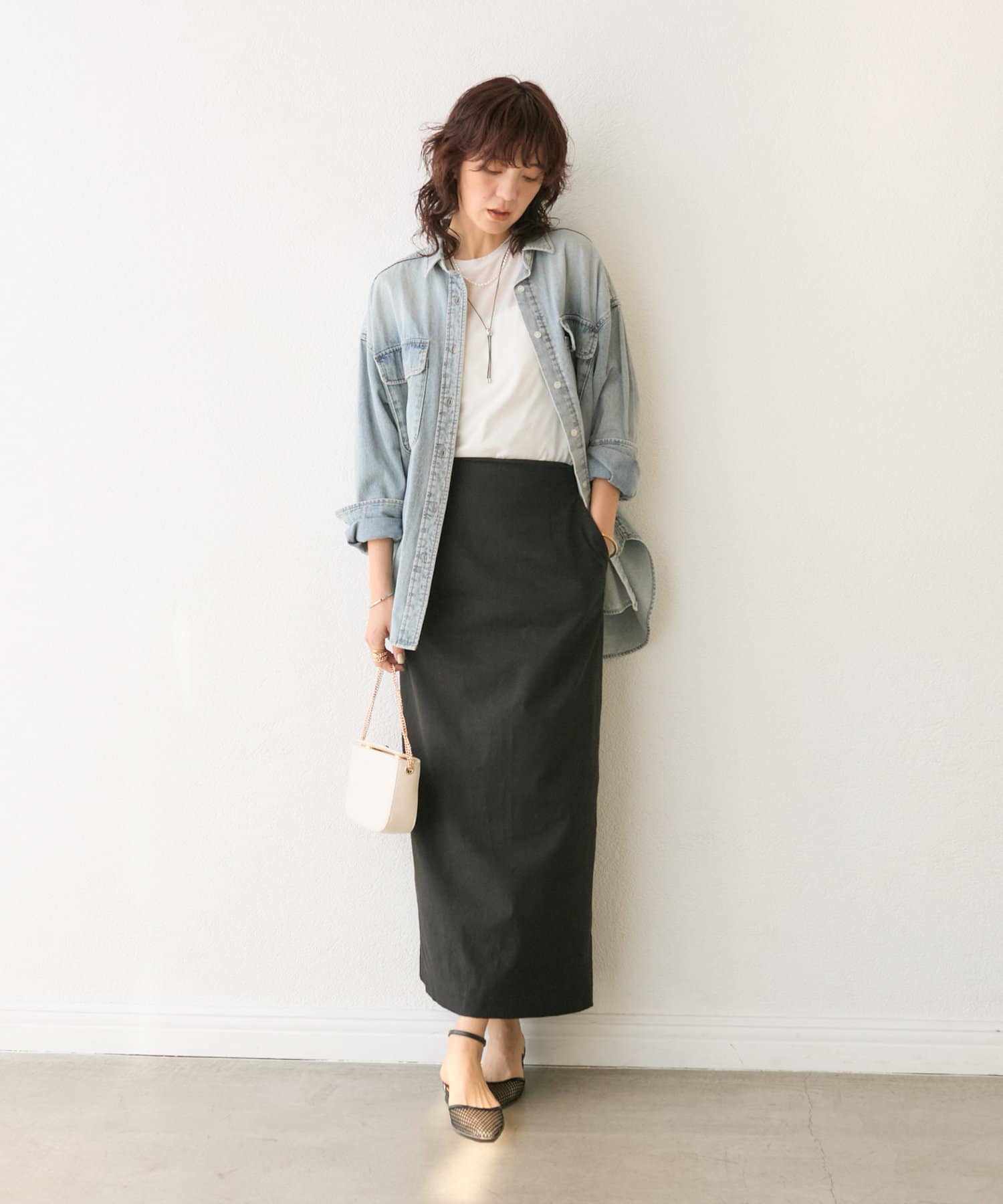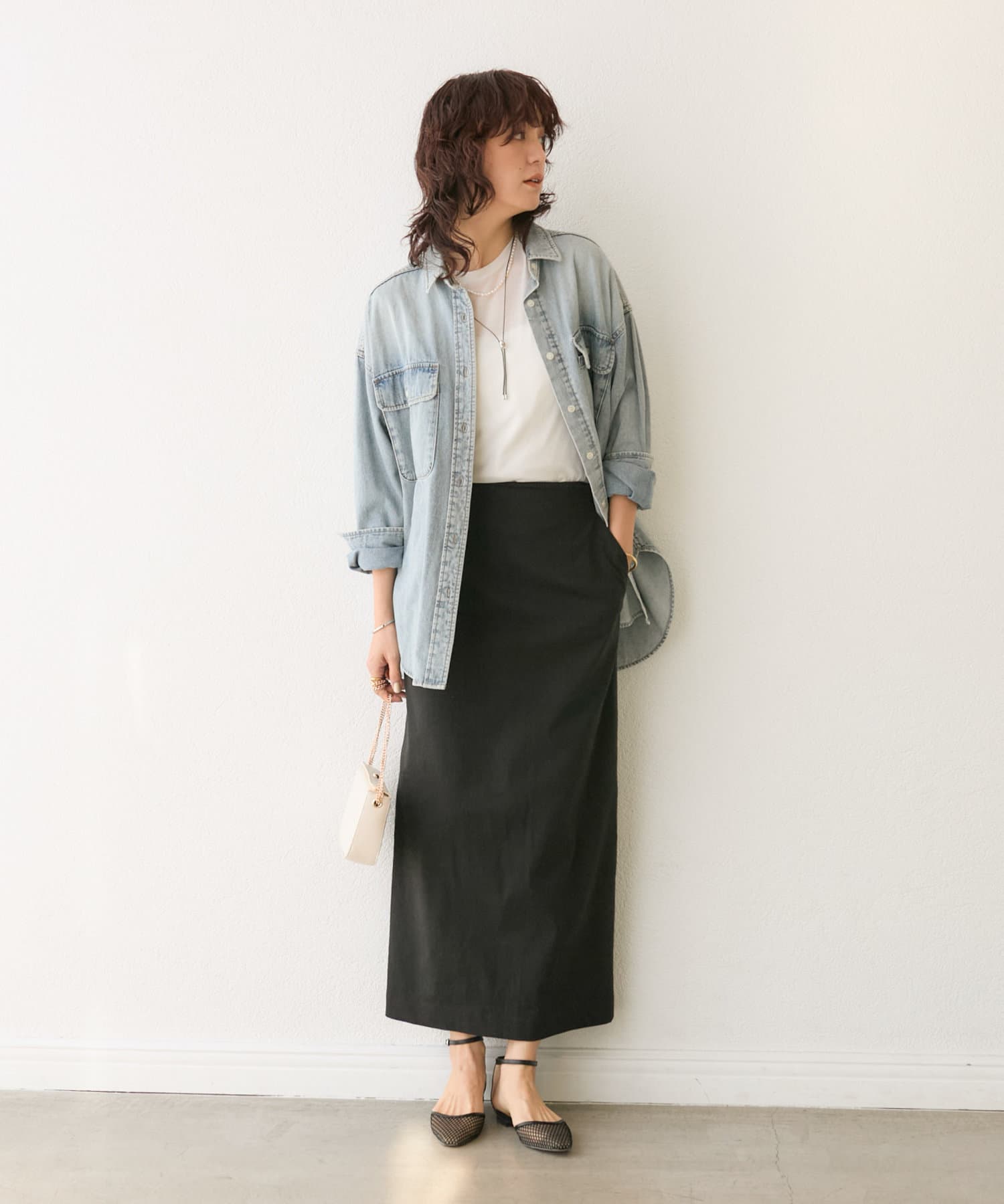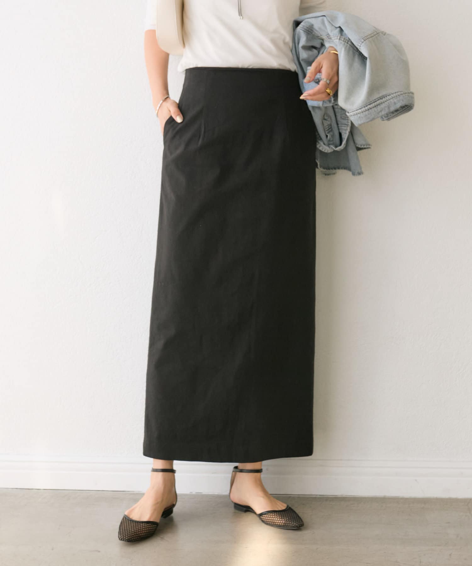ナチュラルな表情感とカジュアルさが特徴的なストレッチ素材を使用したIラインスカート。