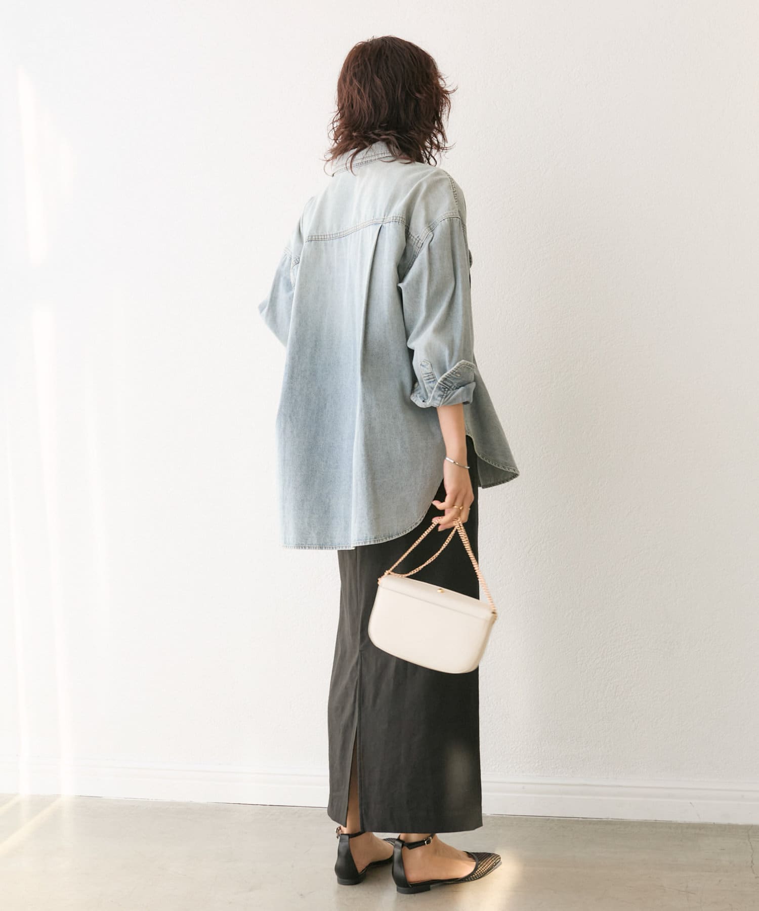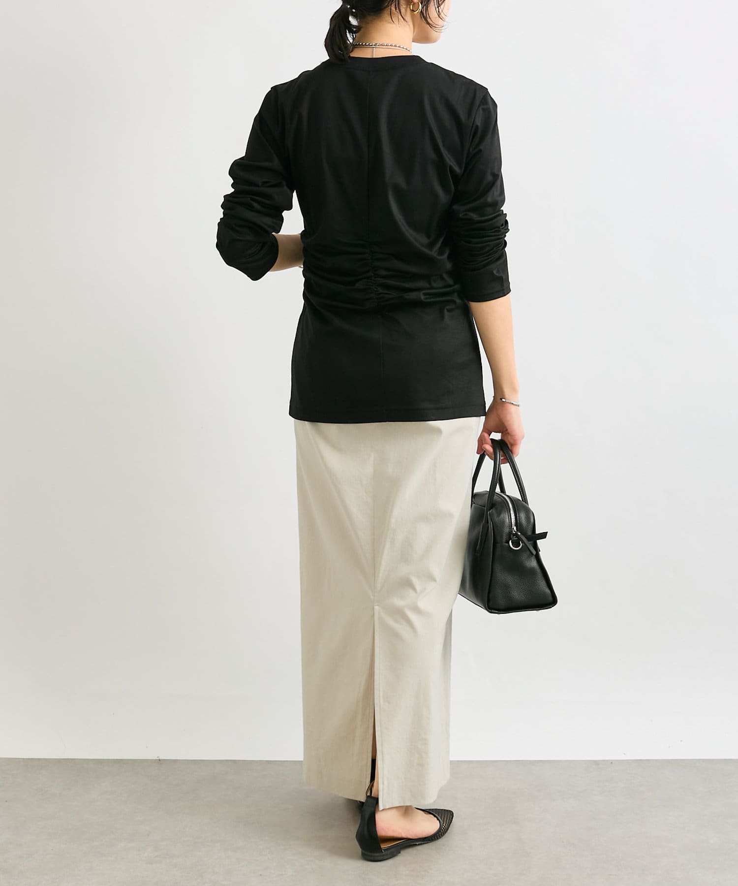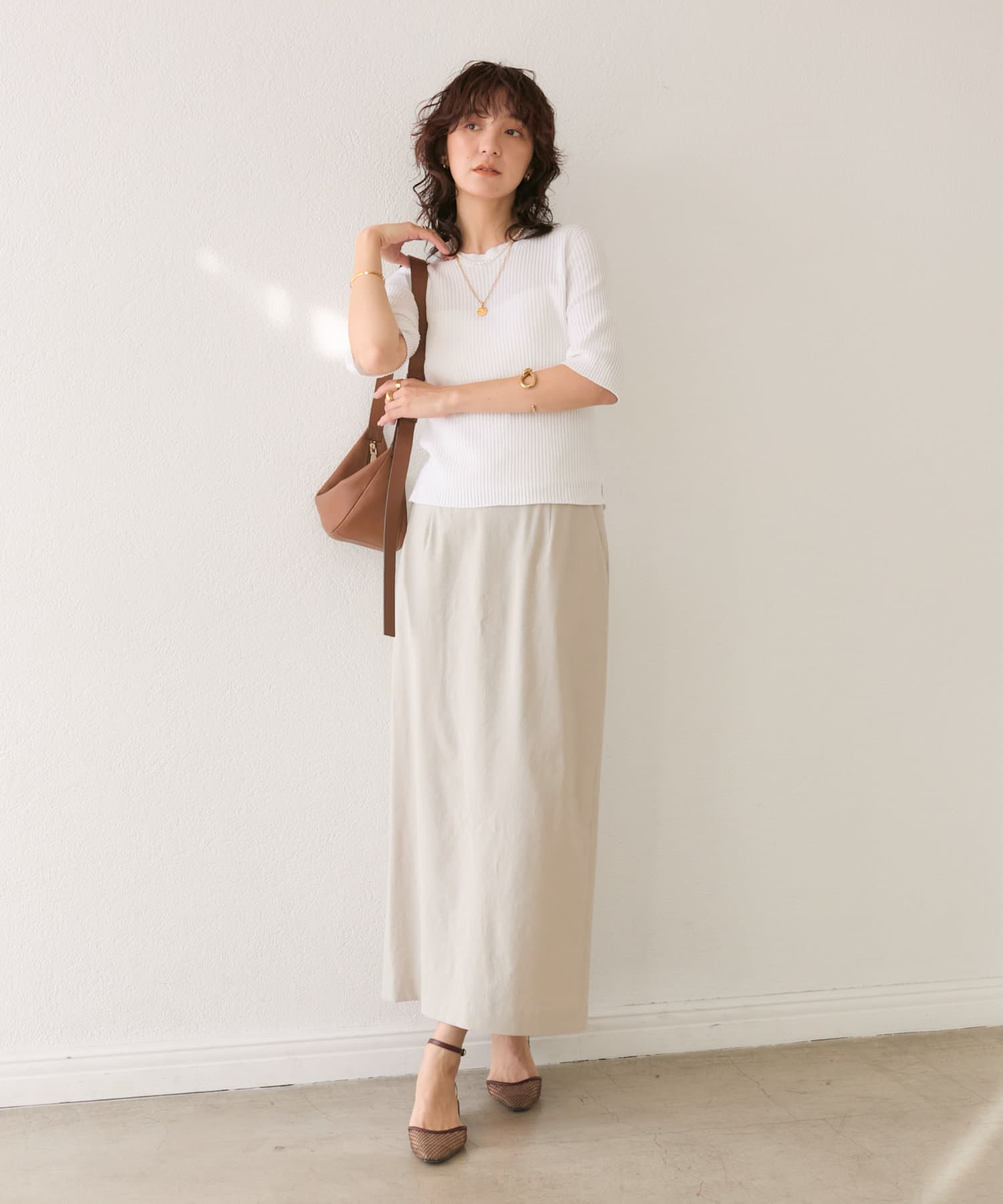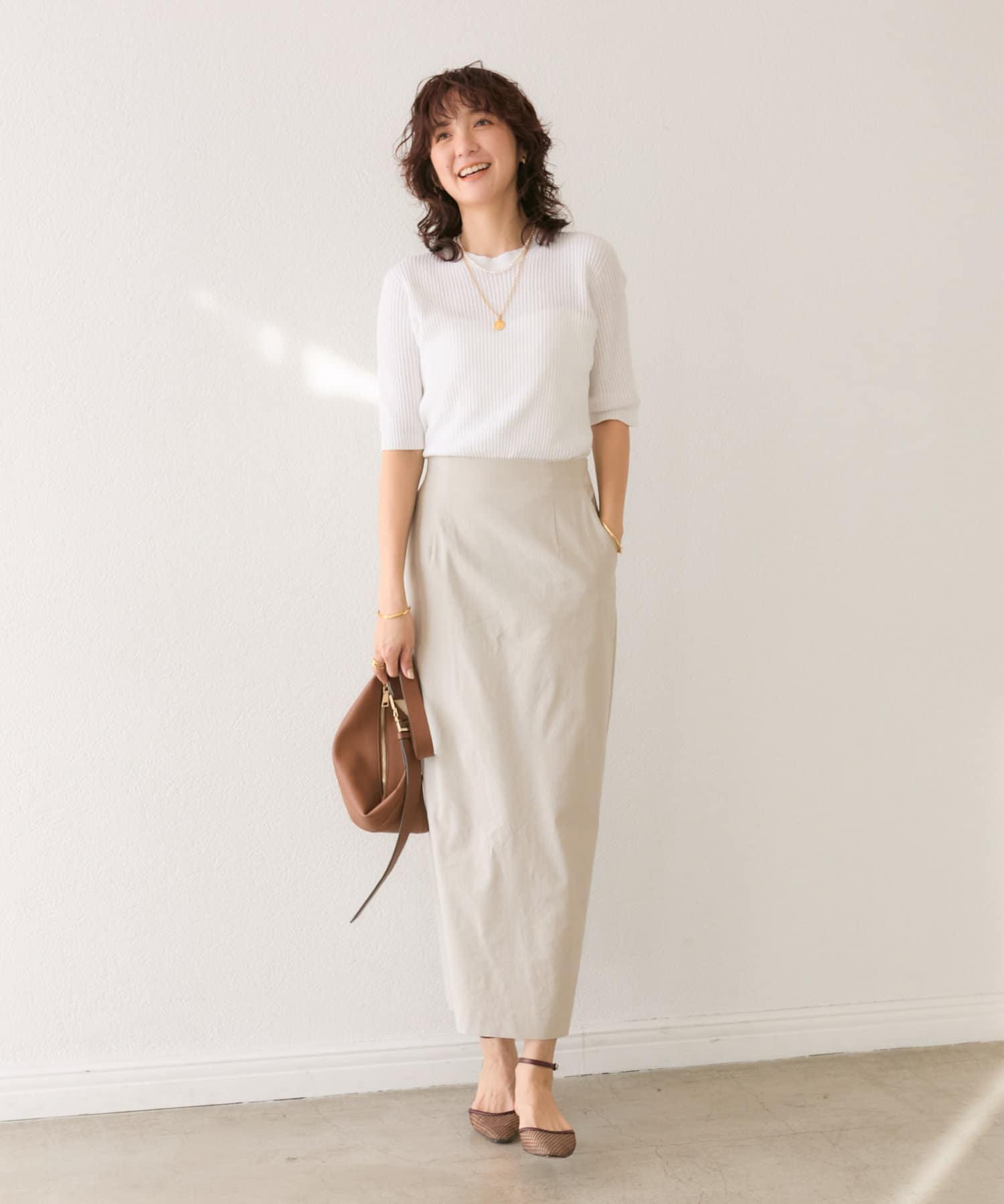 ナチュラルな表情感とカジュアルさが特徴的なストレッチ素材を使用したIラインスカート。