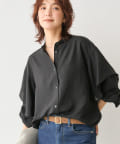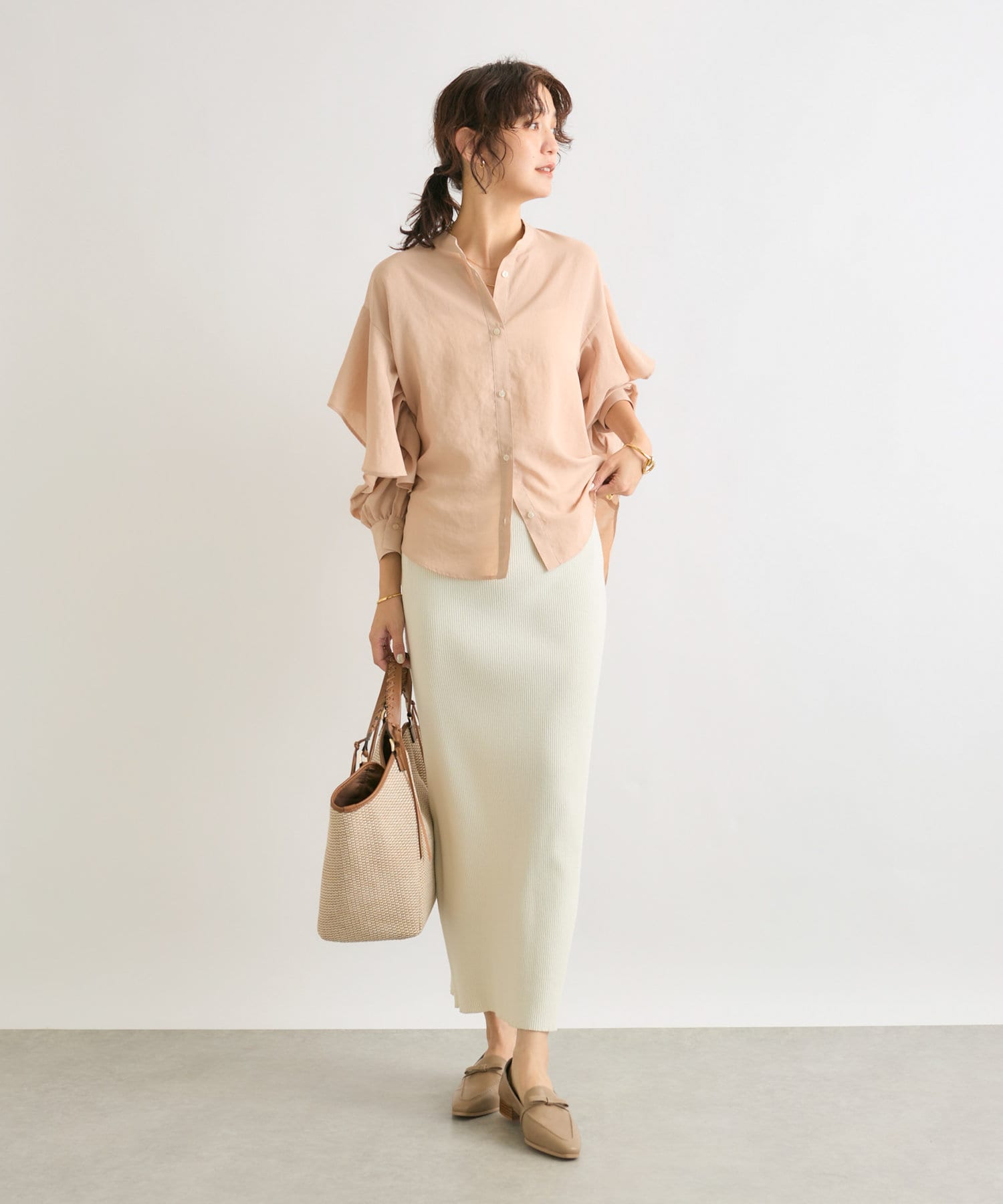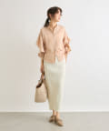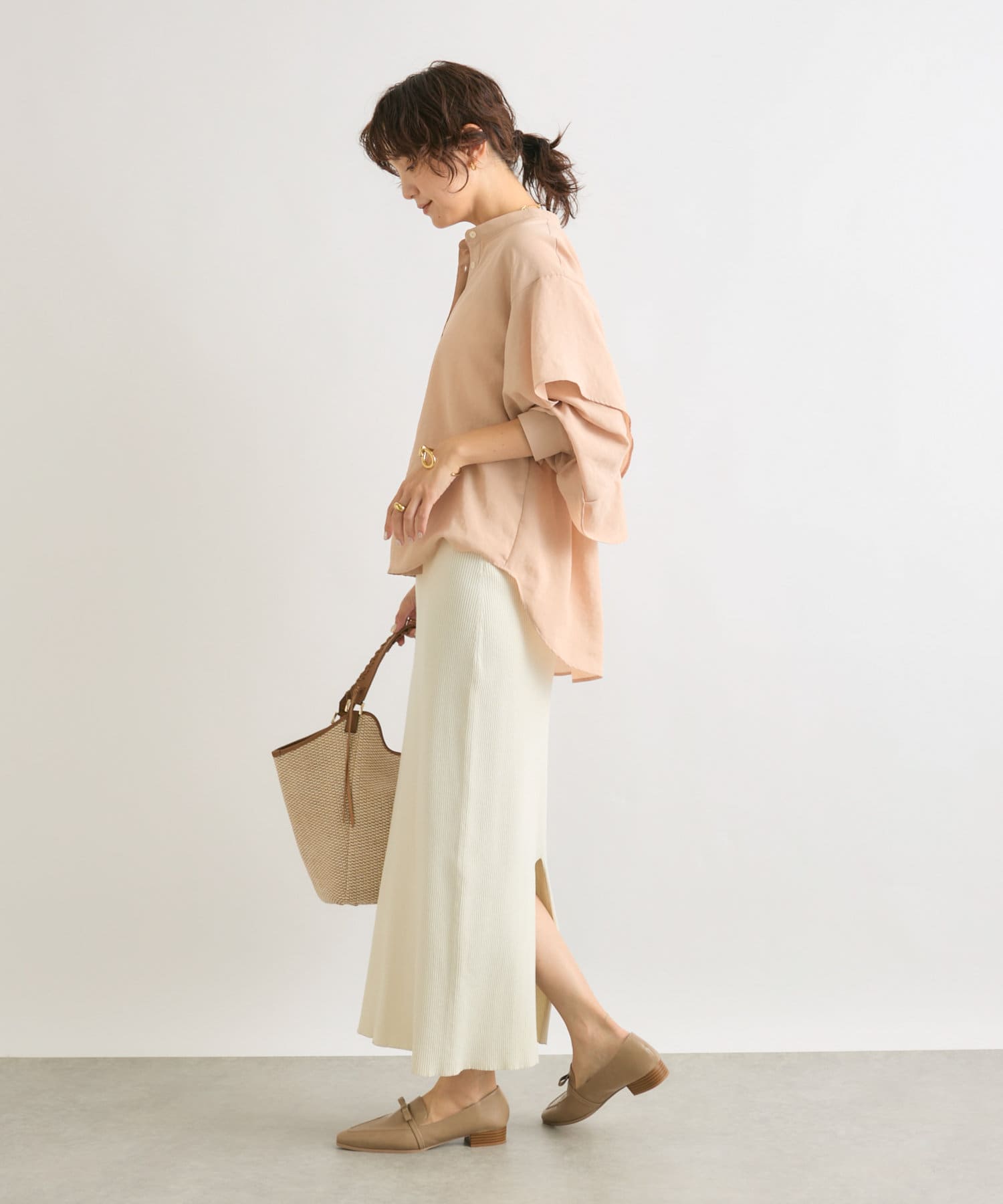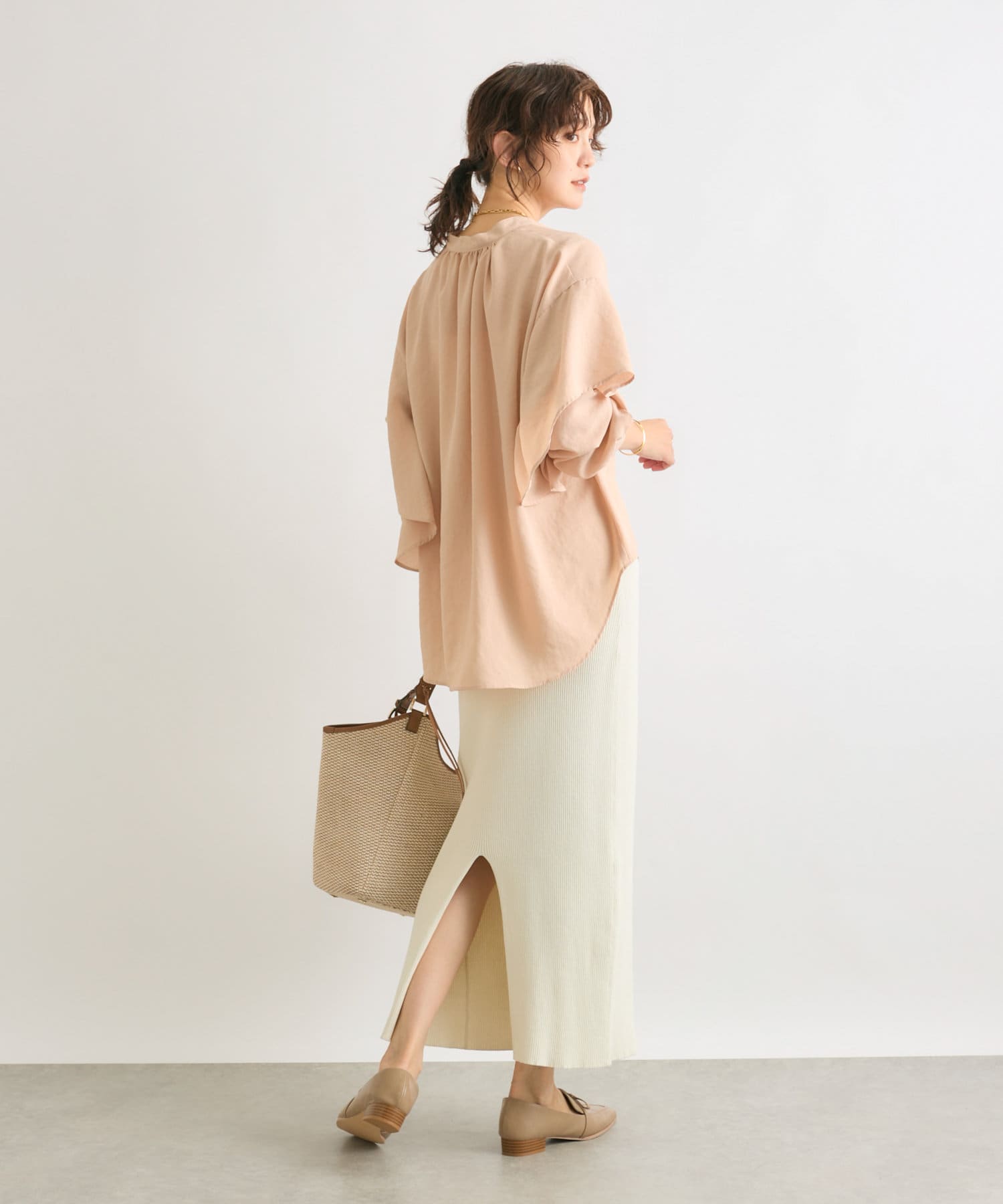 ゆったりとした身幅で着やすく、腰回りもカバーしてくれる着丈で、インせずタイトスカートに合わせていただくのも素敵です。