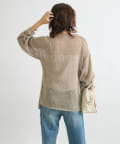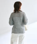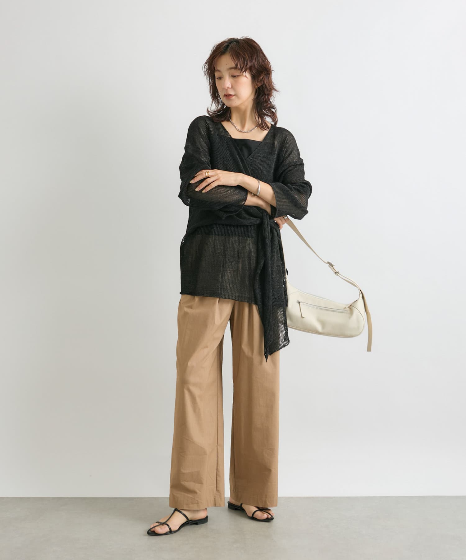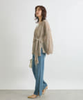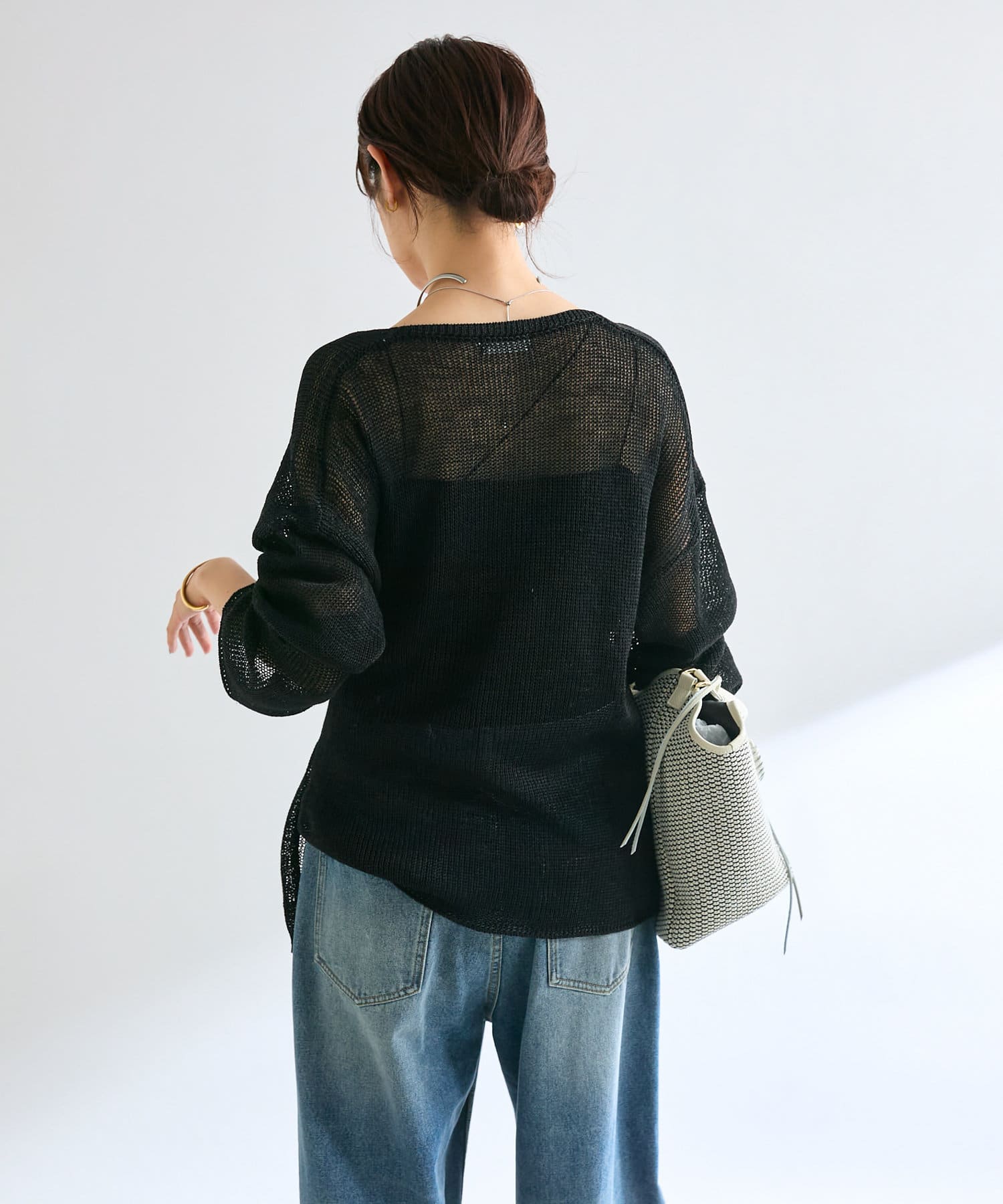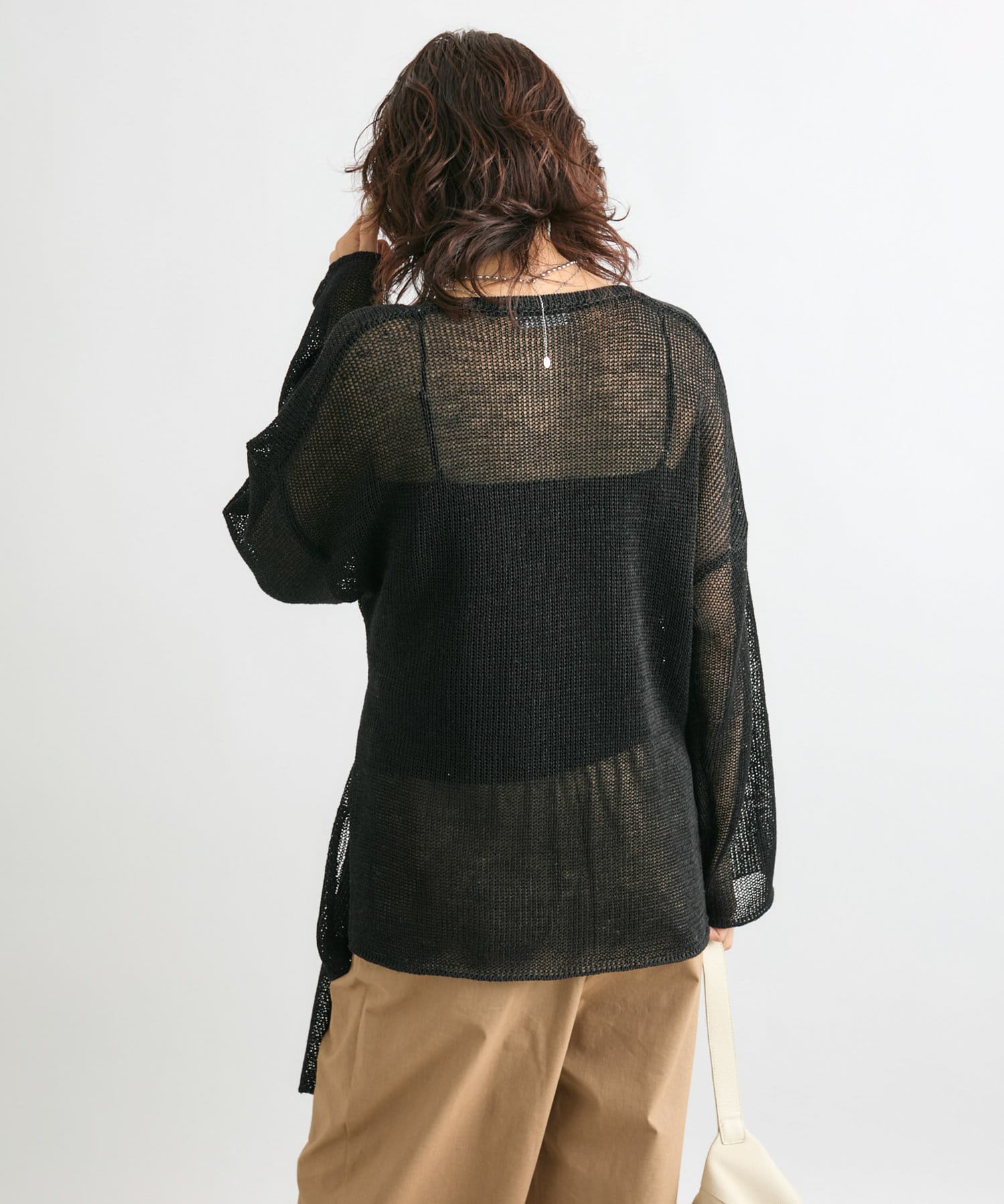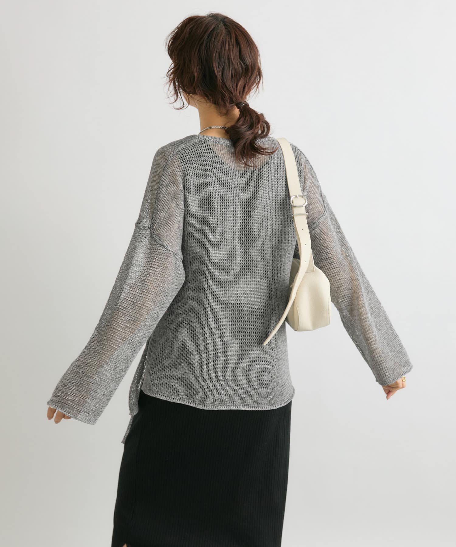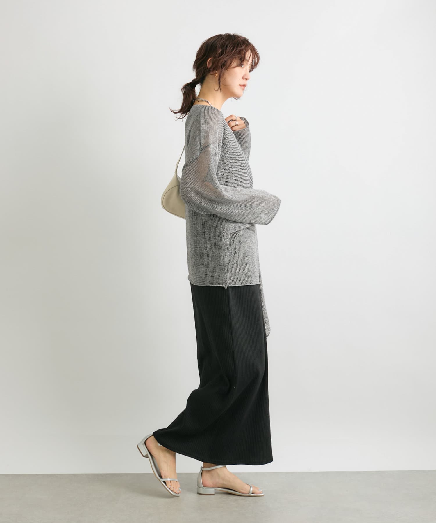 アシンメトリーになった前裾、ルーズな袖、ざっくりした透け感のある編地などもユルっとこなれたムードを演出。