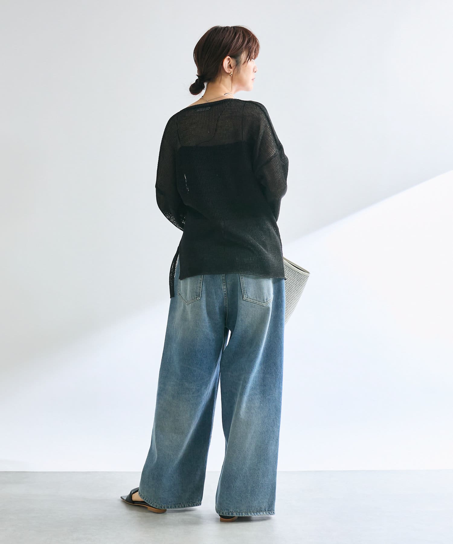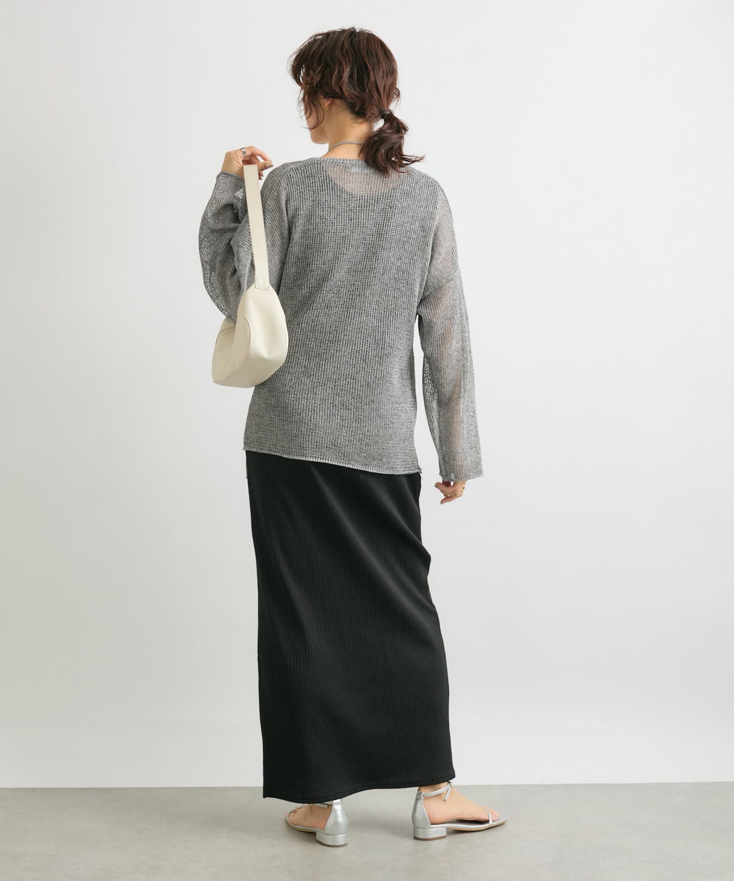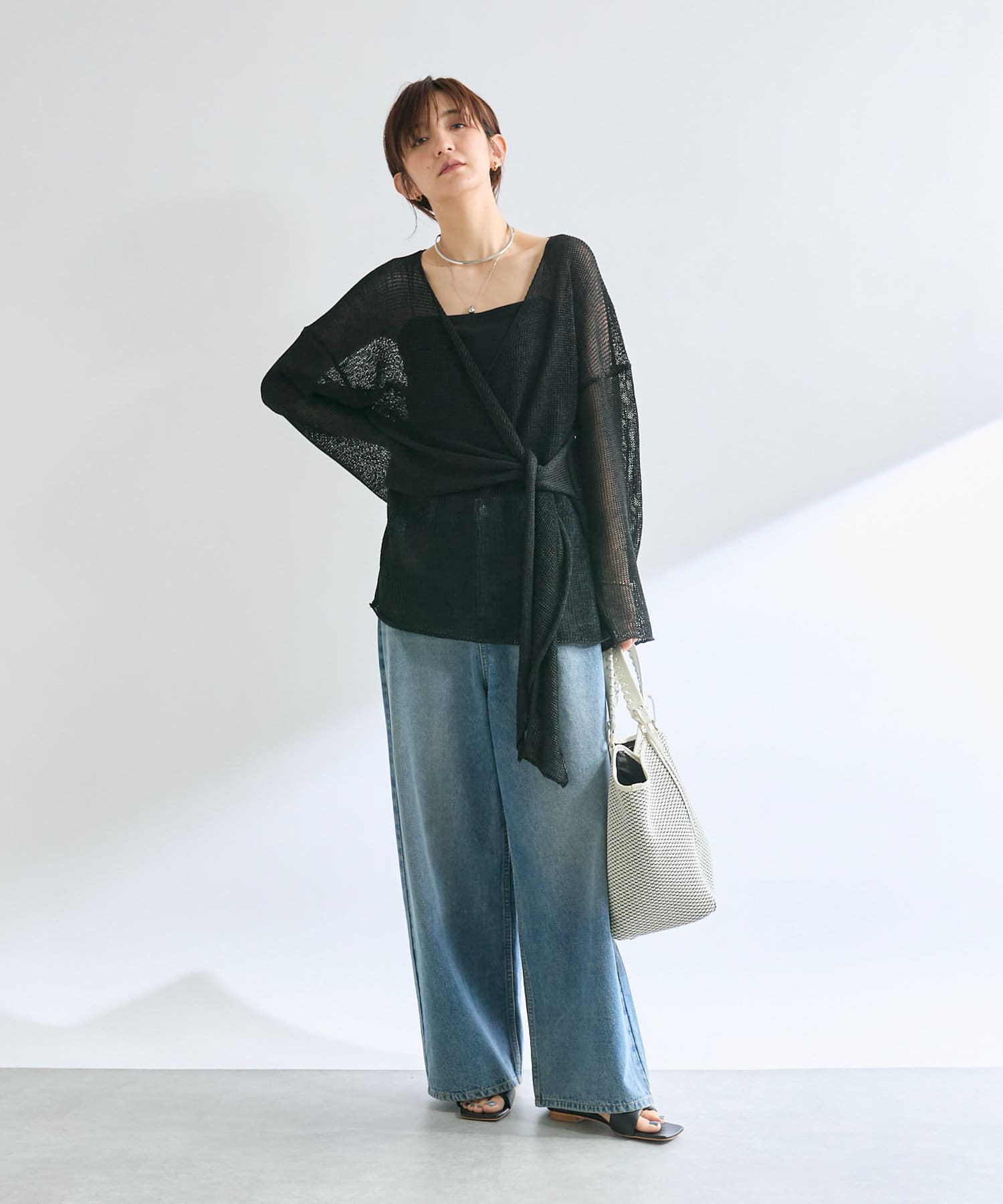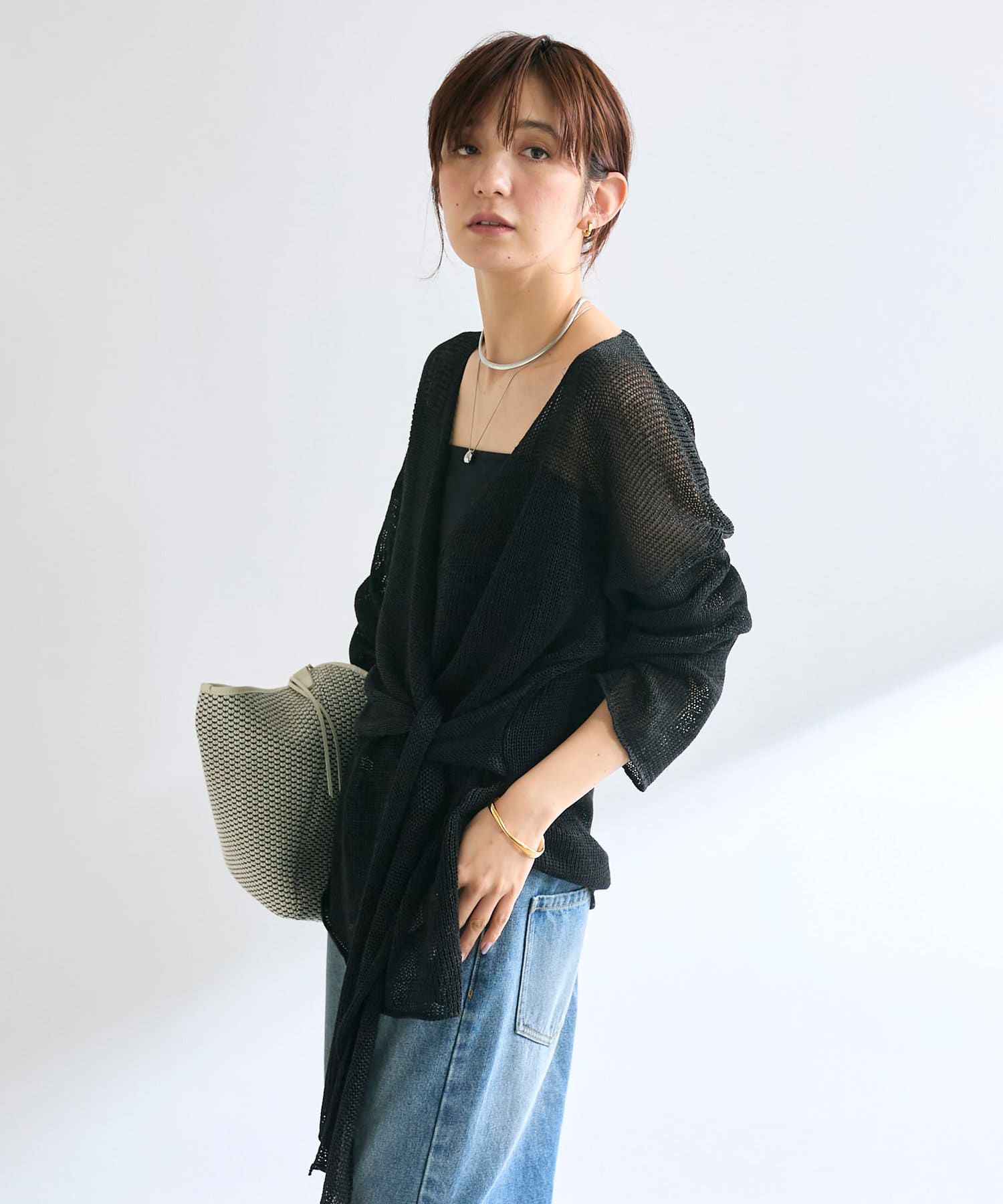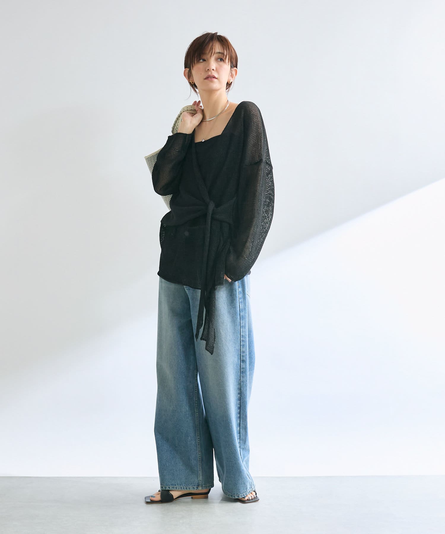 アシンメトリーになった前裾、ルーズな袖、ざっくりした透け感のある編地などもユルっとこなれたムードを演出。