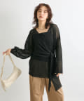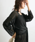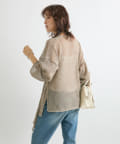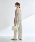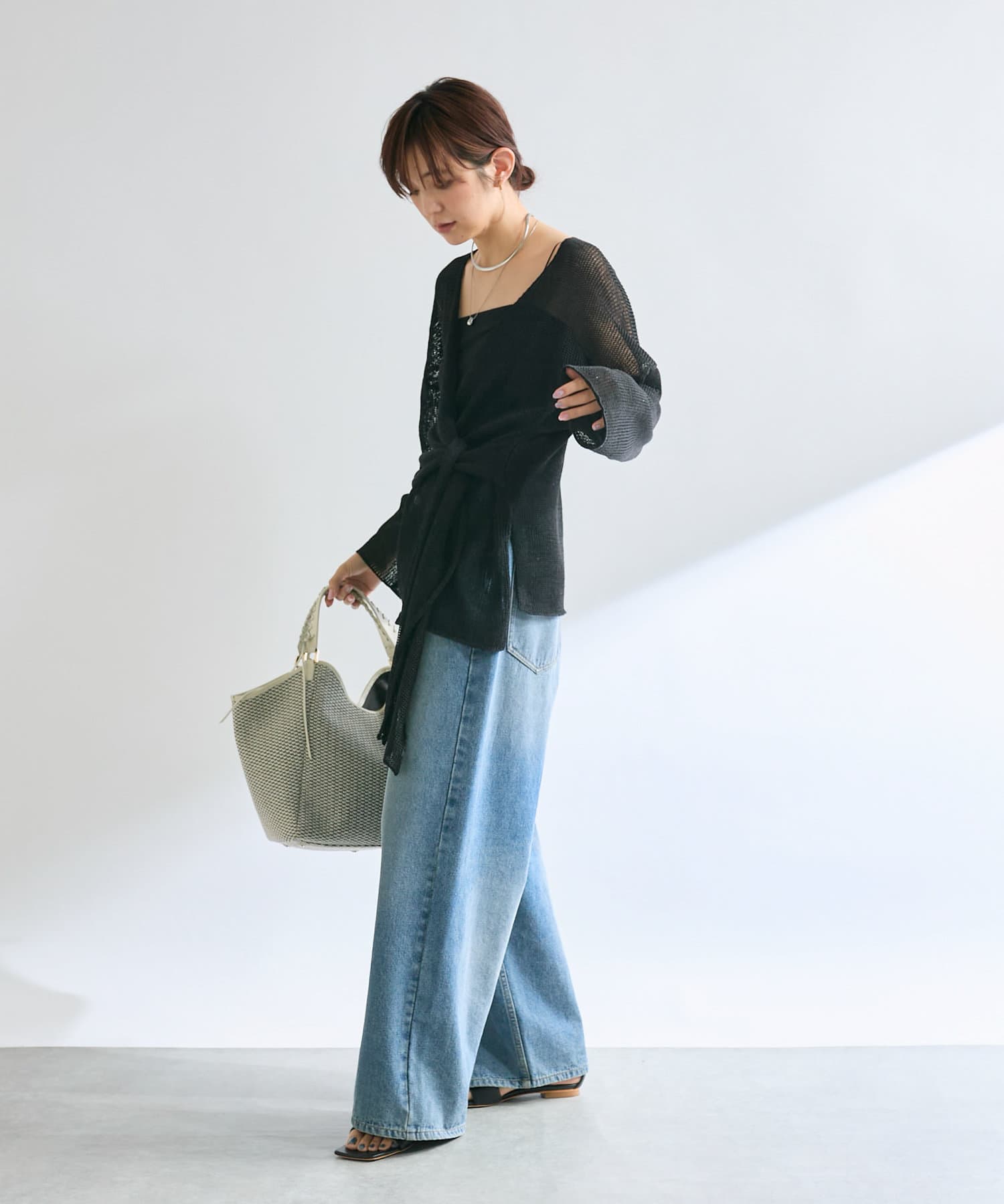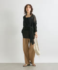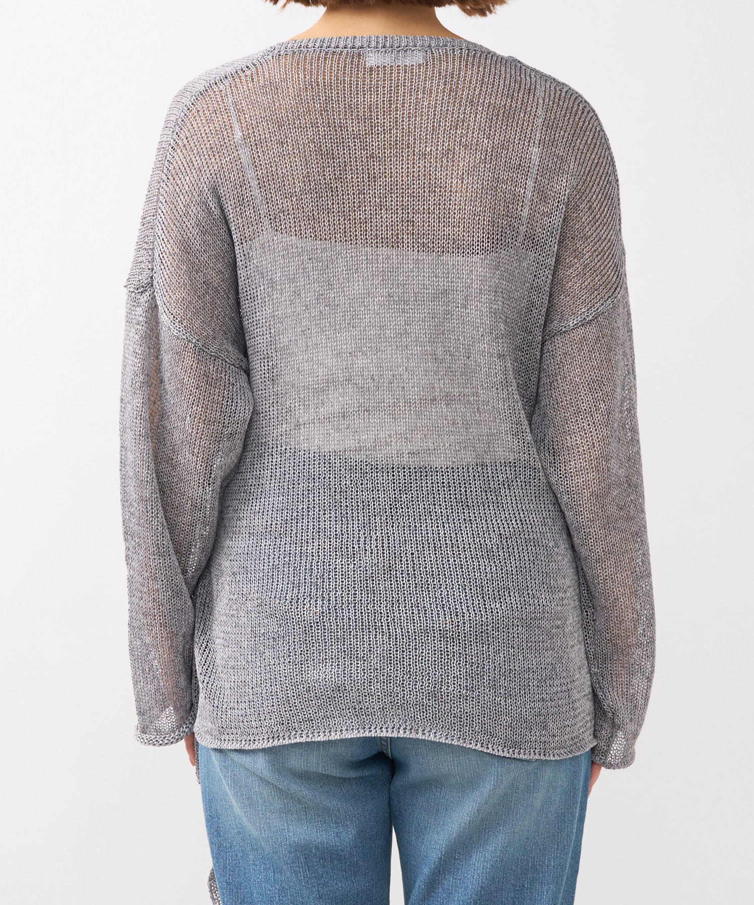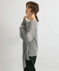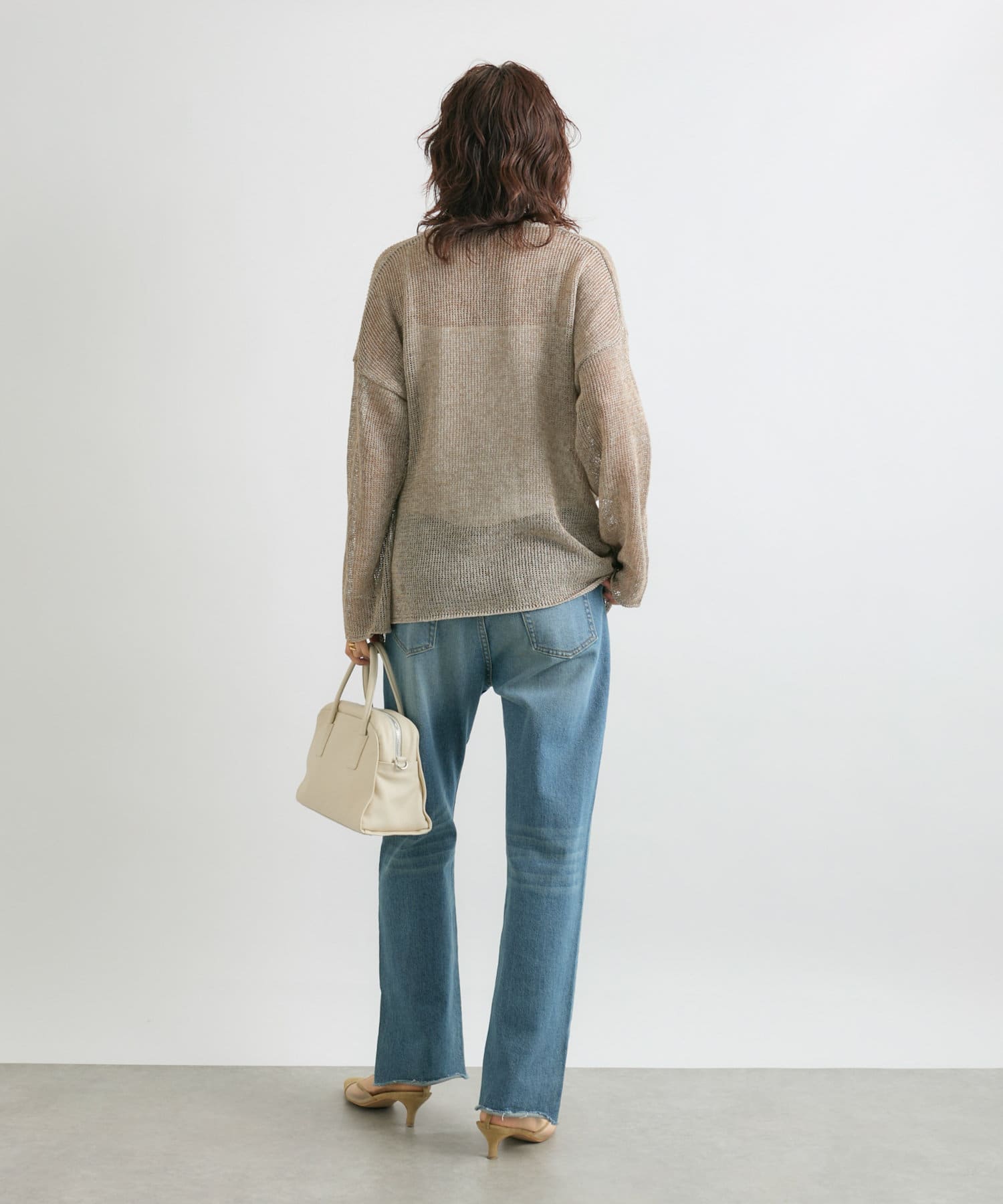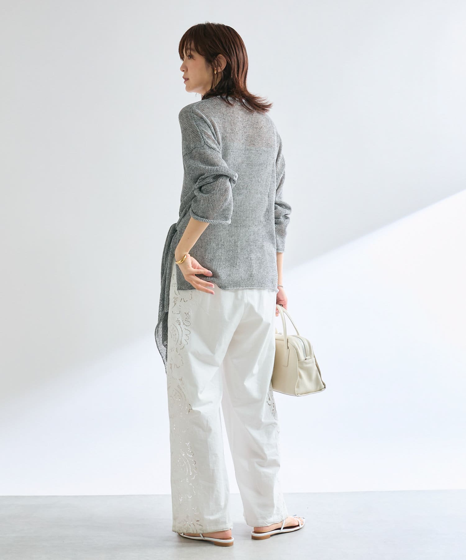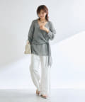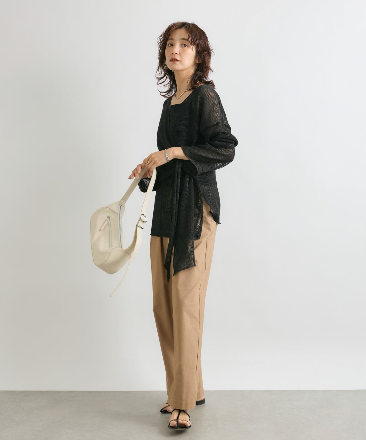 アシンメトリーになった前裾、ルーズな袖、ざっくりした透け感のある編地などもユルっとこなれたムードを演出。