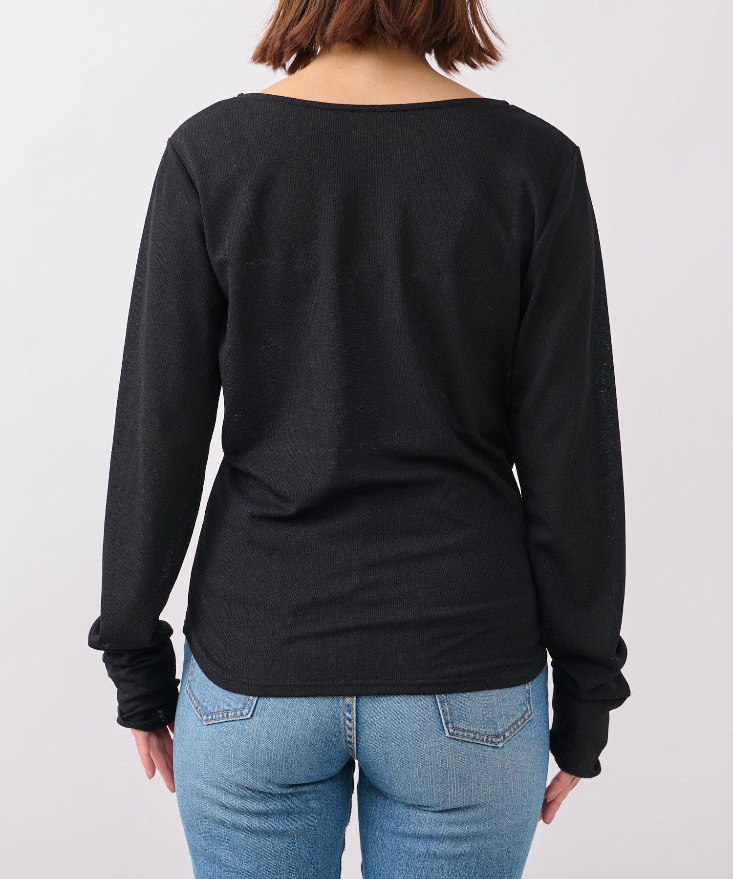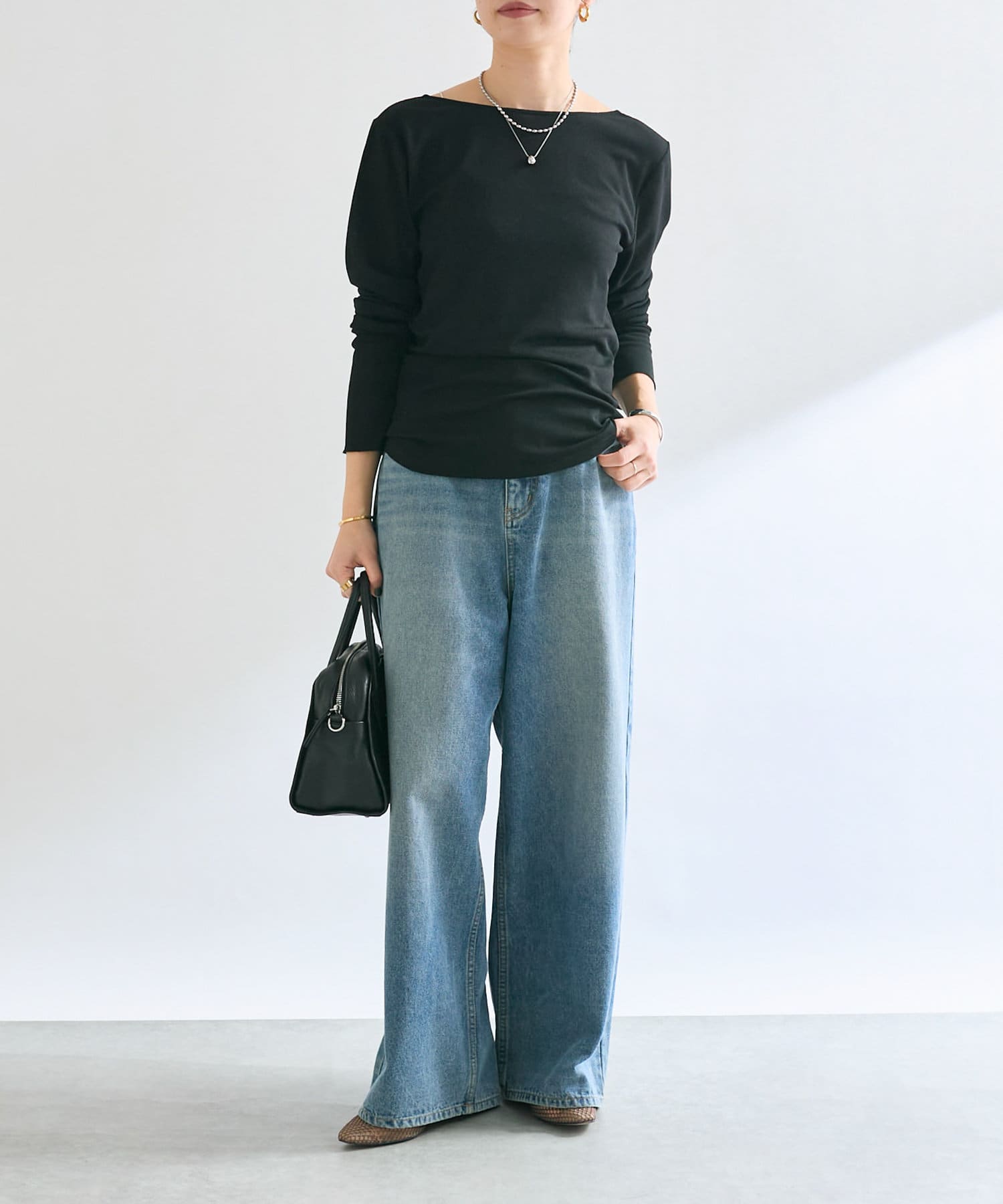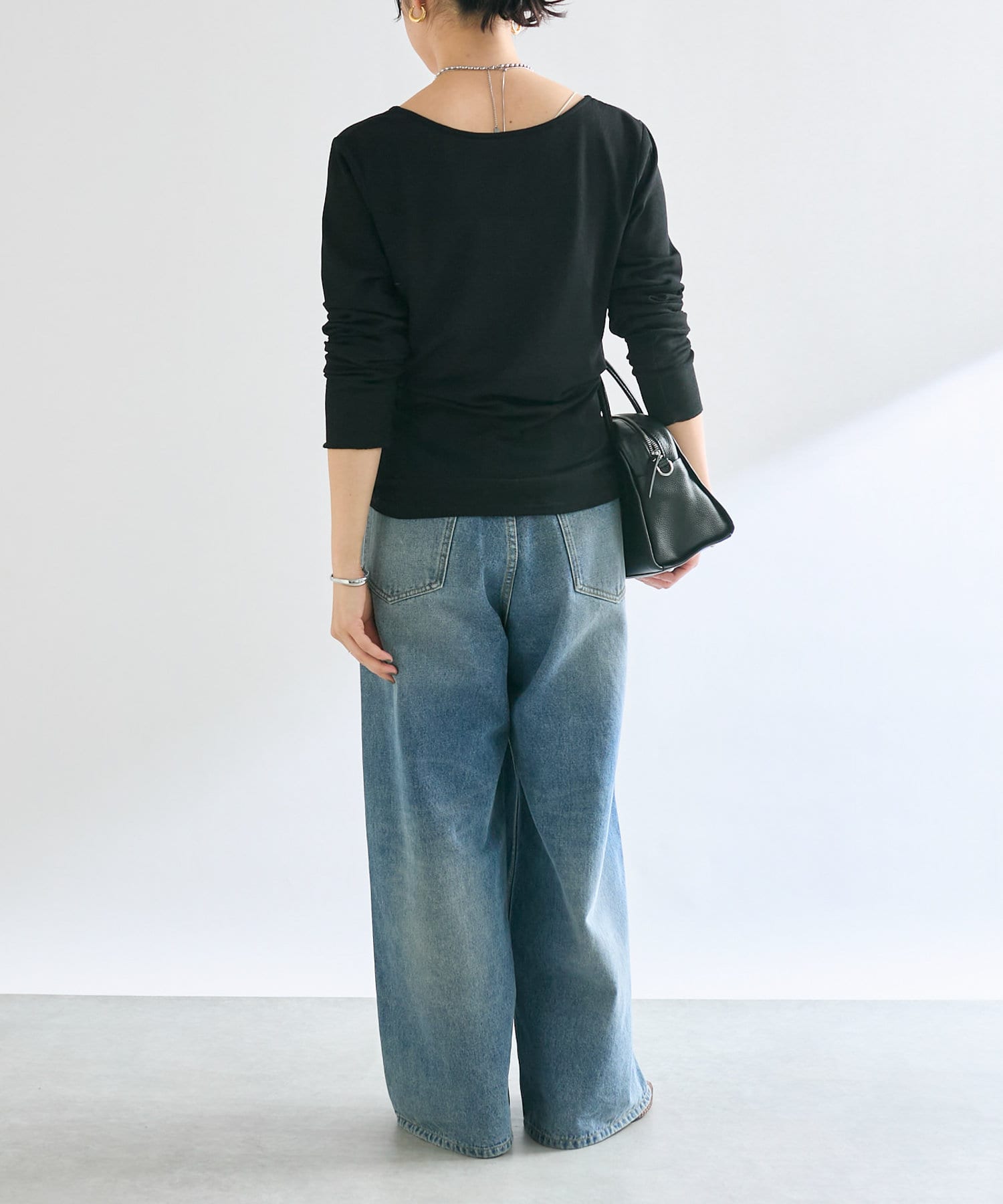 インナーにはスクエアタイプのキャミソールなどを合わせて、すっきりと着ていただいたり、クルーネックで少しカジュアルな着こなしもおすすめです。