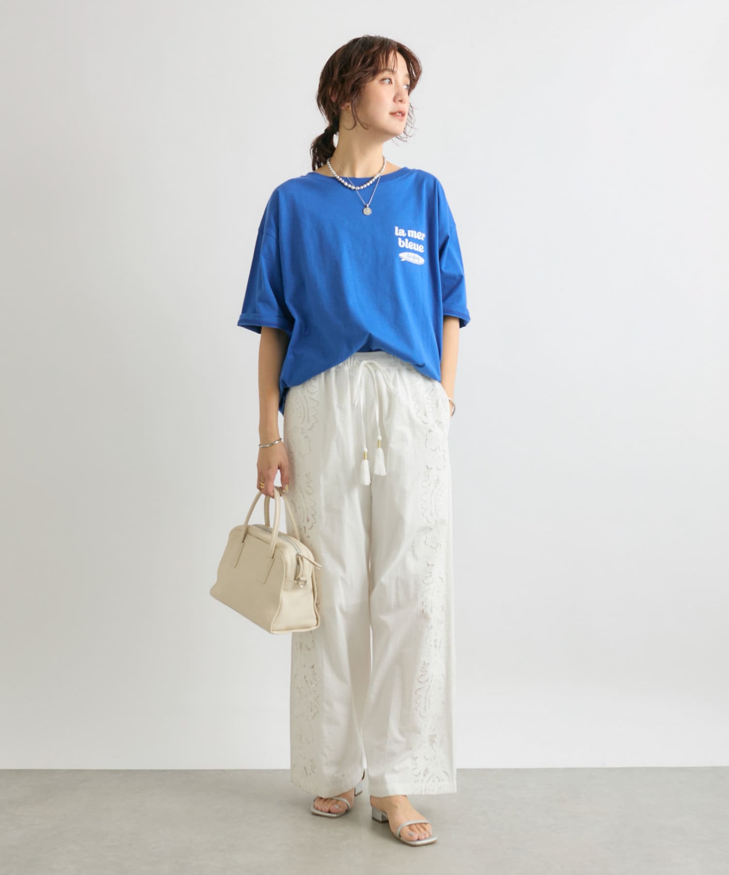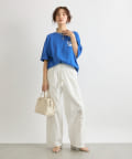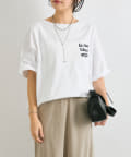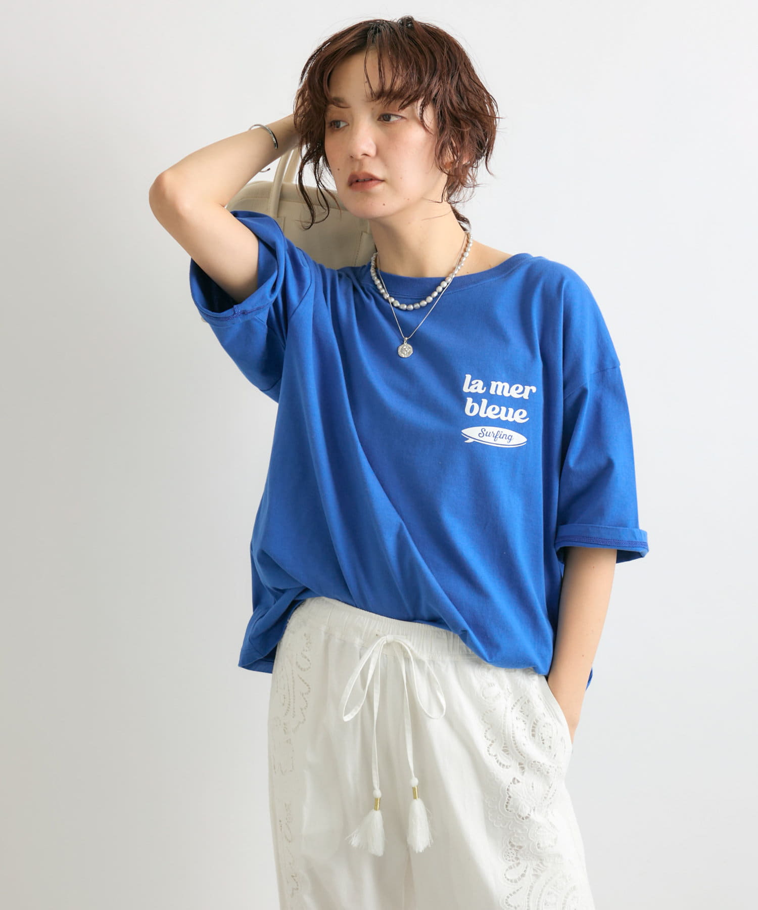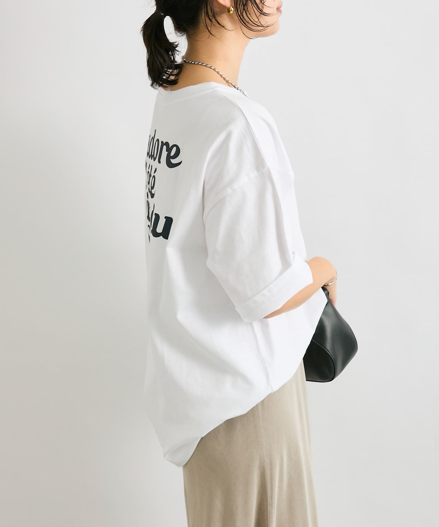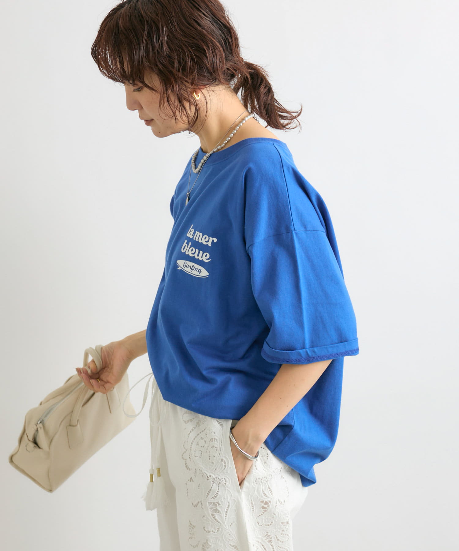 袖をたくし上げたヘルシーな着こなしもサマになる、女性らしさを引き立ててくれるTシャツです。