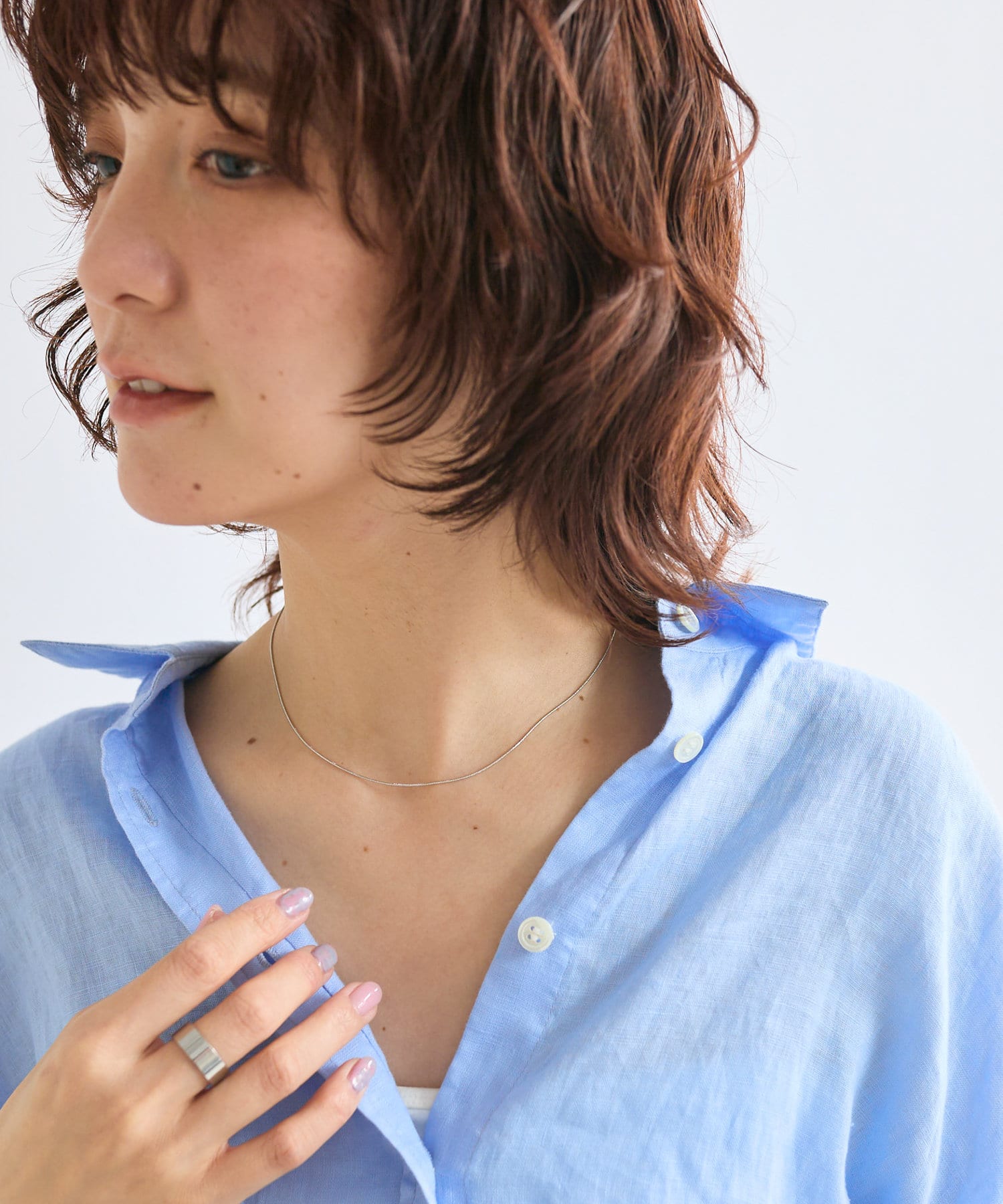 シンプルなチェーンでさりげなく華やかな印象に。