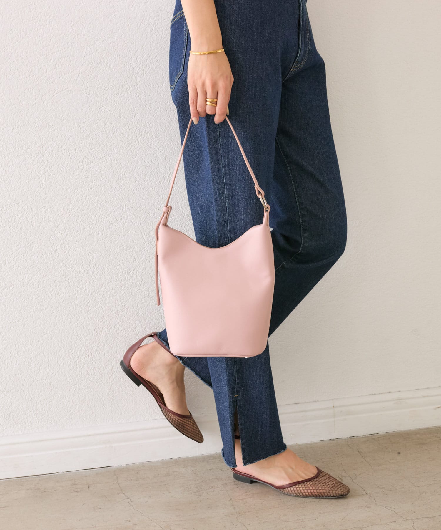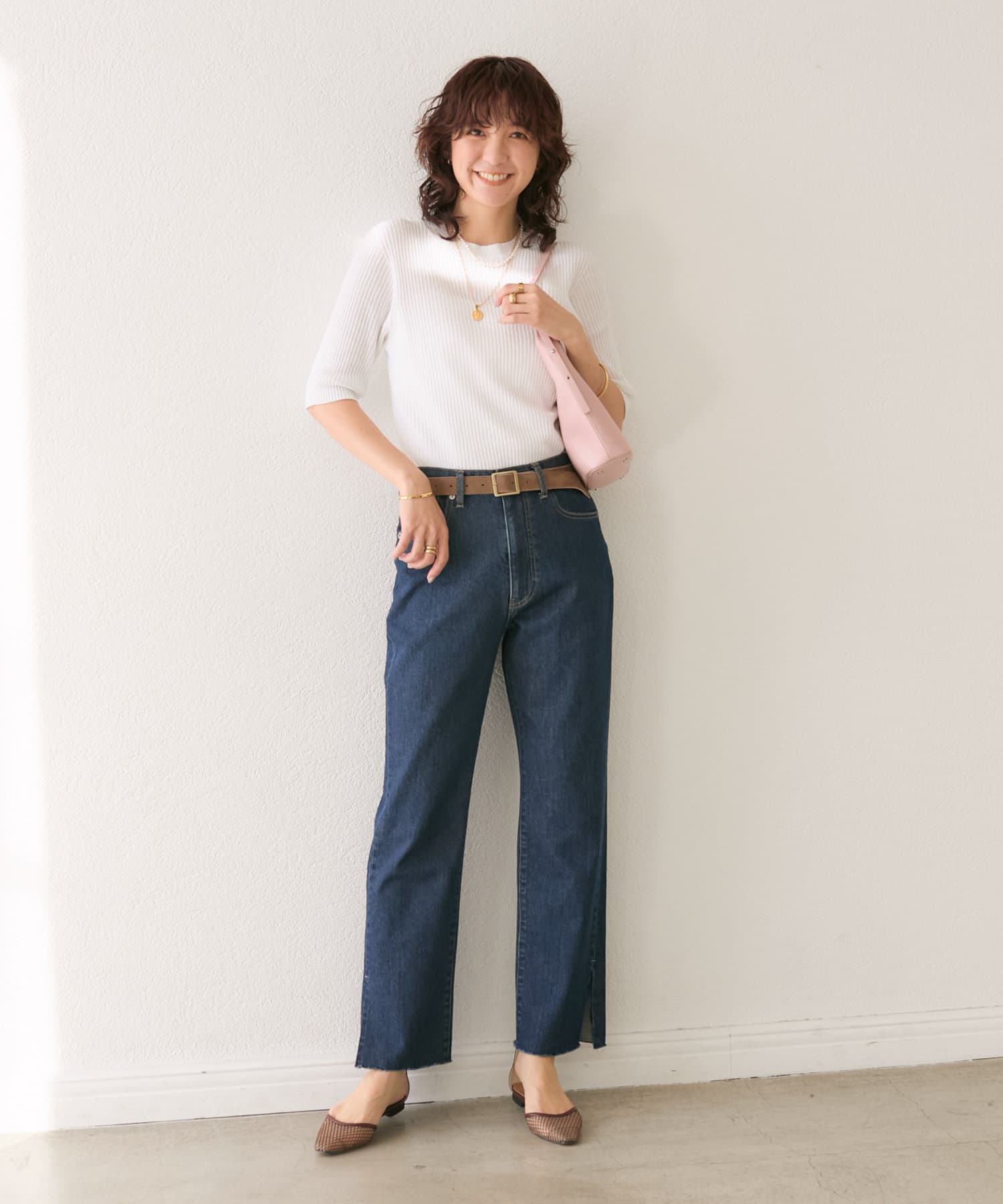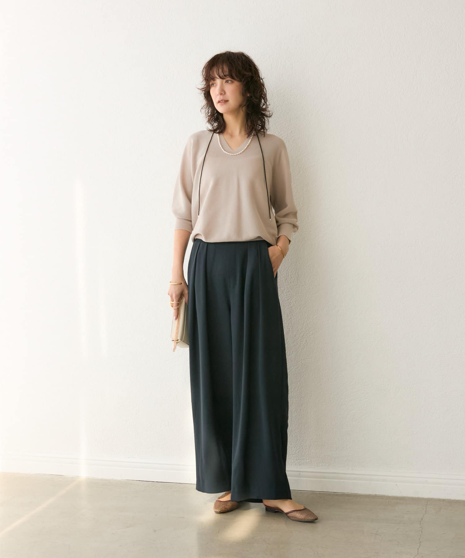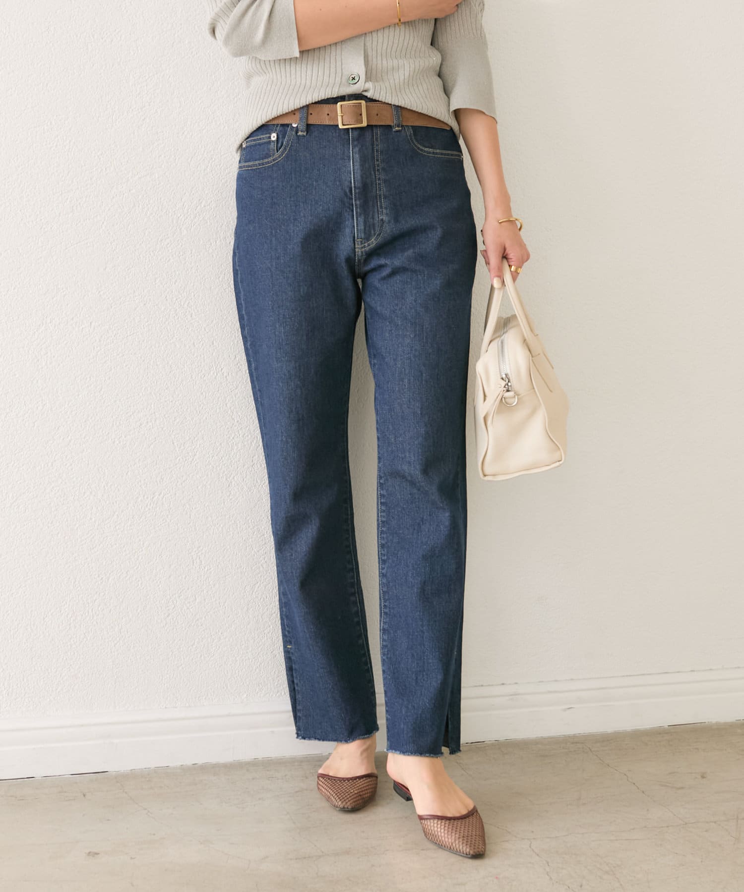• 抜け感のあるシルエットなので、足元をスッキリキレイに見せ、軽めの素材感で夏まで着用可能。
