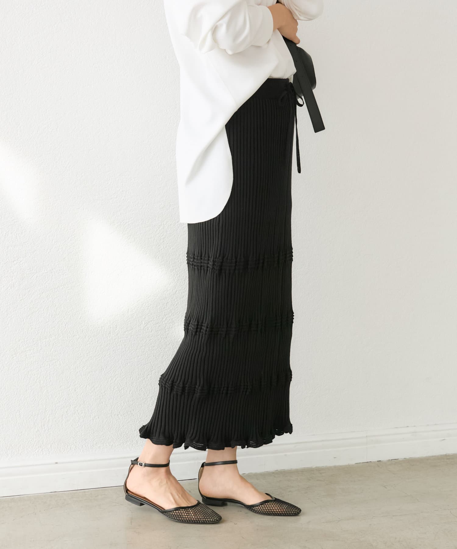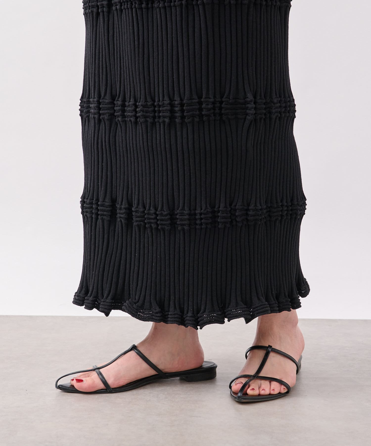 ポコポコとした立体感やフリルの様な編み地がポイントのストレッチリブスカート。