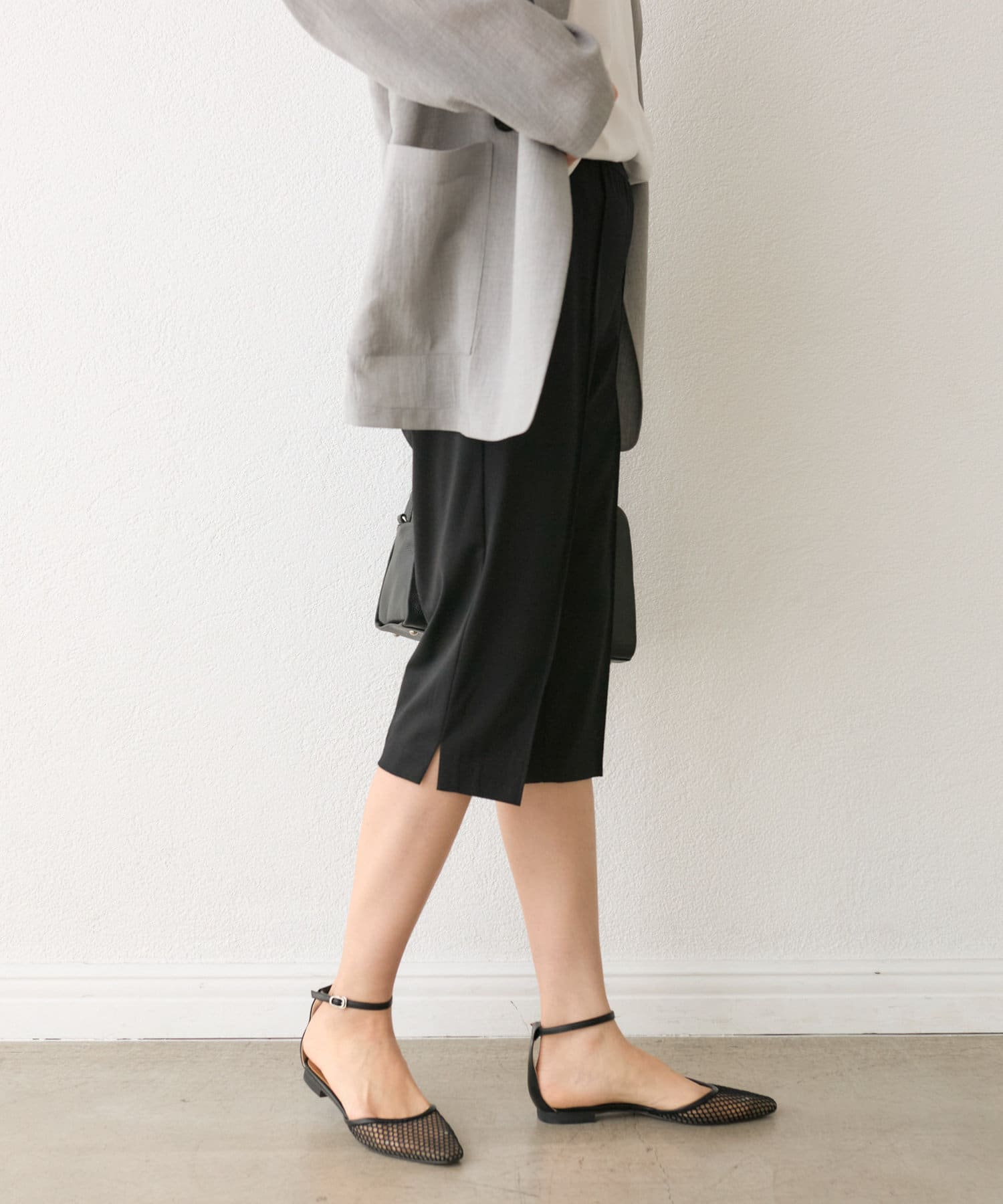ウエストはゴムで履きやすくし、サイドに入ったスリットが脚のラインをすっきり見せてくれます。