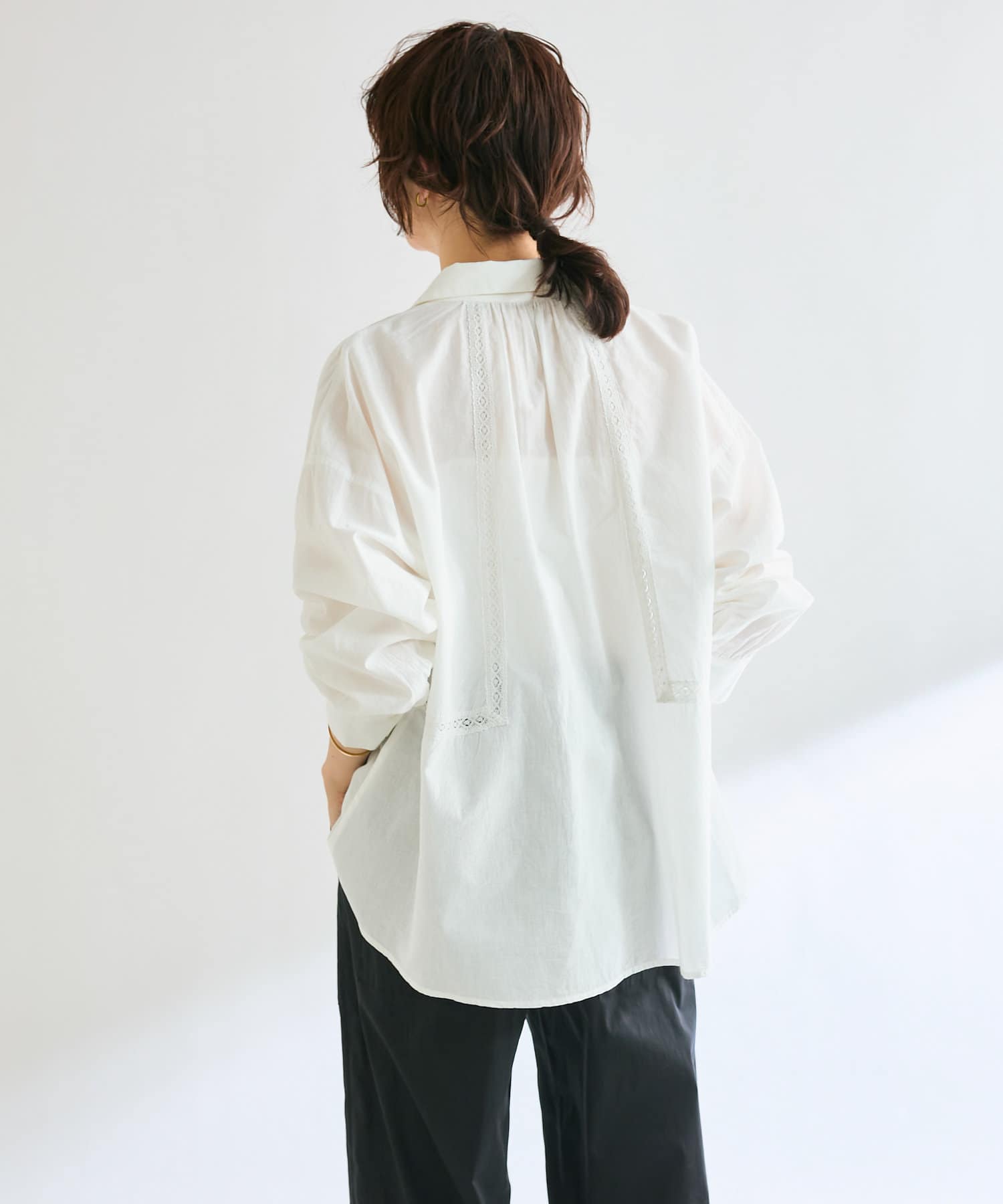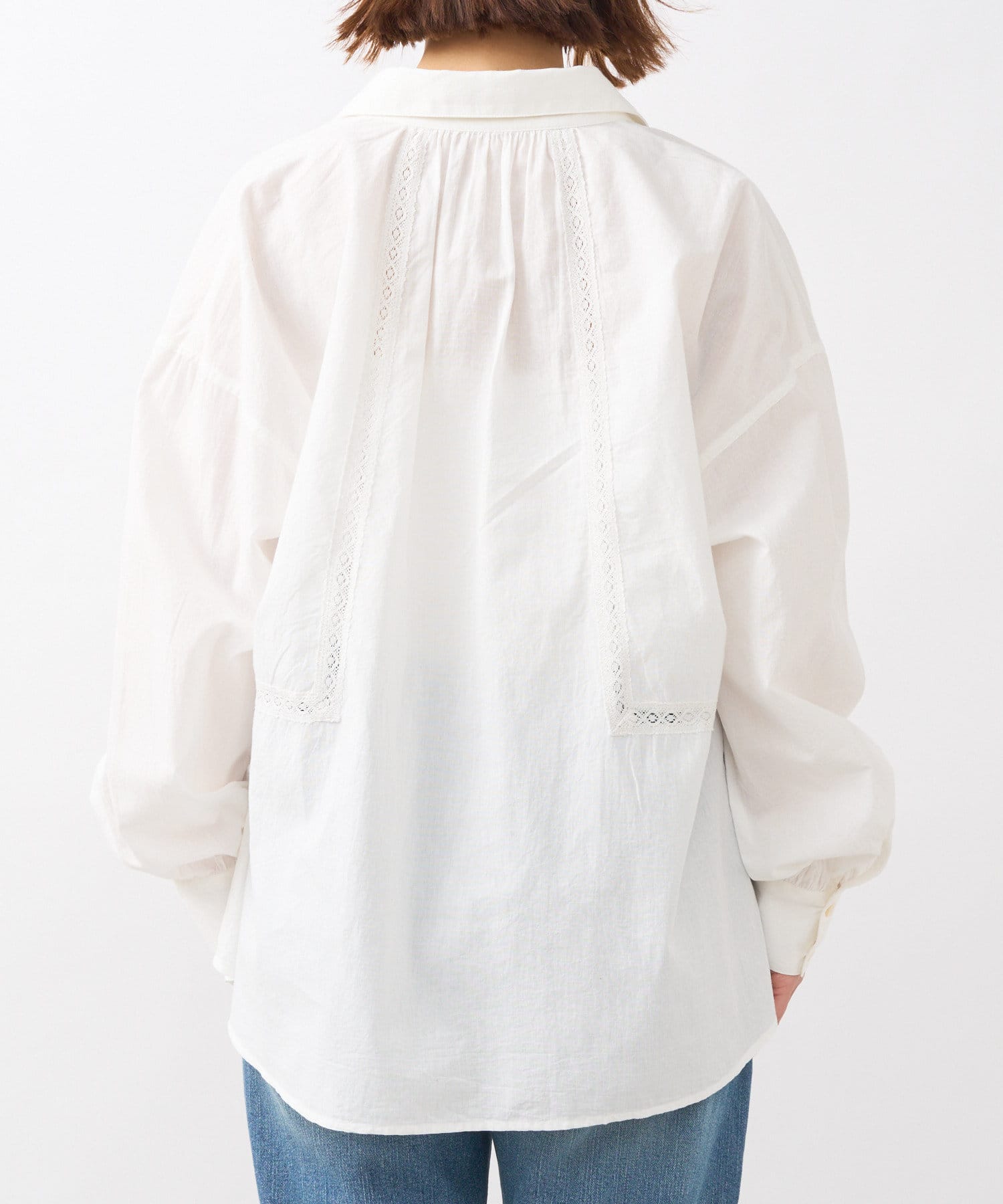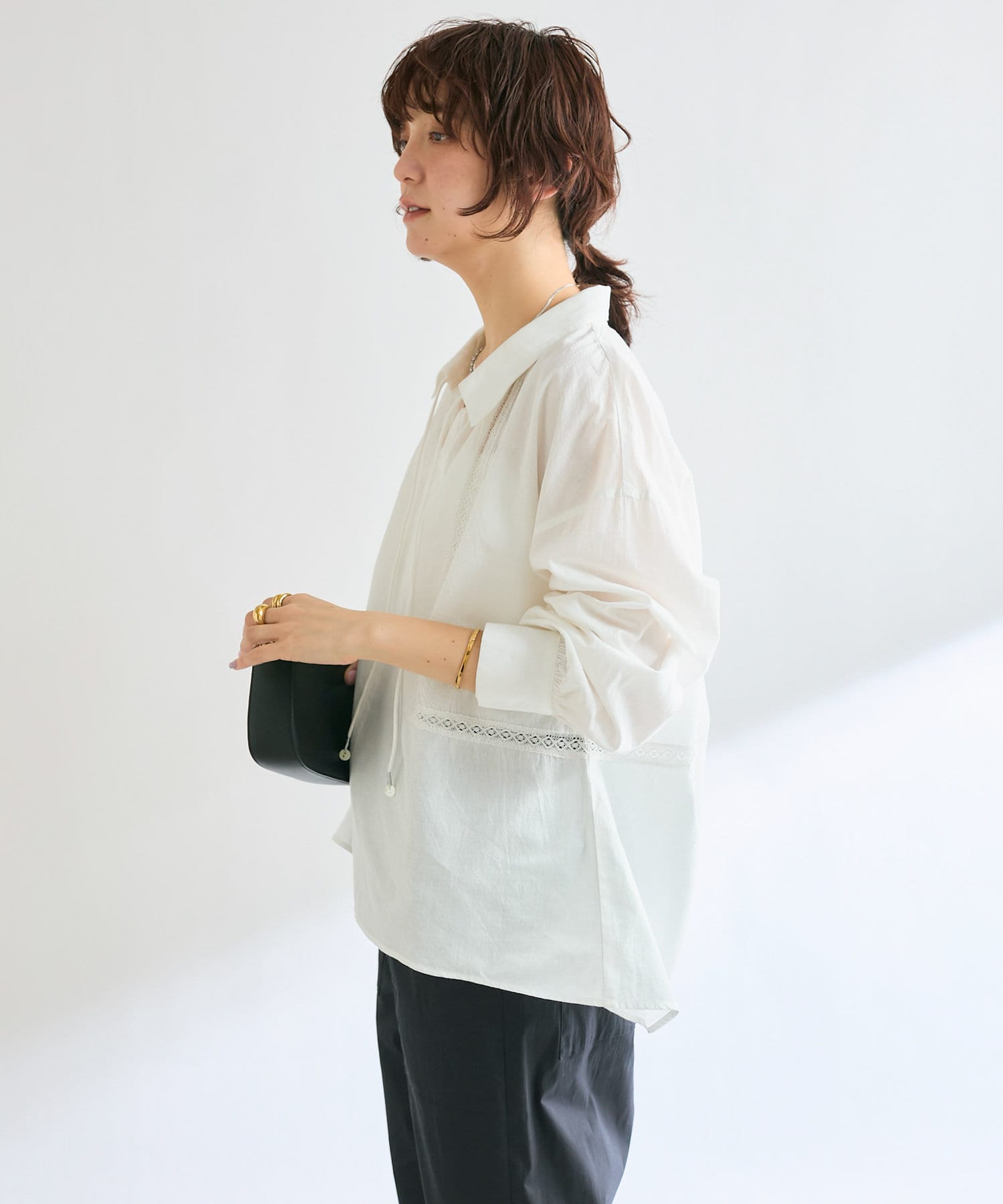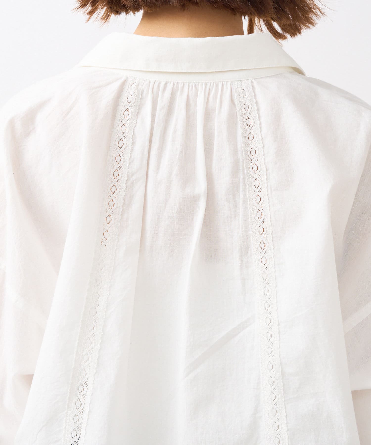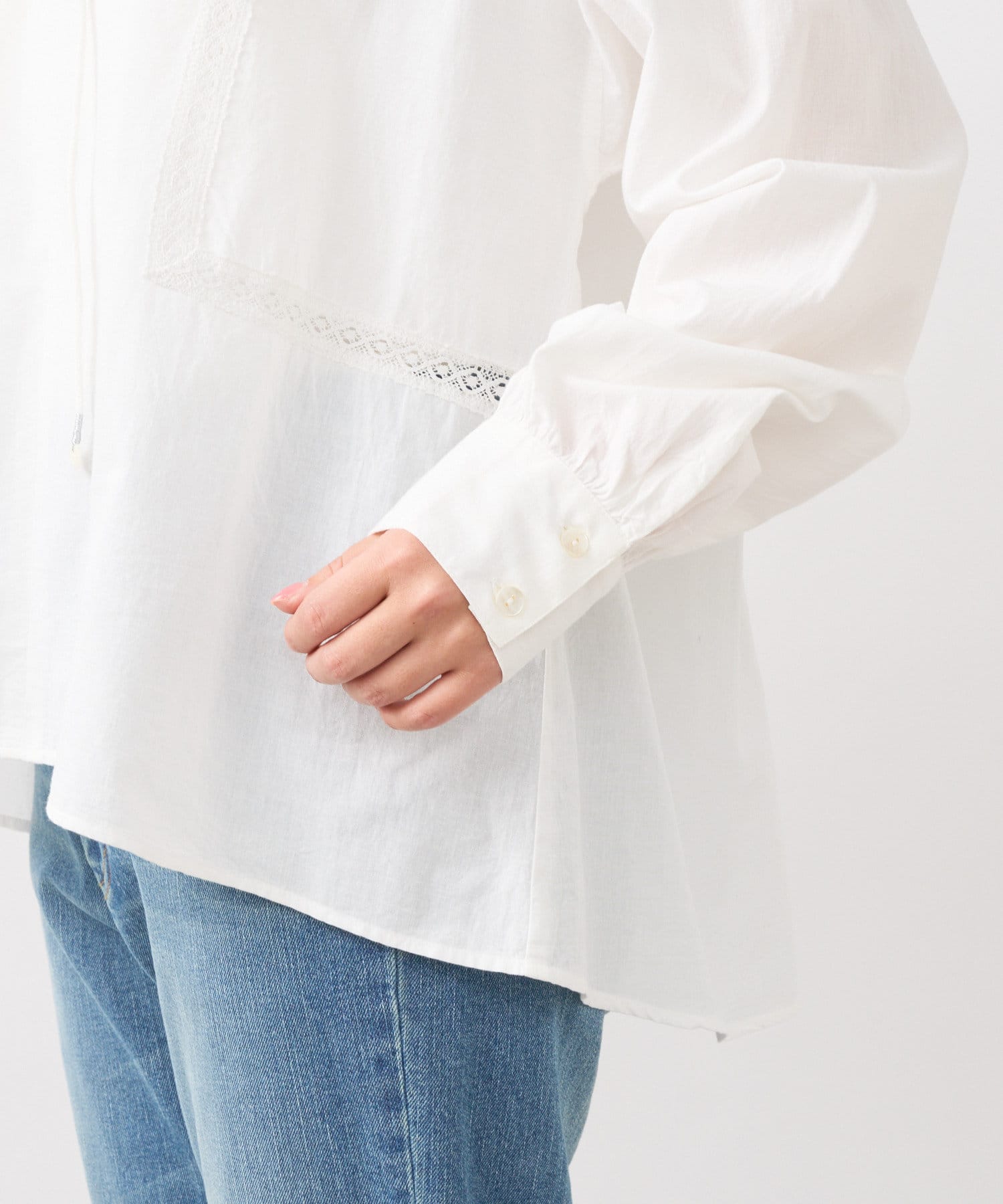 レース切り替えのディテールと首元のスキッパーデザインが印象的なシャツ。