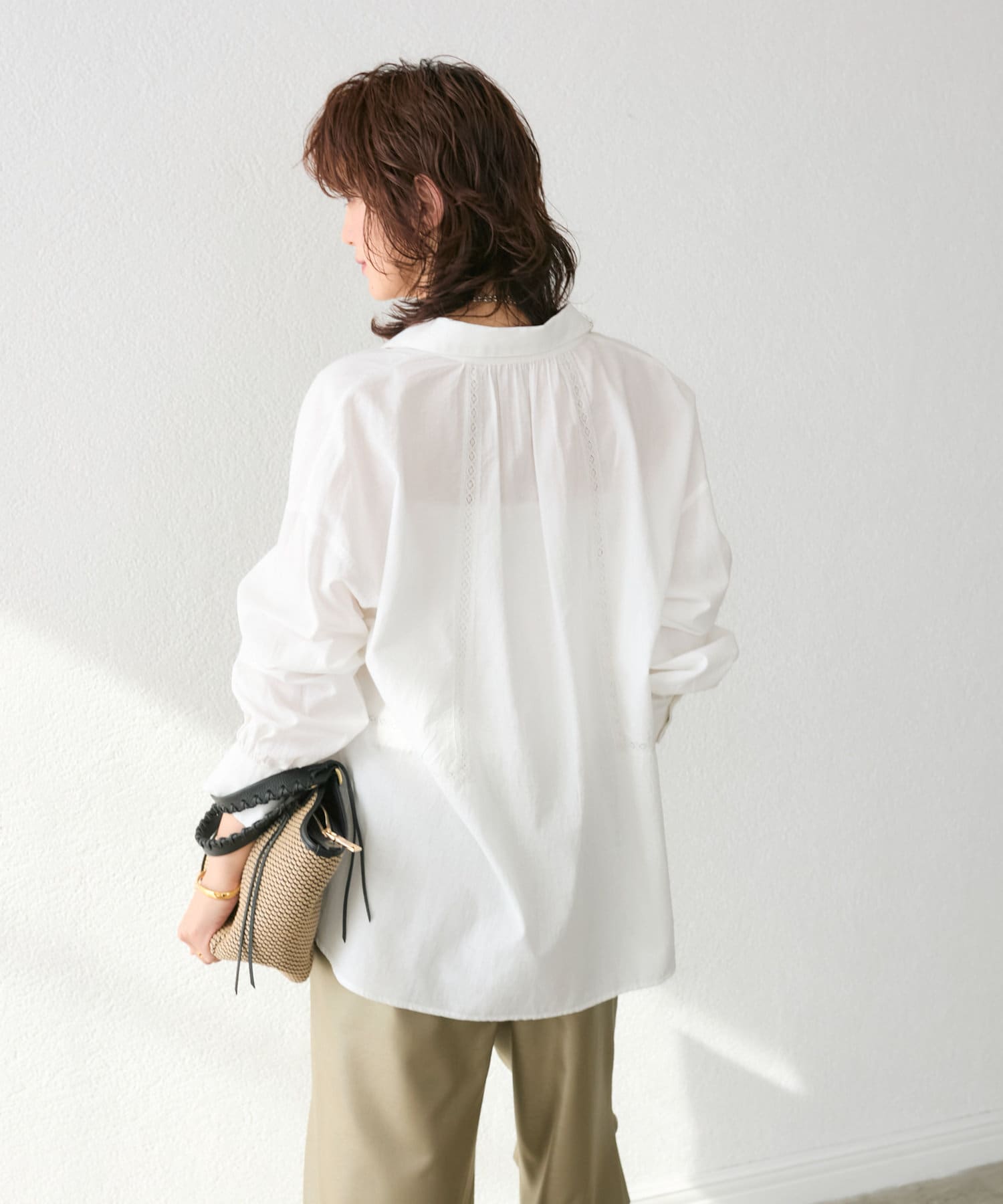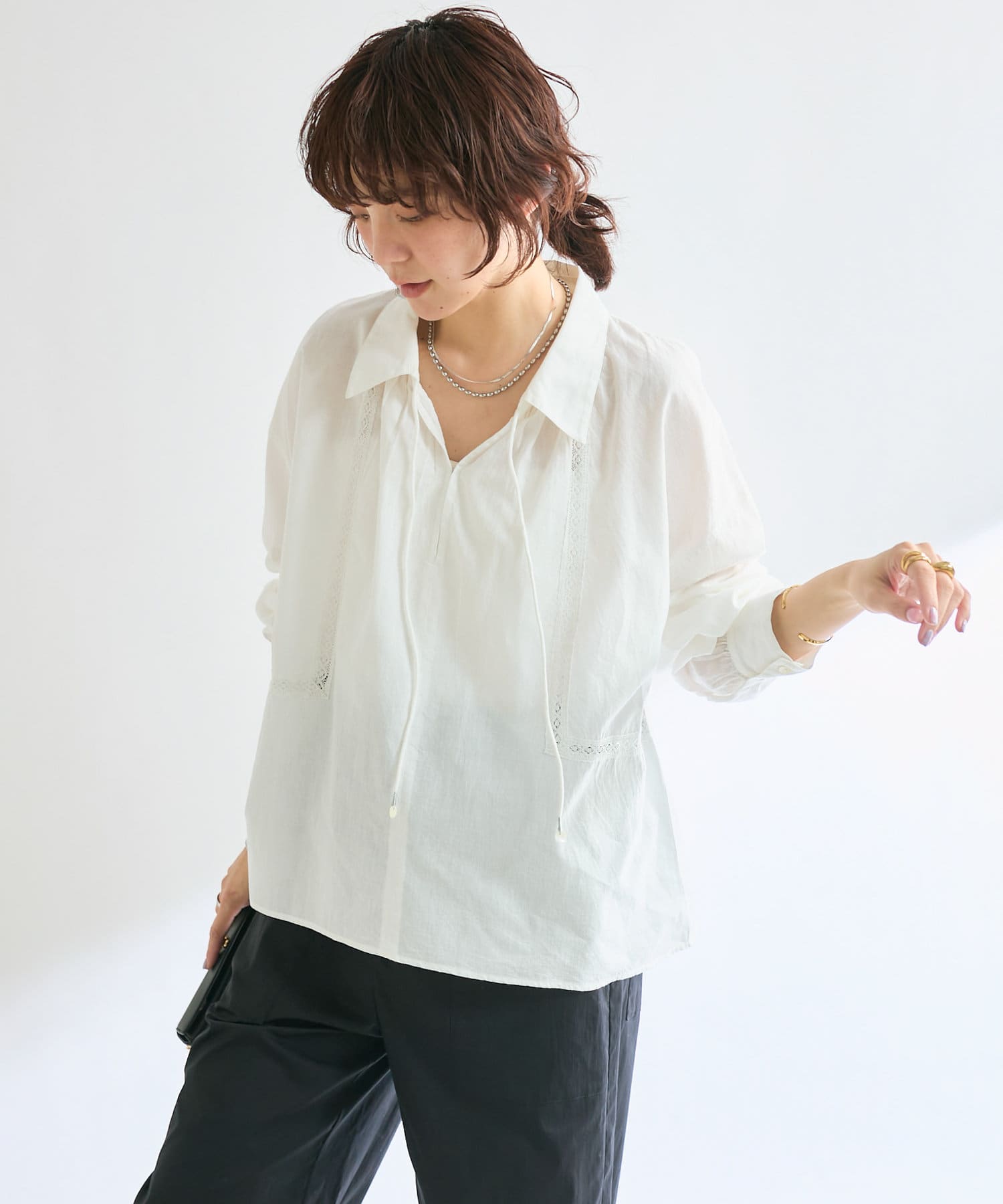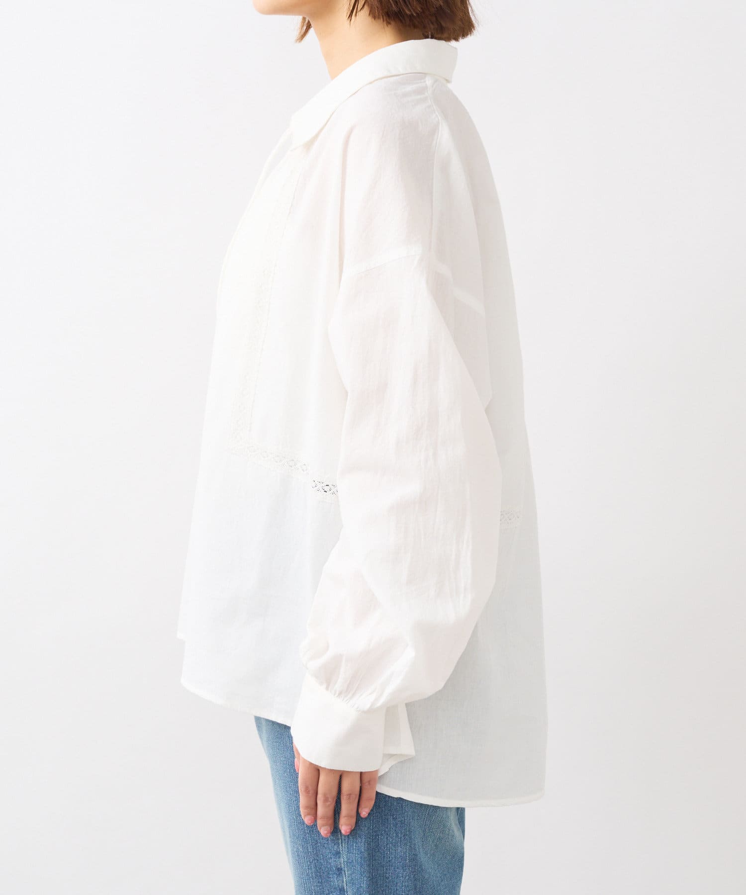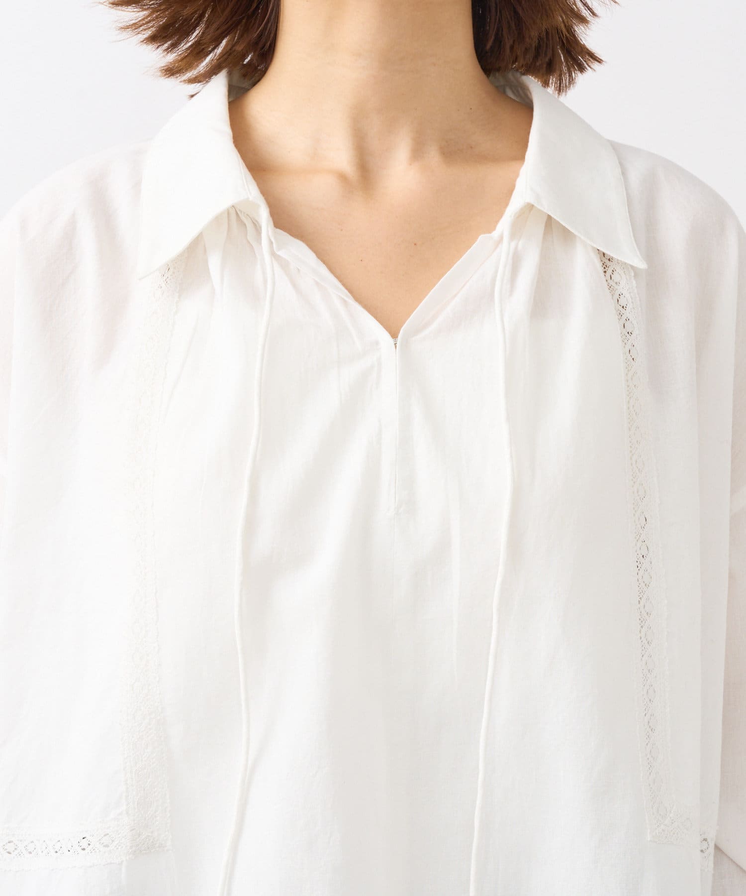 レース切り替えのディテールと首元のスキッパーデザインが印象的なシャツ。