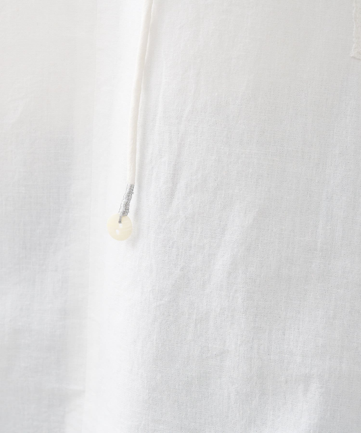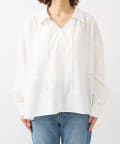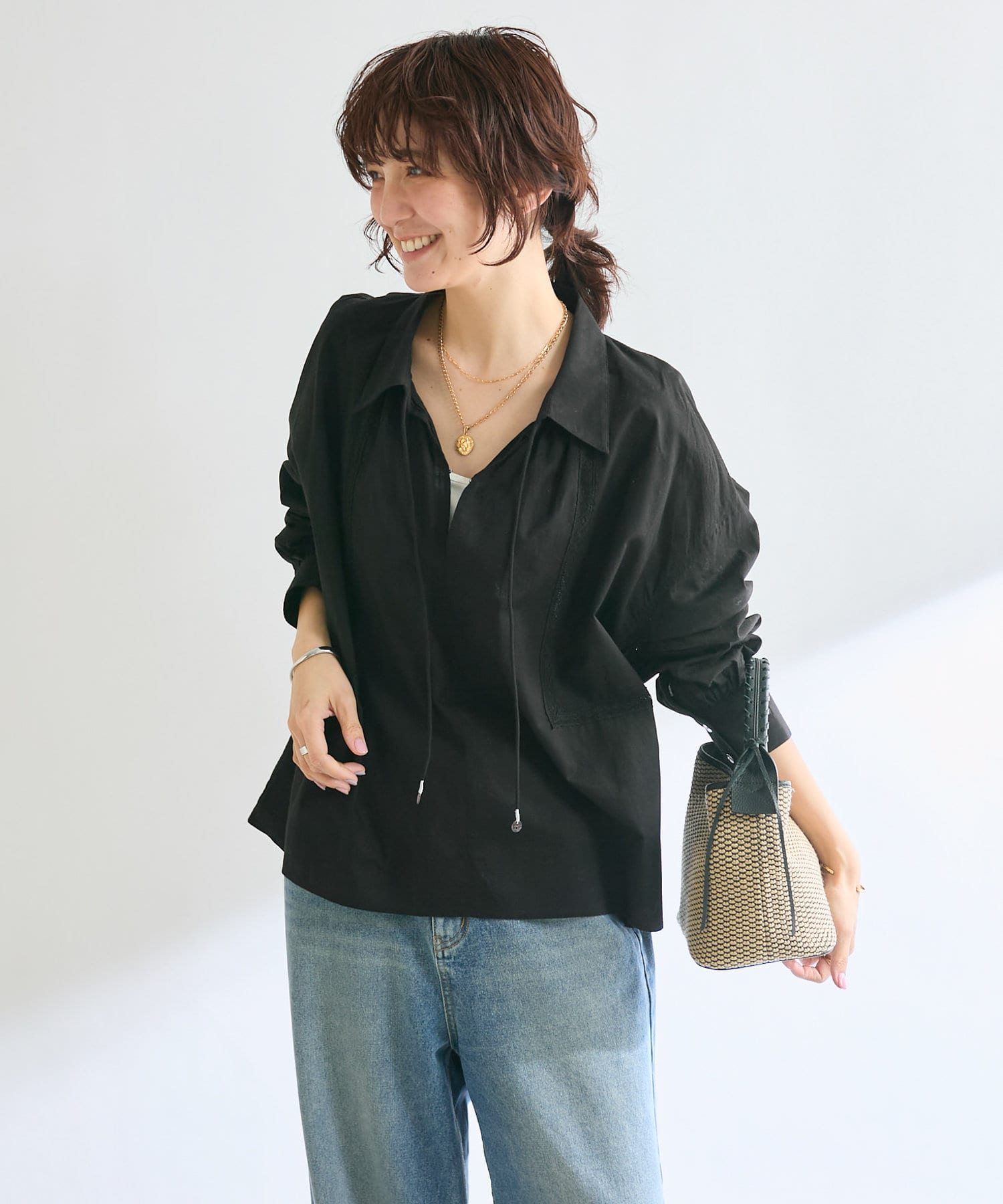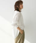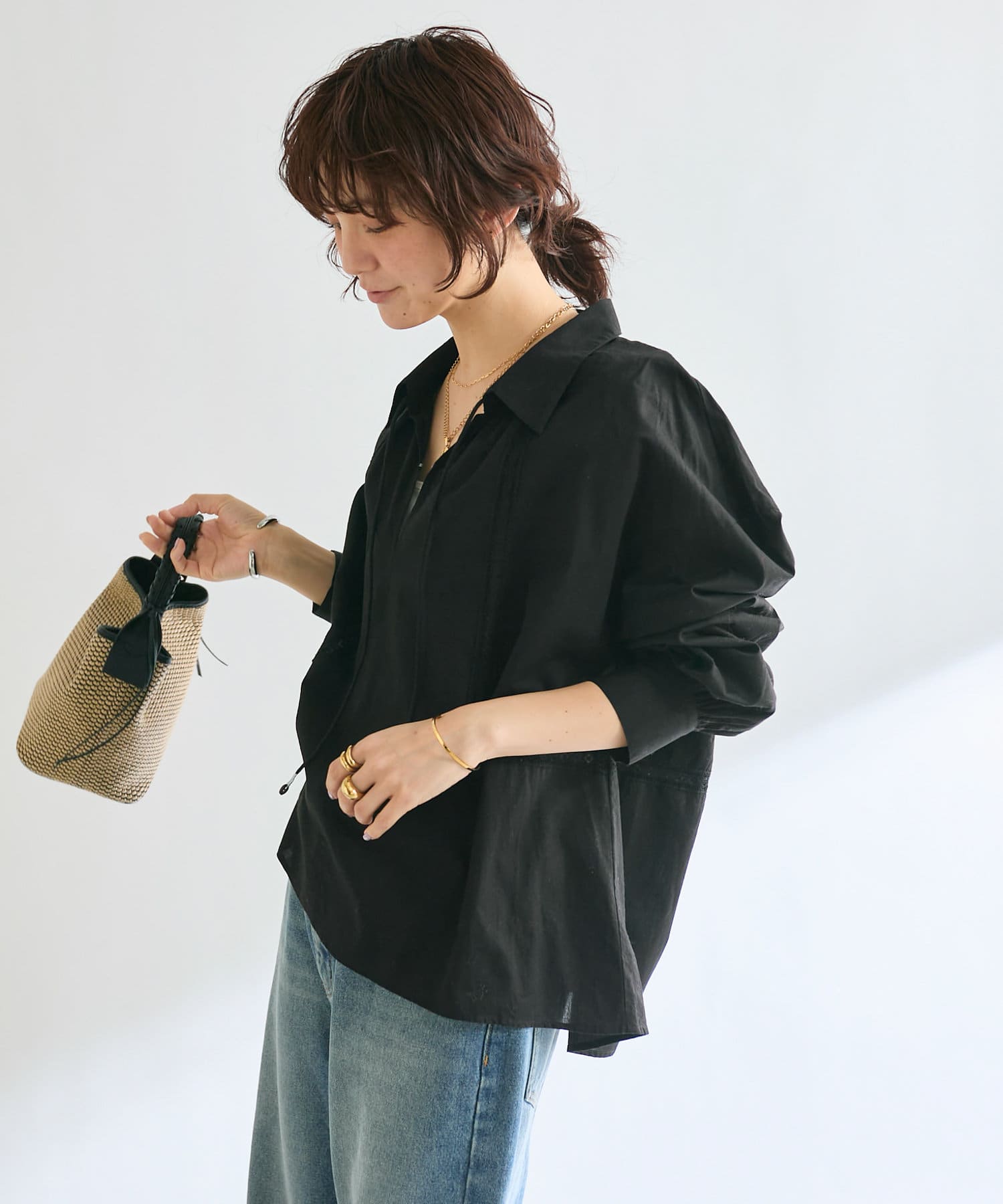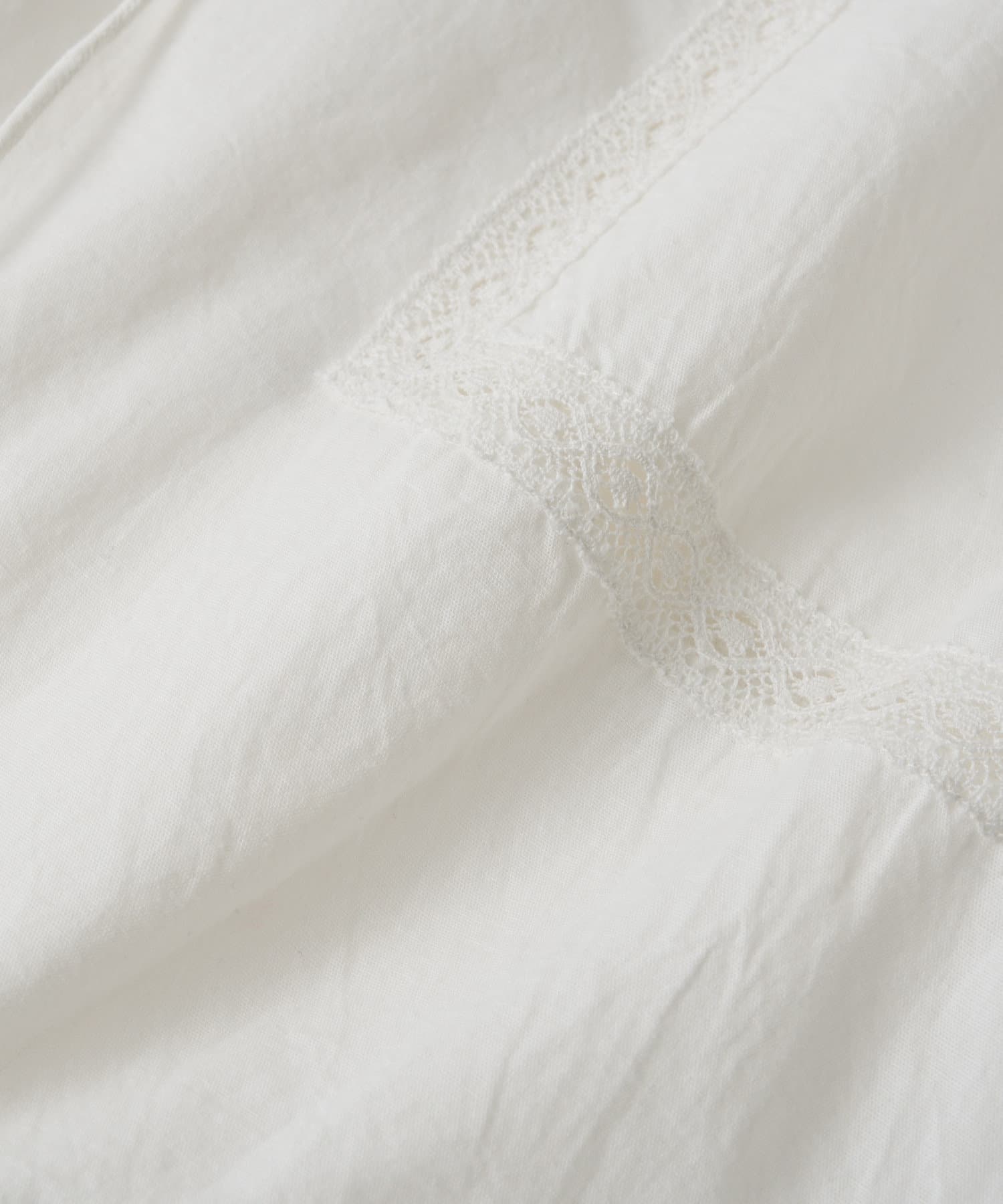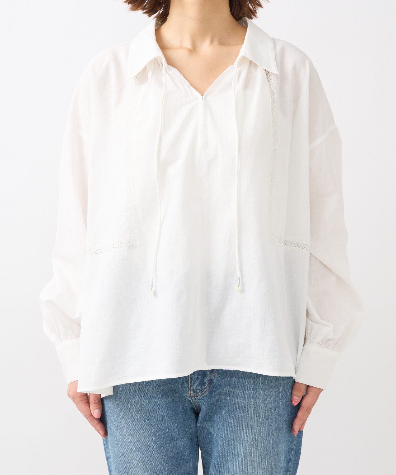 レース切り替えのディテールと首元のスキッパーデザインが印象的なシャツ。