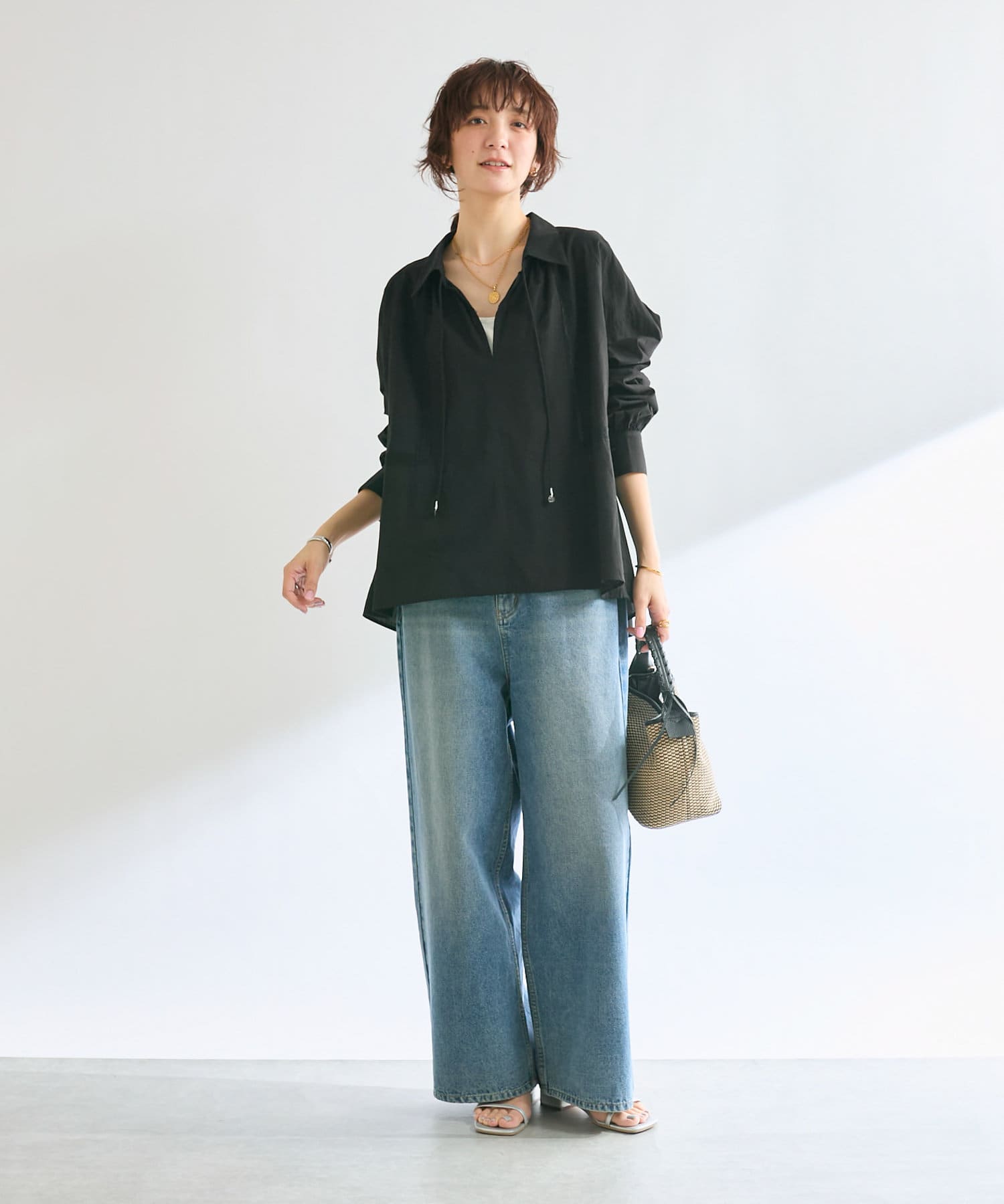 首元はスキッパーデザインで抜け感もありますが、ホックで衿の開き具合を調整可能。