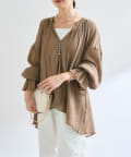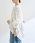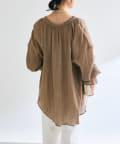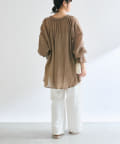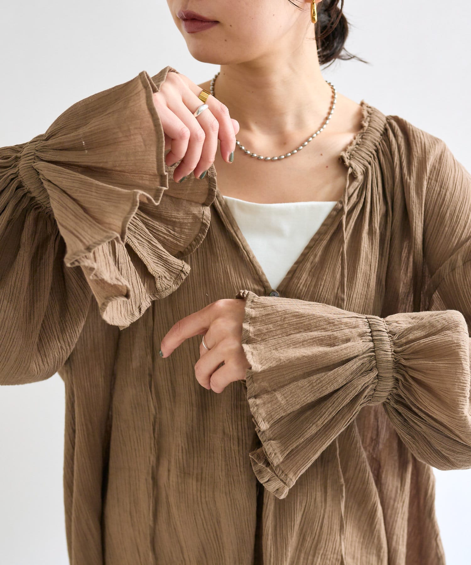 たっぷりととったギャザーや、袖口のボリューム感、衿の切りっぱなしの仕様、