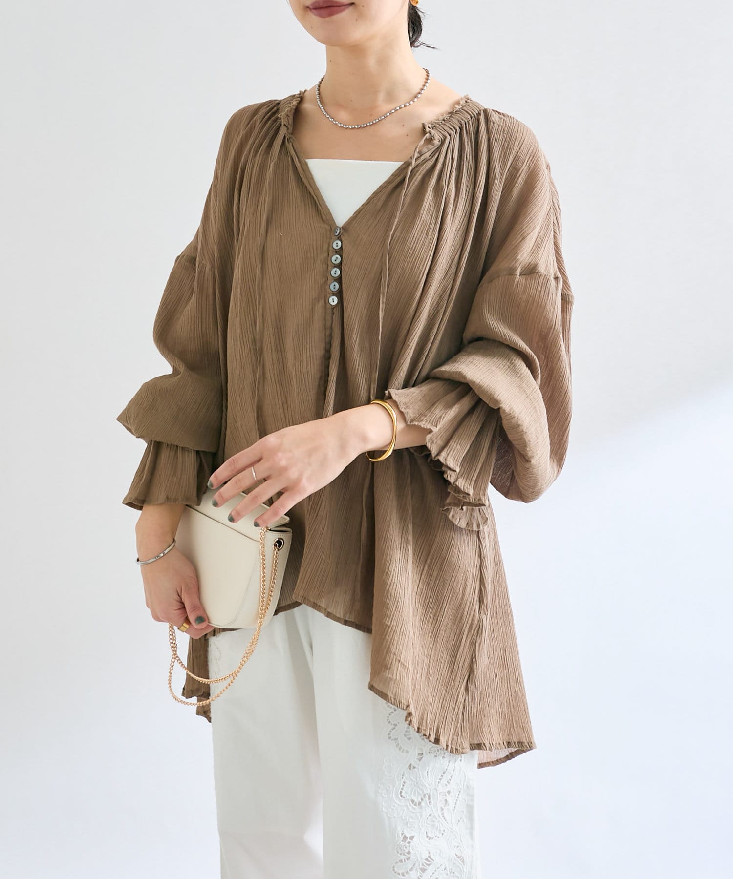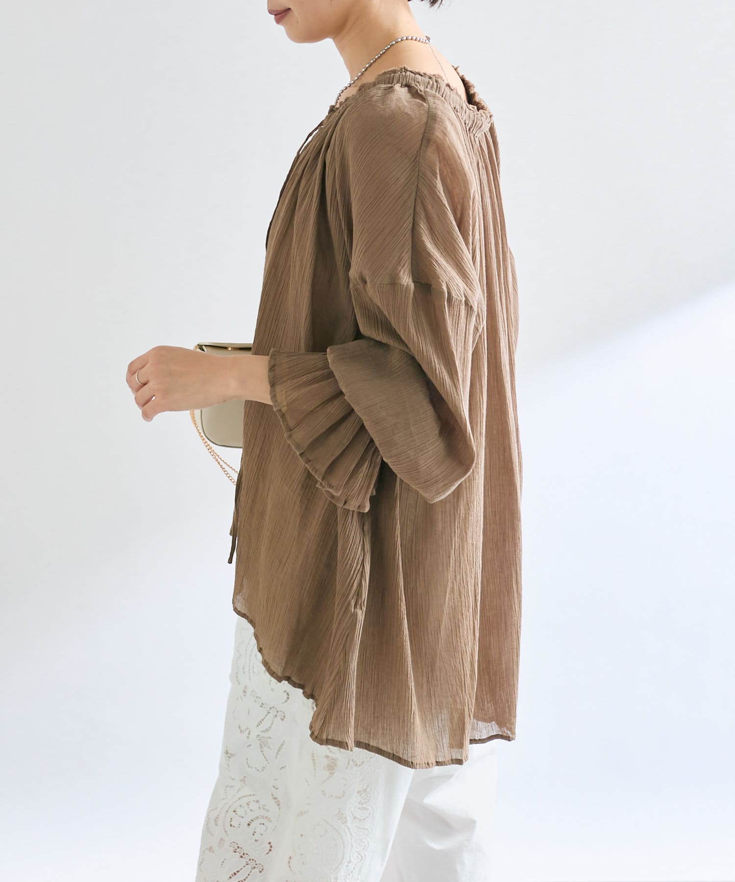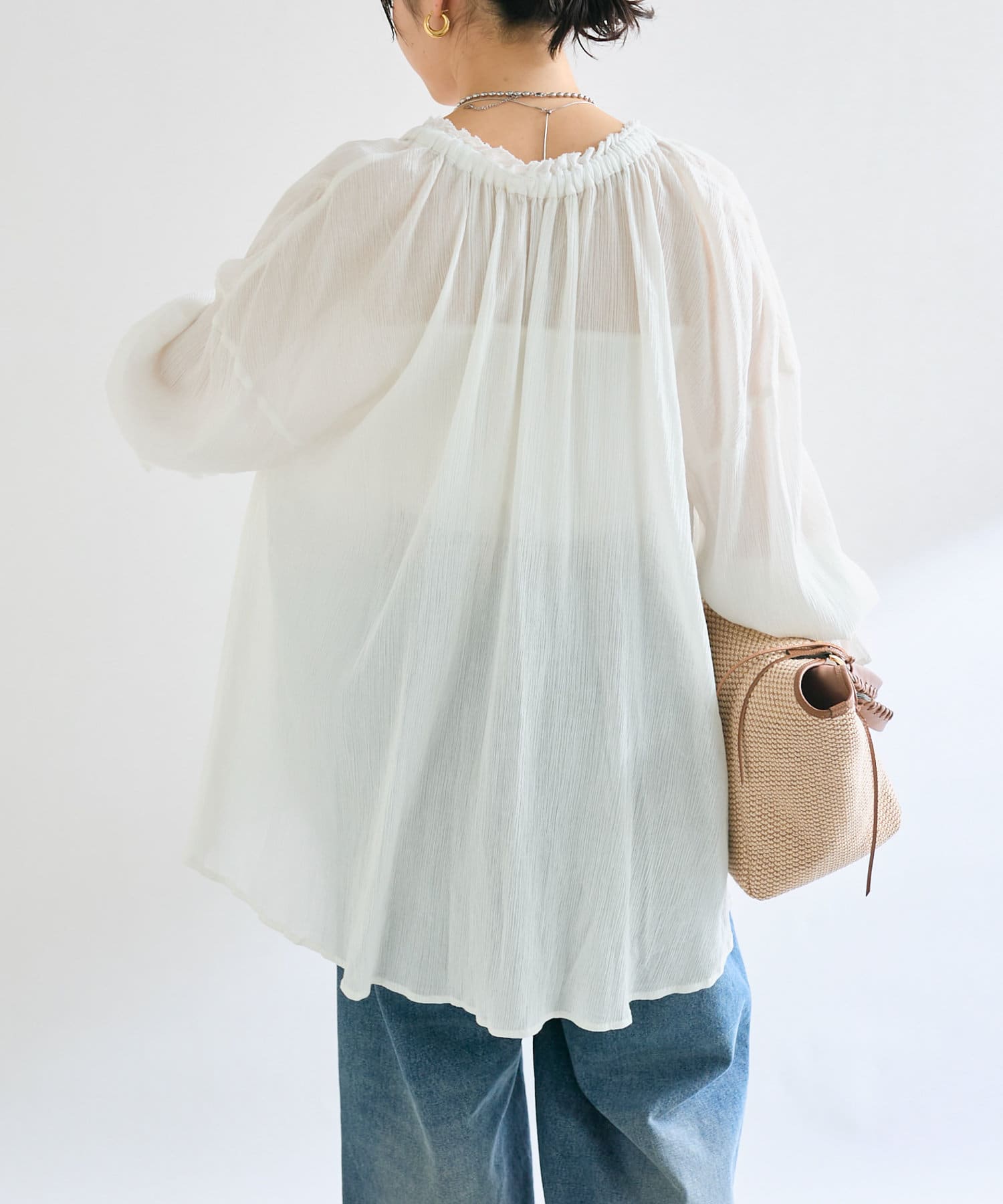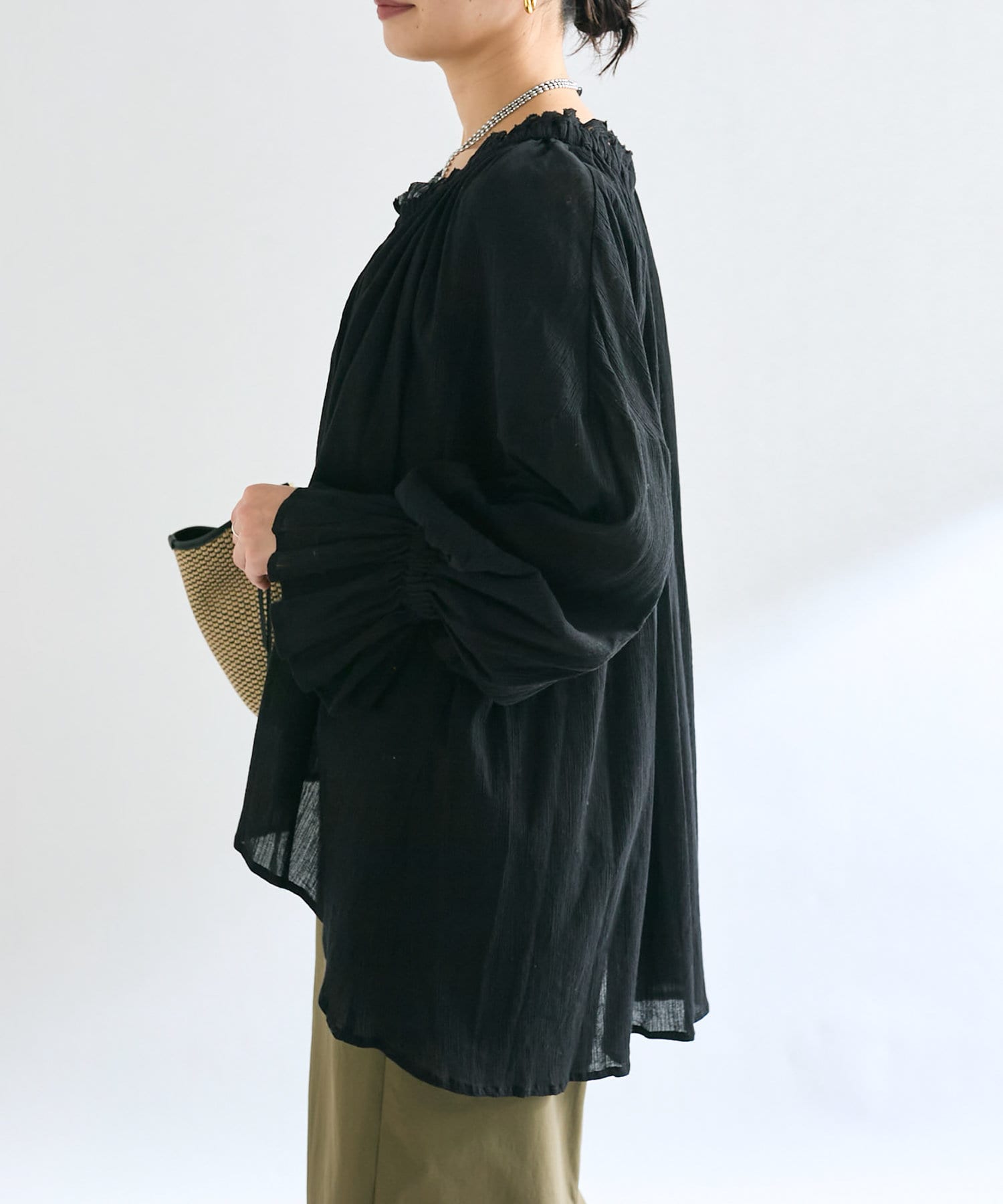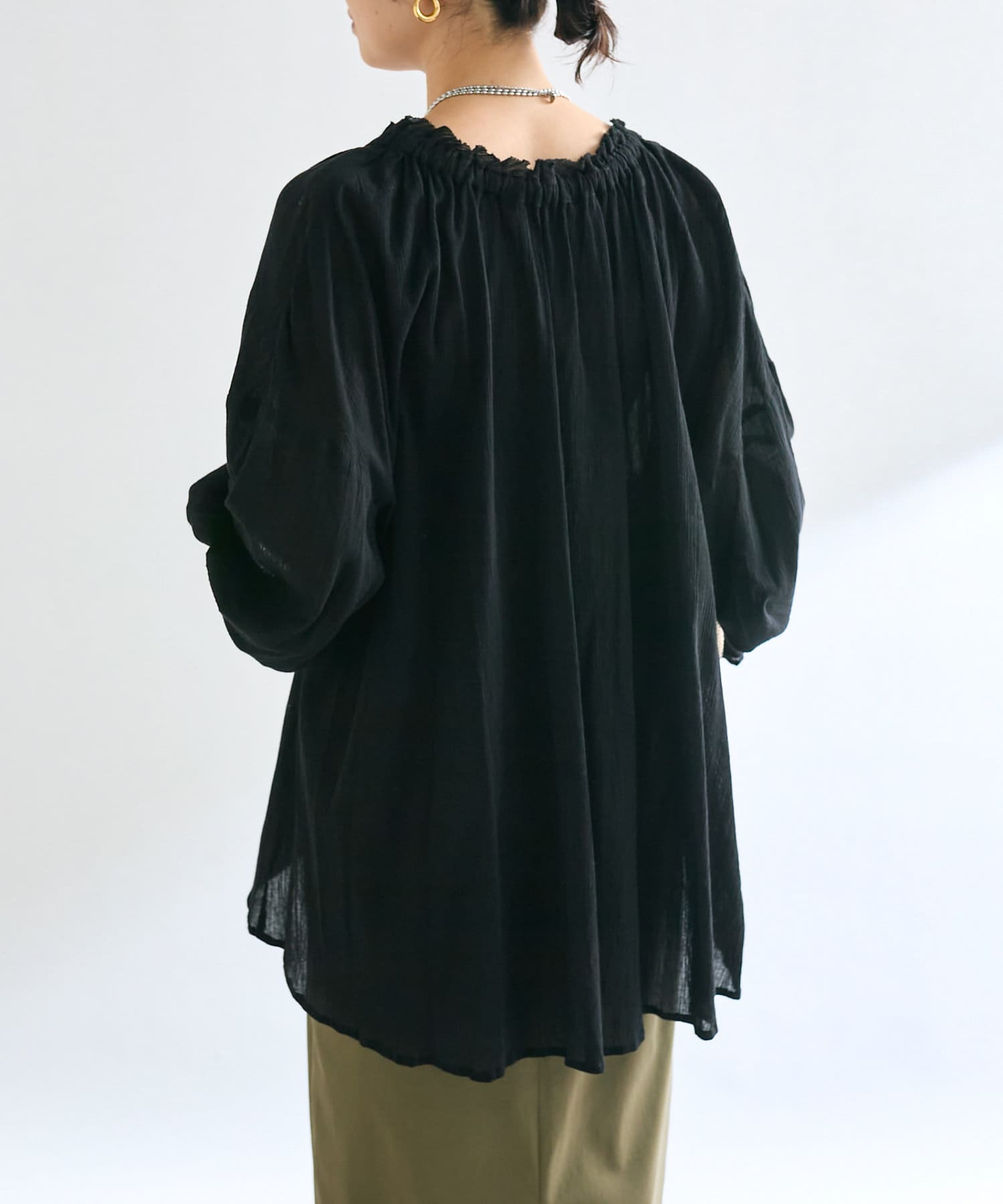 清涼感のあるコットン楊柳素材を使用したギャザーブラウス。