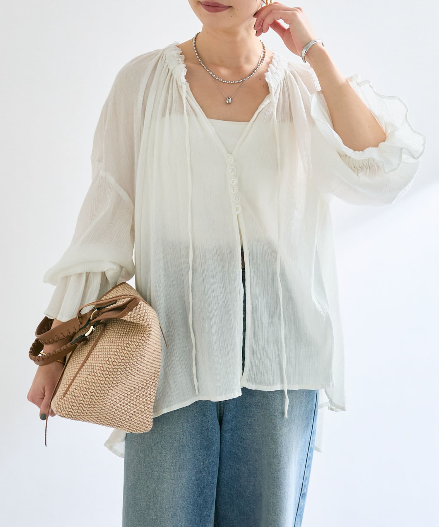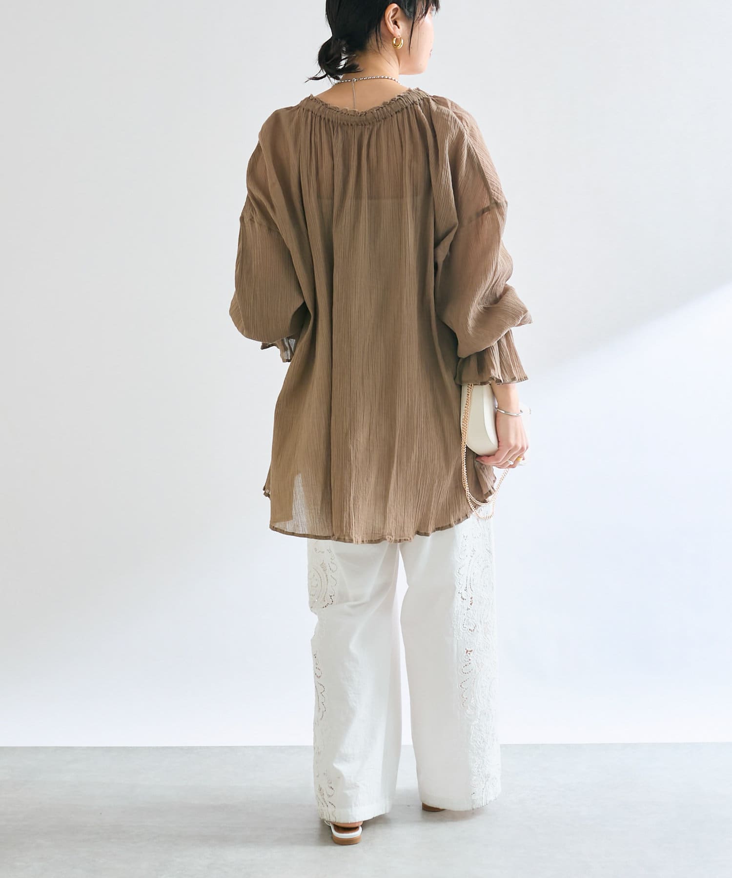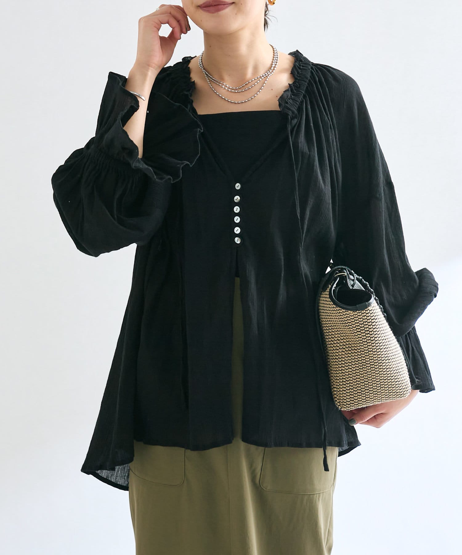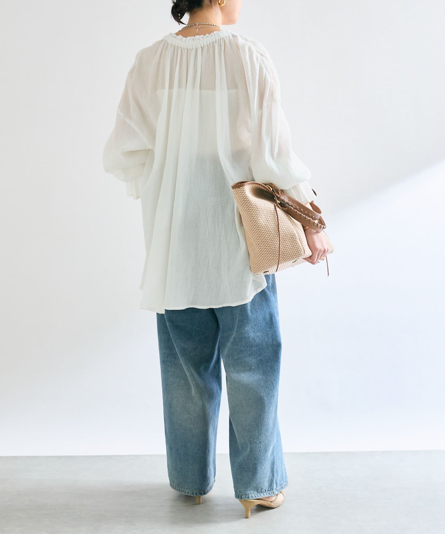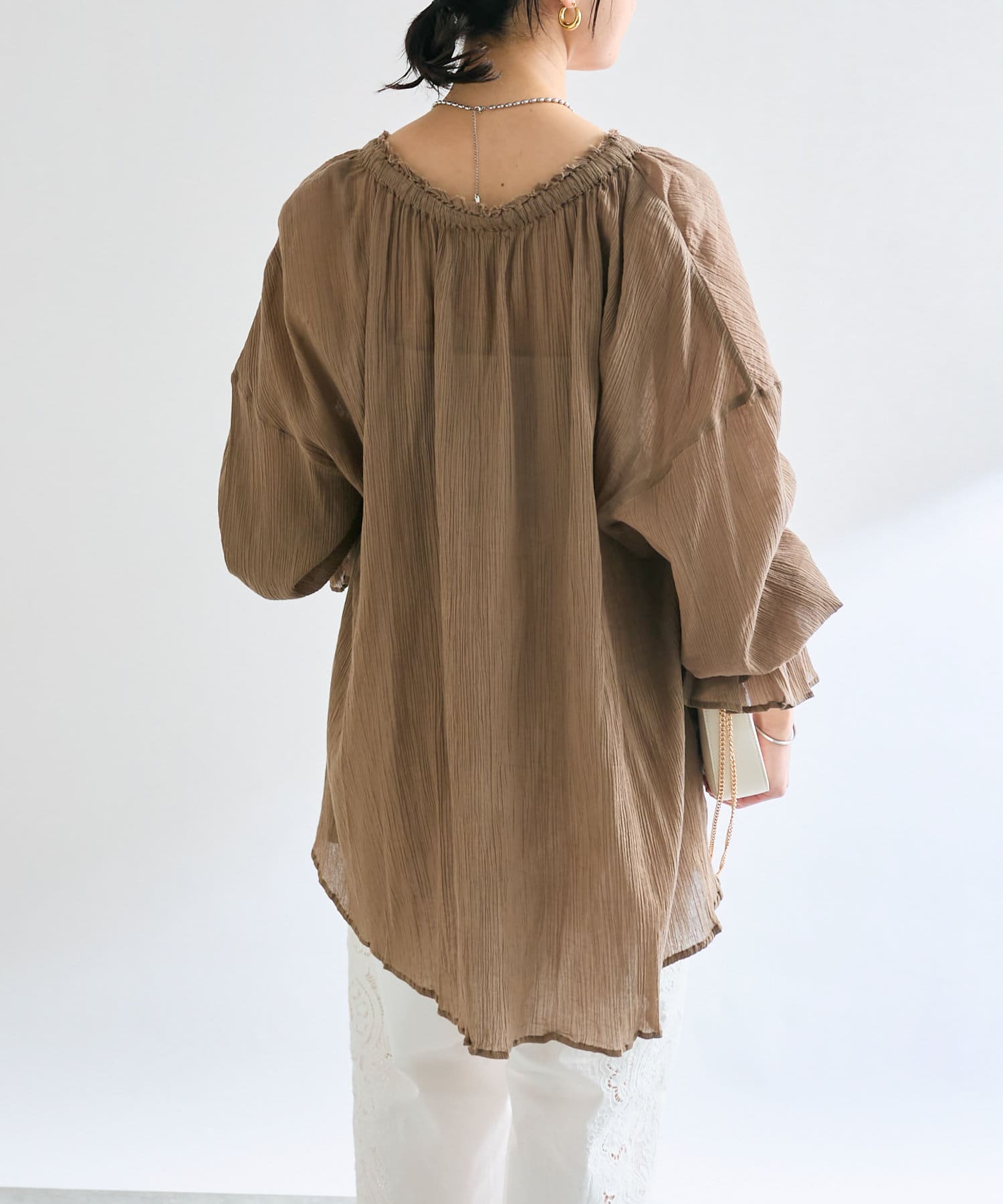 清涼感のあるコットン楊柳素材を使用したギャザーブラウス。