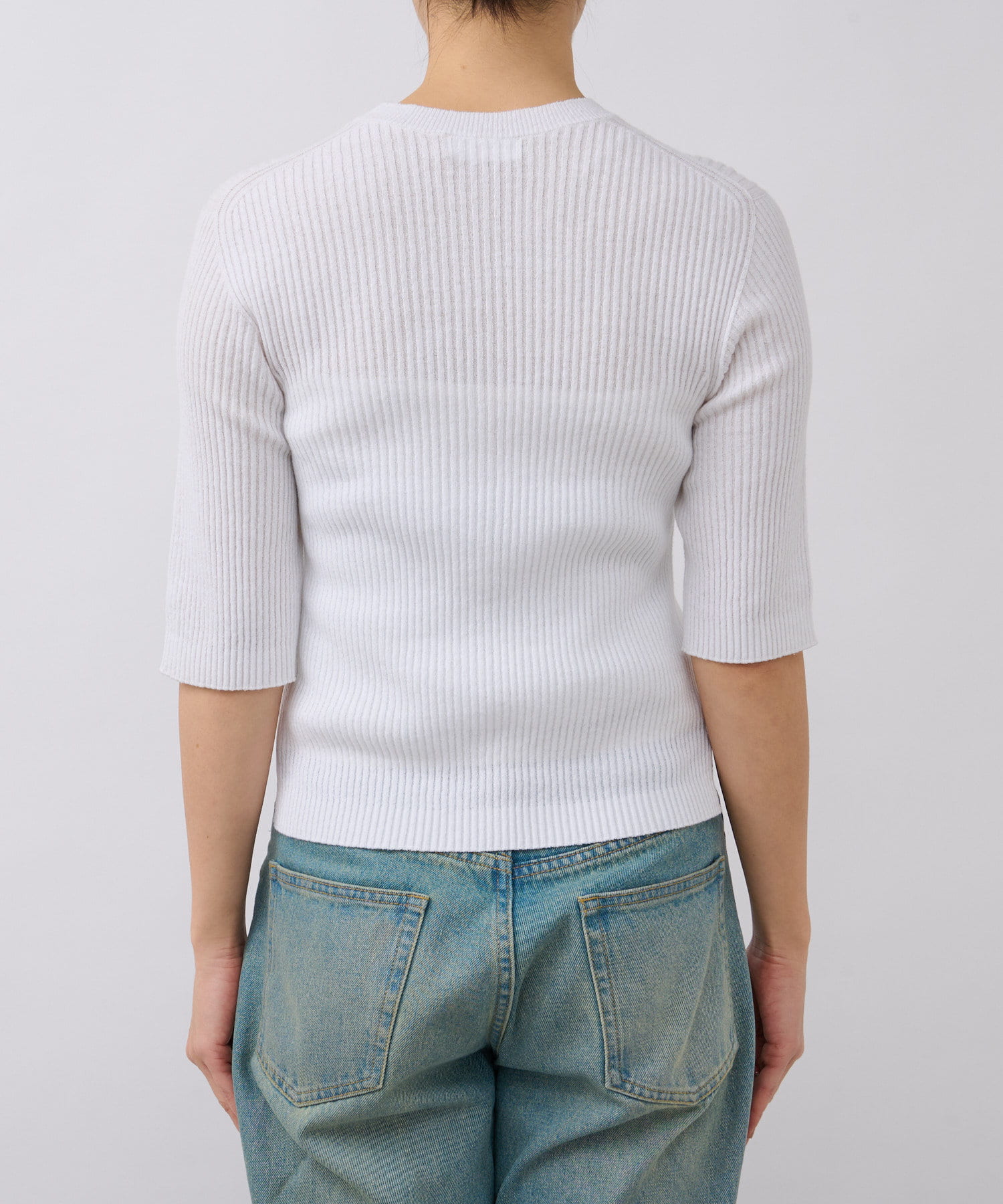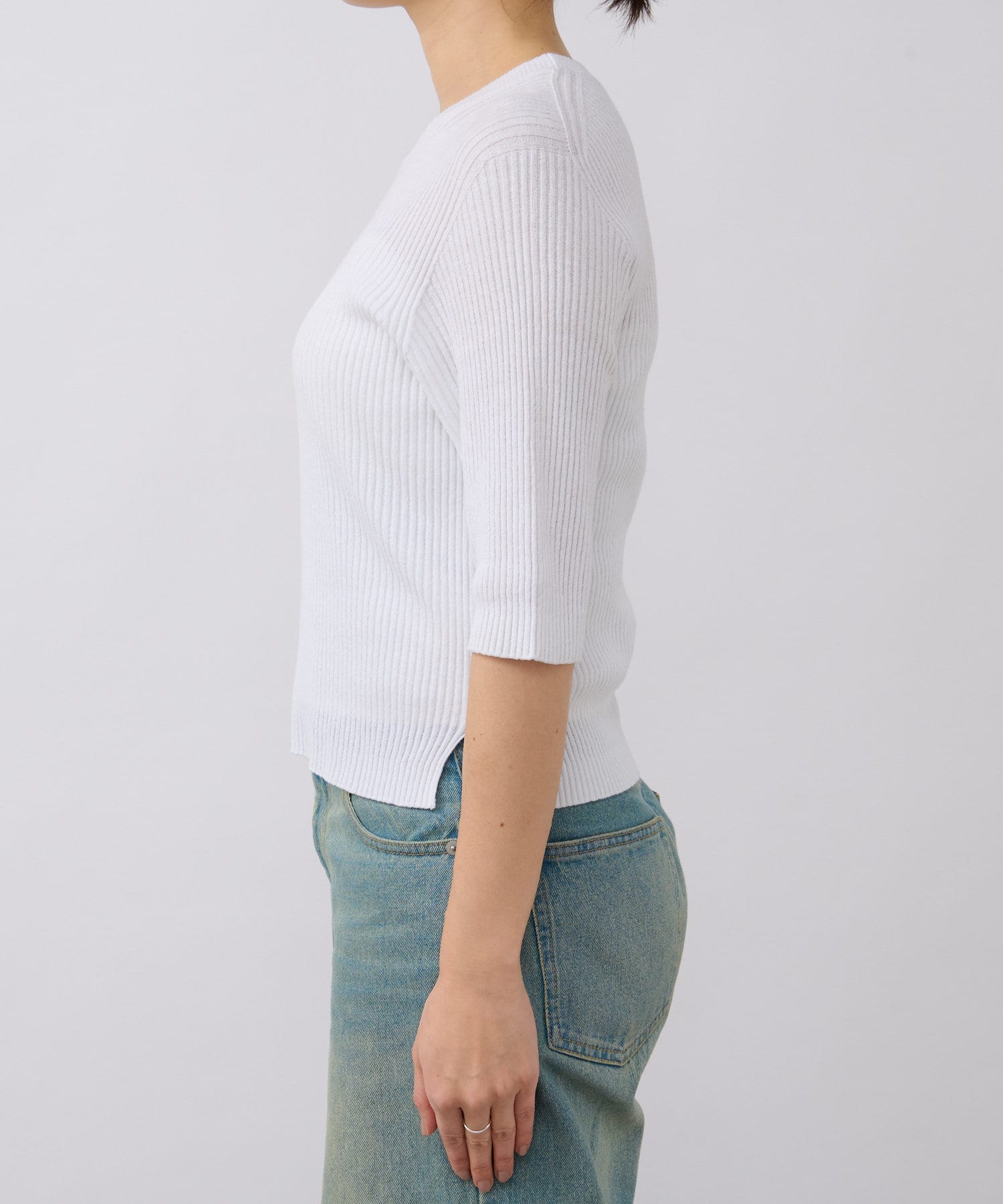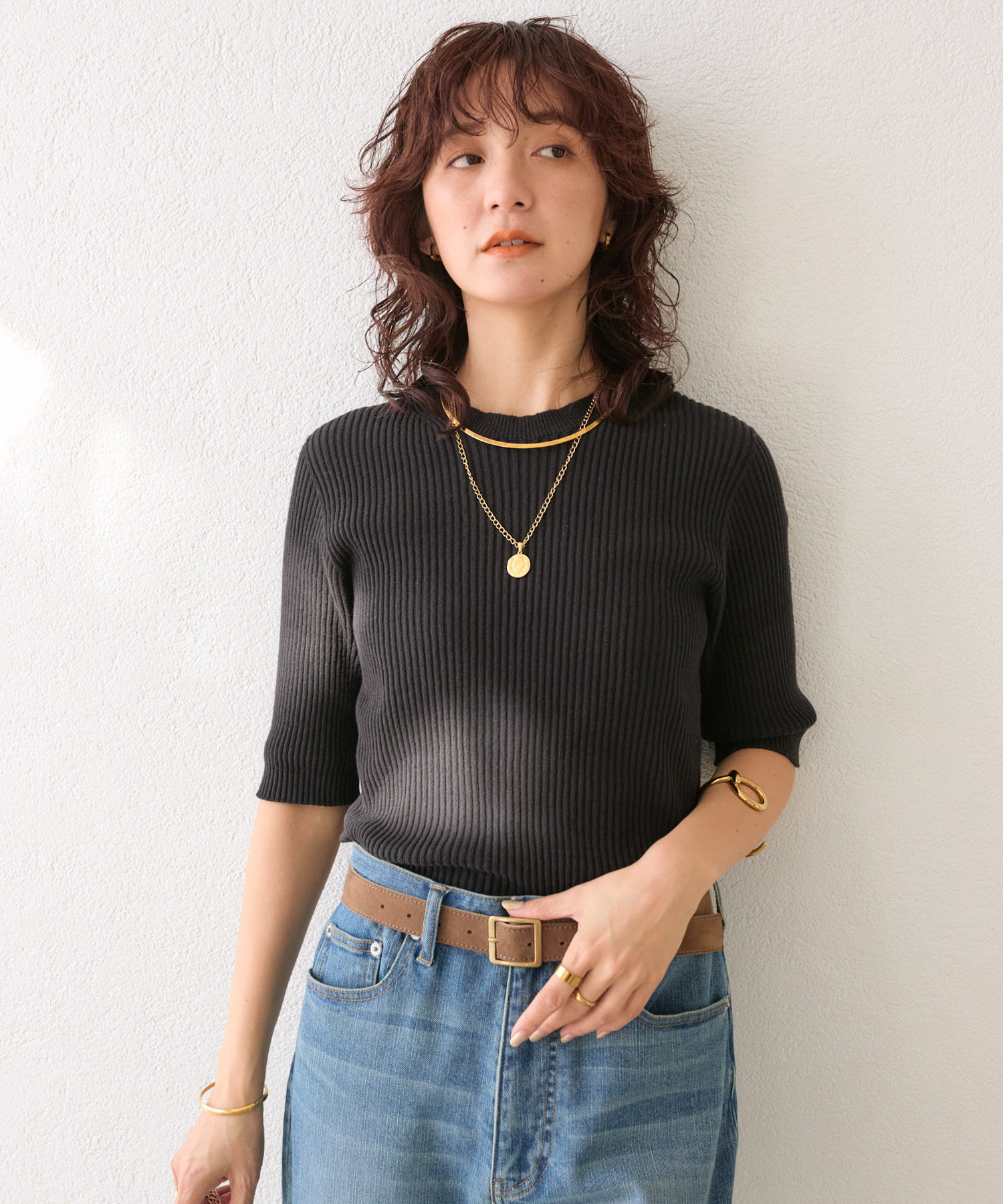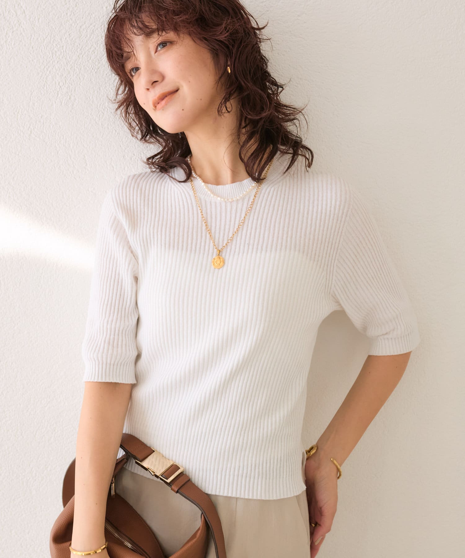 油分が少なく独特のシャリ感を持つ綿の糸を使用したシンプルなリブクルーニット。
