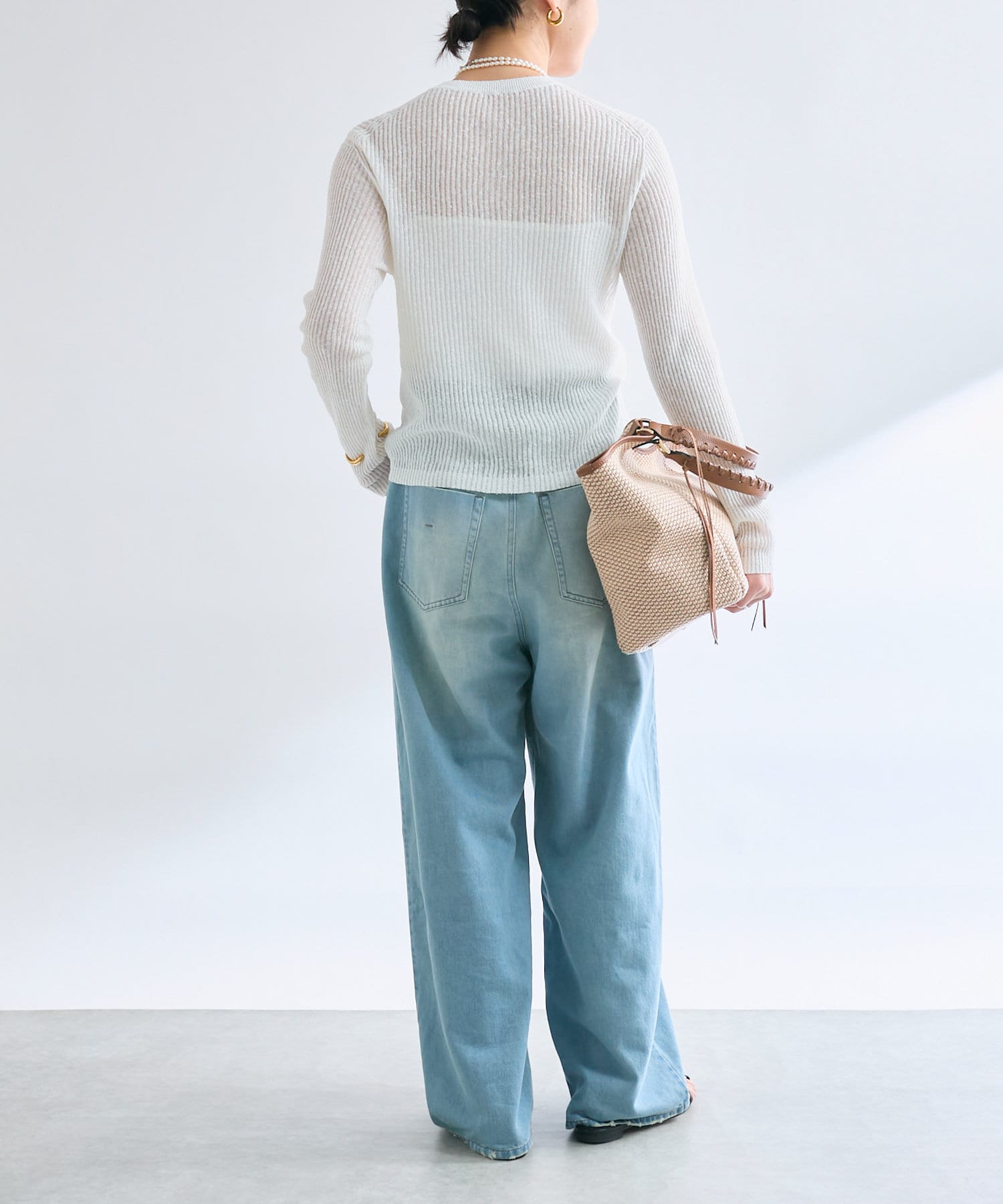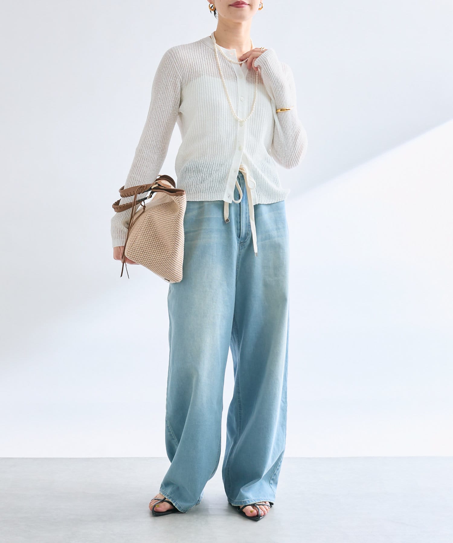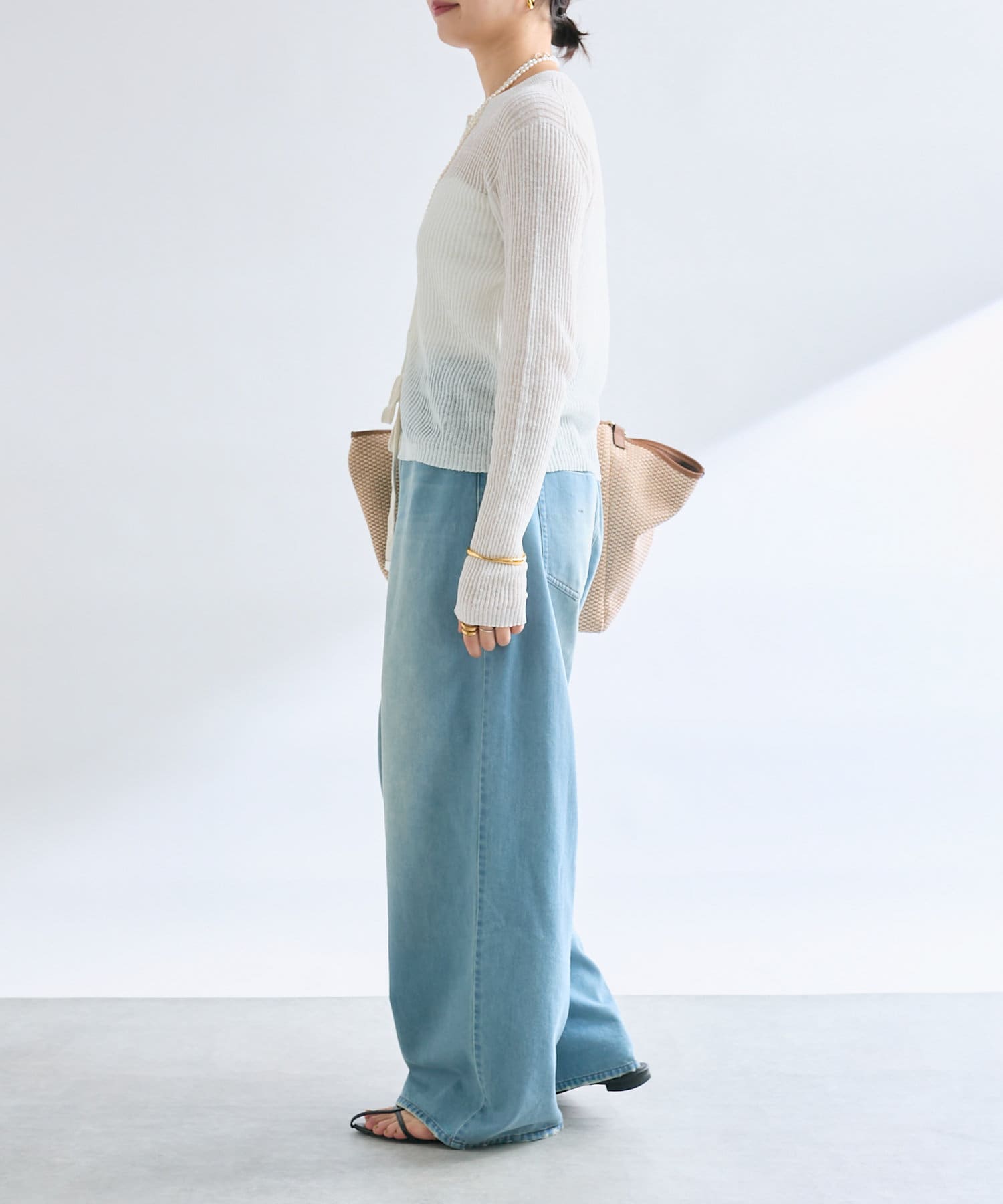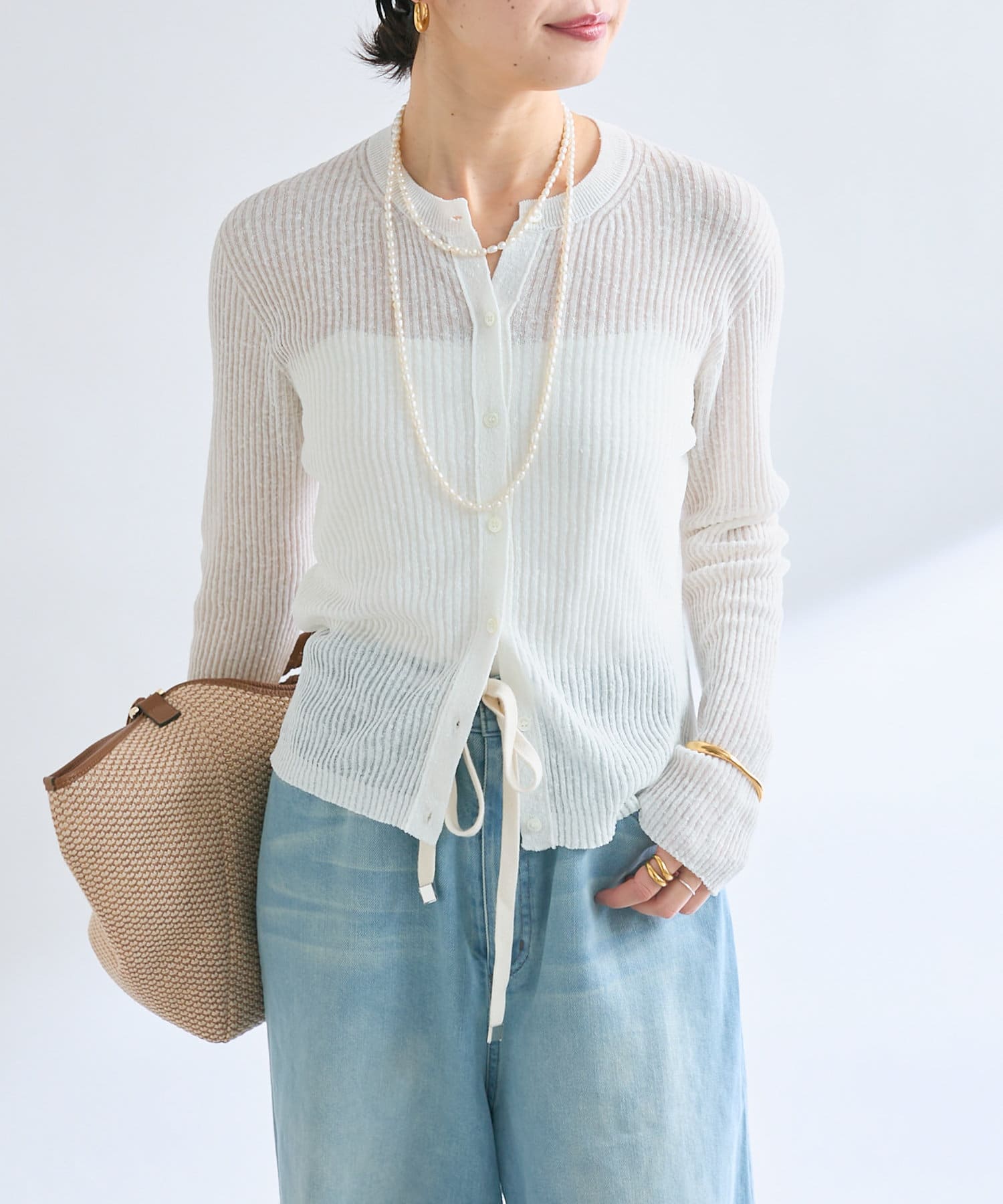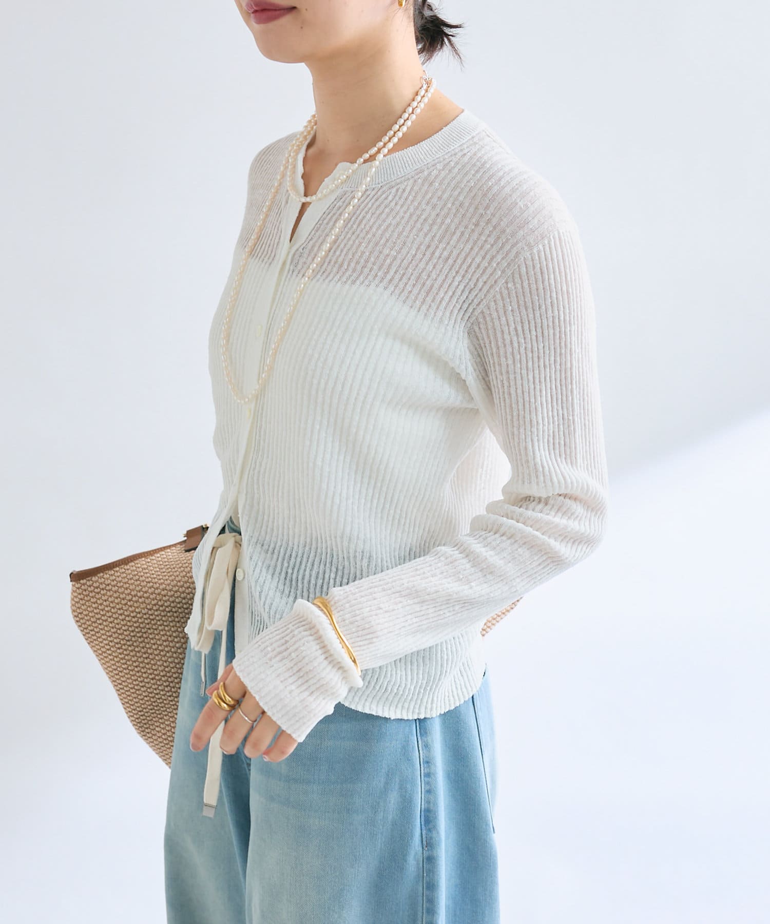 繊細なリブ編みならではの涼しげな透け感があるニュアンスたっぷりの1枚です。