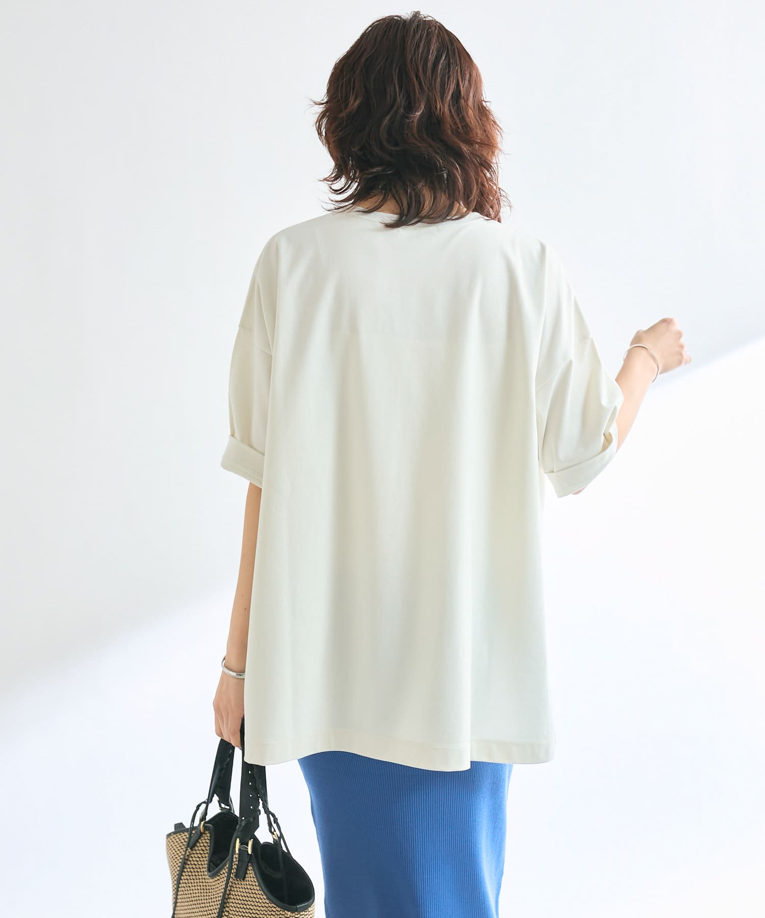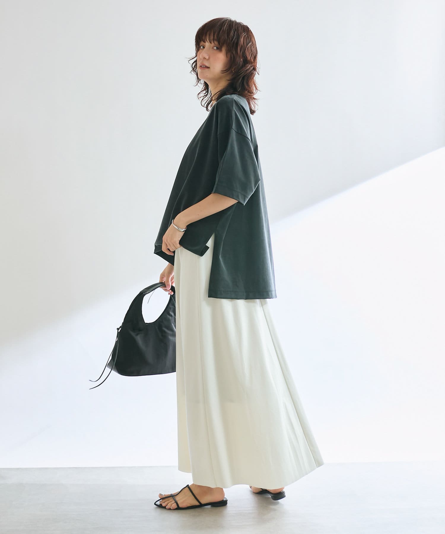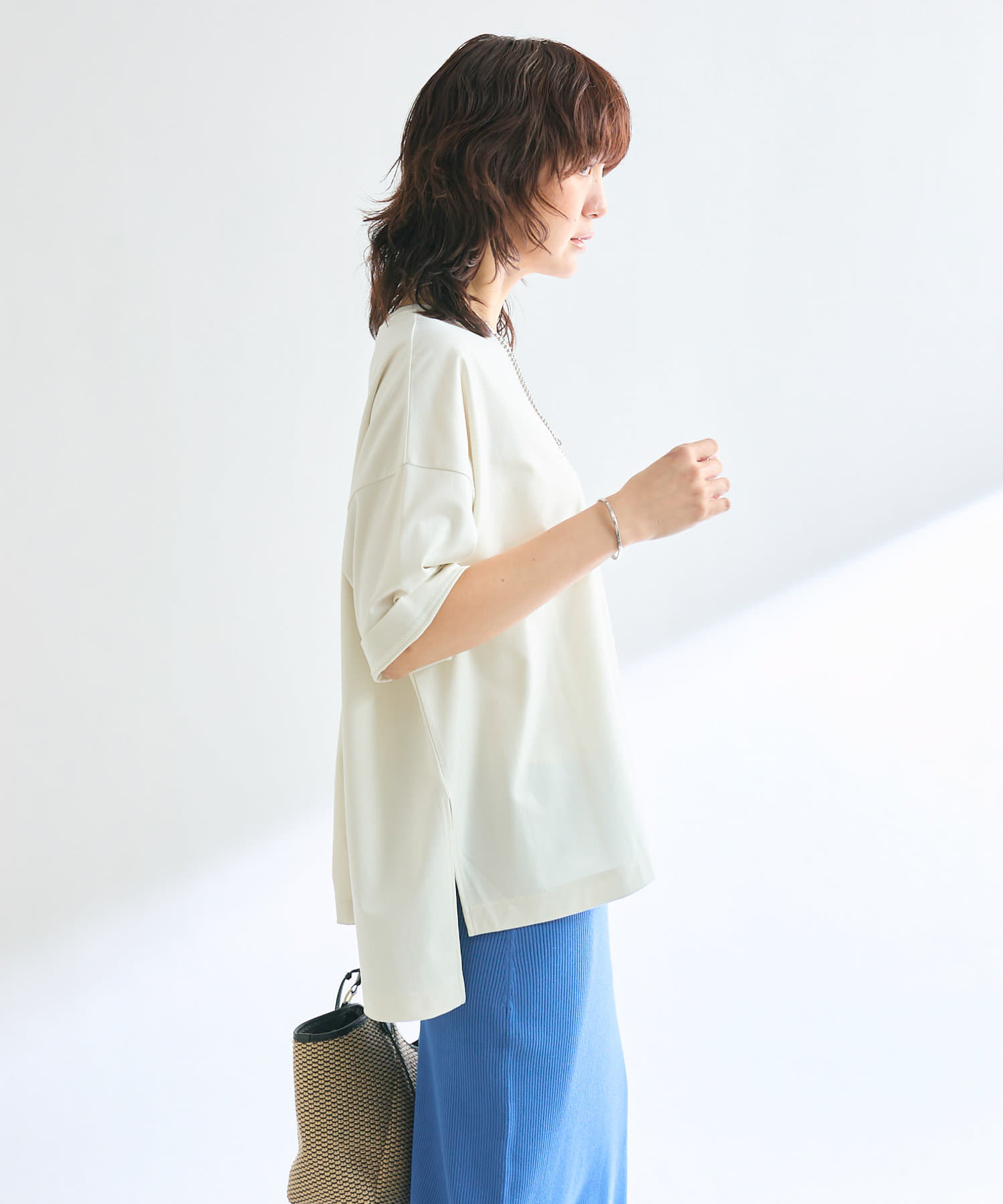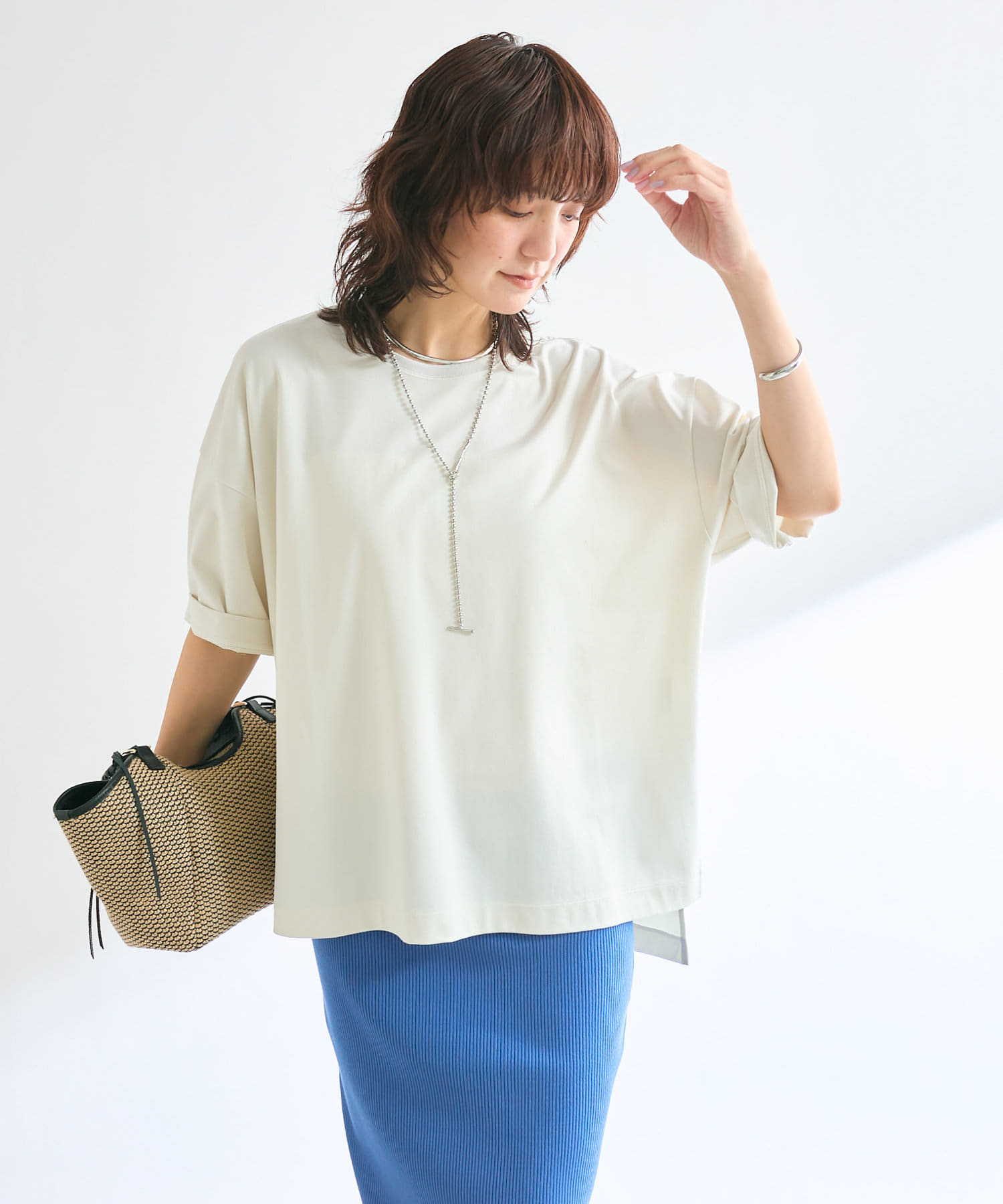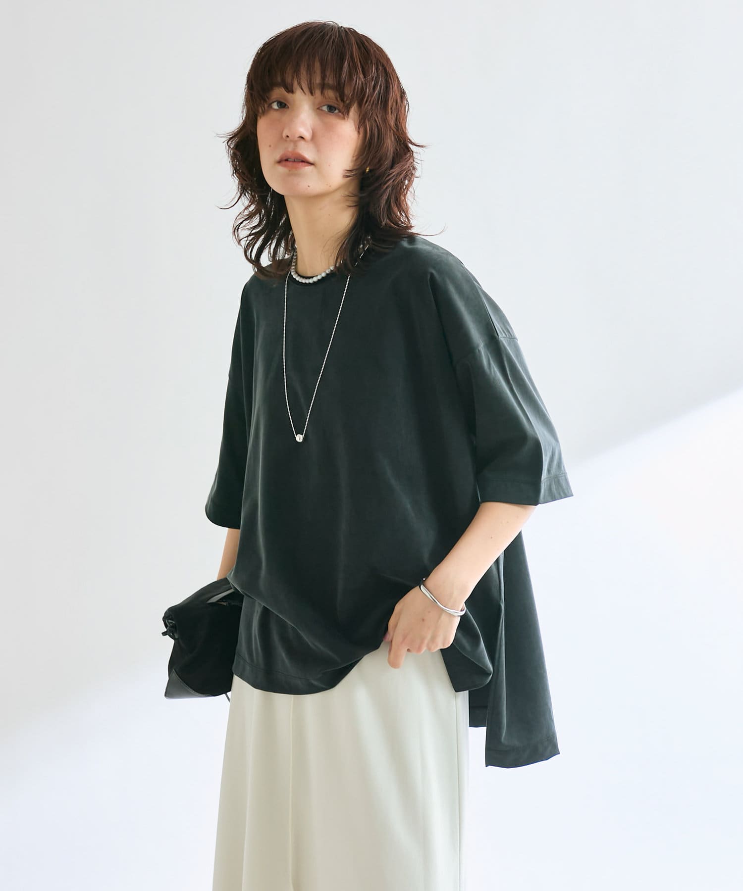 滑らかなシルキータッチで着心地もよく、程よいとろみのシンプルなオーバーT。