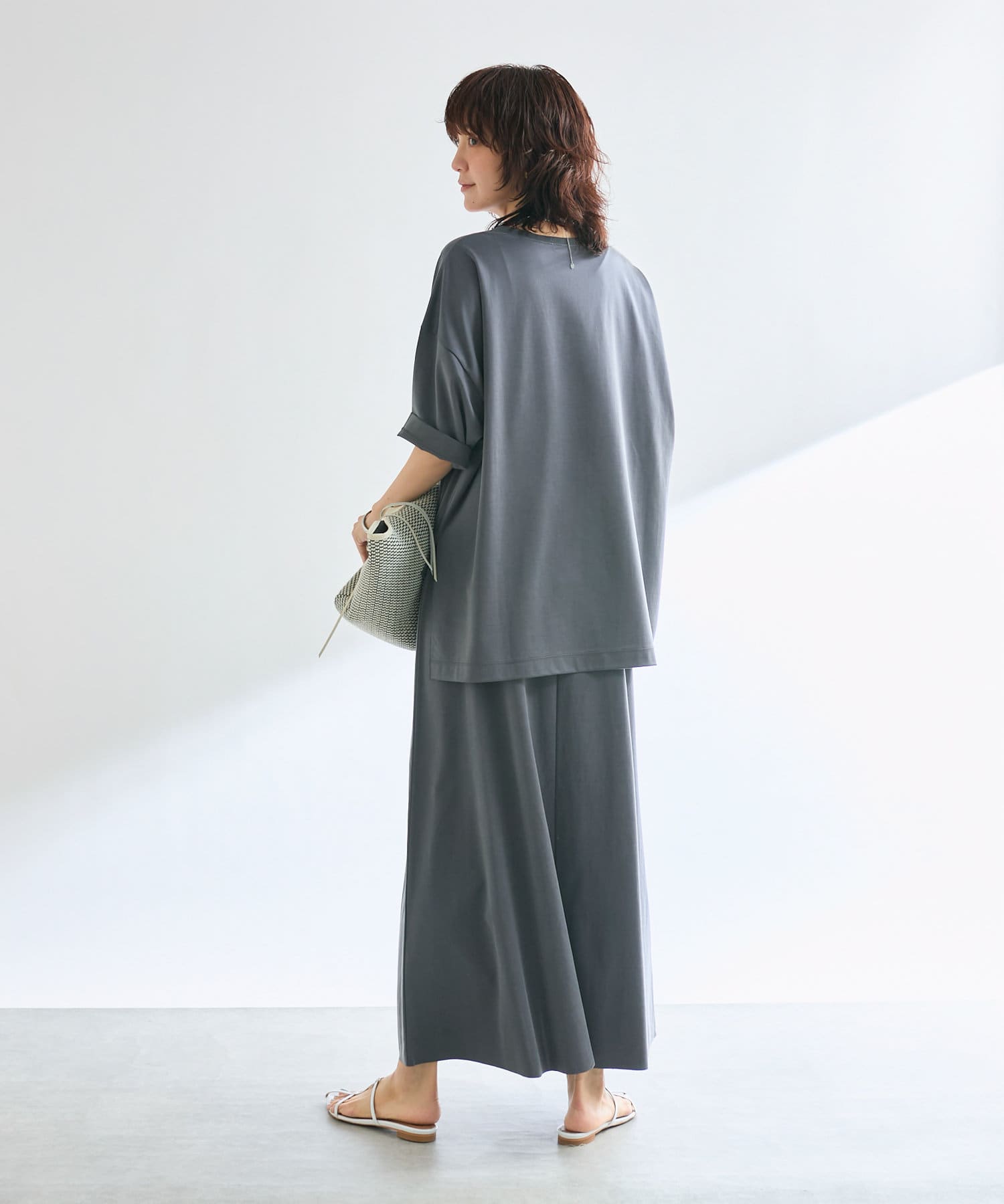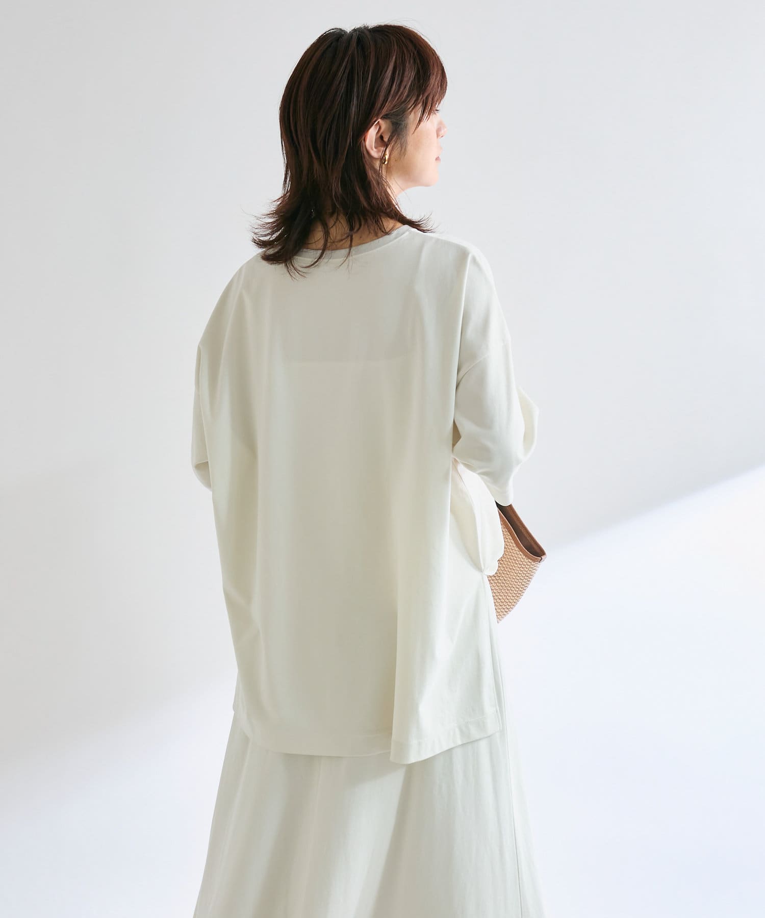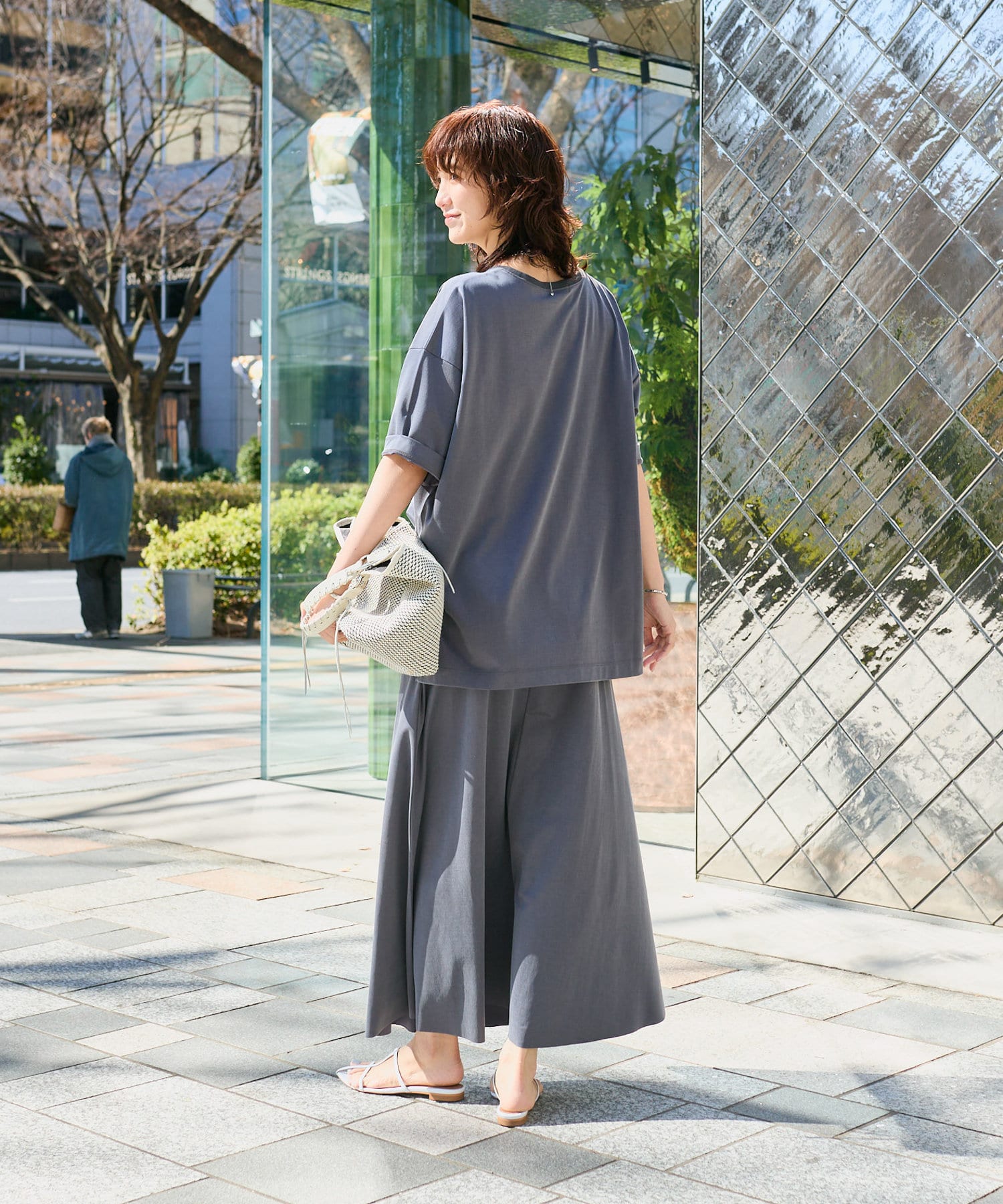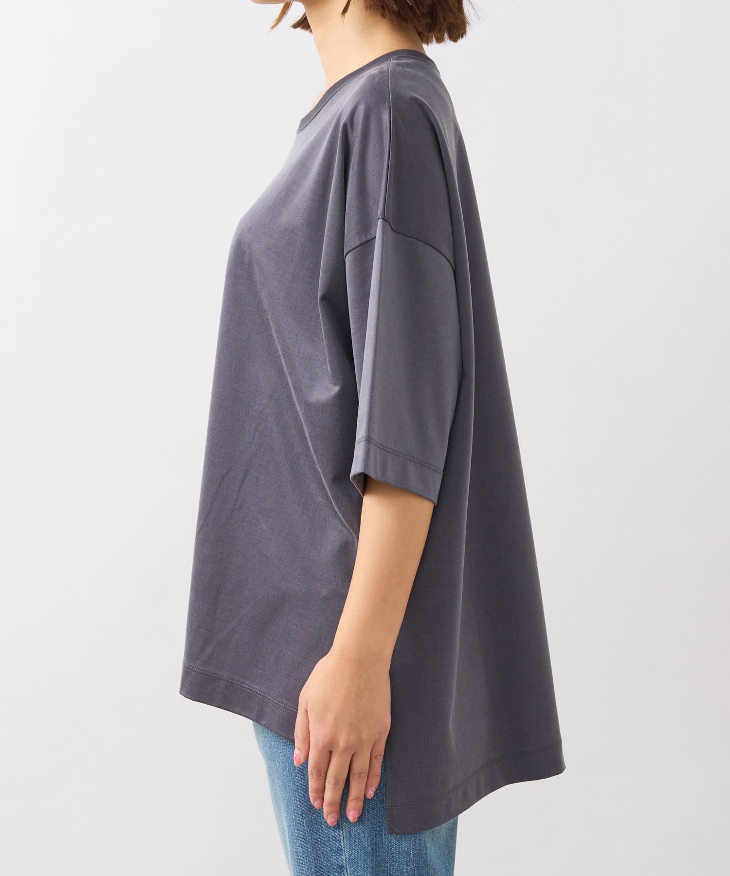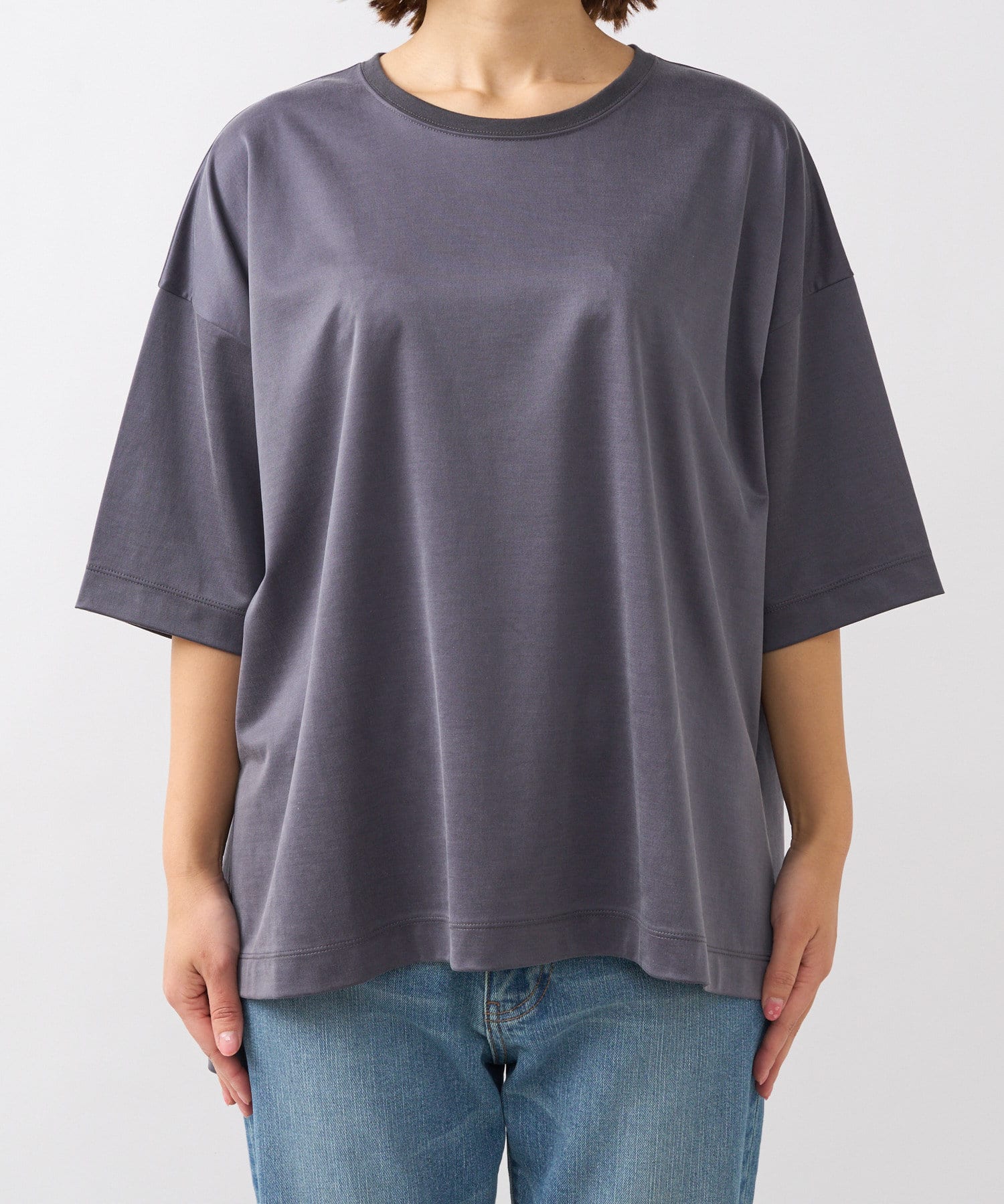 滑らかなシルキータッチで着心地もよく、程よいとろみのシンプルなオーバーT。