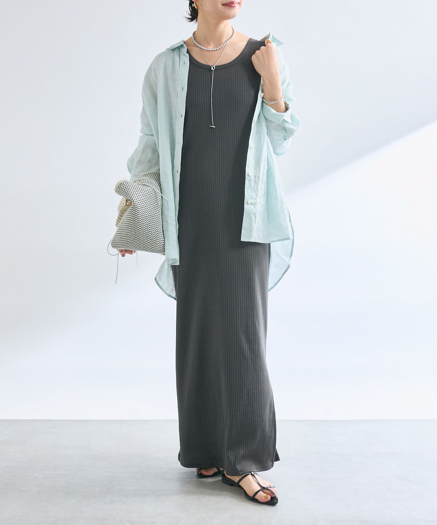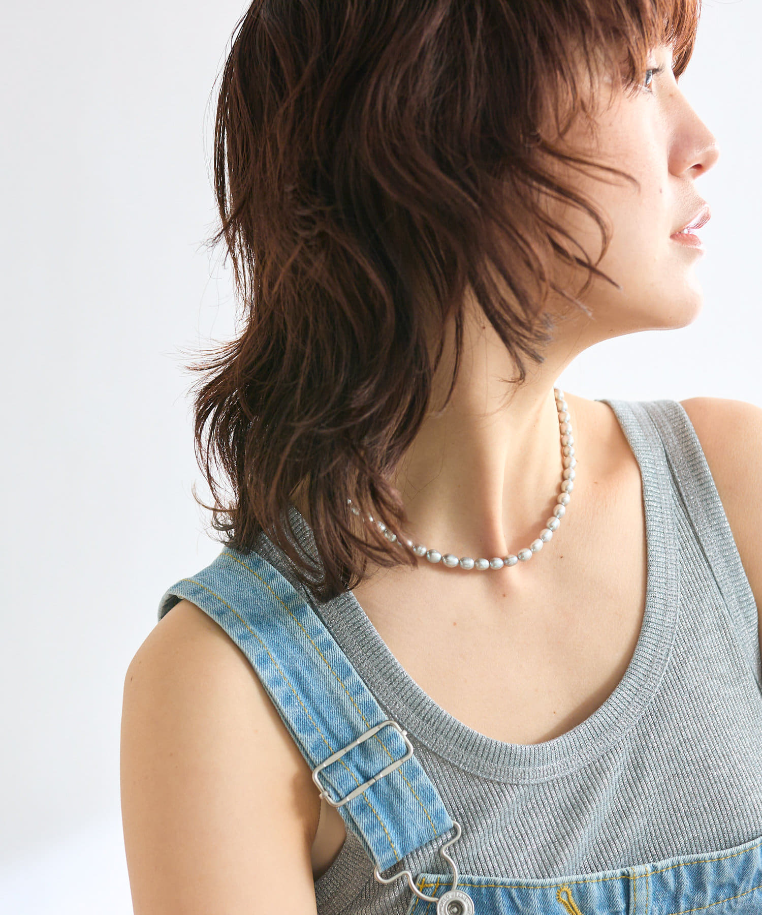 グレーカラーが印象的なパールネックレス。