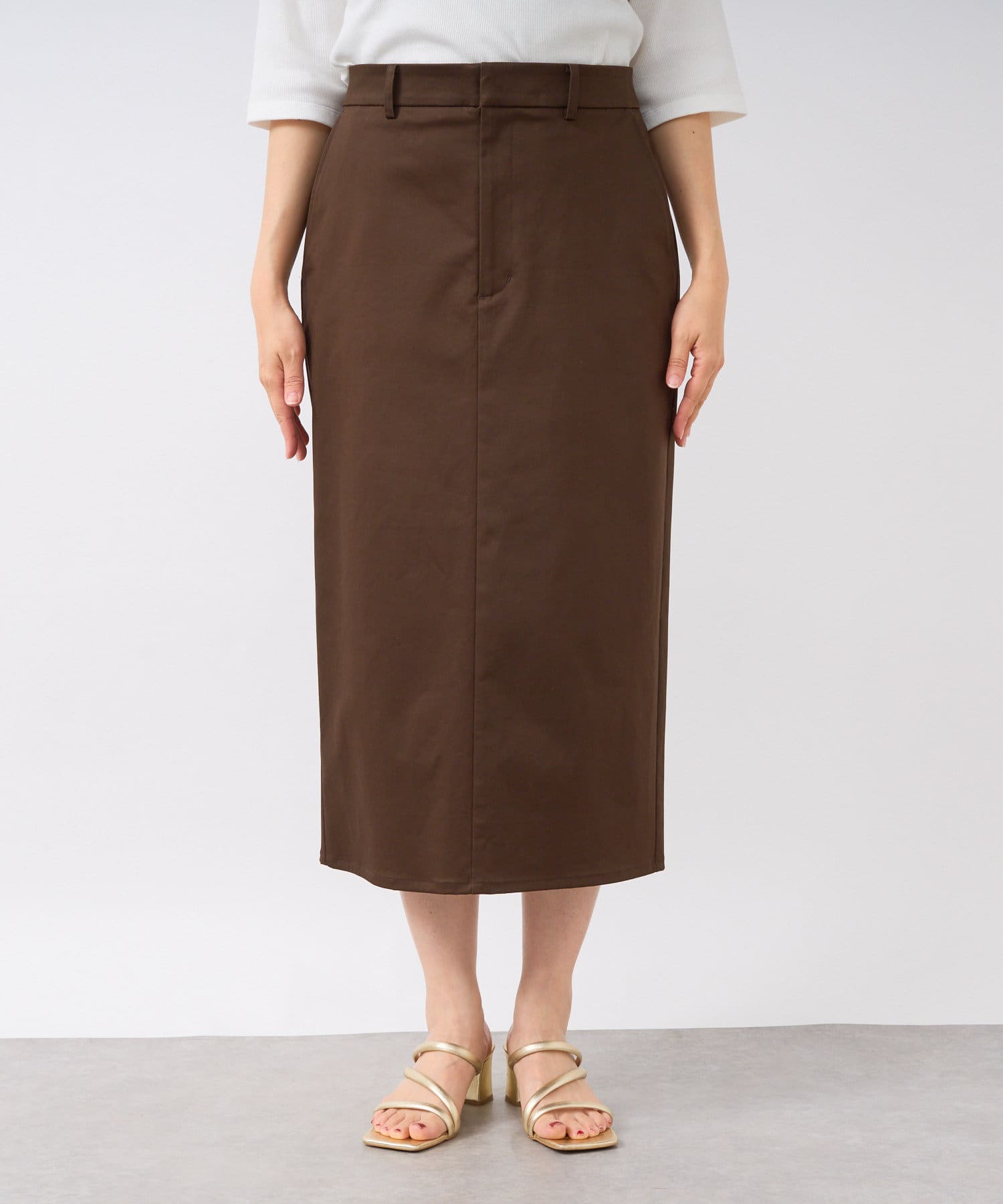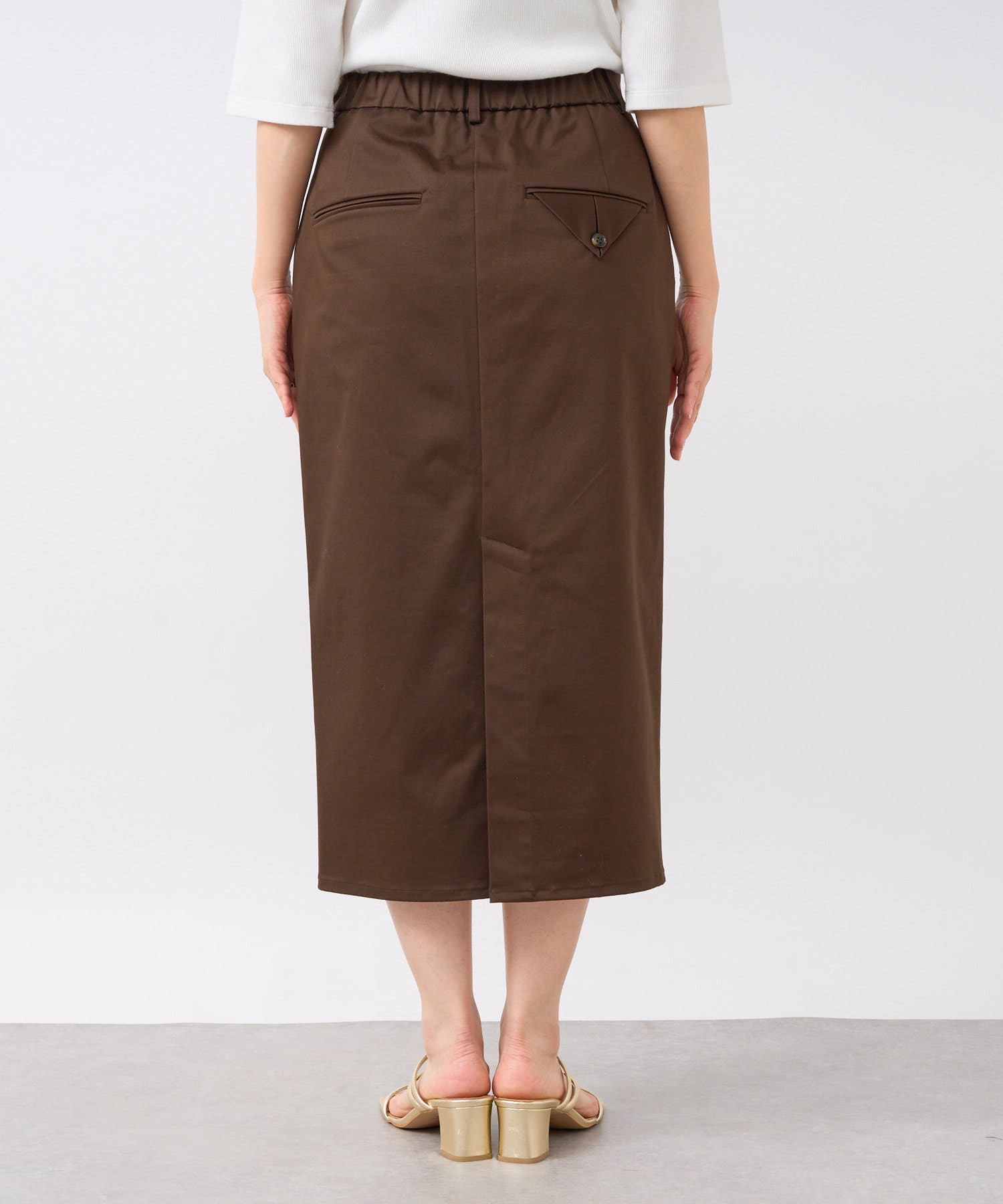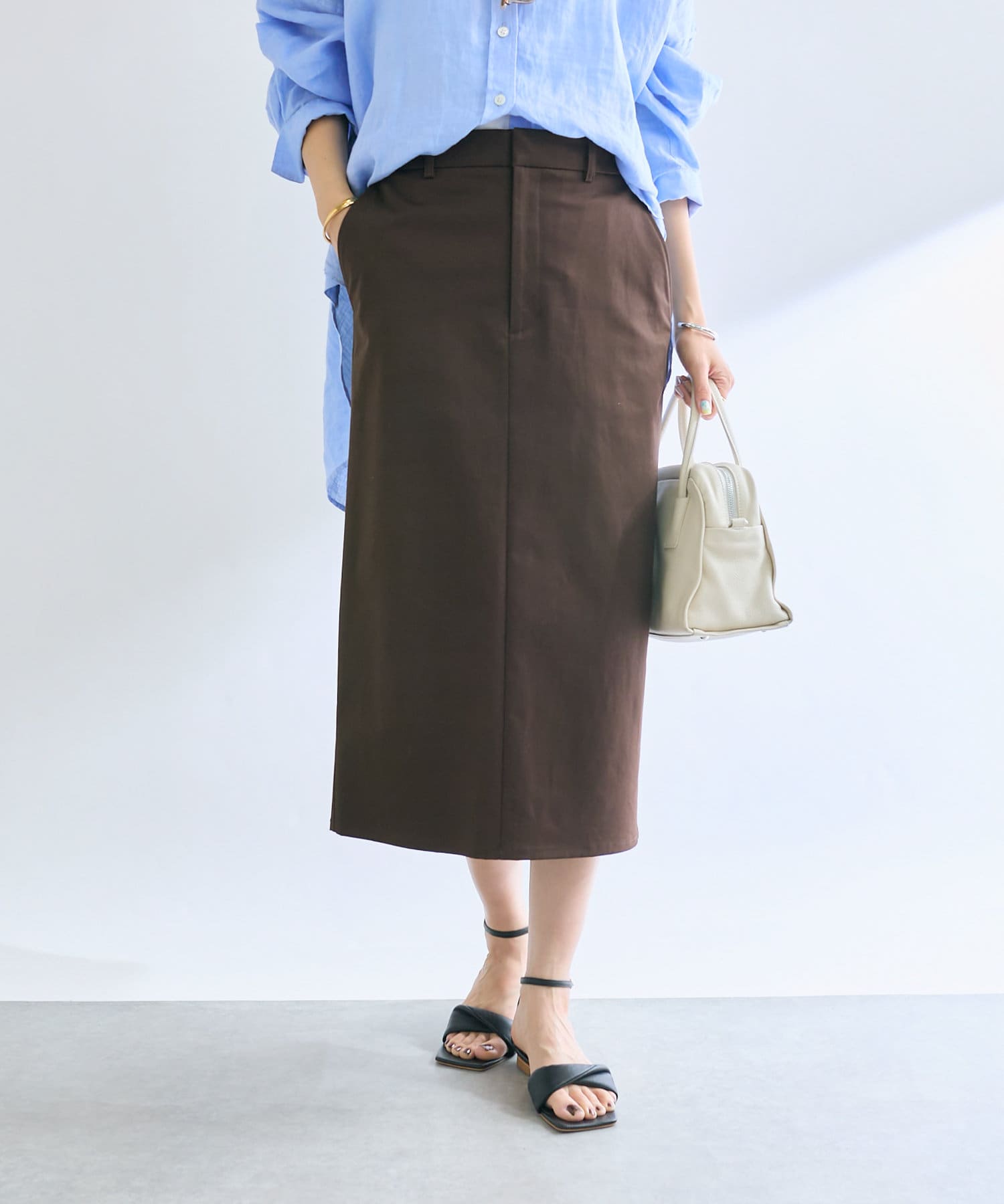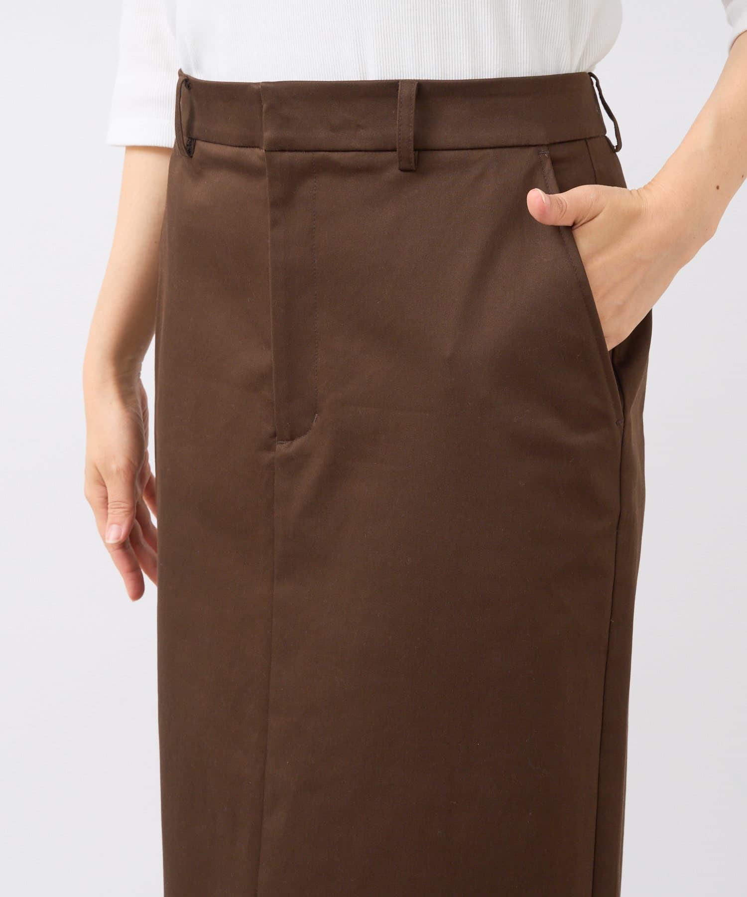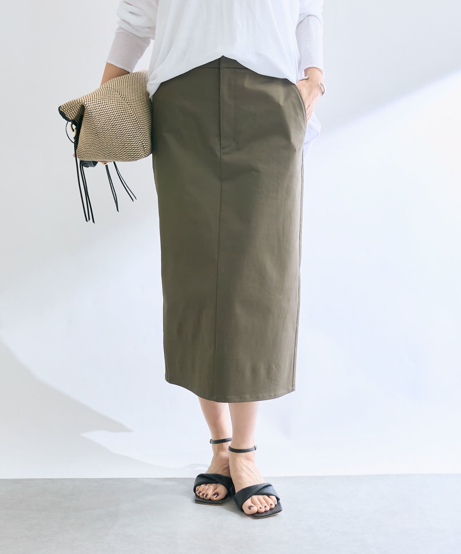 コットンサテンの光沢感がクリーンな印象のチノタイトスカート。
