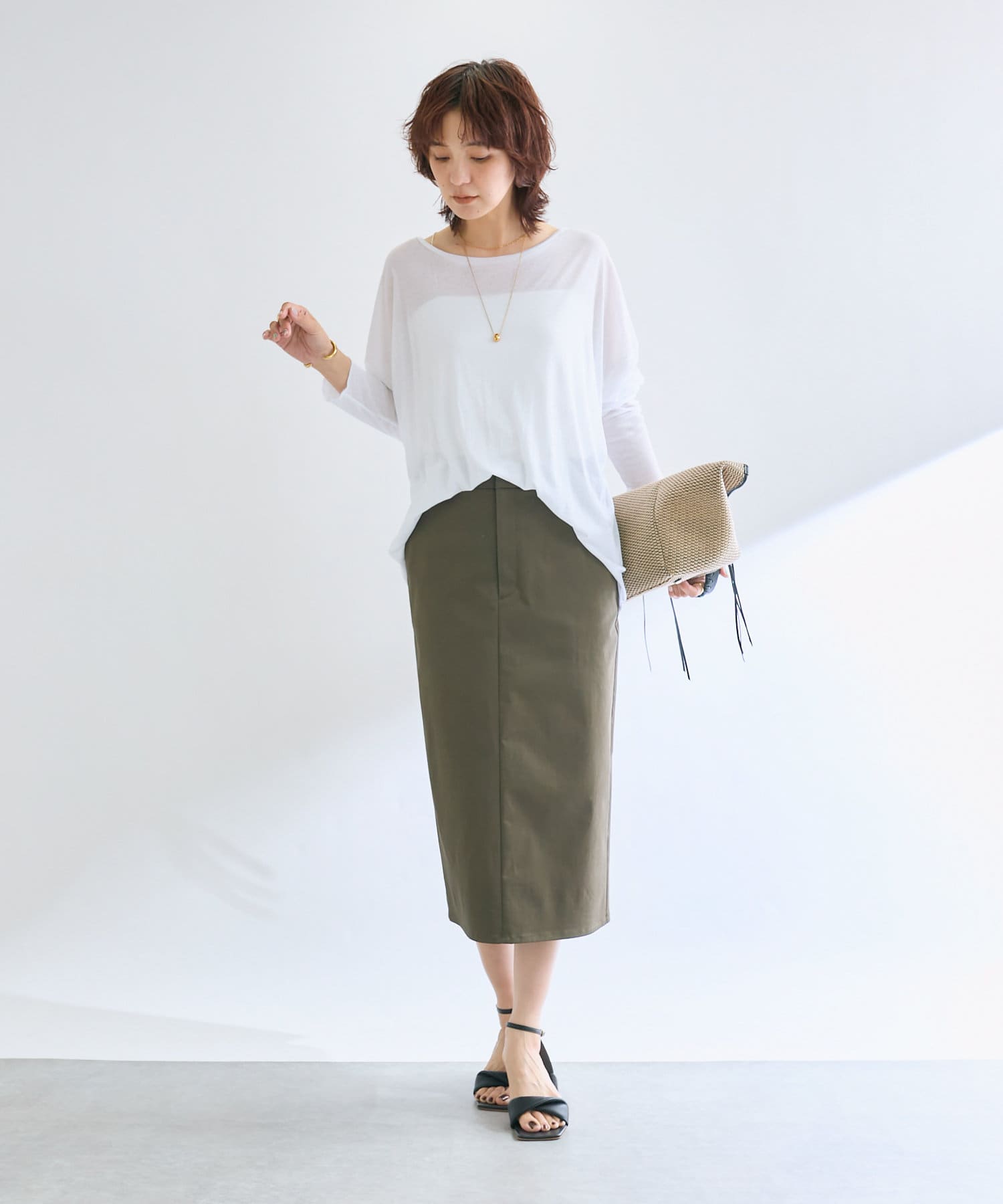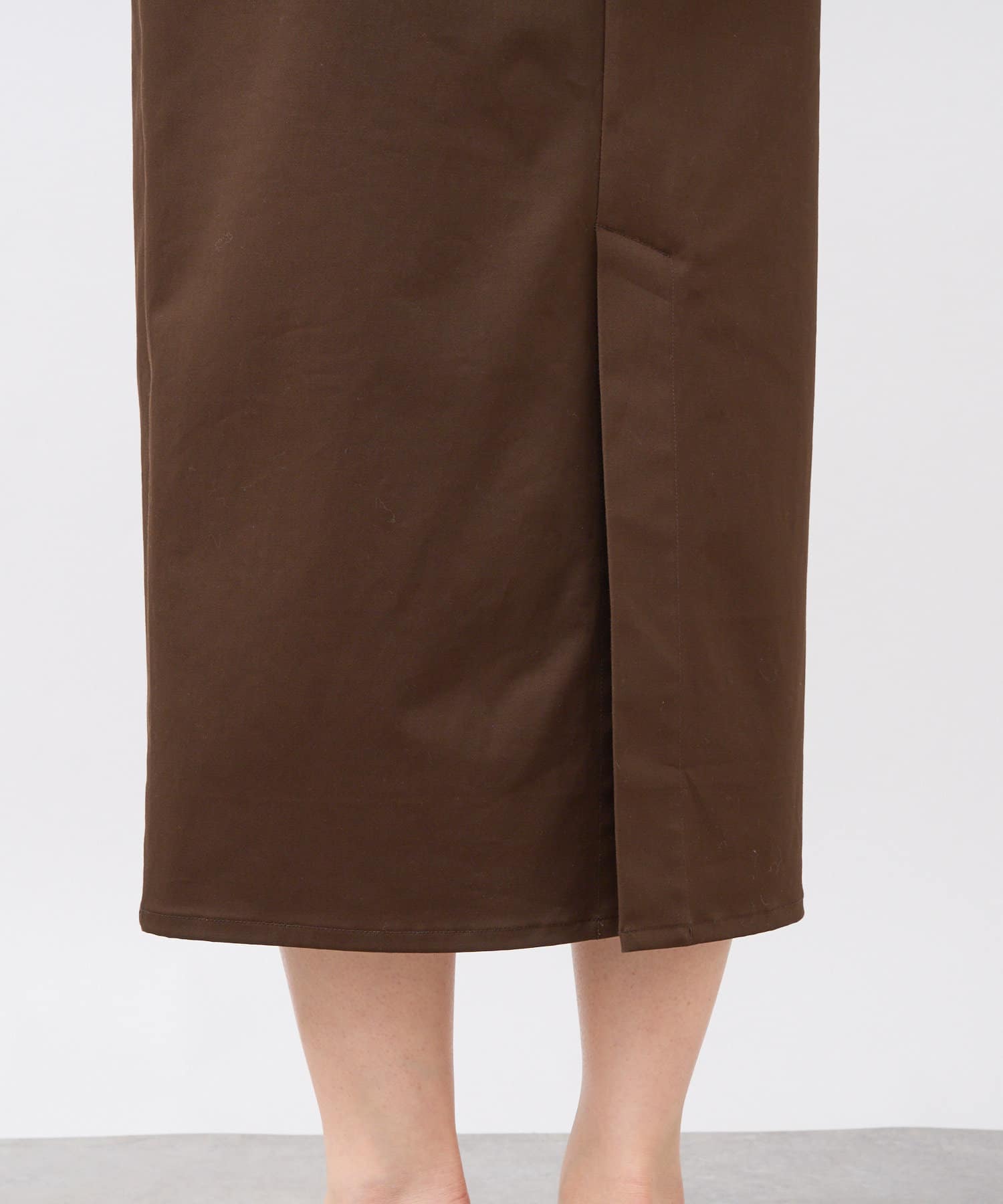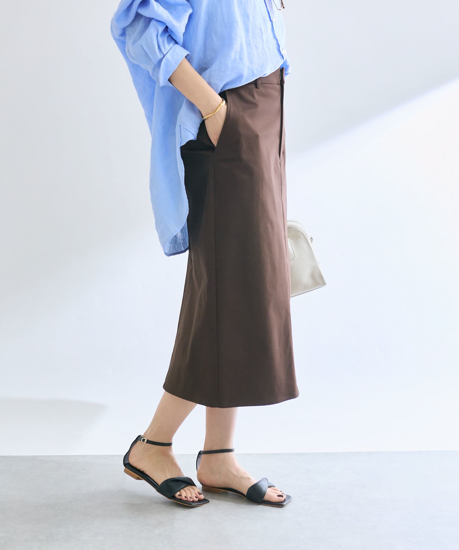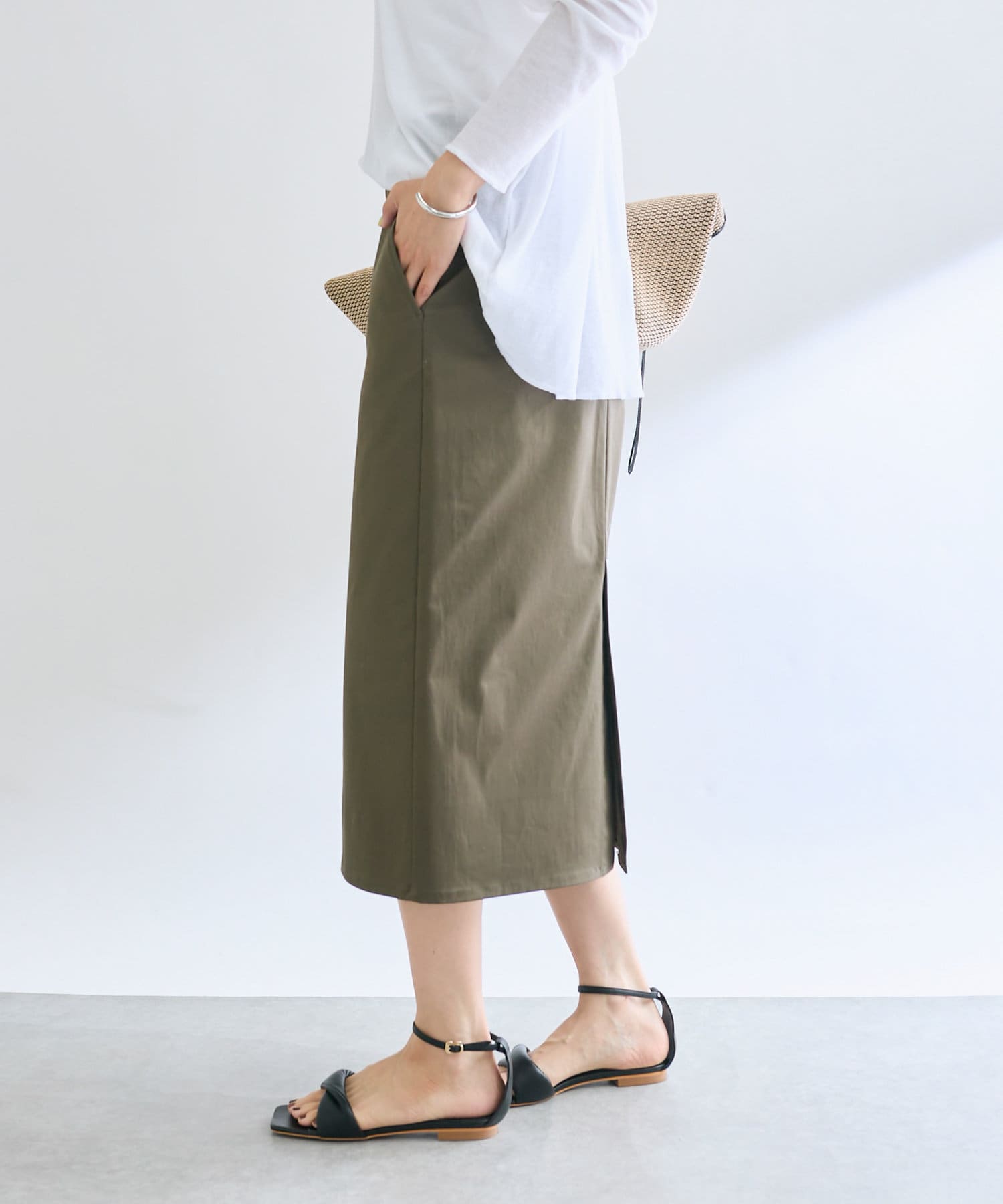 コットンサテンの光沢感がクリーンな印象のチノタイトスカート。