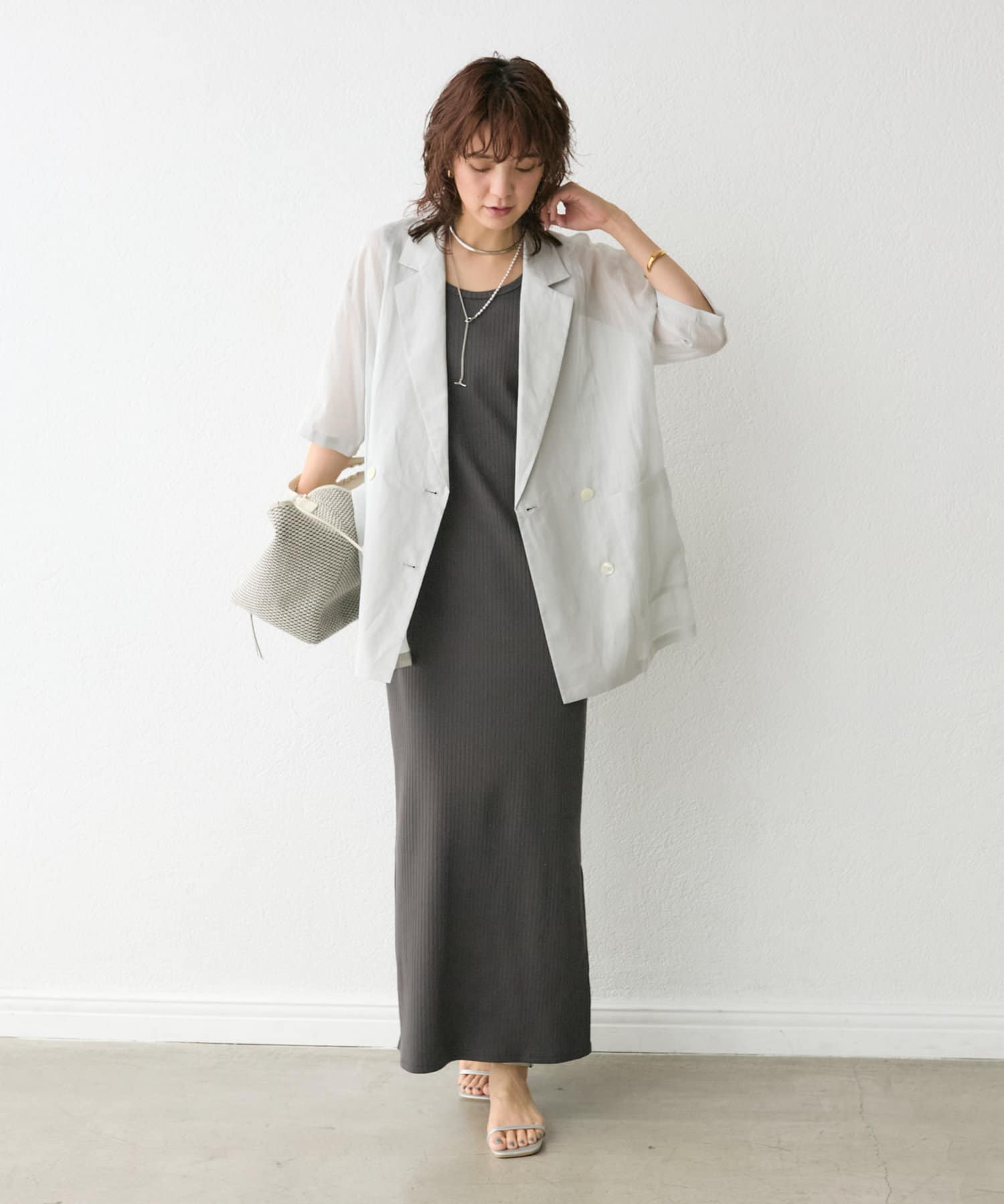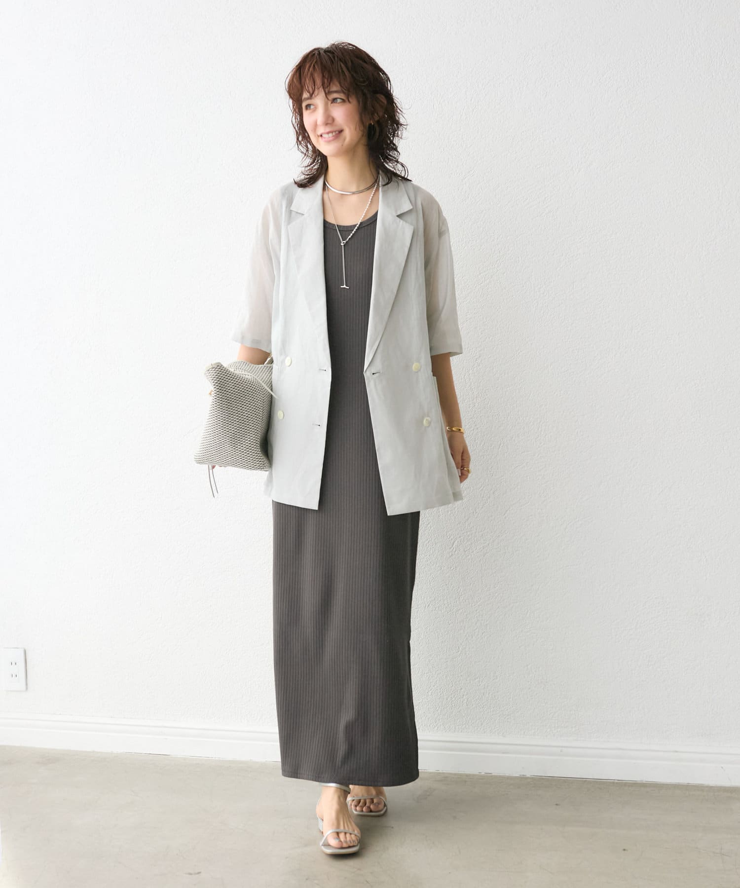 きちんと感のあるダブルブレストのテーラーカラーなので、シャツよりも上品見えします。