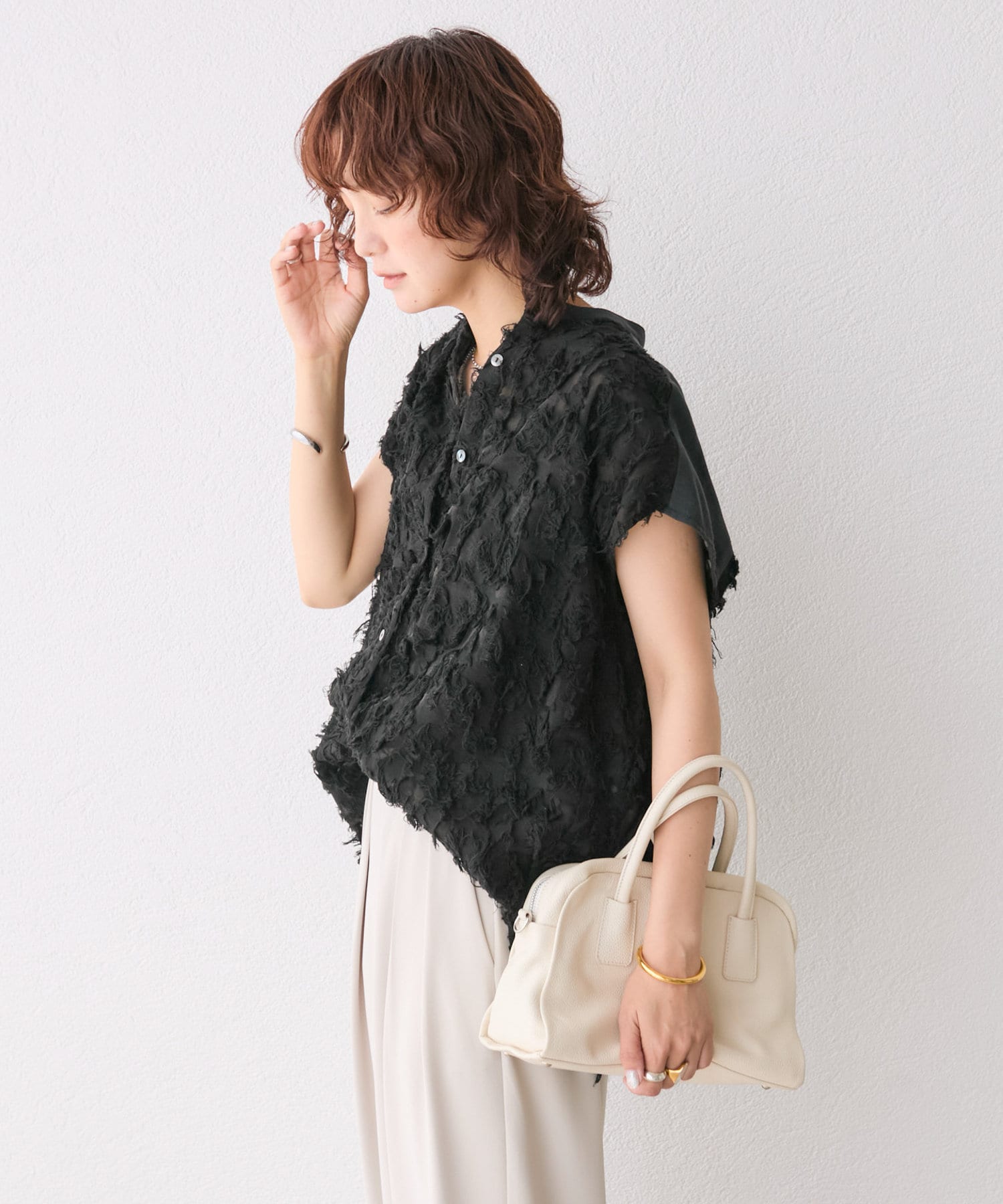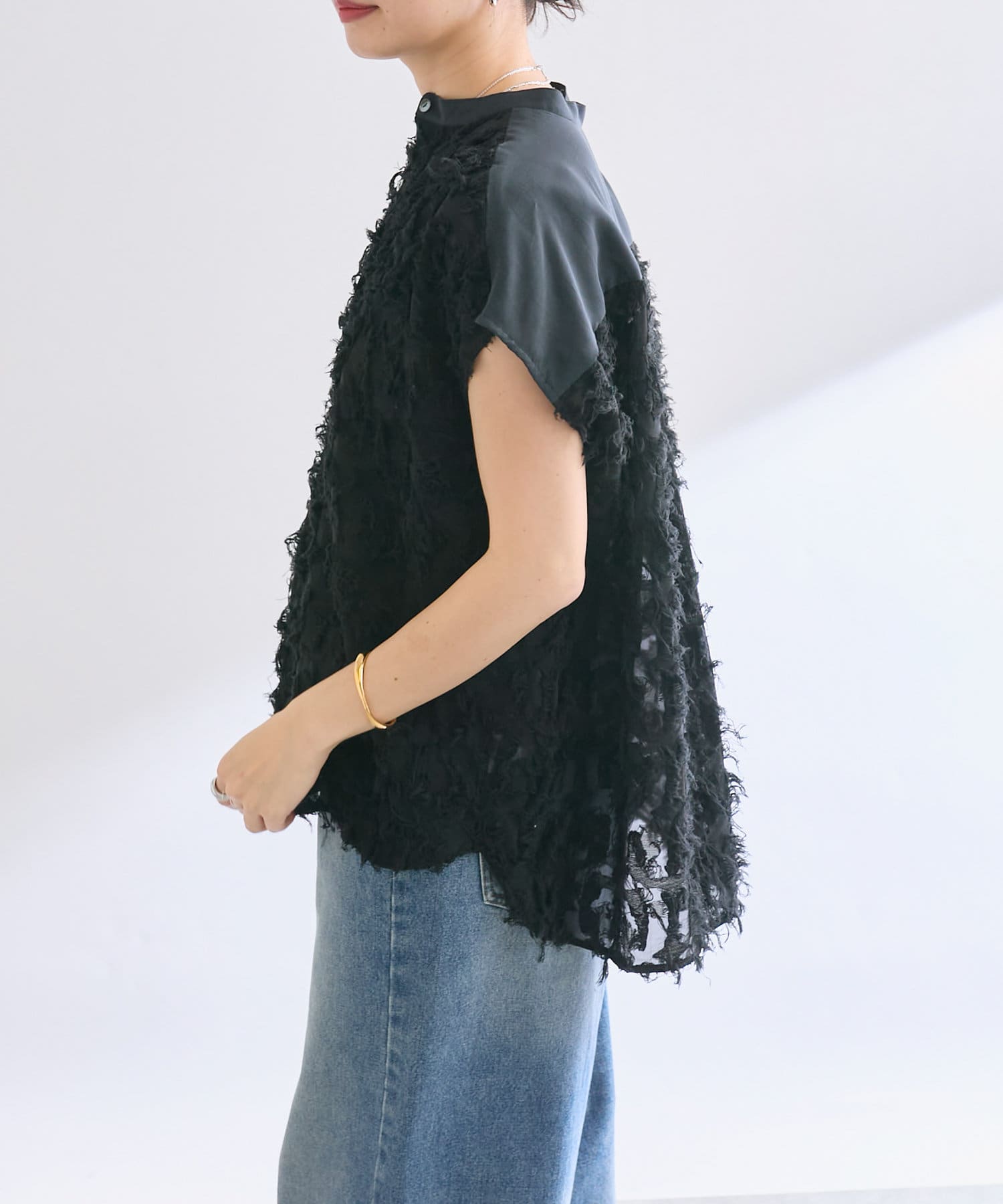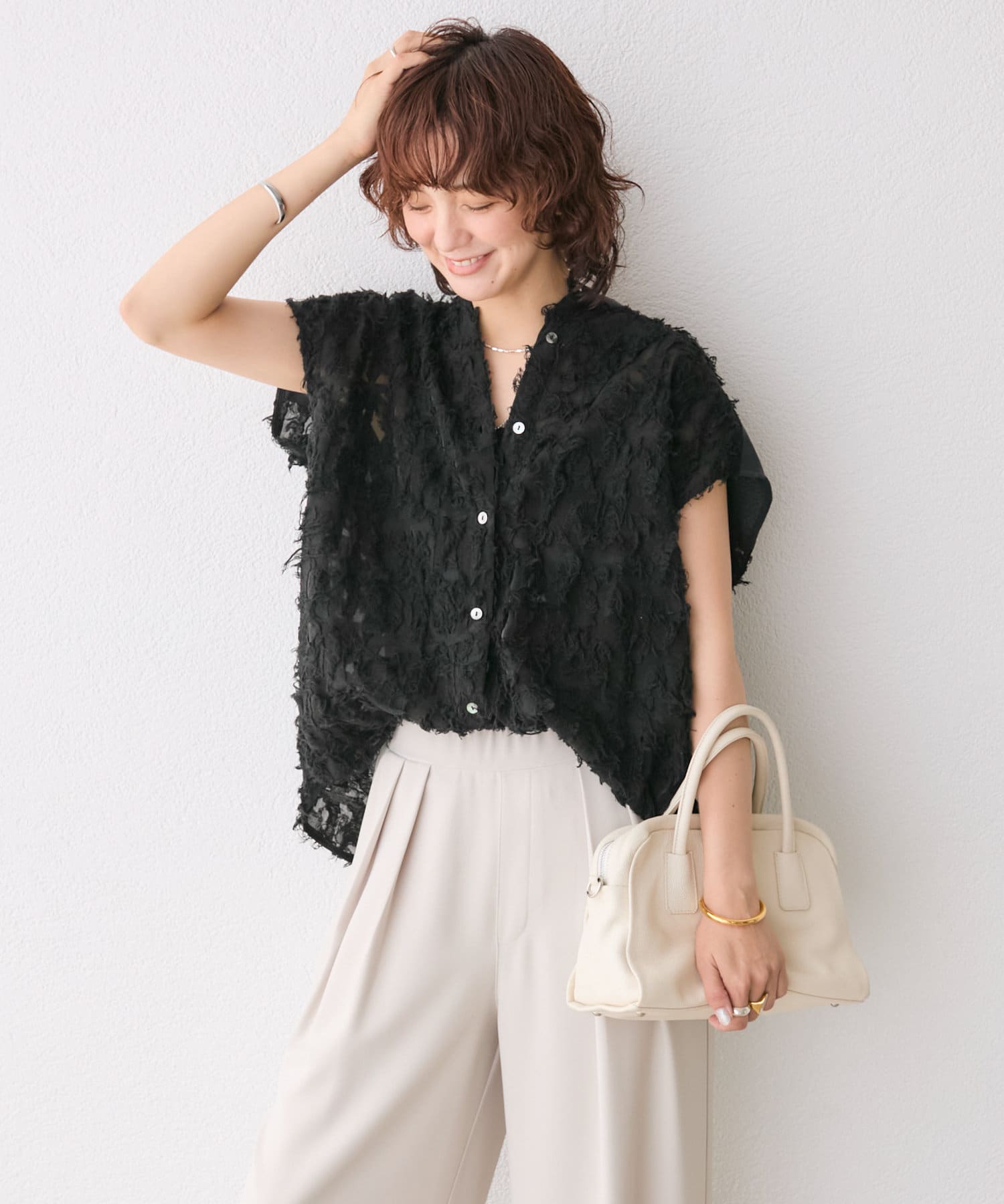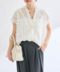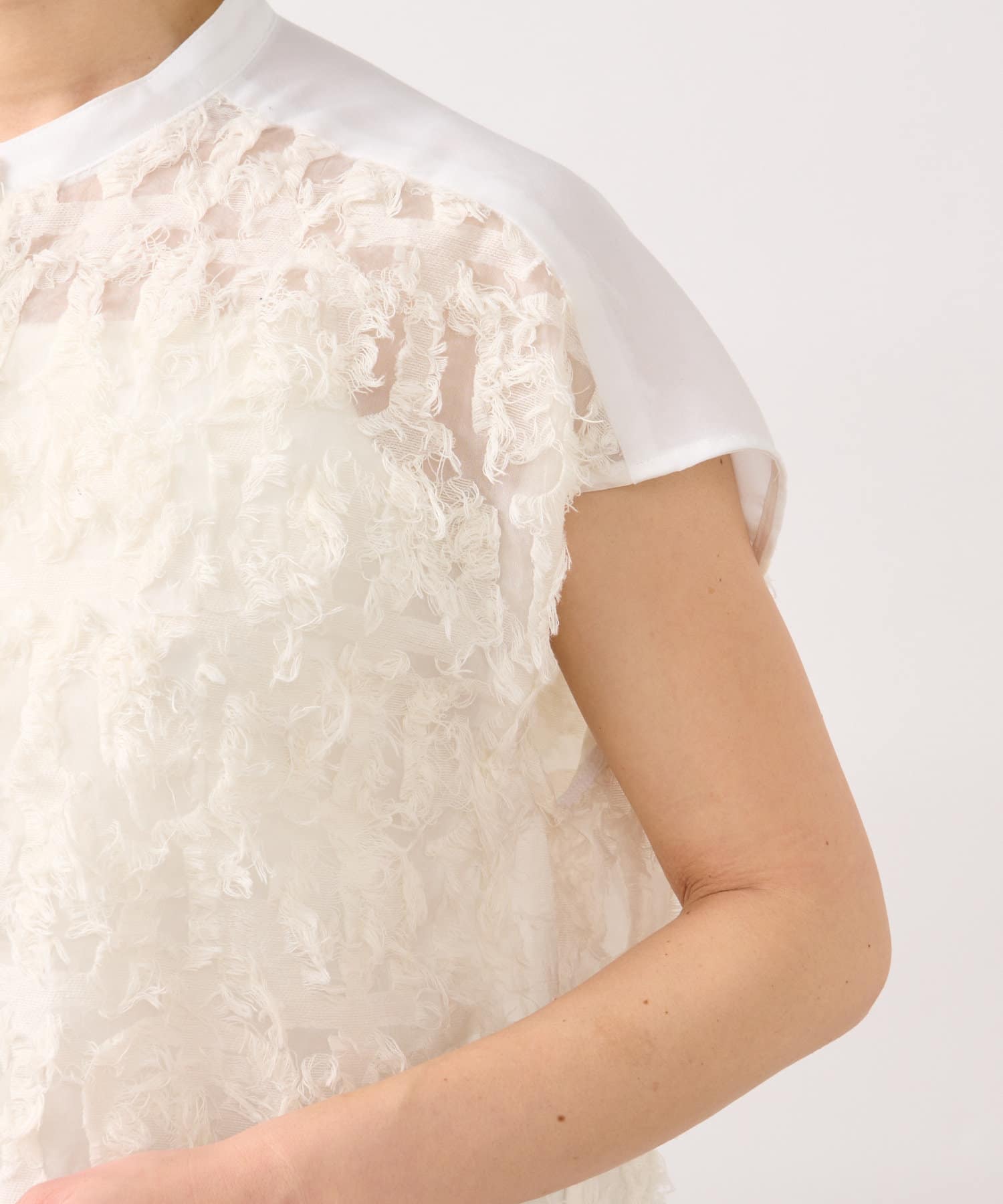 立体的なジャガード素材を使用した華やかな半袖ブラウス。