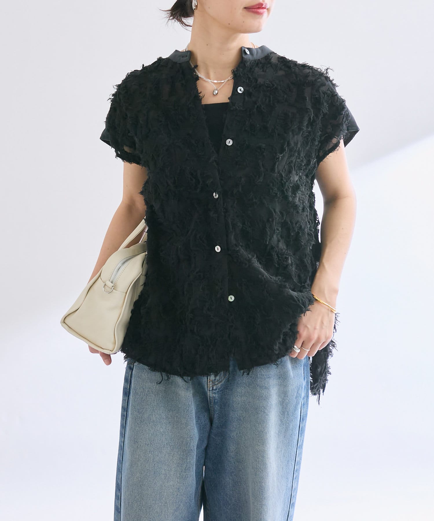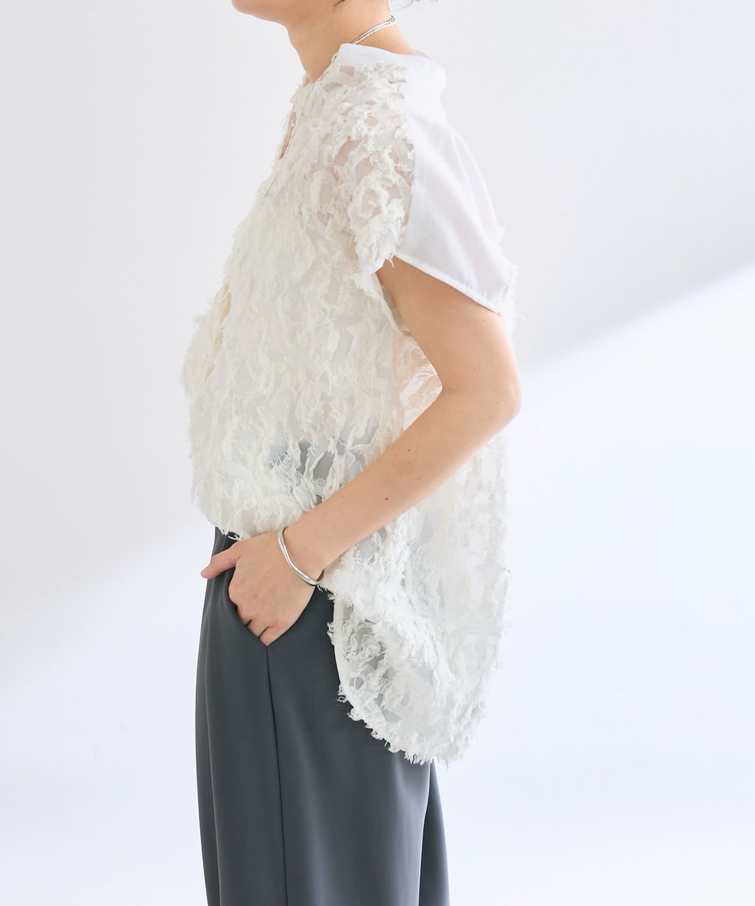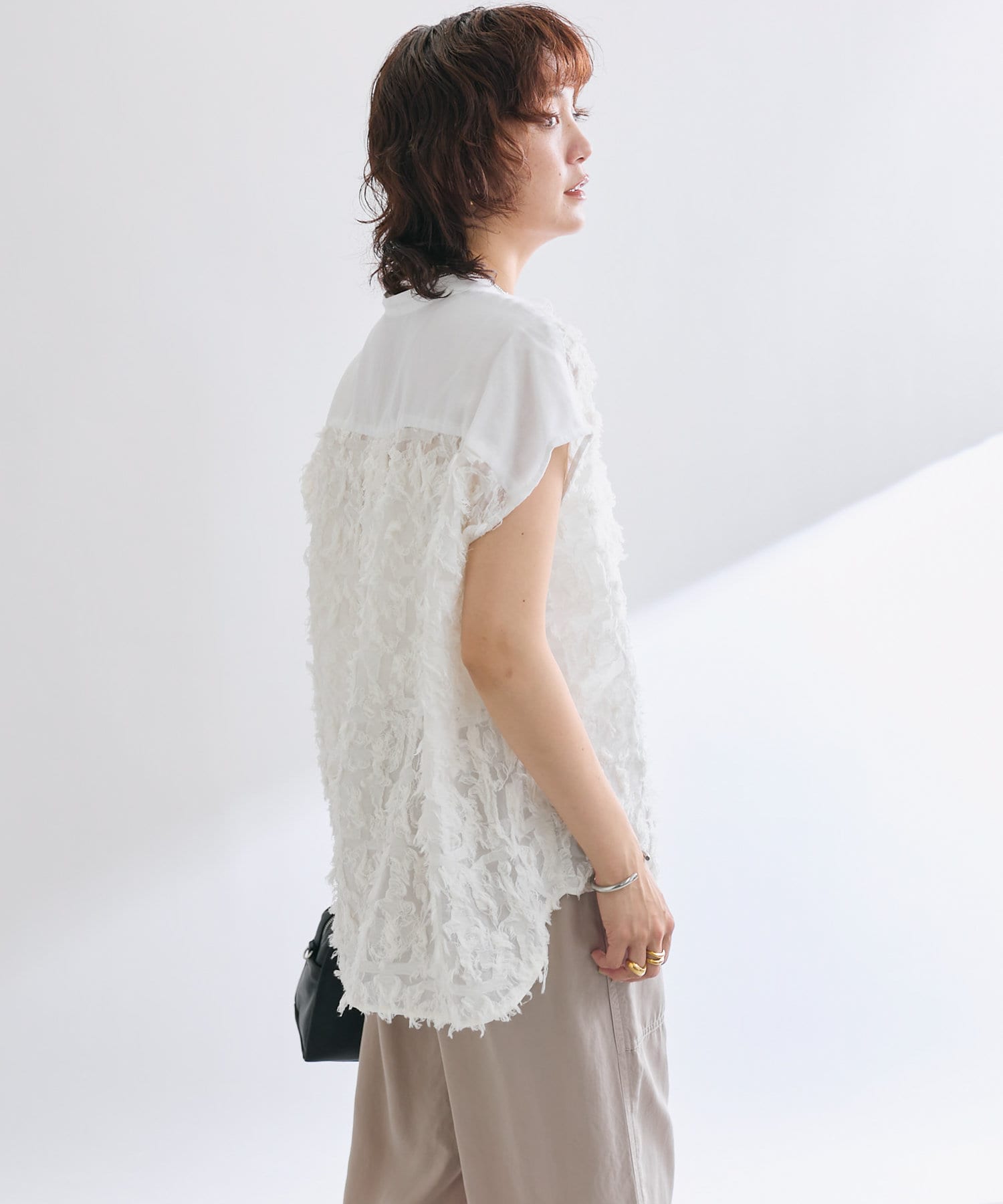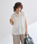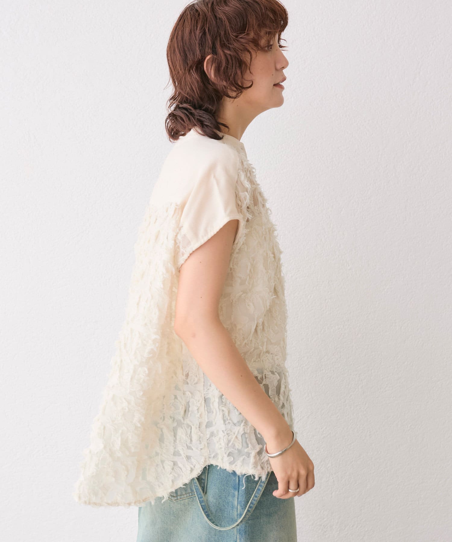 立体的なジャガード素材を使用した華やかな半袖ブラウス。