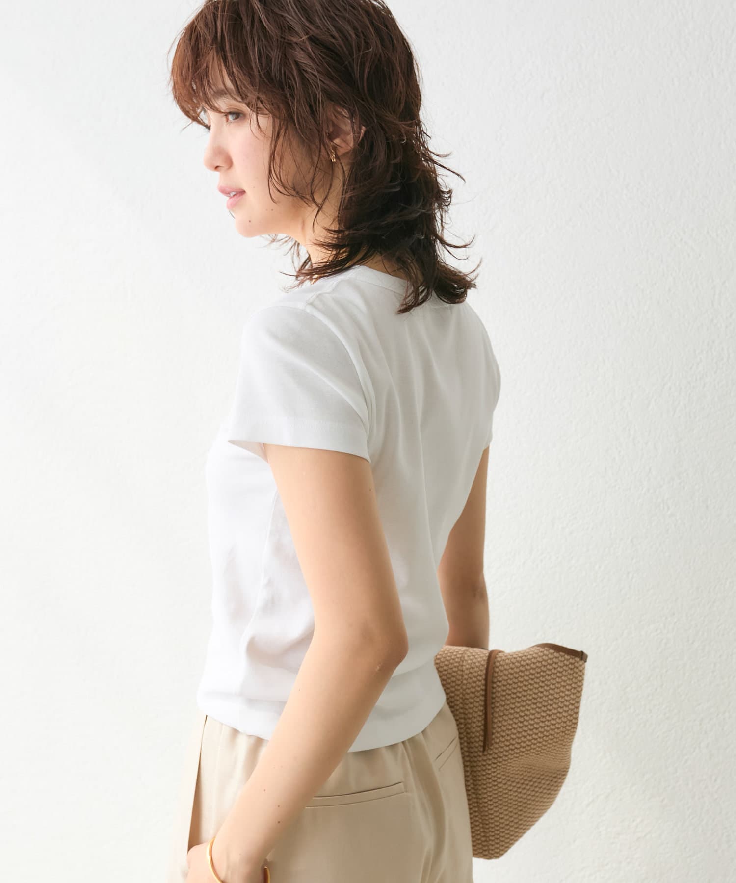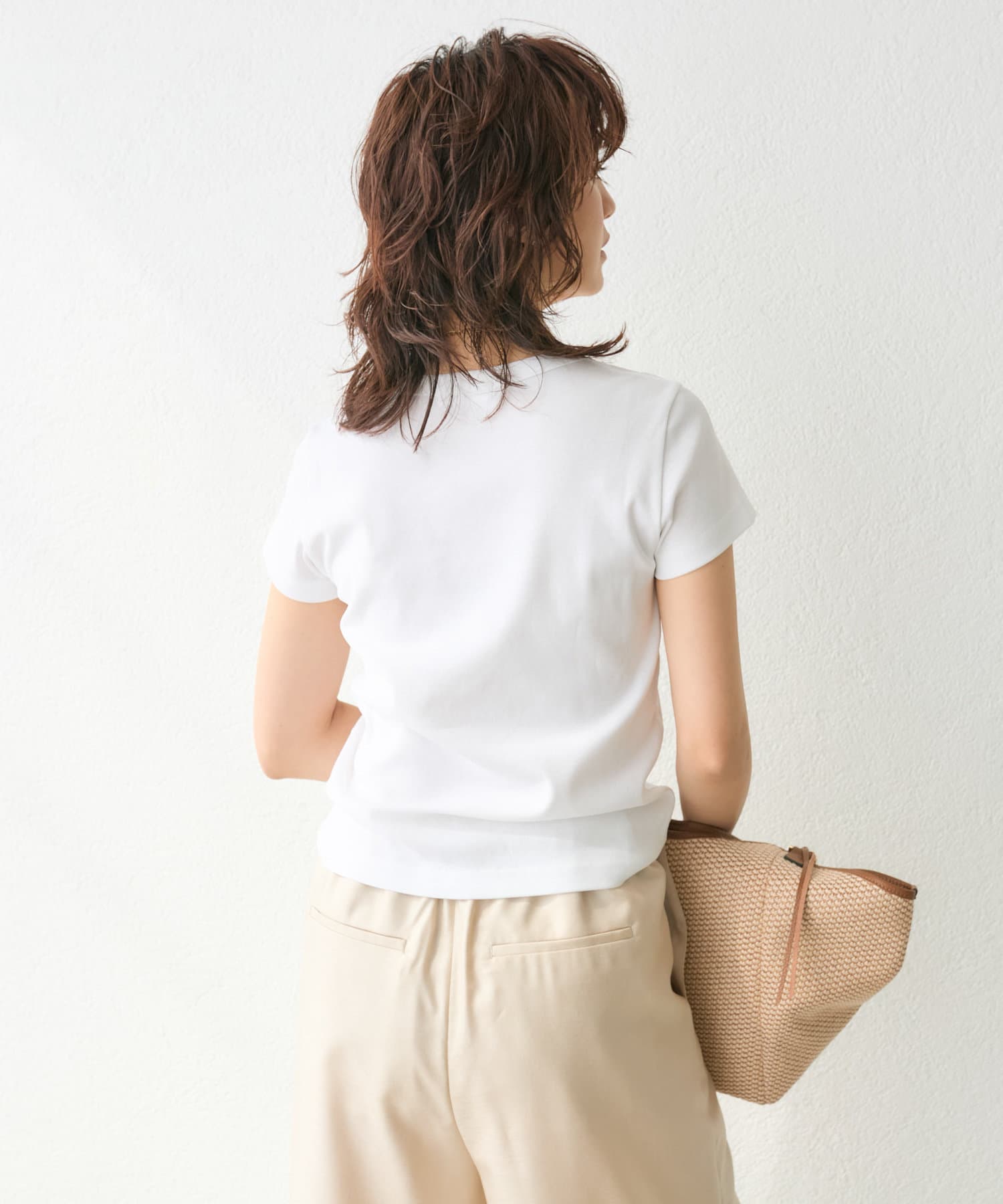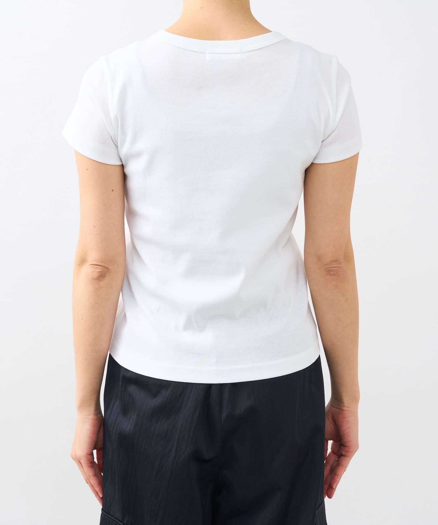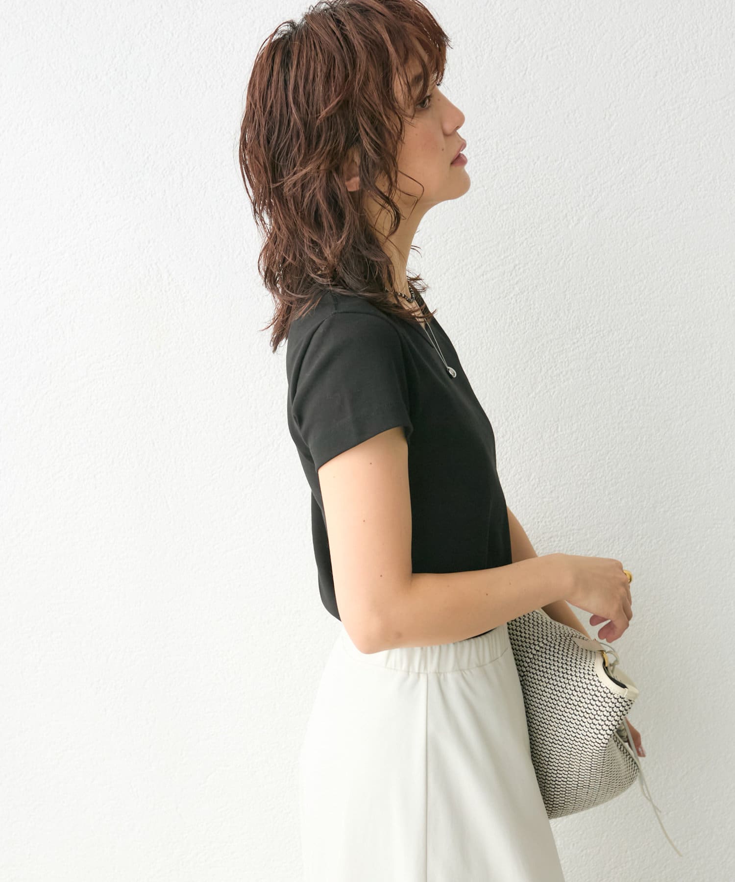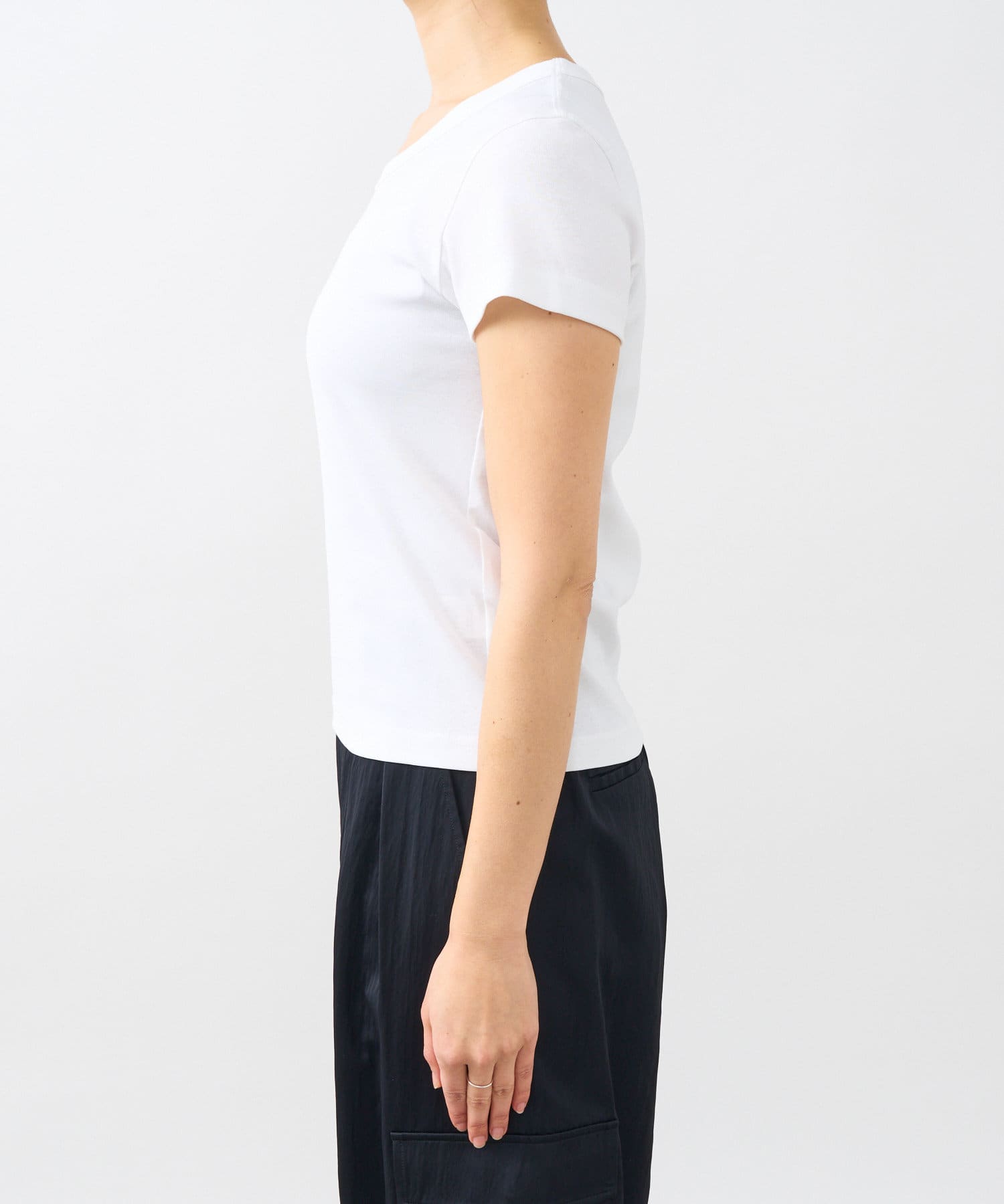 毛羽のないクリアな表面感の素材を使用したミニマルなTシャツ。