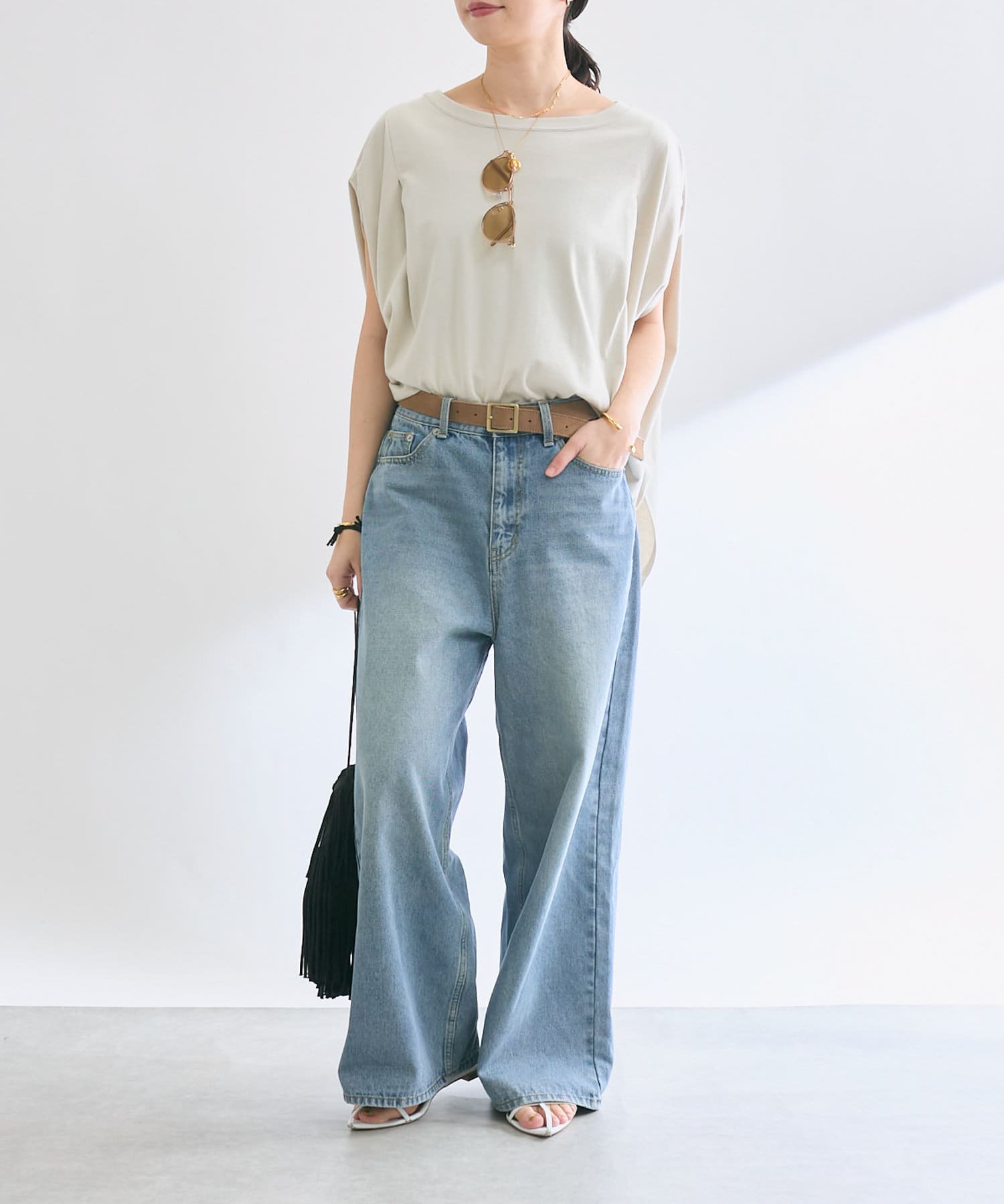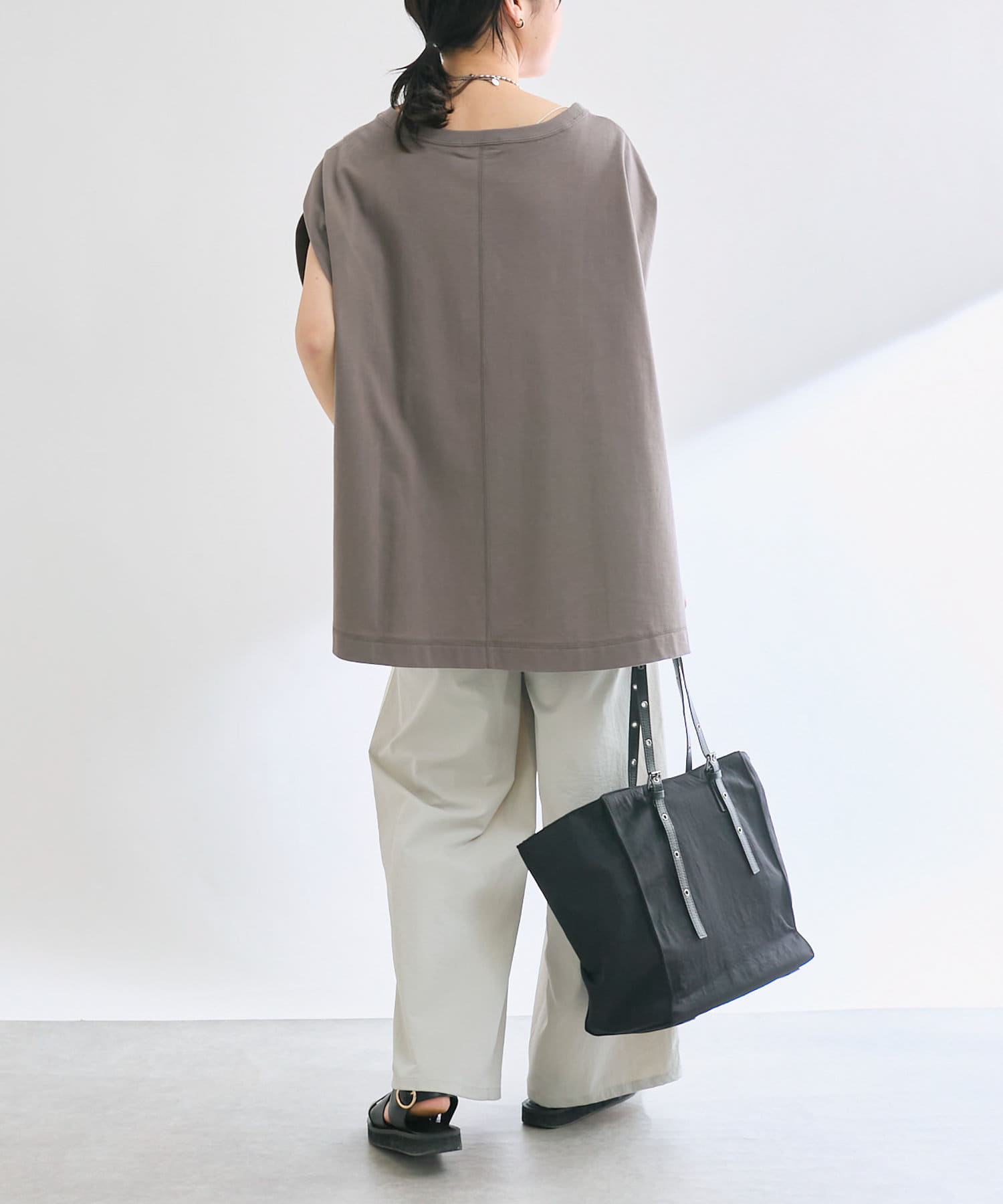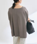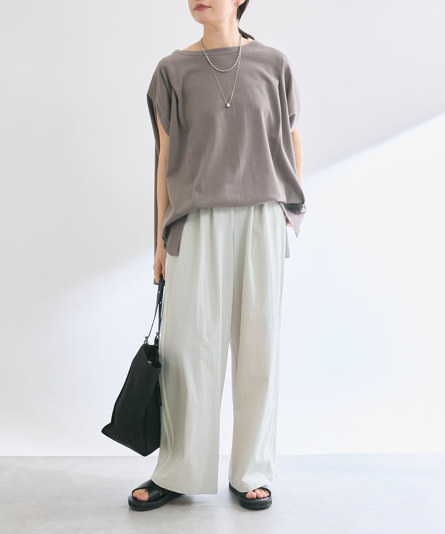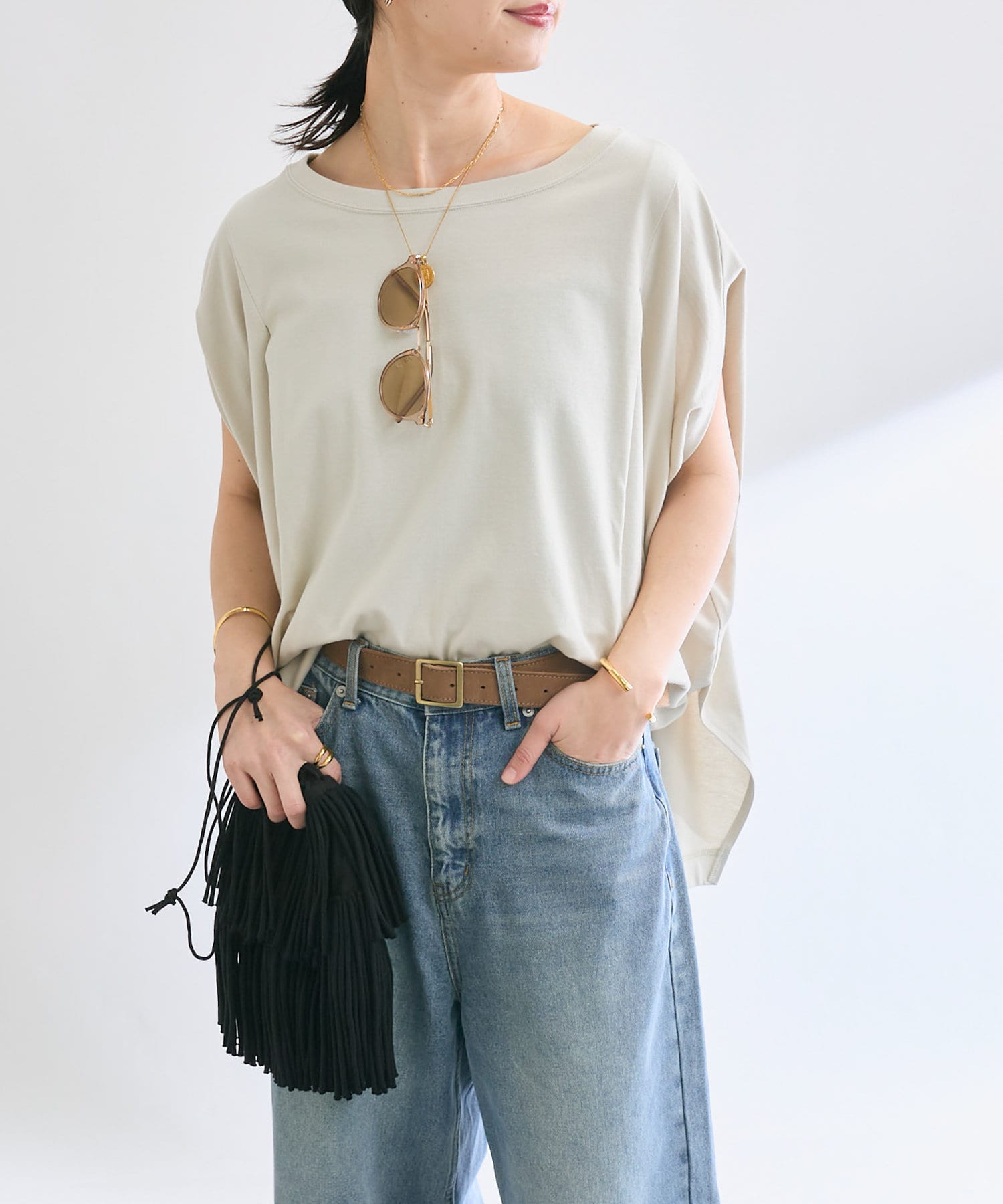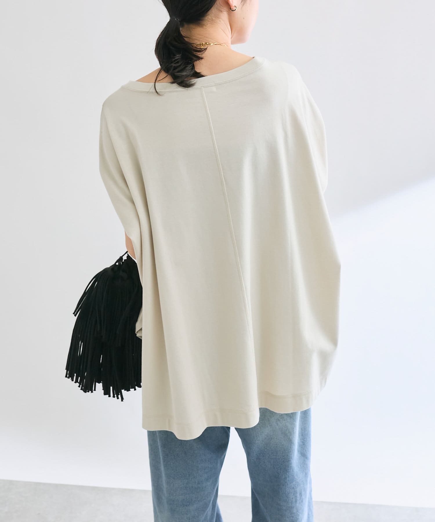 体のラインを拾いにくいしっかり目の素材感で合わせるボトムを選ばない汎用性の高い1枚です。