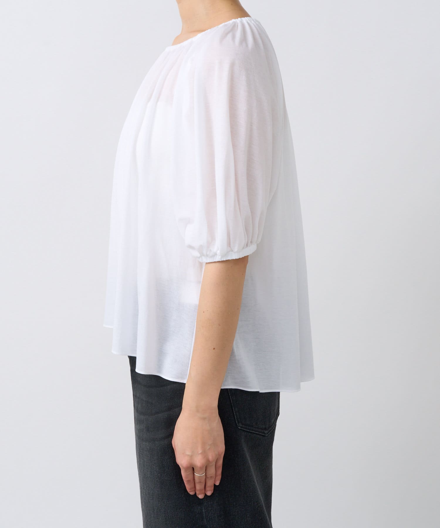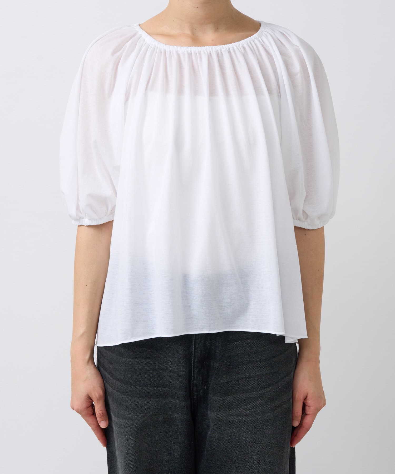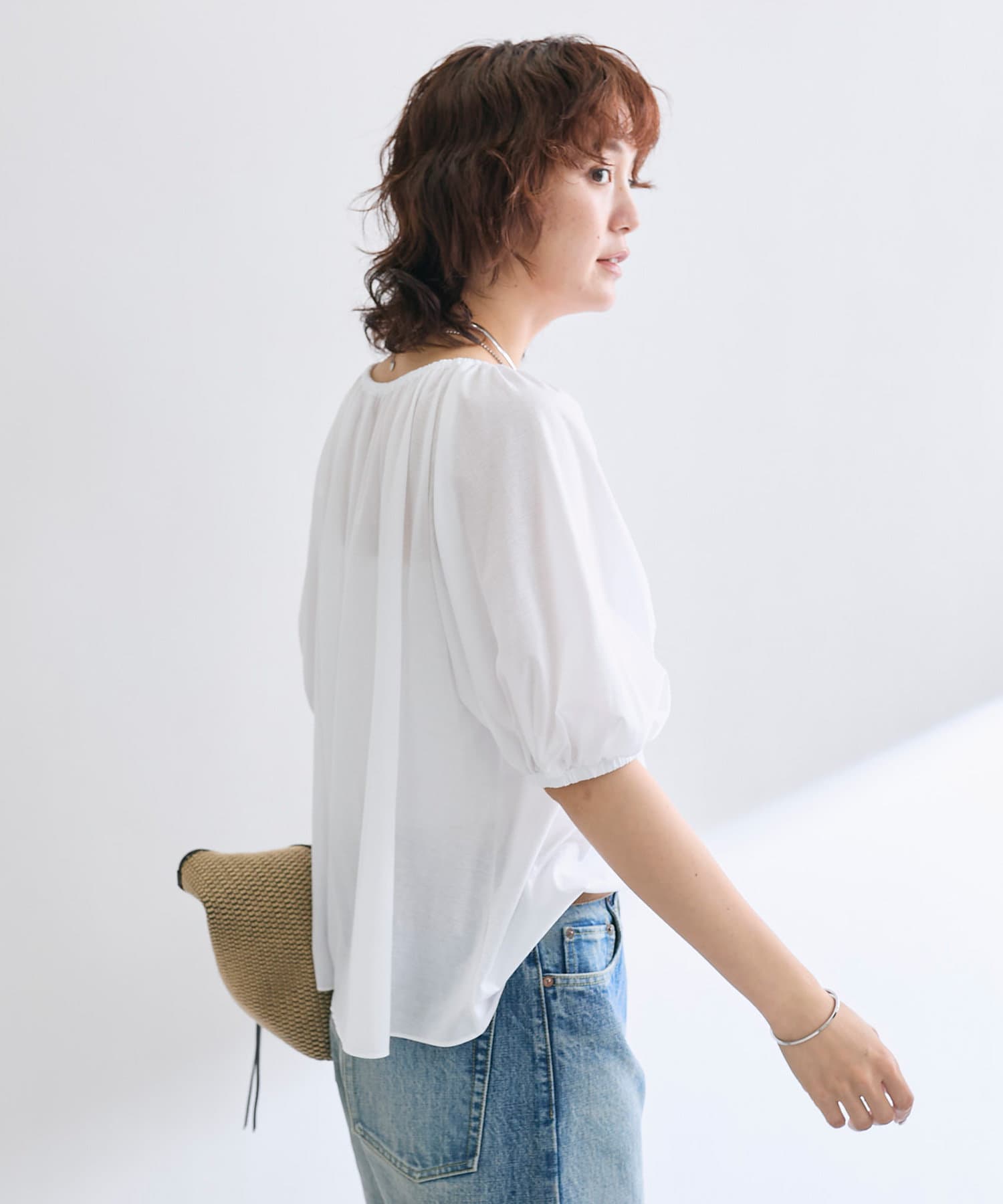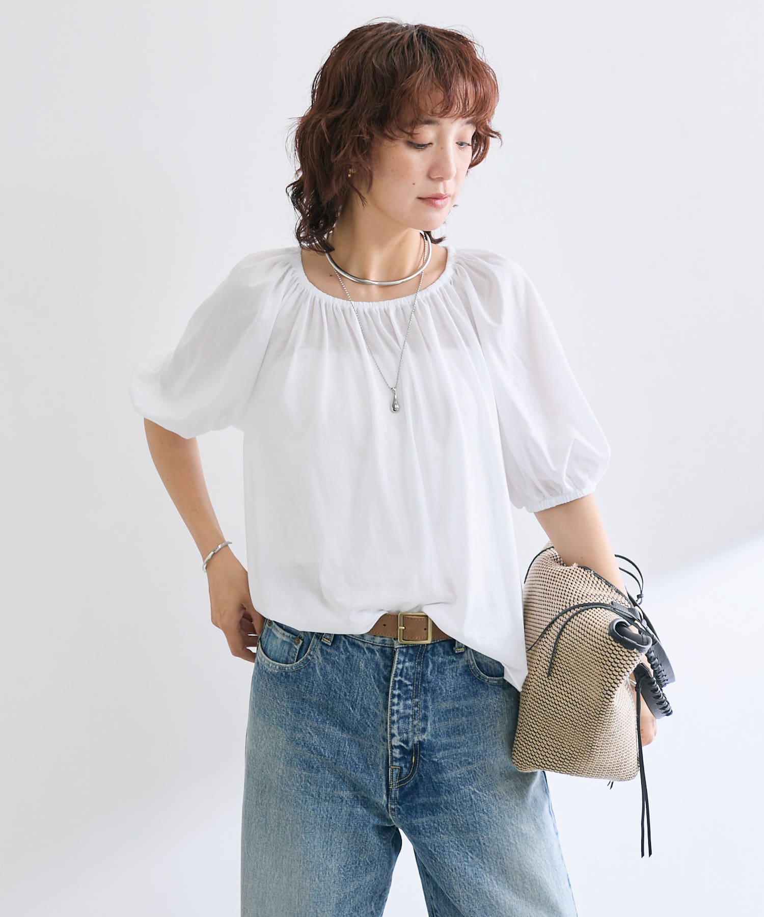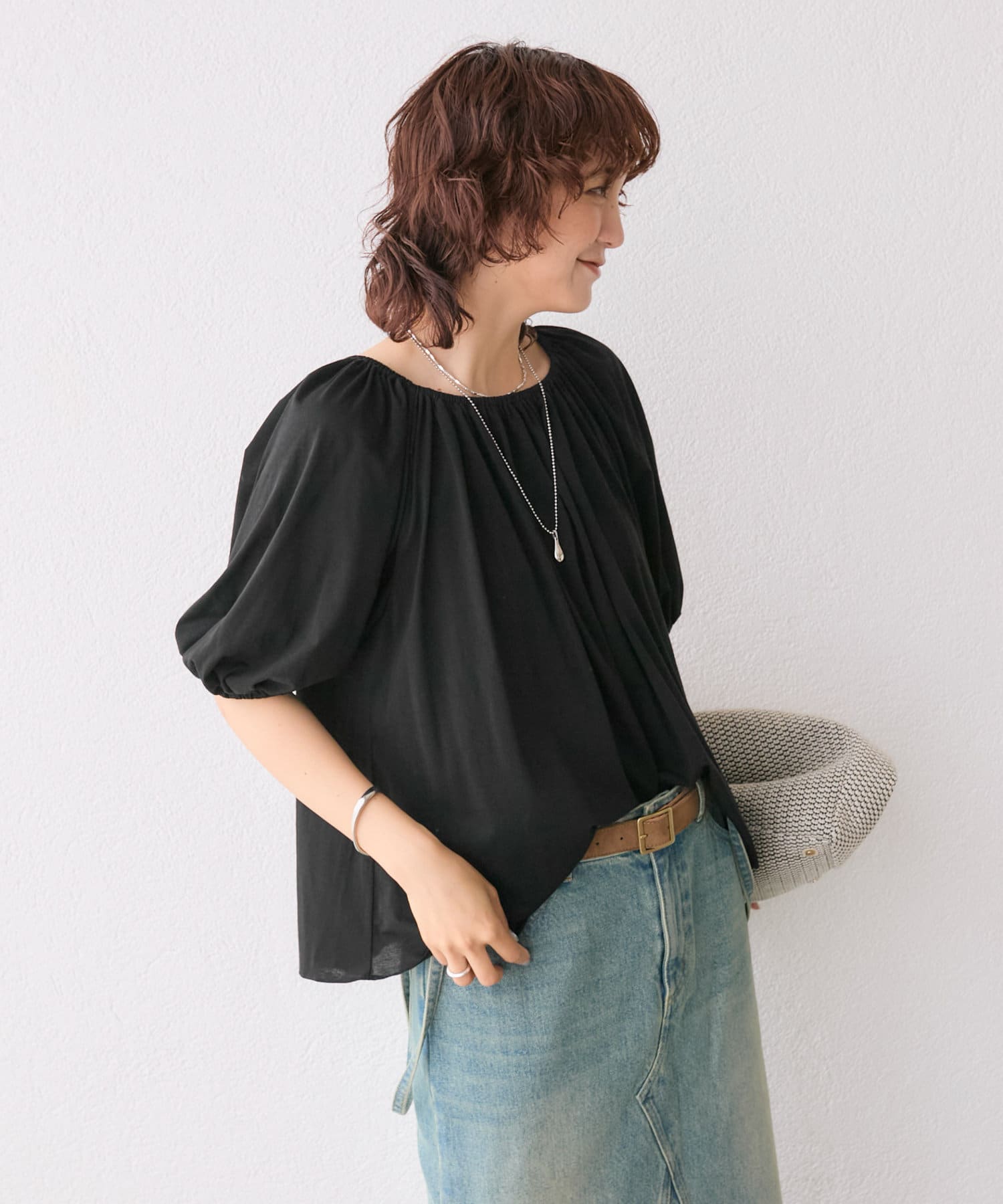衿ぐりと袖口にたっぷりとギャザーを入れた、女性らしさを演出してくれるアイテムです。