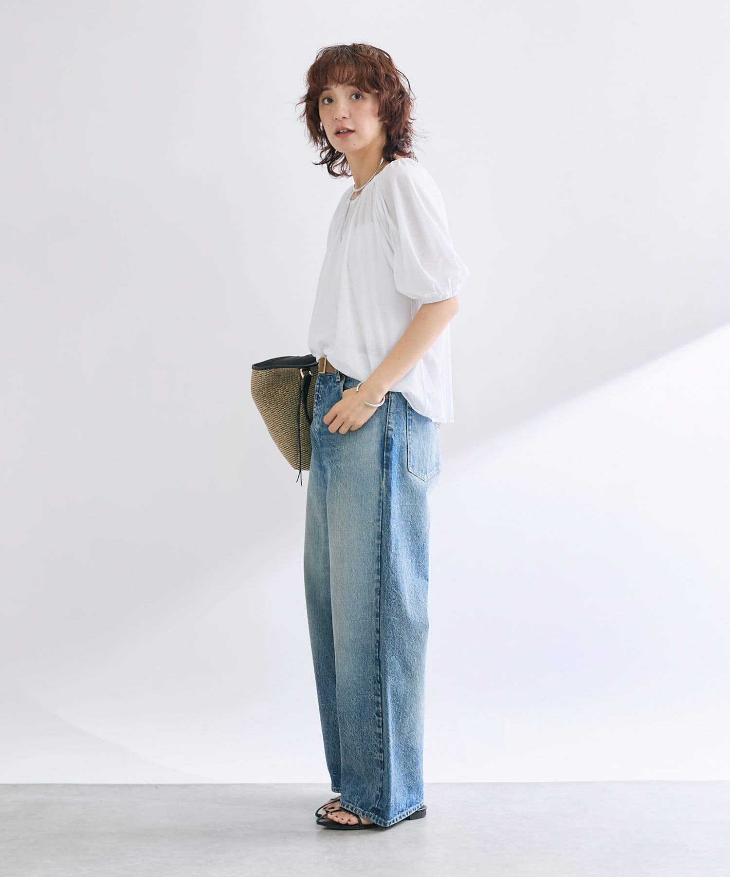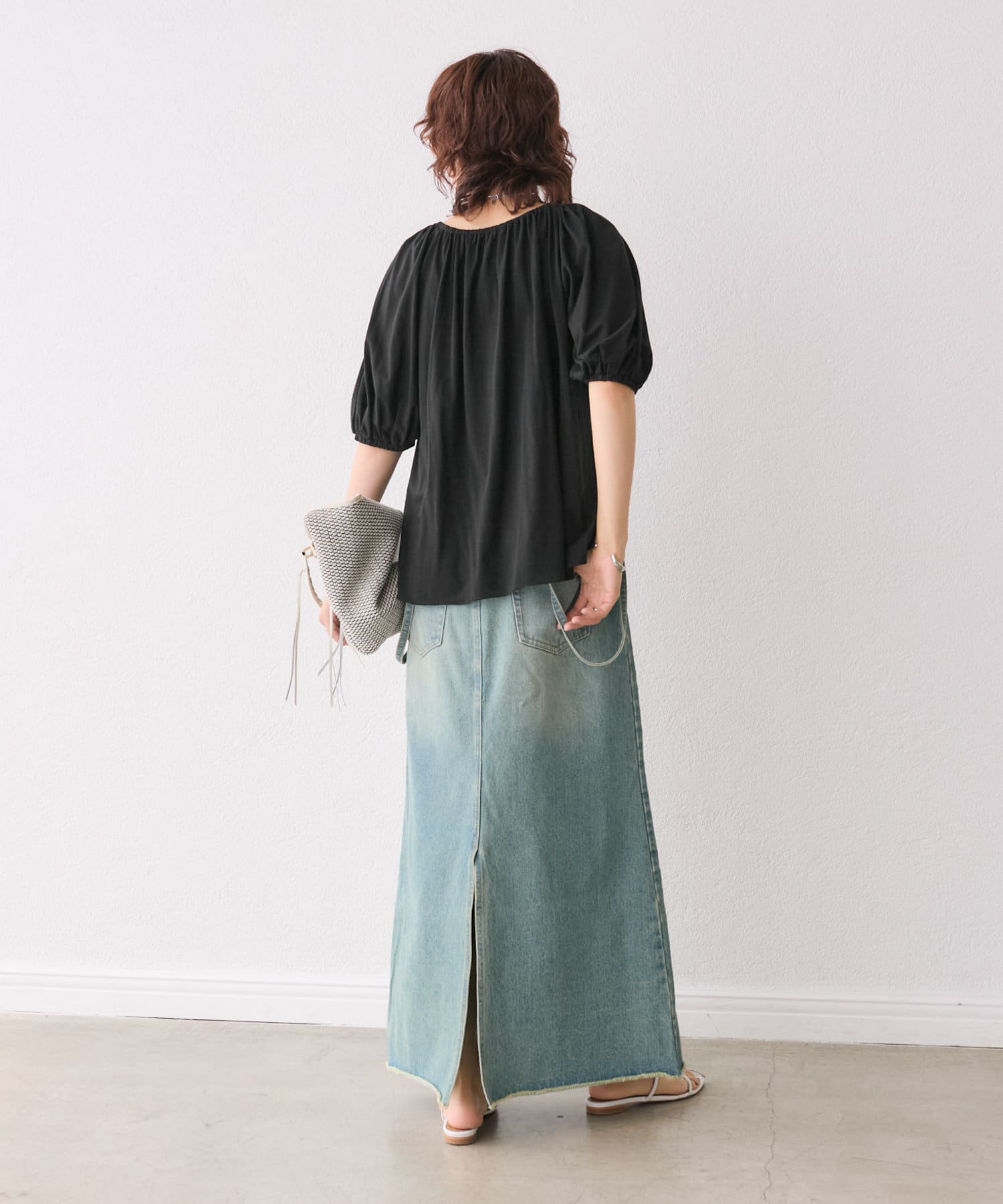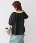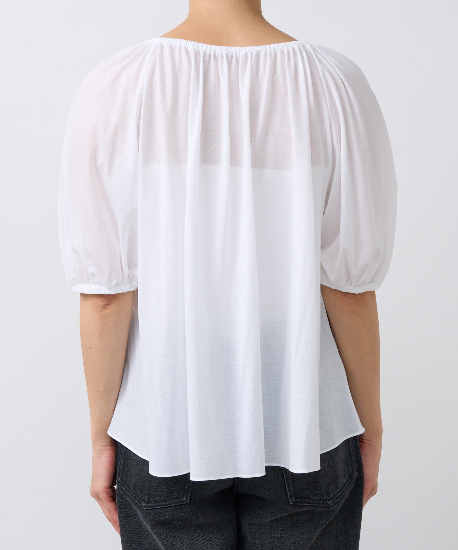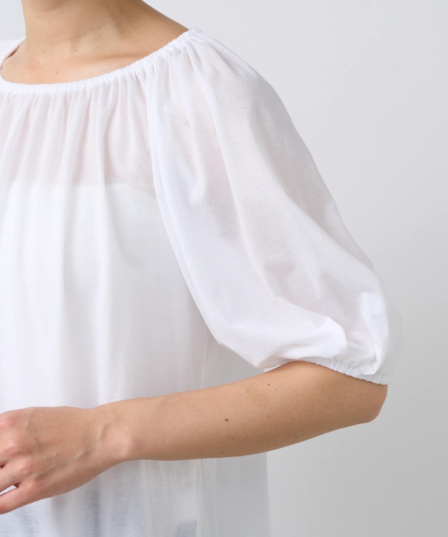 衿ぐりと袖口にたっぷりとギャザーを入れた、女性らしさを演出してくれるアイテムです。