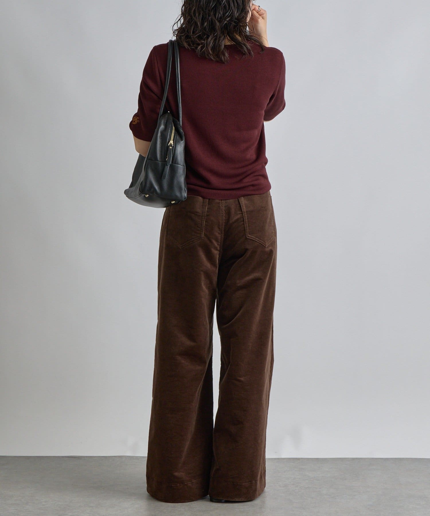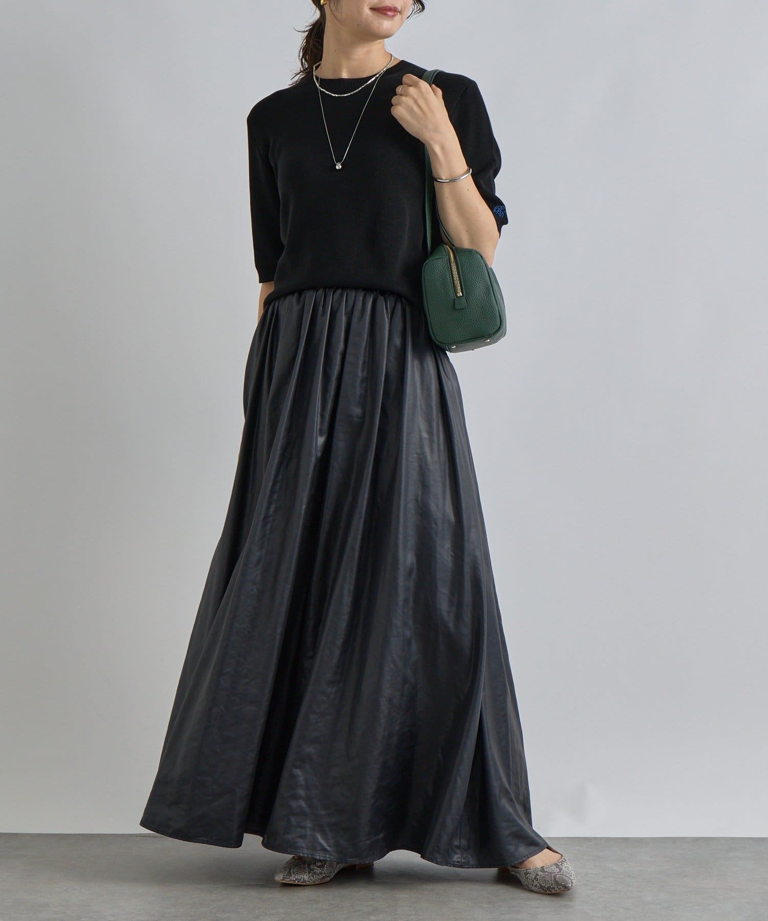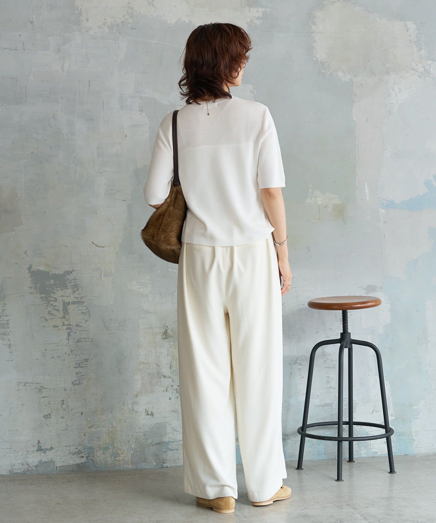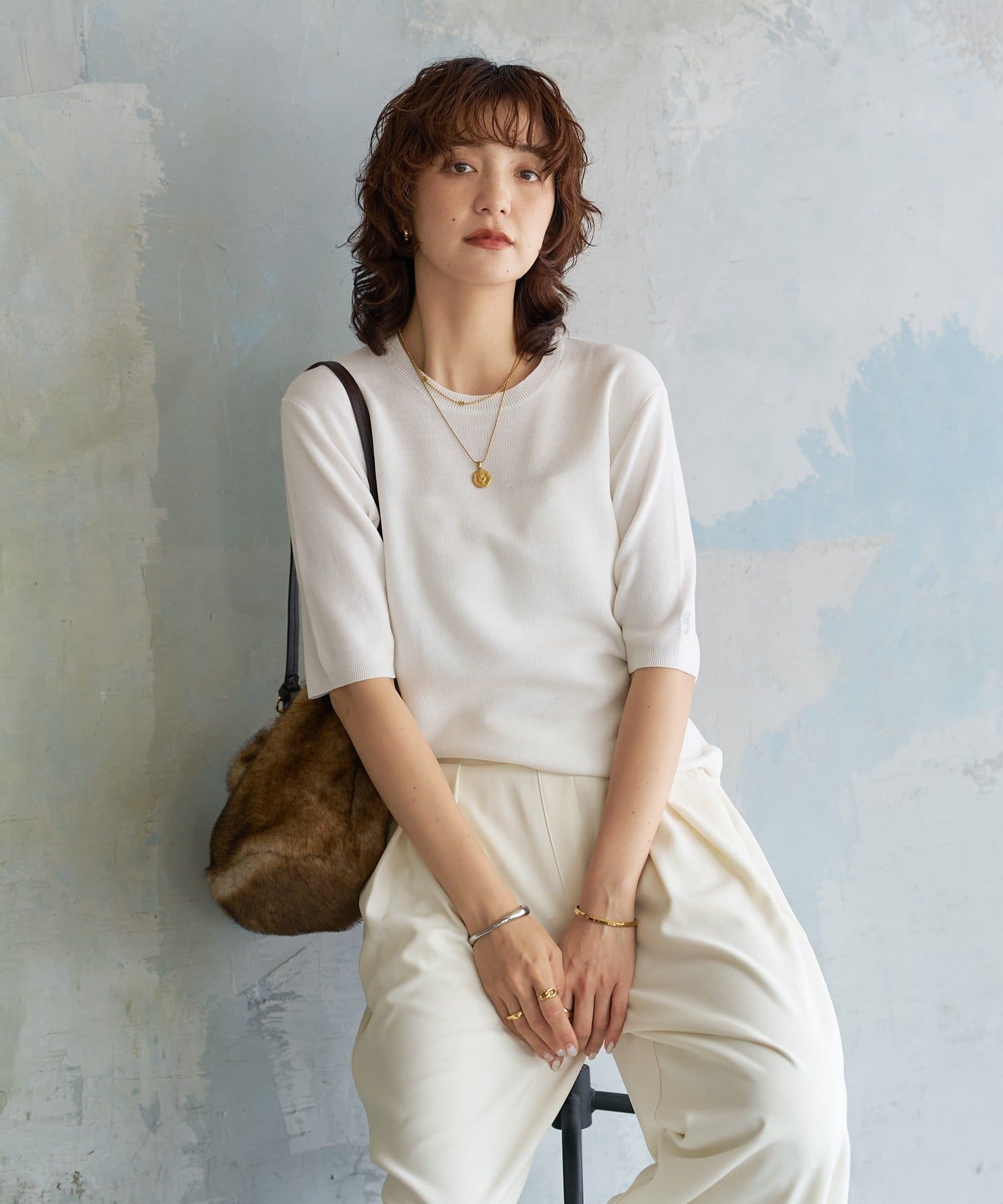 14Gのスムース編みのなめらかな質感、柔らかくからだになじむスッキリとしたシルエットも洗練された印象に。