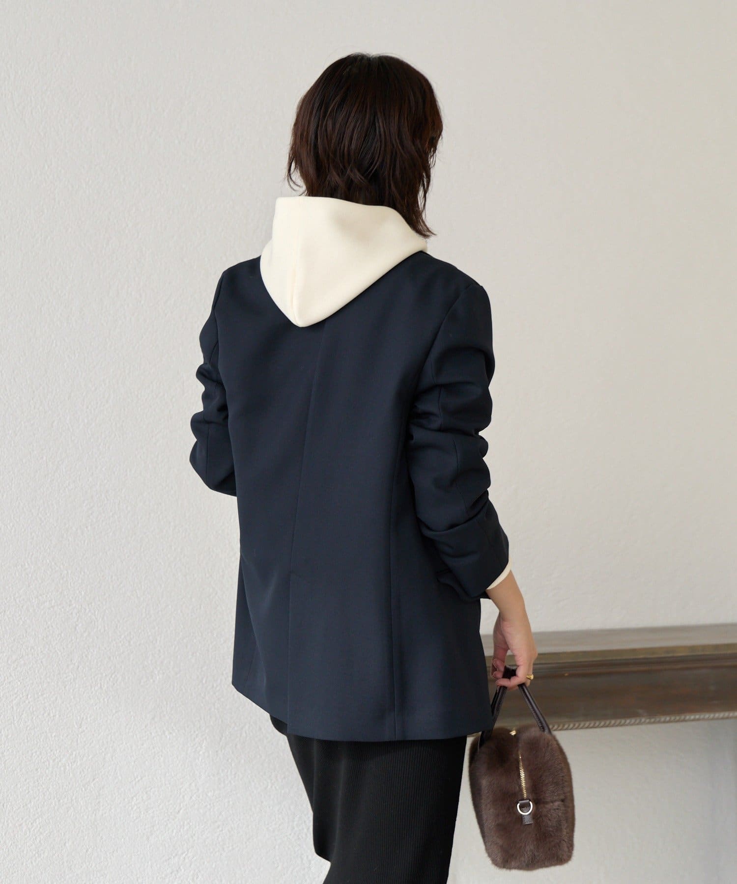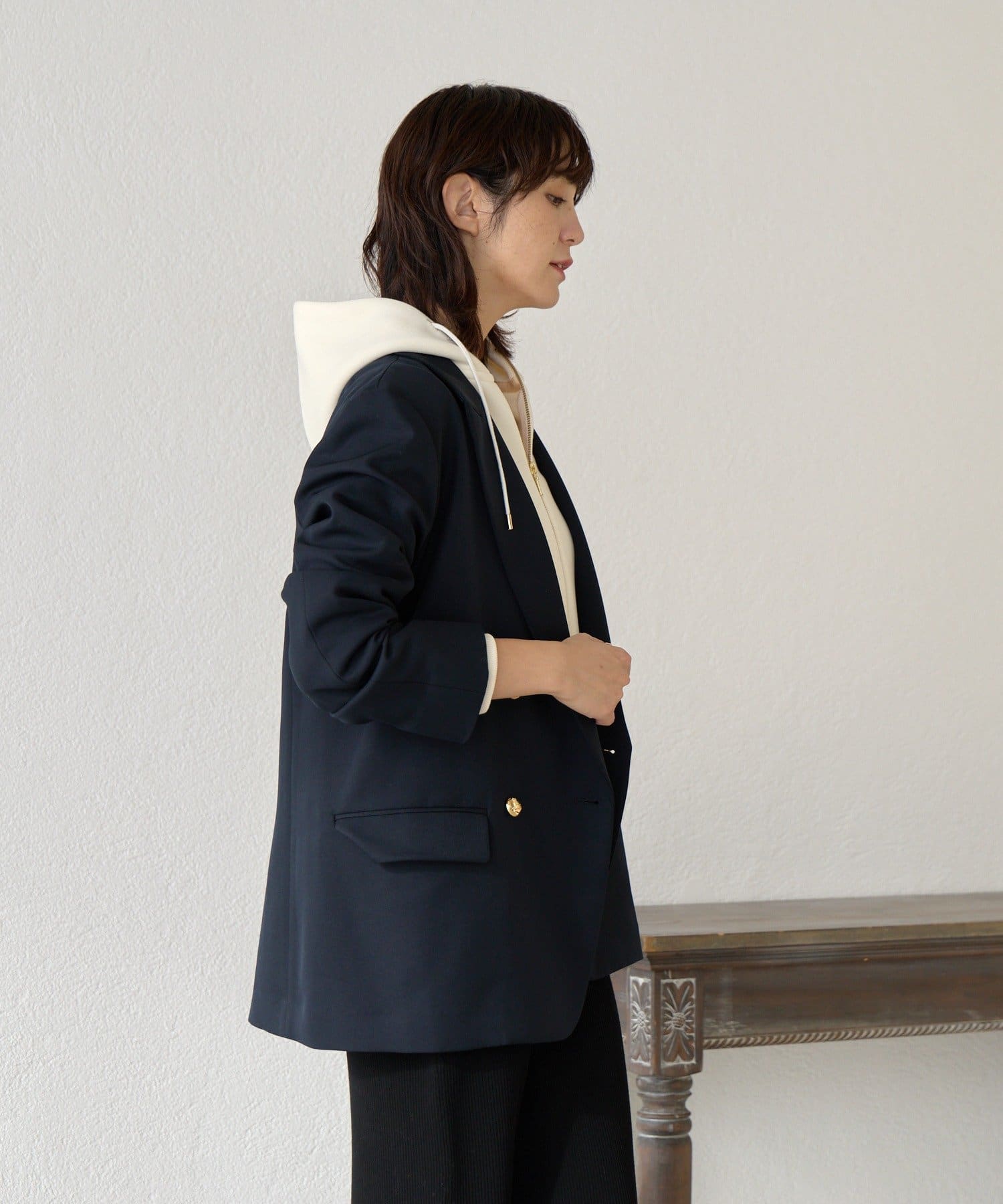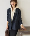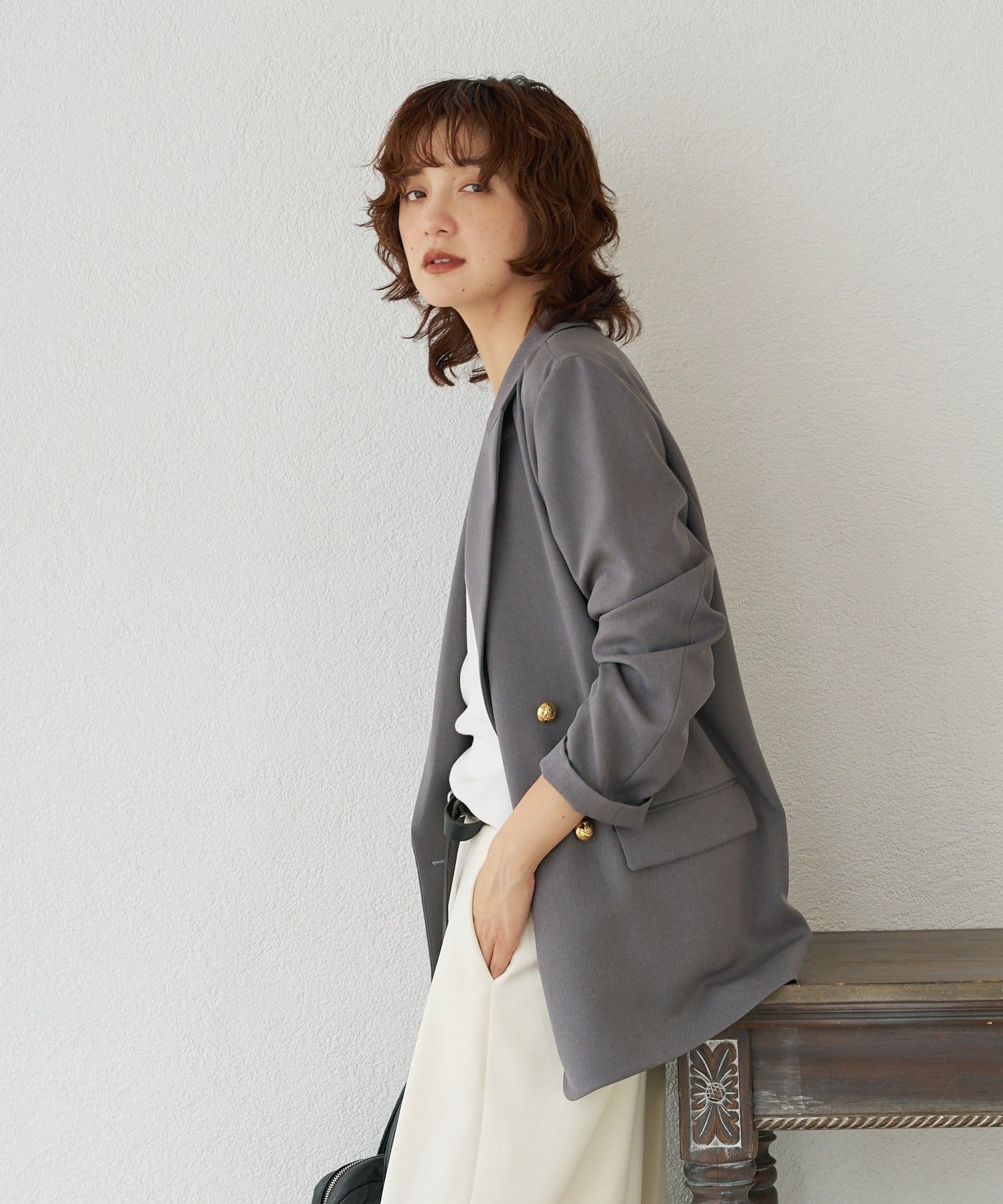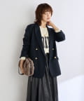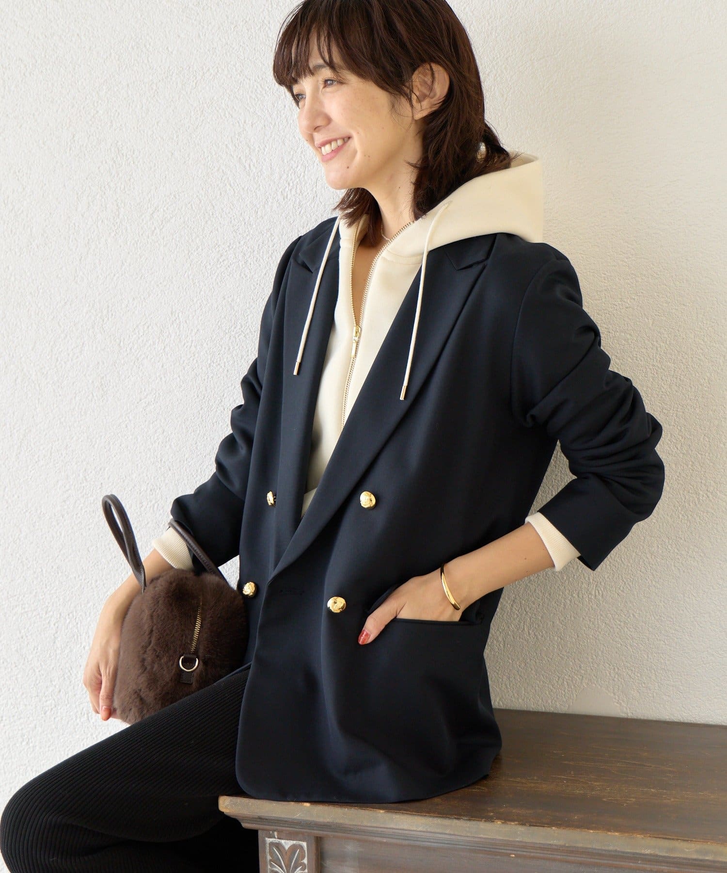 ・スッキリとしたピークドラペルとゴールドのエンブレムボタンで華やかさときちんと感を併せ持った1着。