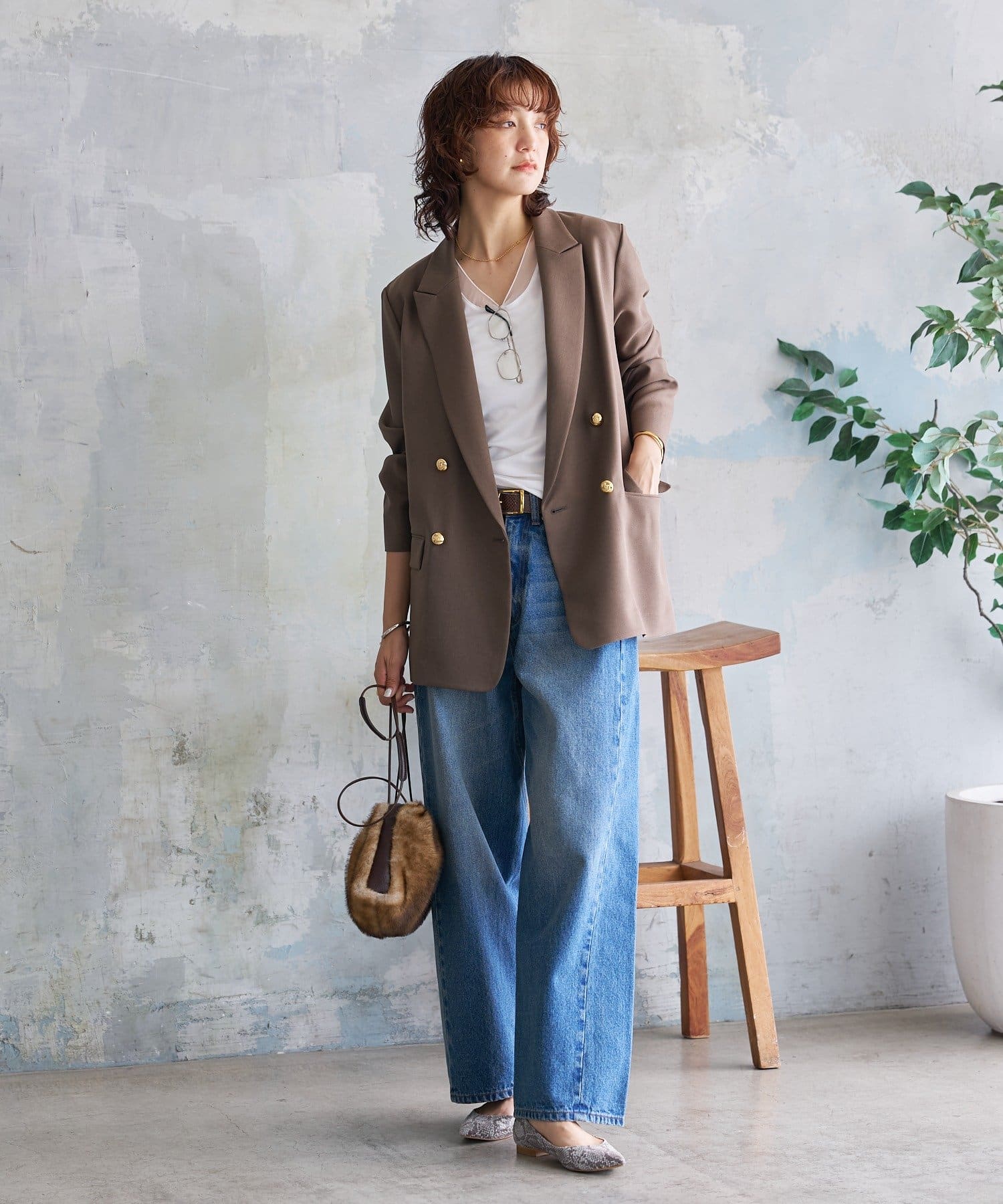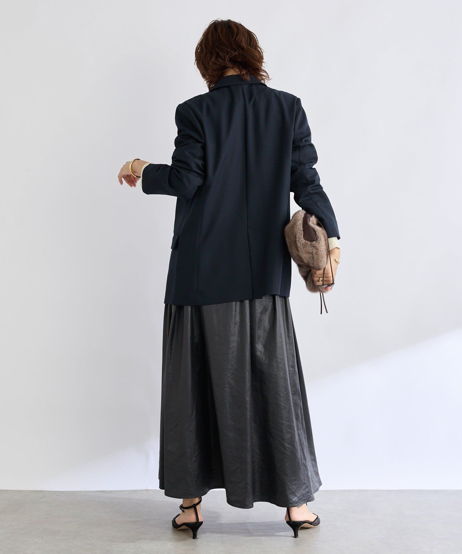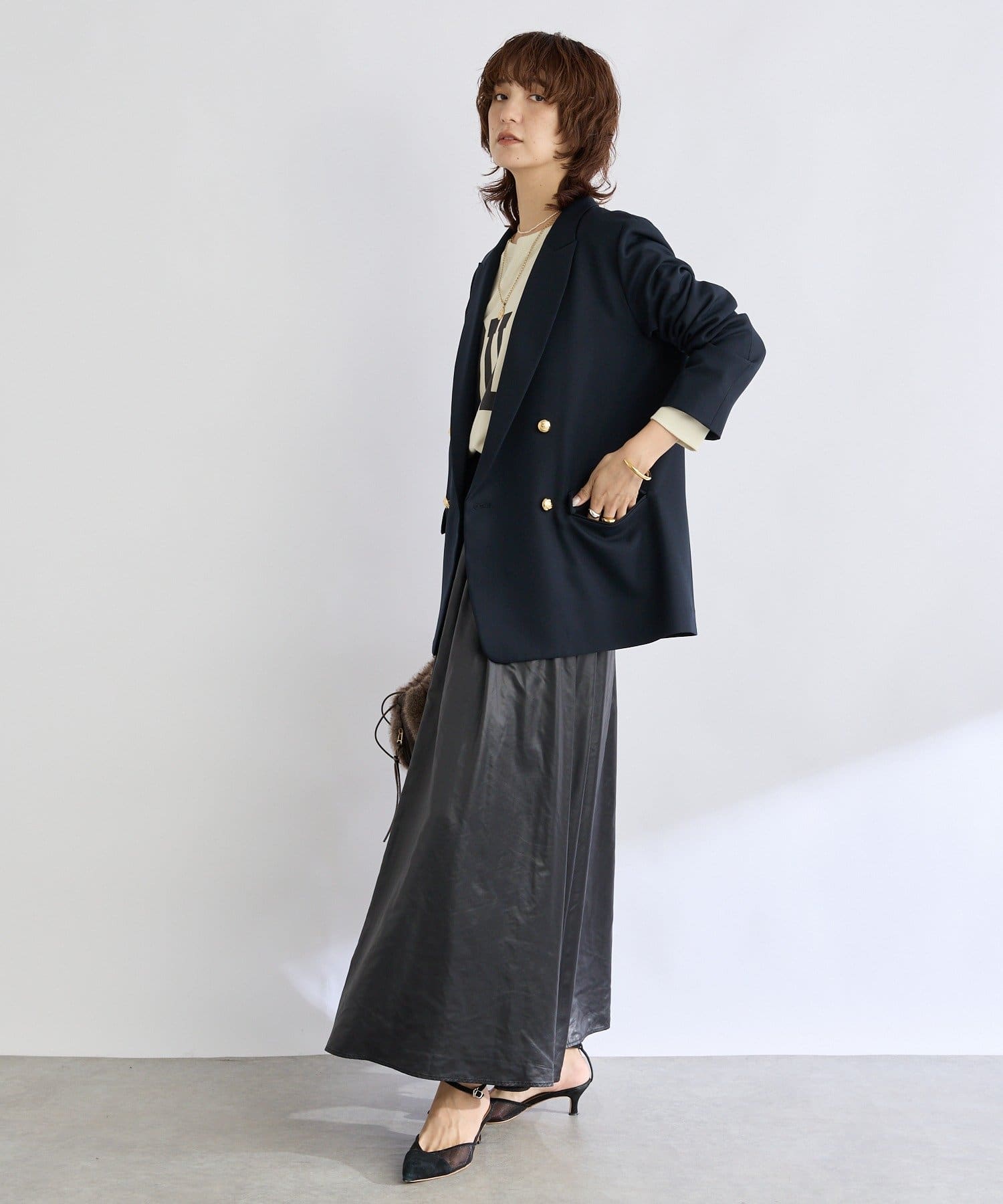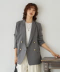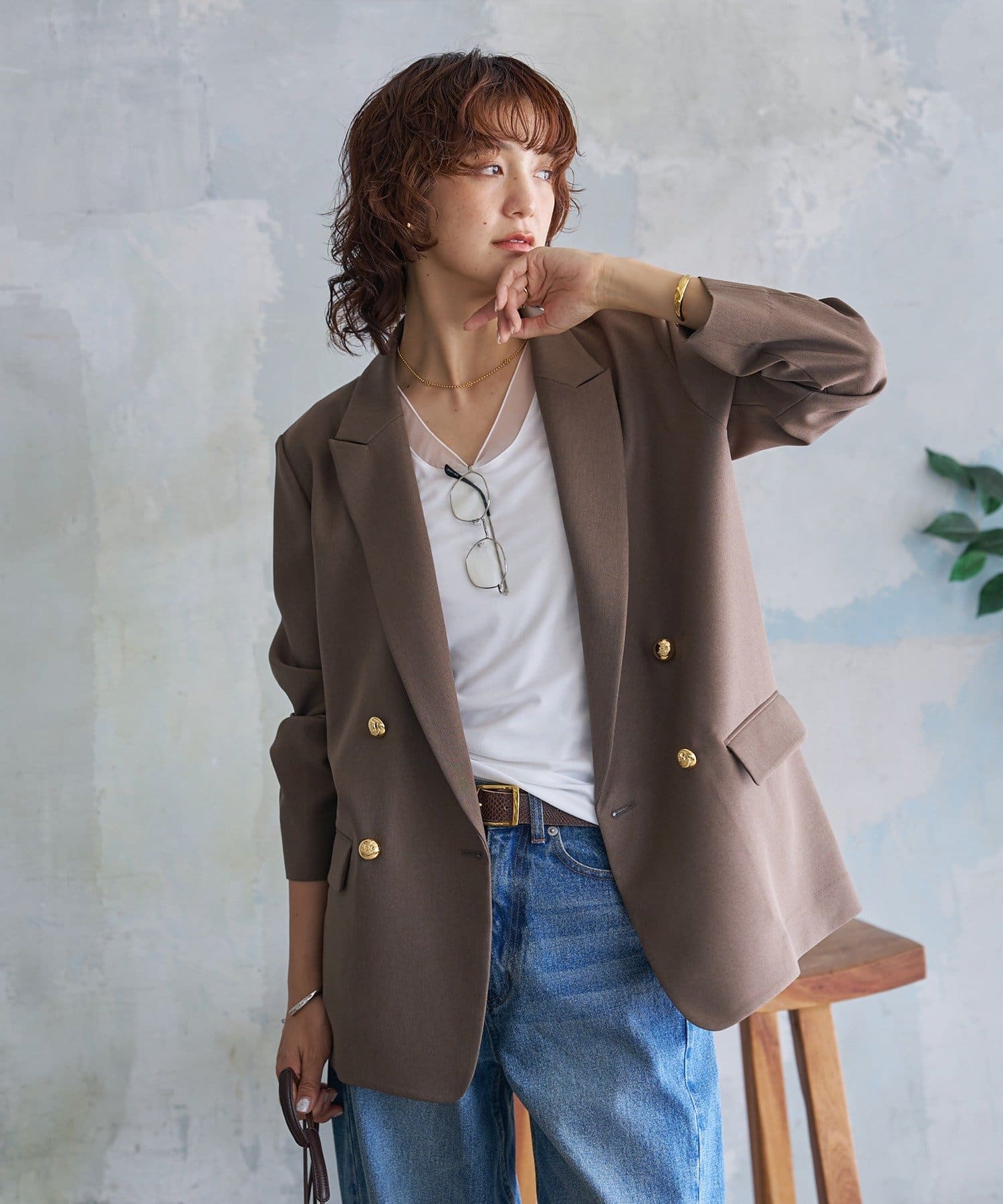 ・スッキリとしたピークドラペルとゴールドのエンブレムボタンで華やかさときちんと感を併せ持った1着。