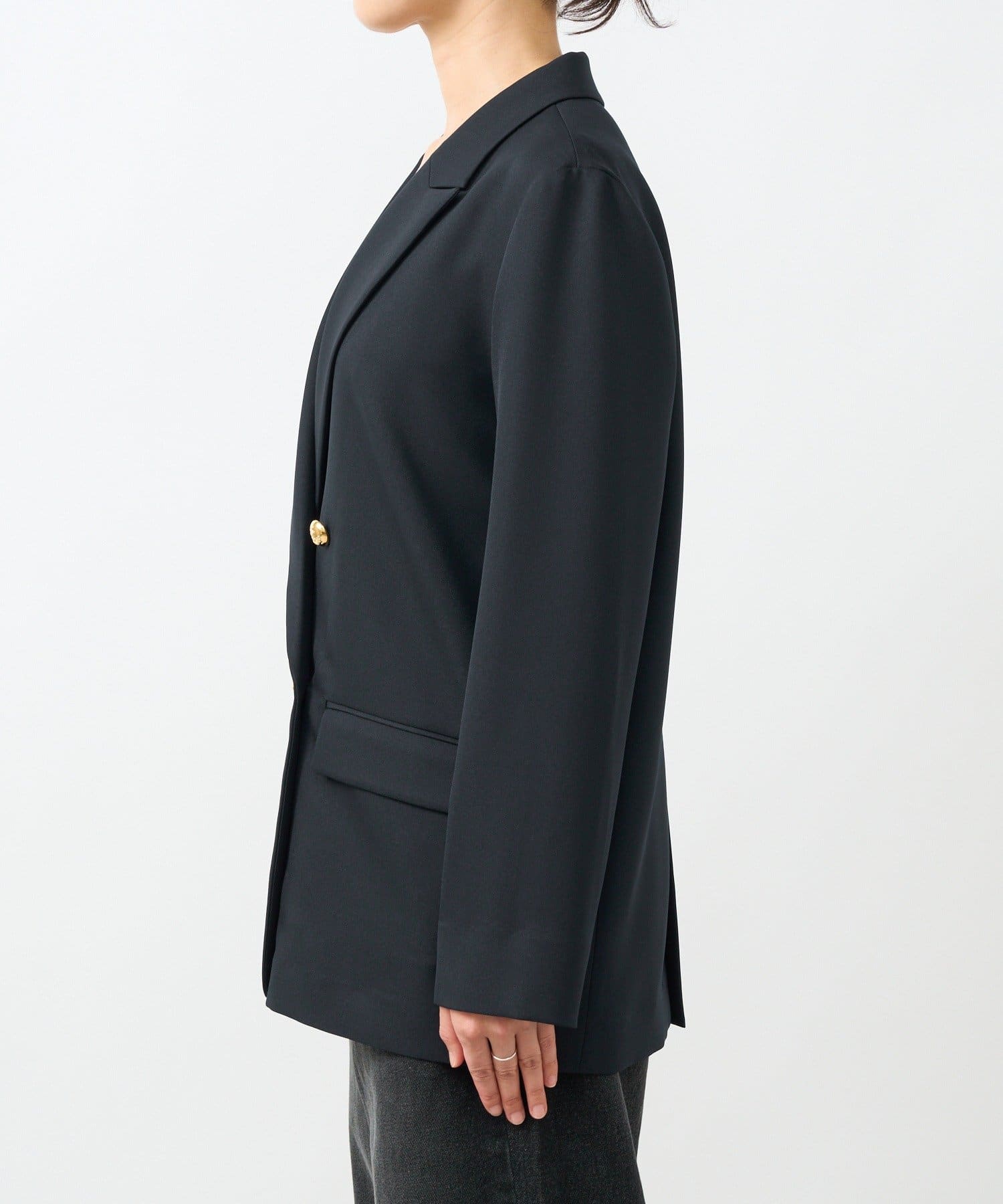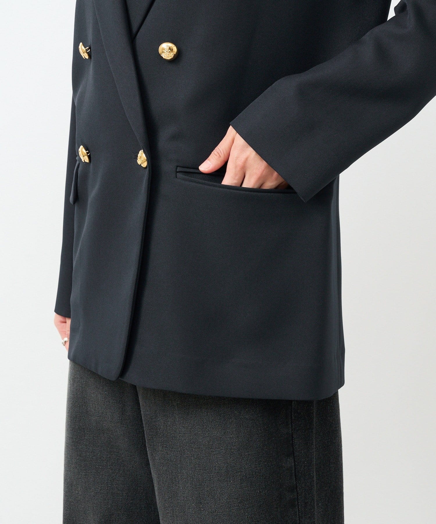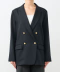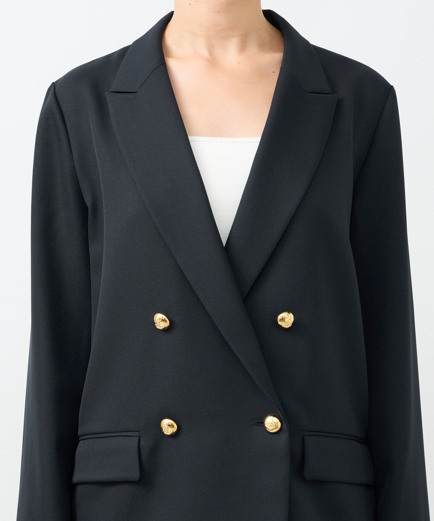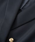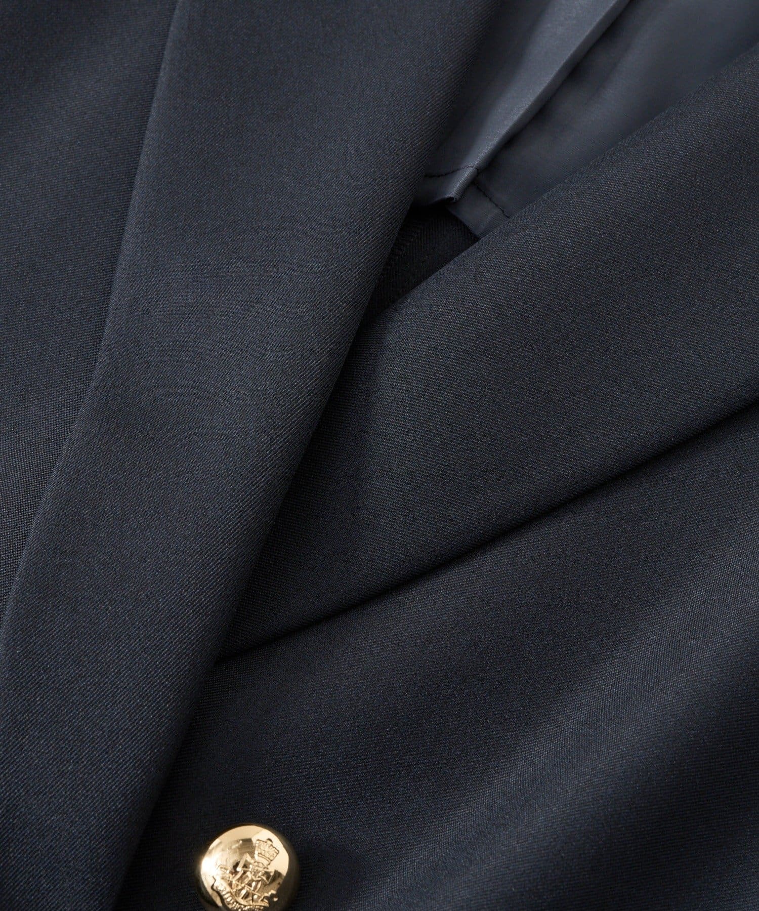 ・スッキリとしたピークドラペルとゴールドのエンブレムボタンで華やかさときちんと感を併せ持った1着。